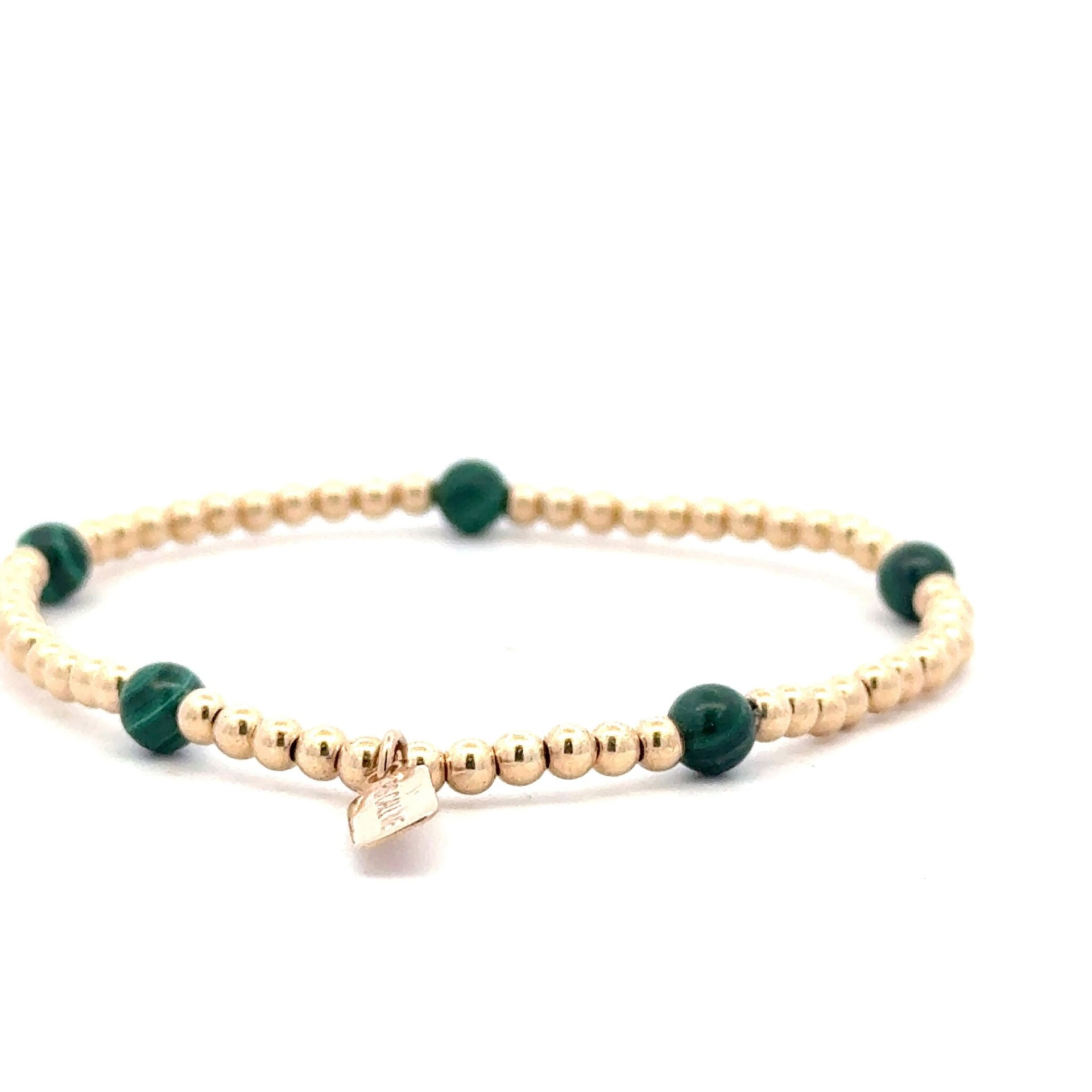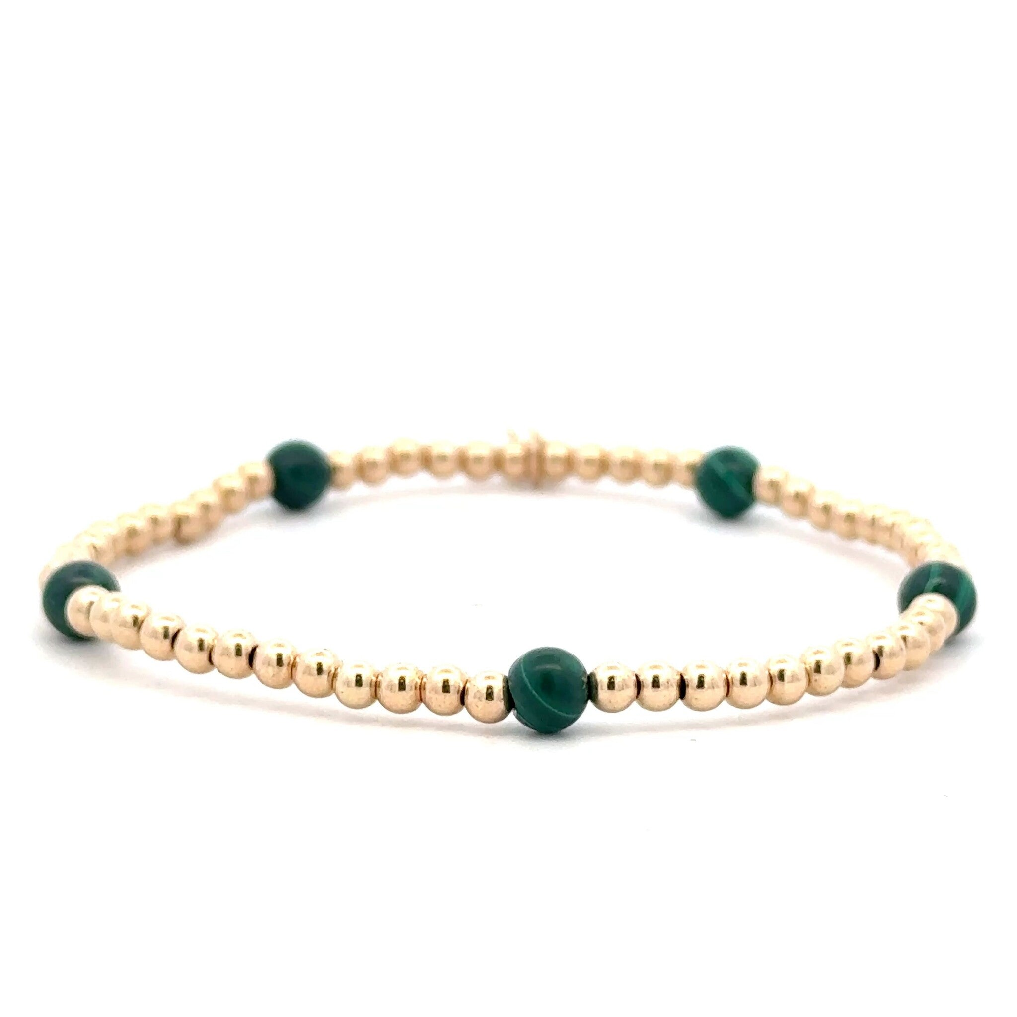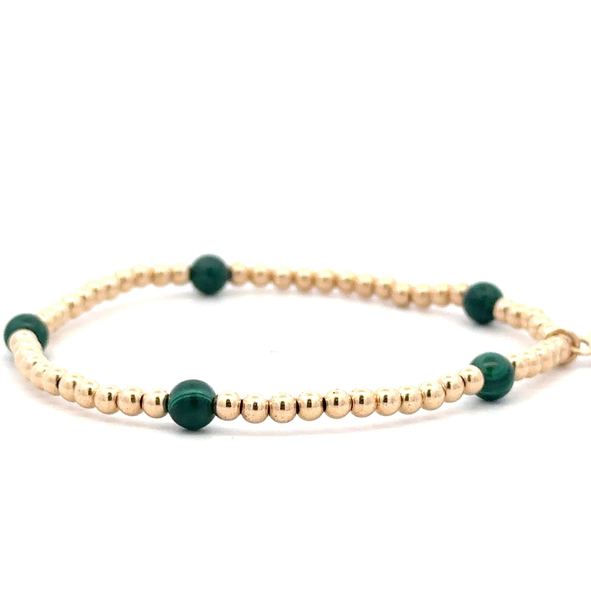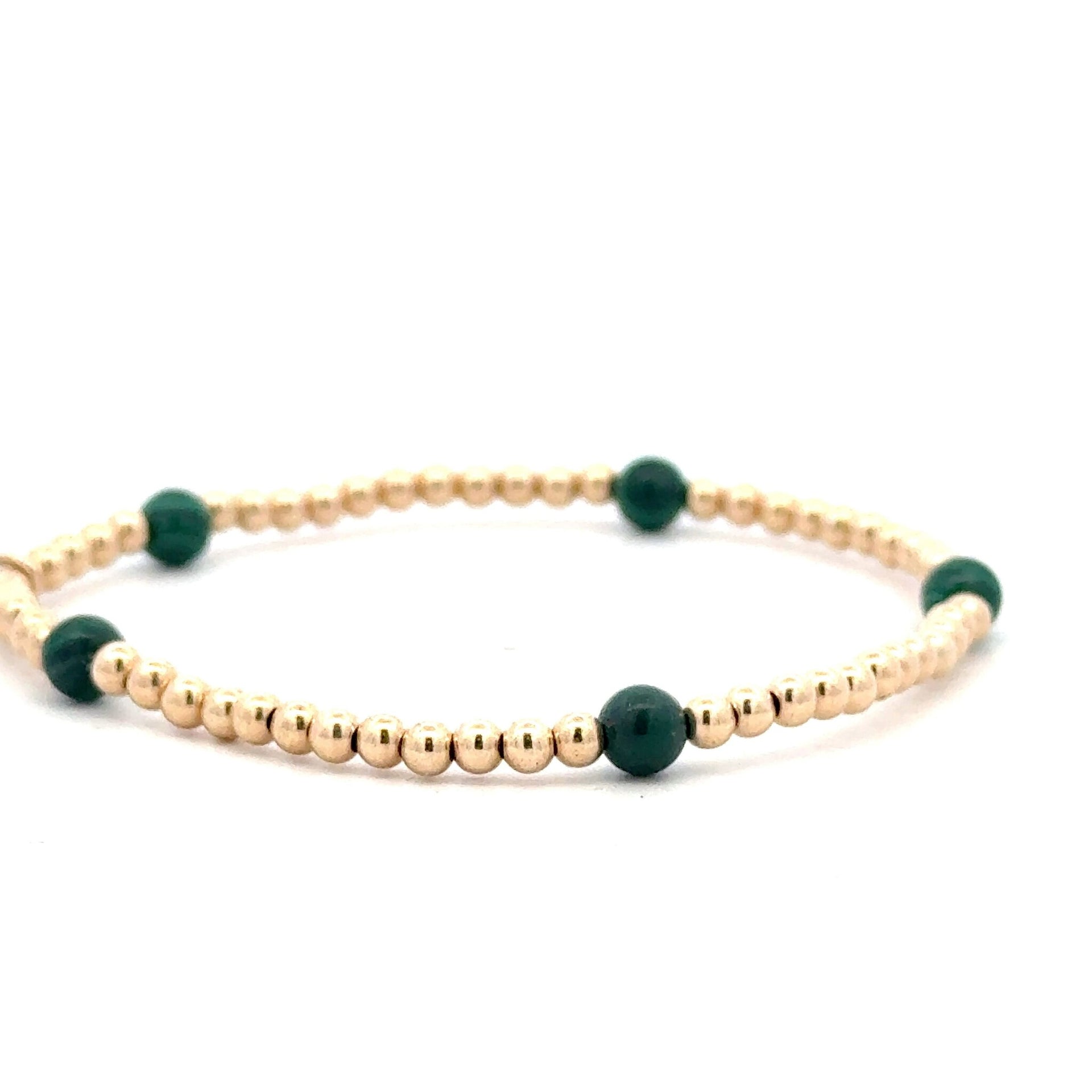 Elastisches Armband mit goldfarbenen Kugeln und grünen Steinen.