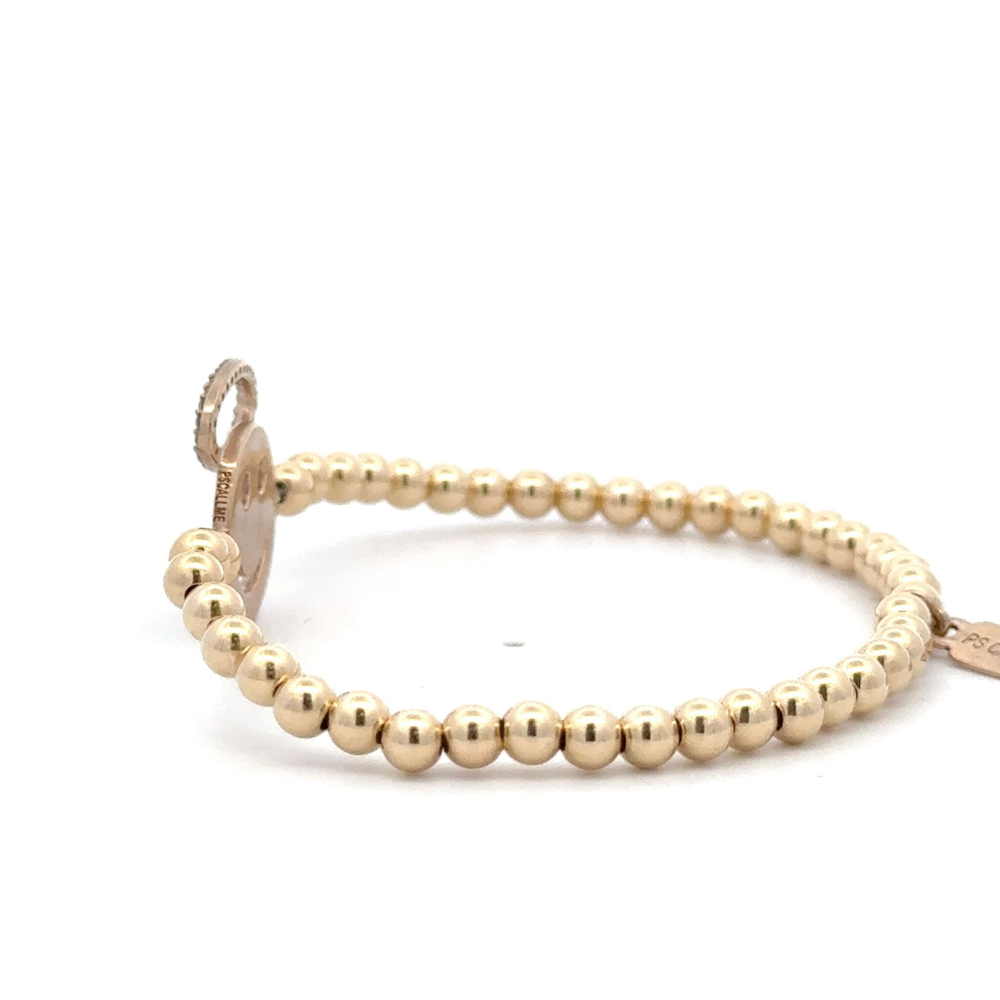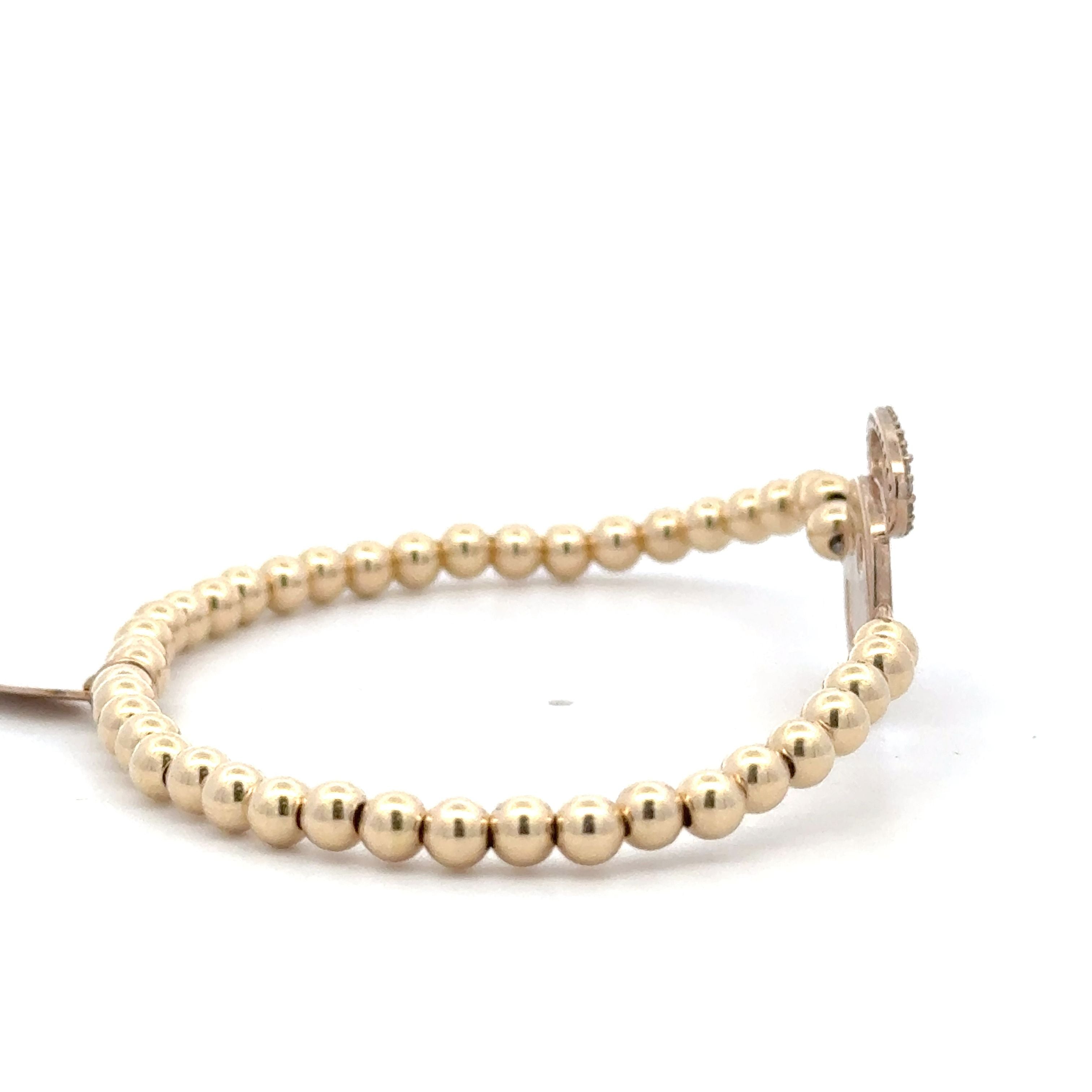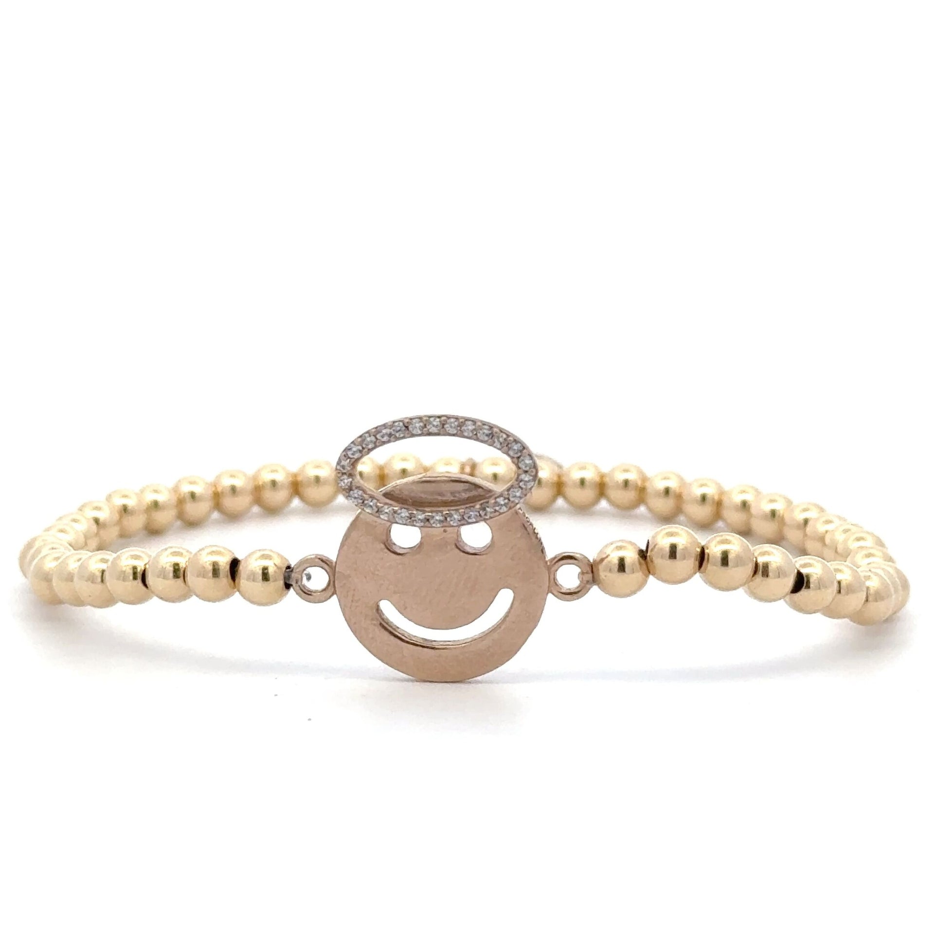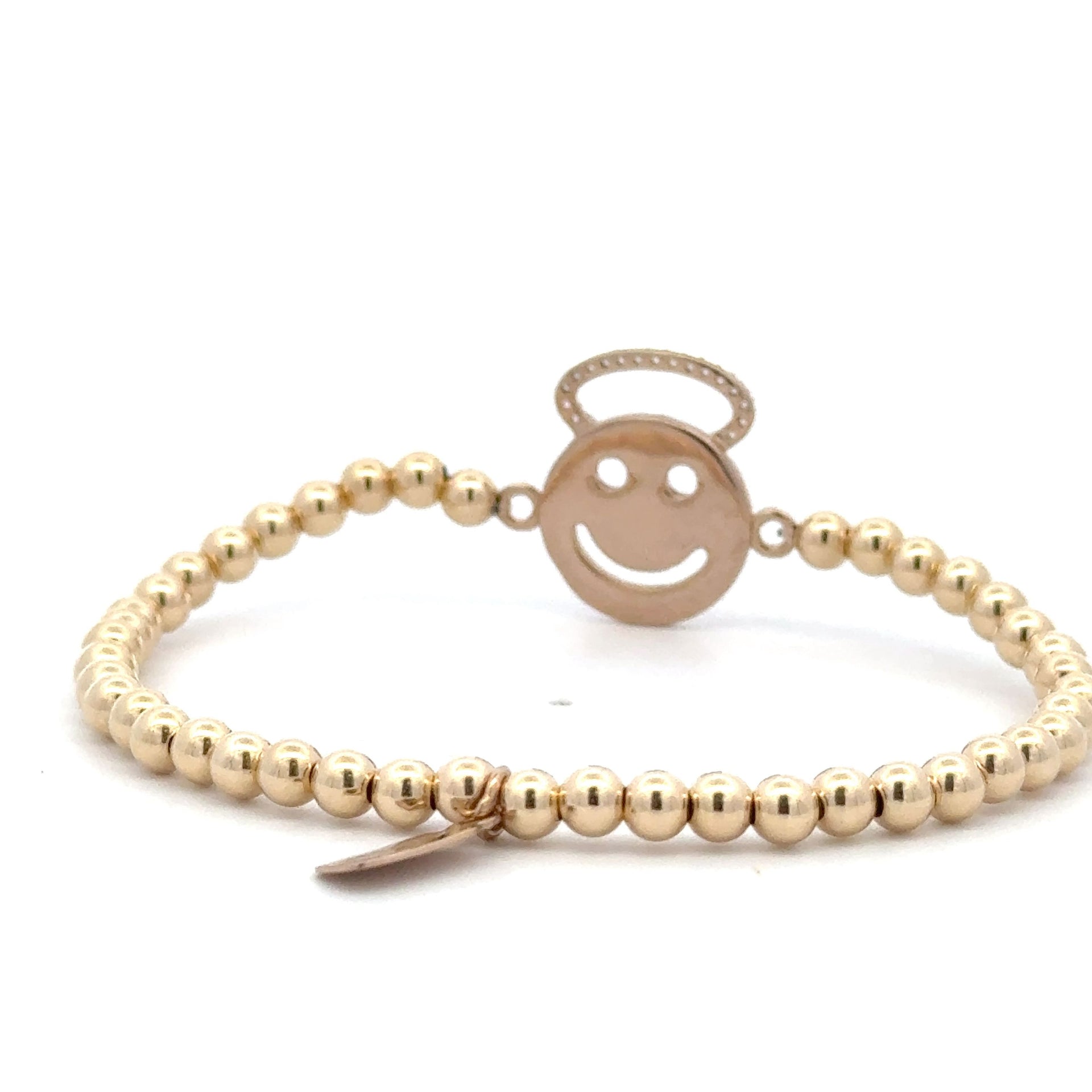 Elastisches Armband mit goldfarbenen Perlen und einem mit Strasssteinen verzierten Engel-Smiley-Anhänger.