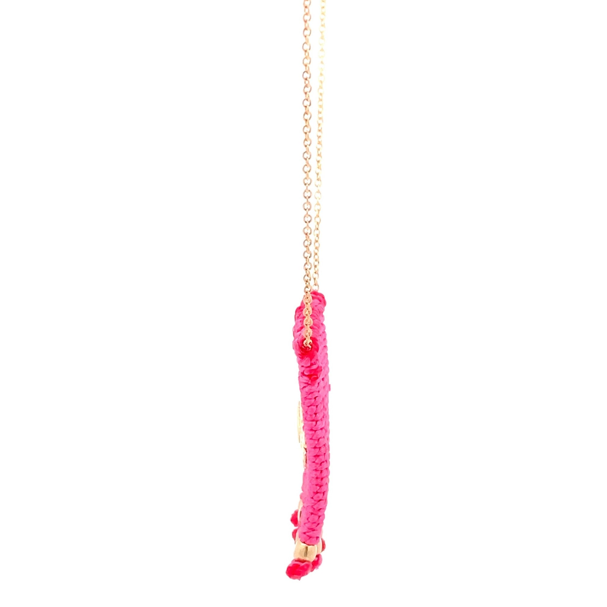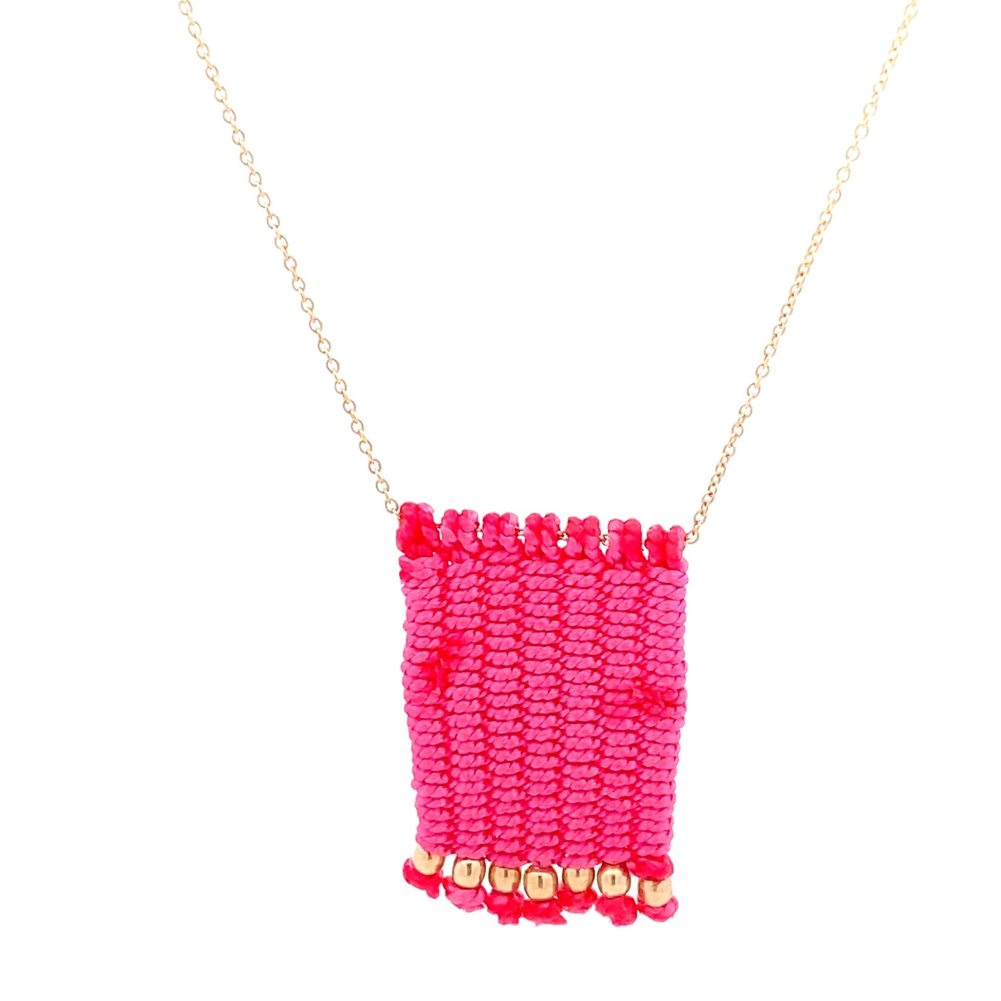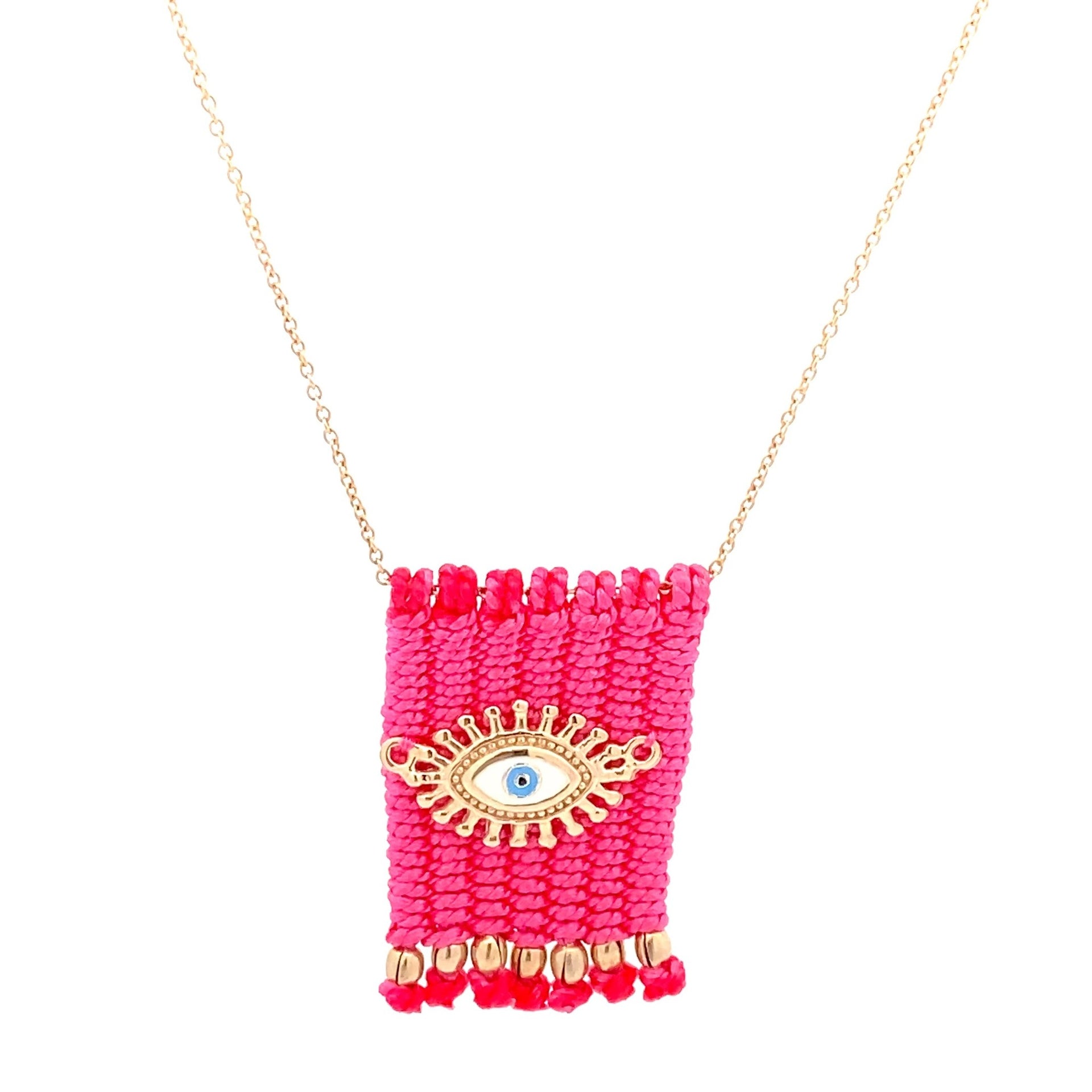 Goldfarbene Halskette mit einem Glücksauge auf farbig gewebter Baumwolle.