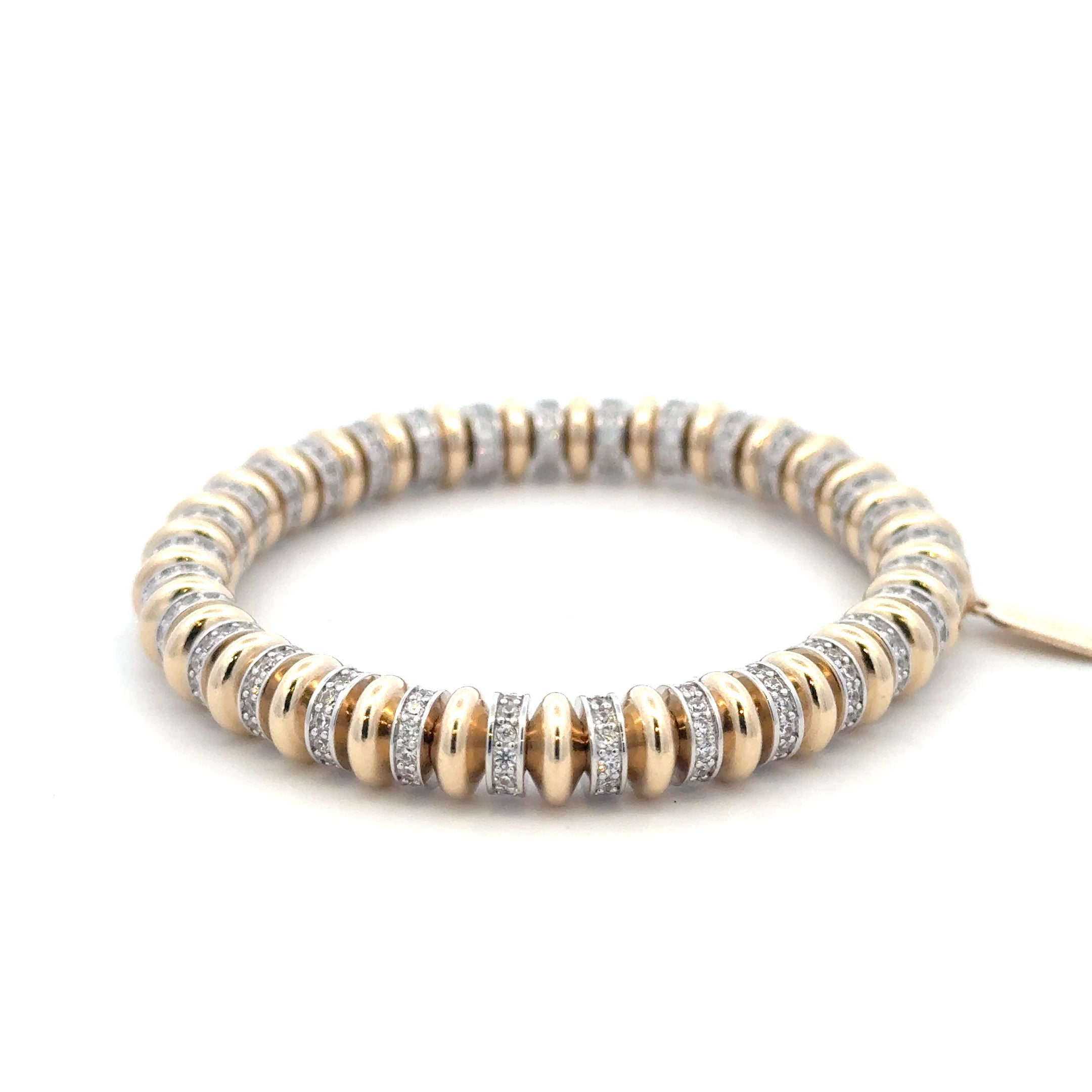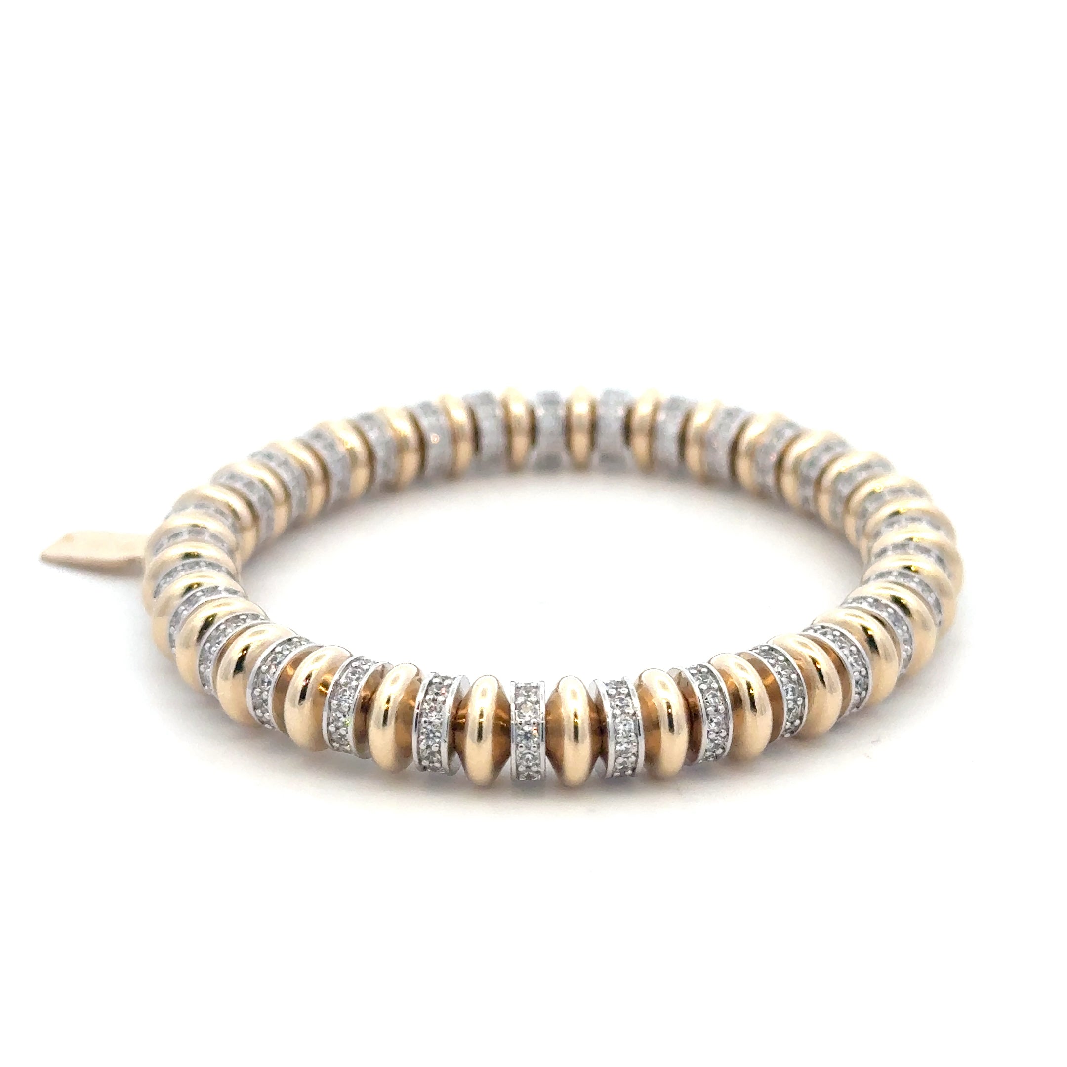 Elastisches Armband mit goldfarbenen Rädchen-Perlen gemischt mit silberfarbenen Rädchen-Charms mit Steinen.
