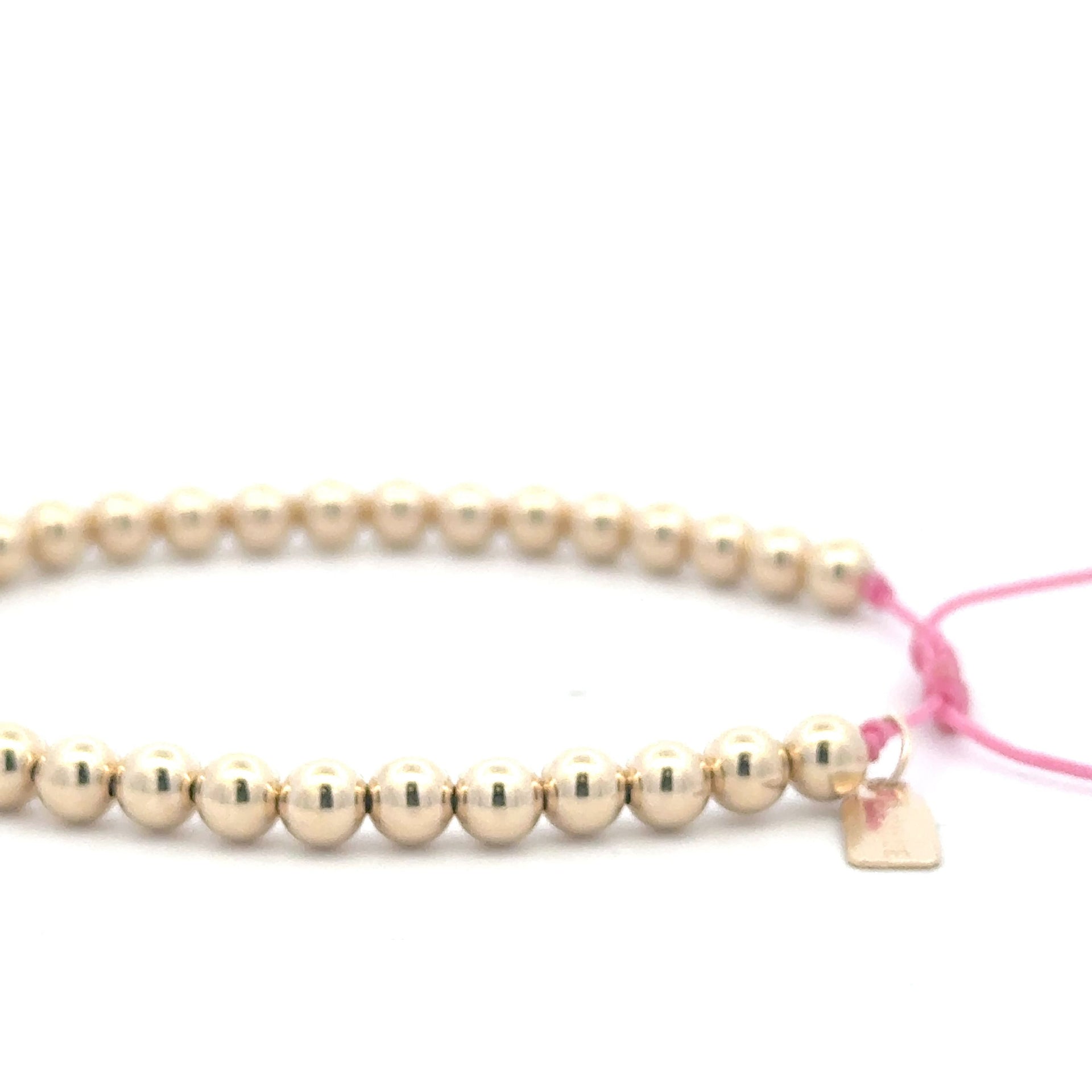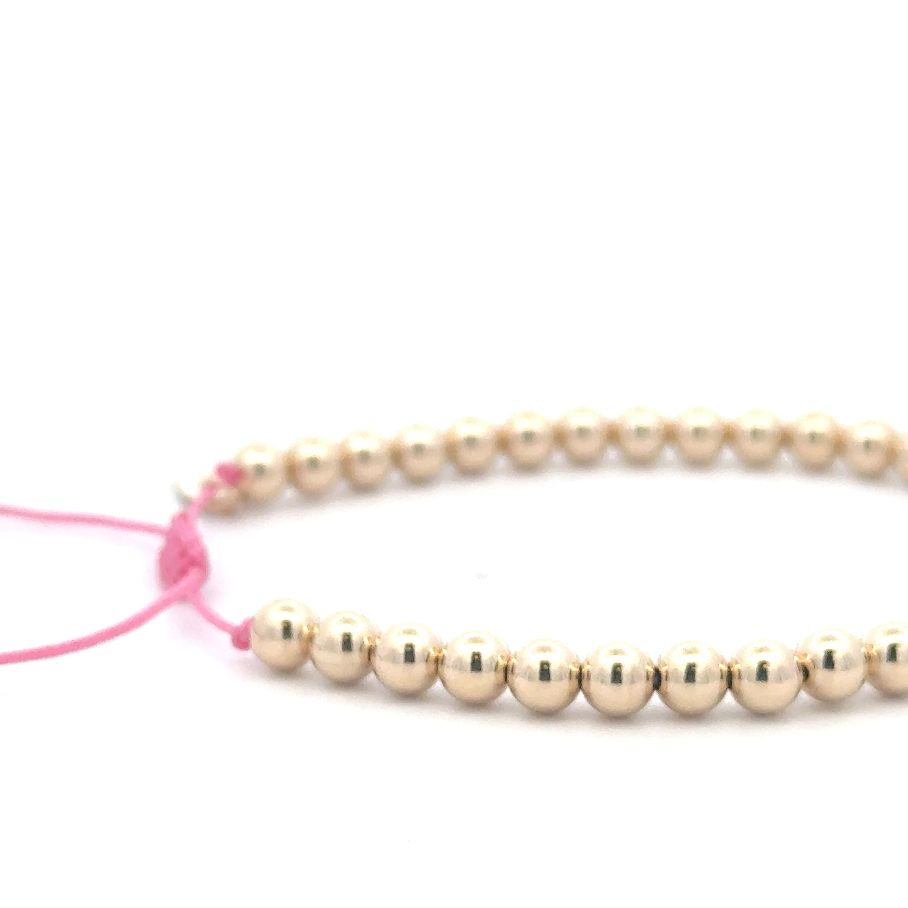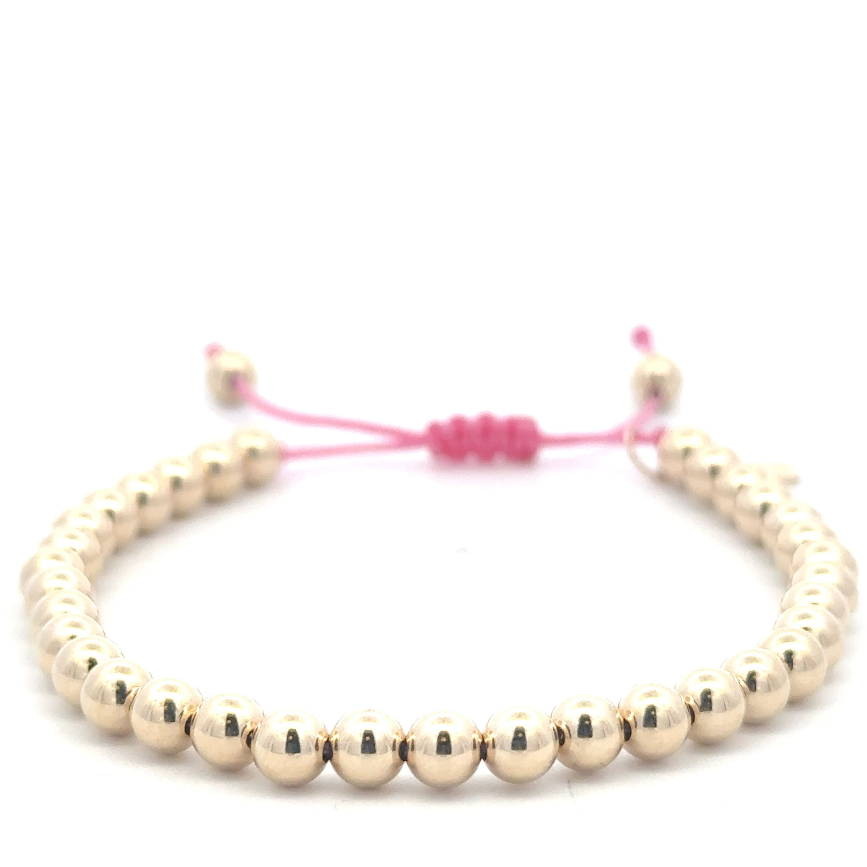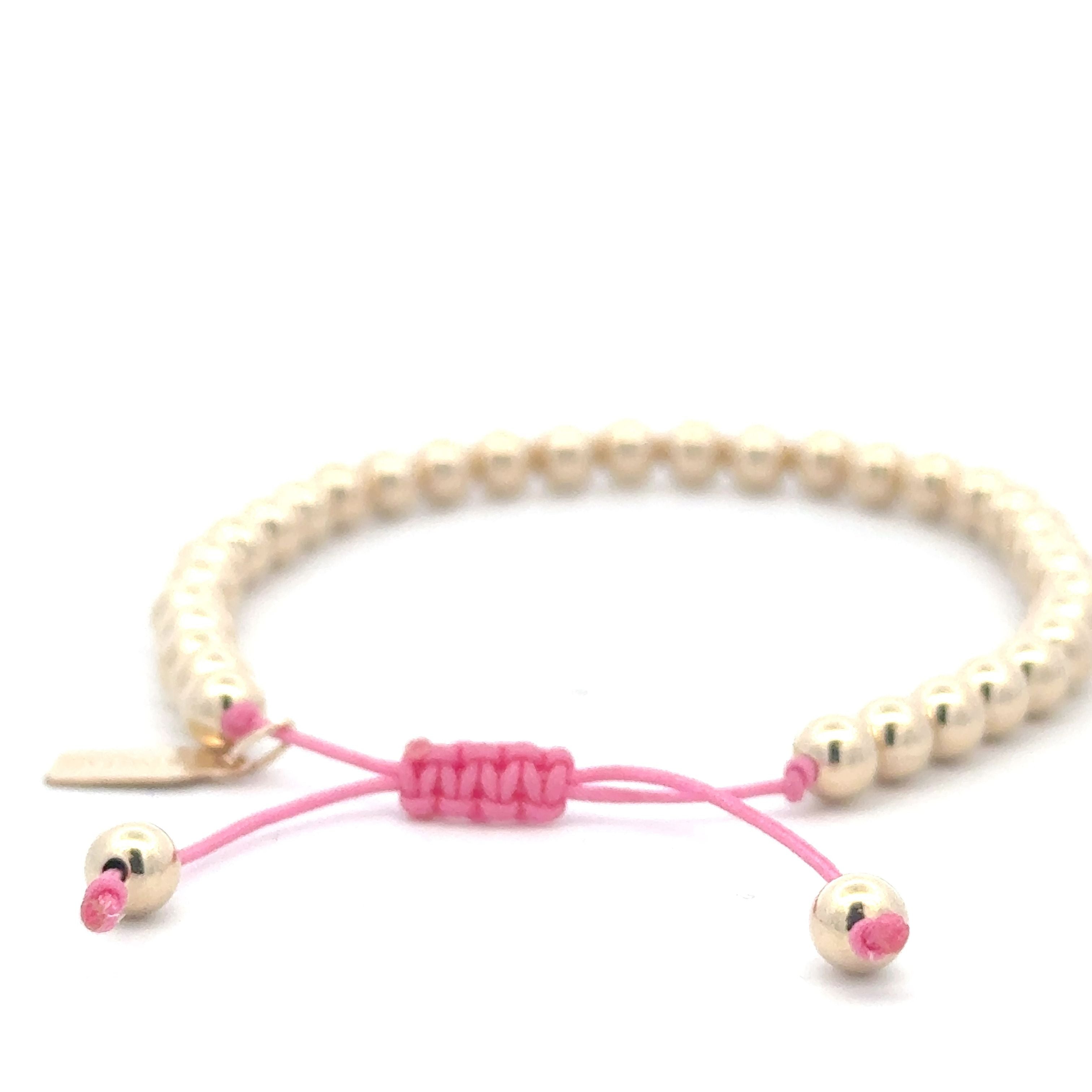 Pulsera realizada en cordón de colores con bolitas de color dorado.
