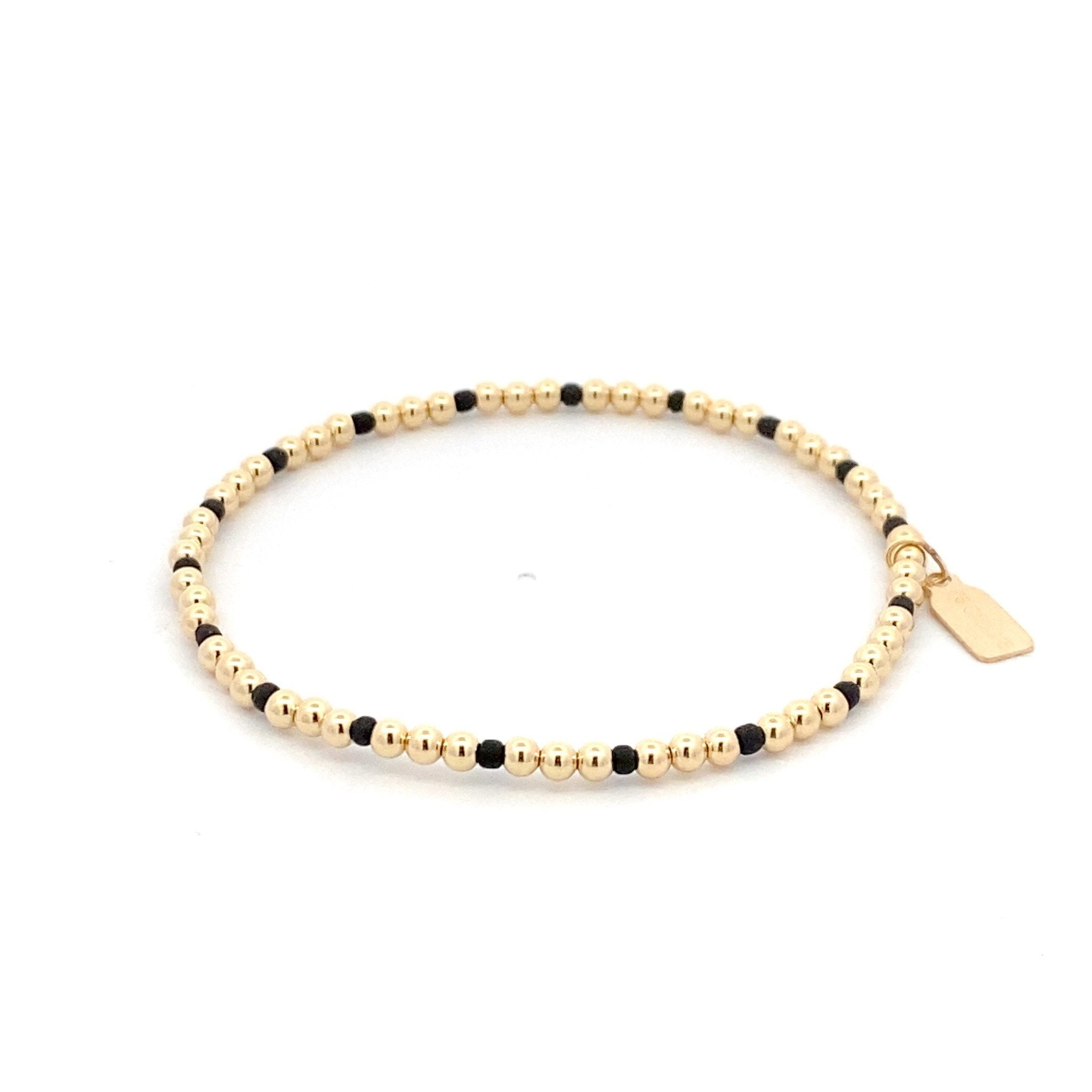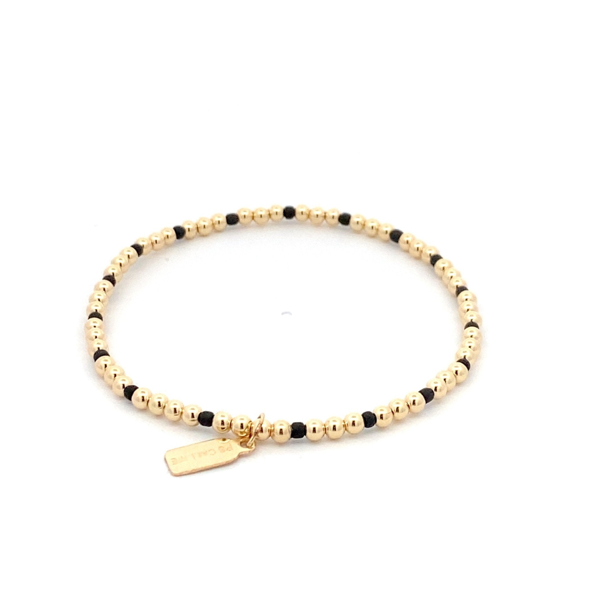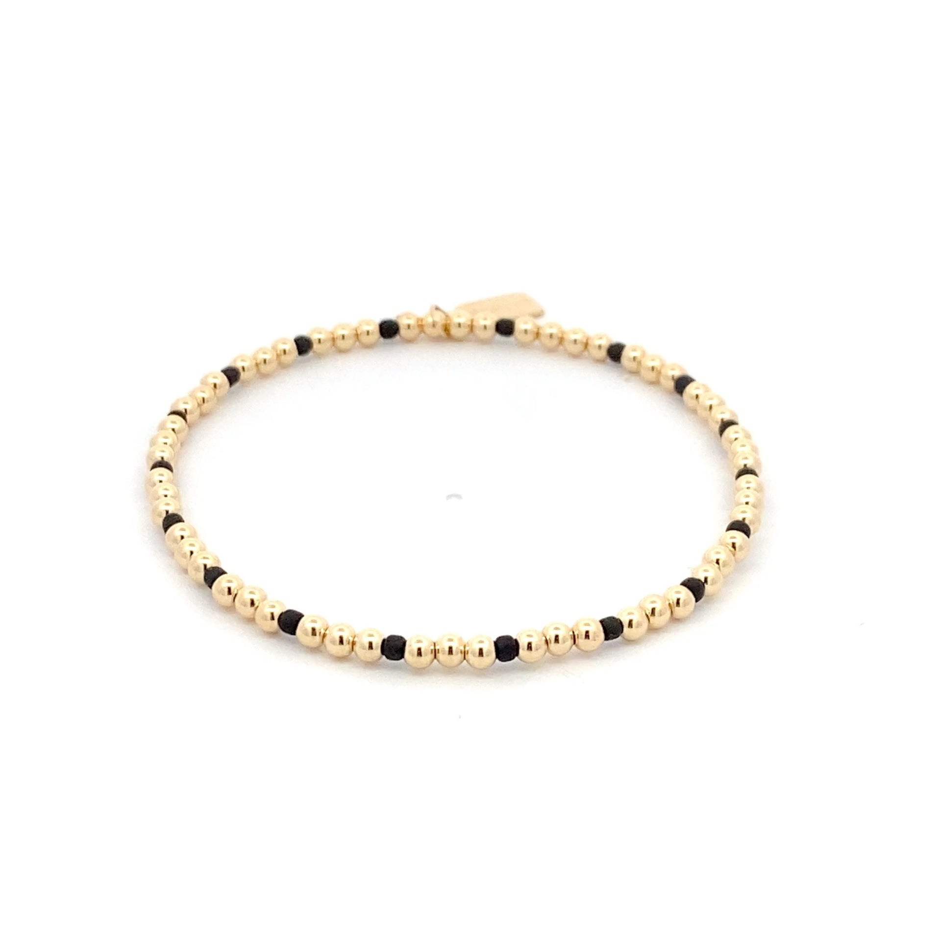 Pulsera elástica con bolitas de color dorado y cuentas de colores.