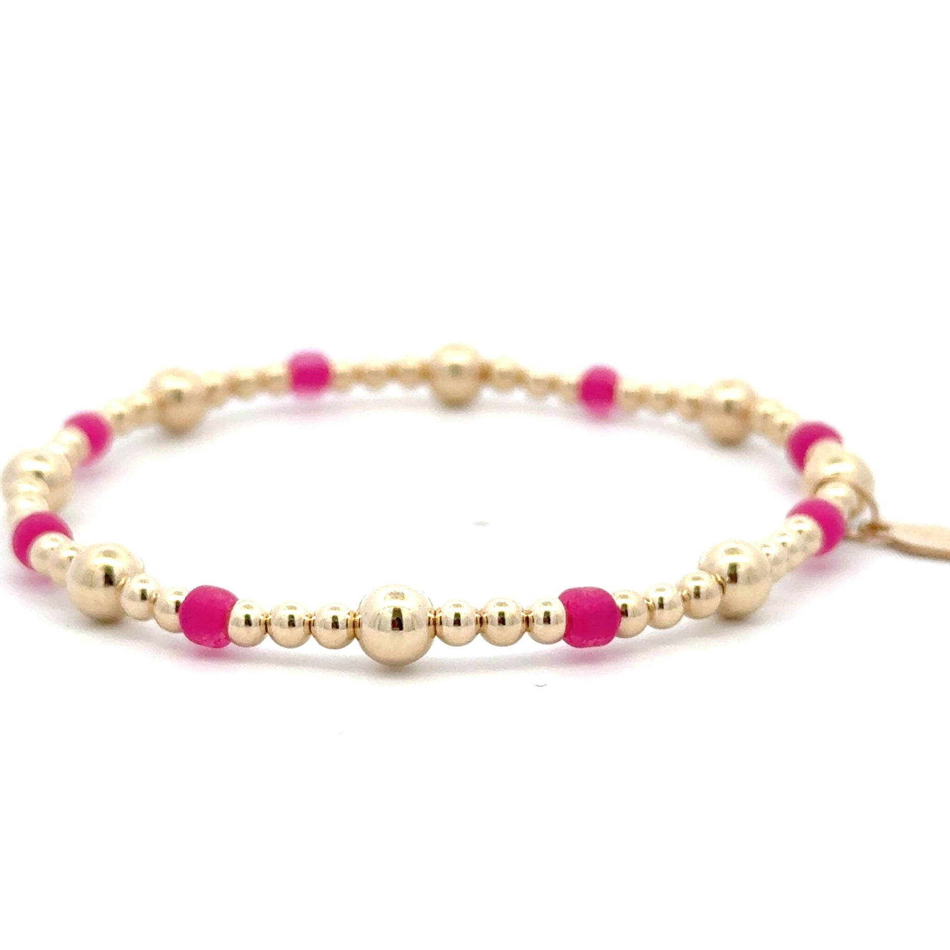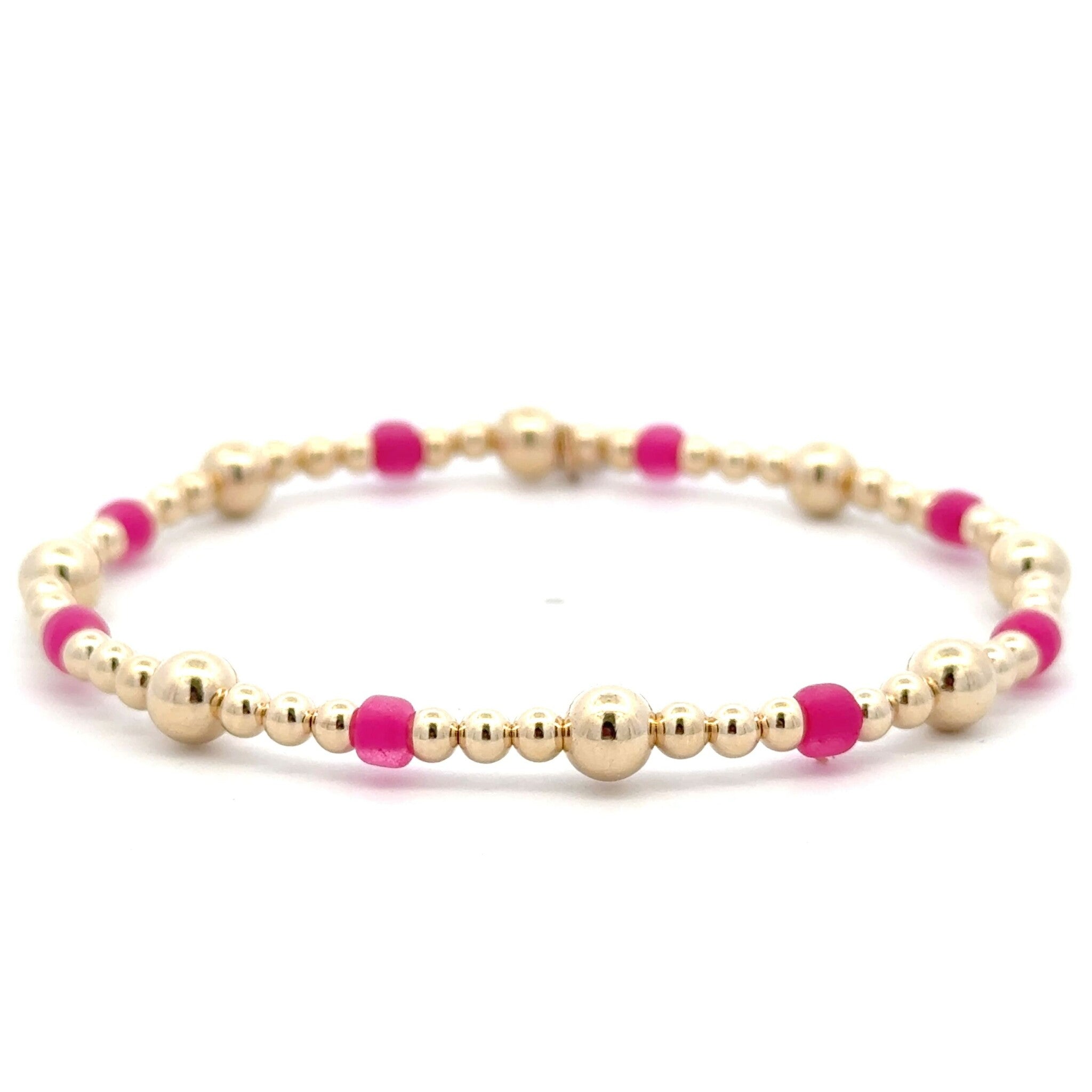 Pulsera elástica con bolitas de color dorado con piedras rosas.