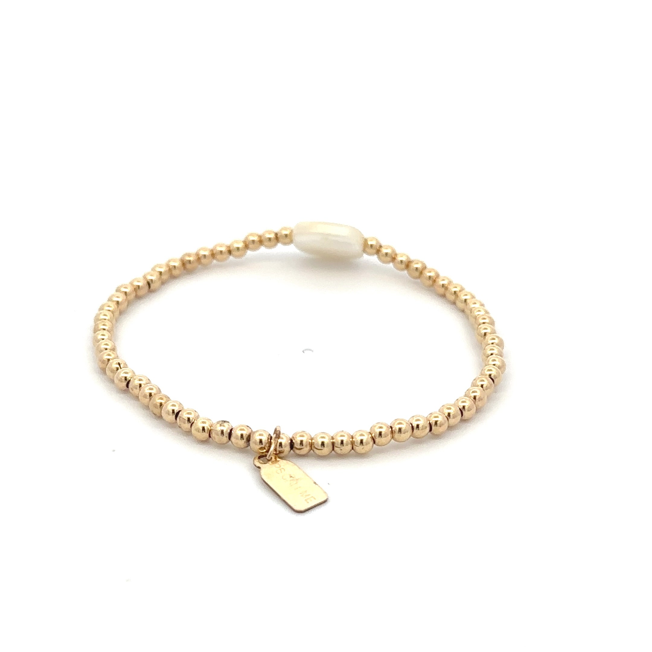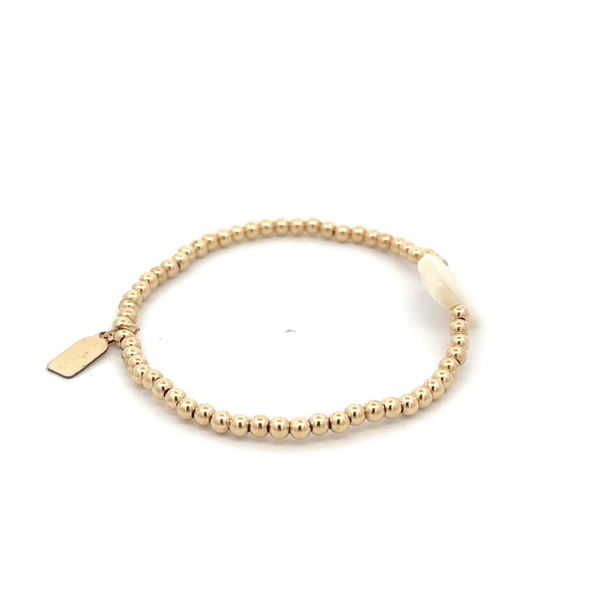 Pulsera elástica con bolitas de color dorado y una piedra de color.