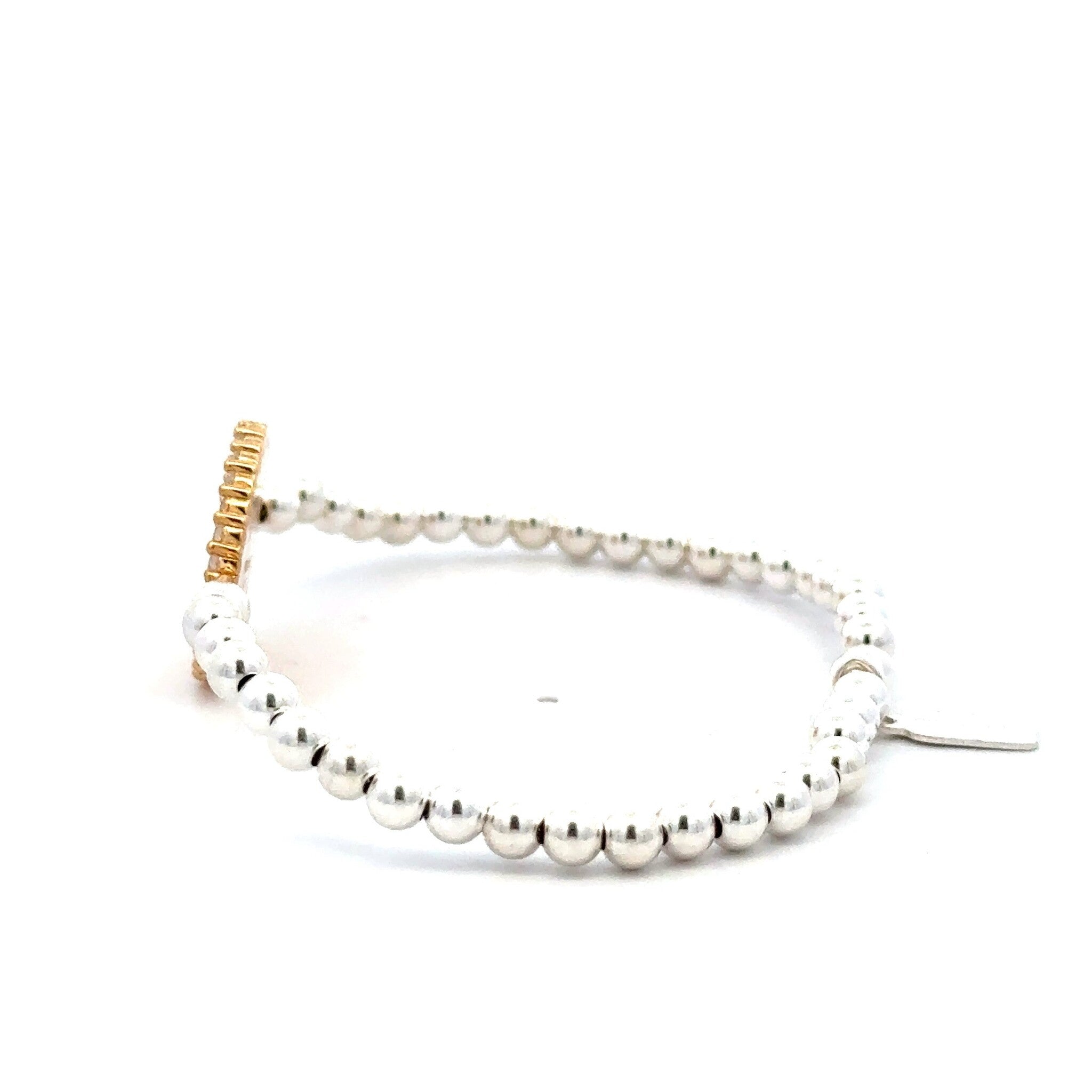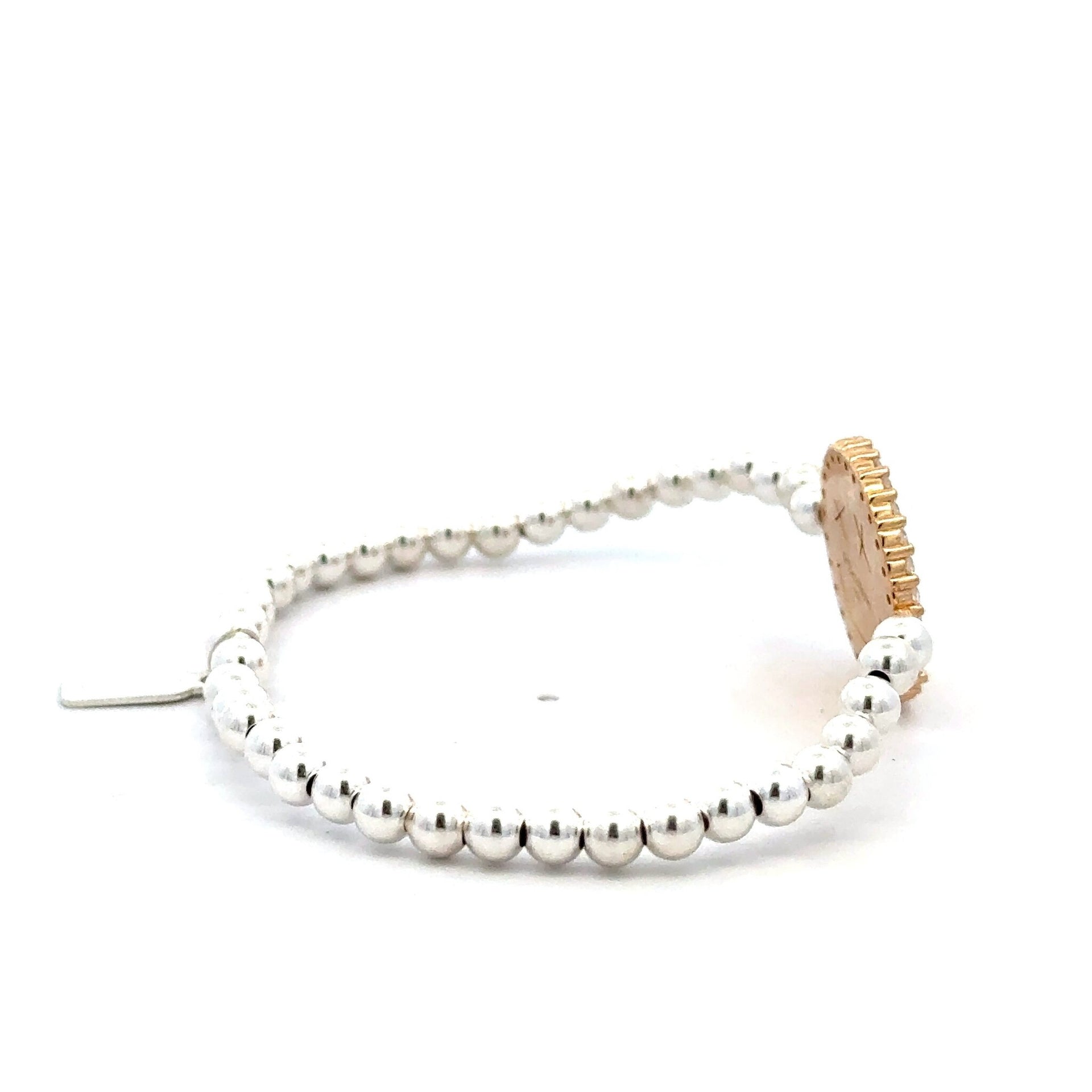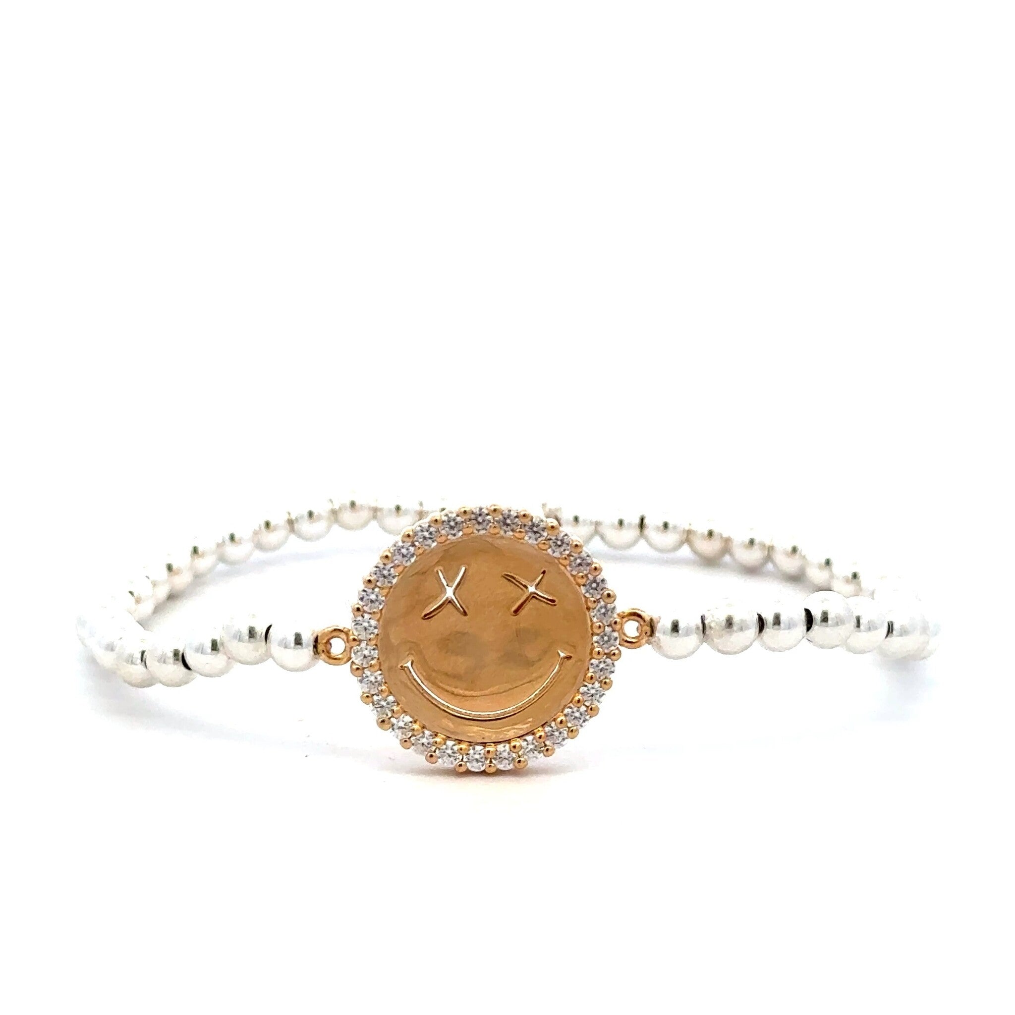 Pulsera elástica con bolitas de plata y charm de carita sonriente con cruces como ojos con circonitas alrededor.