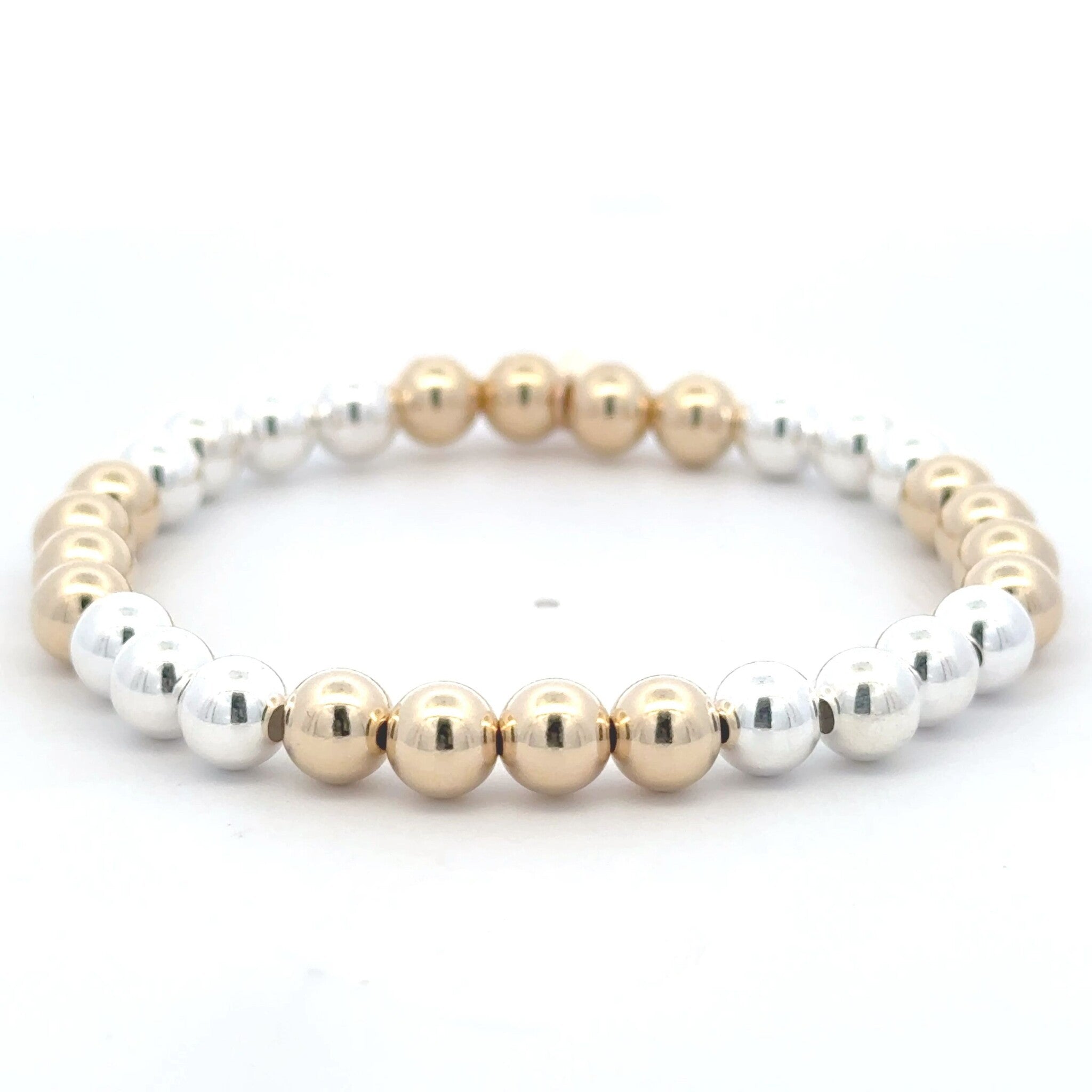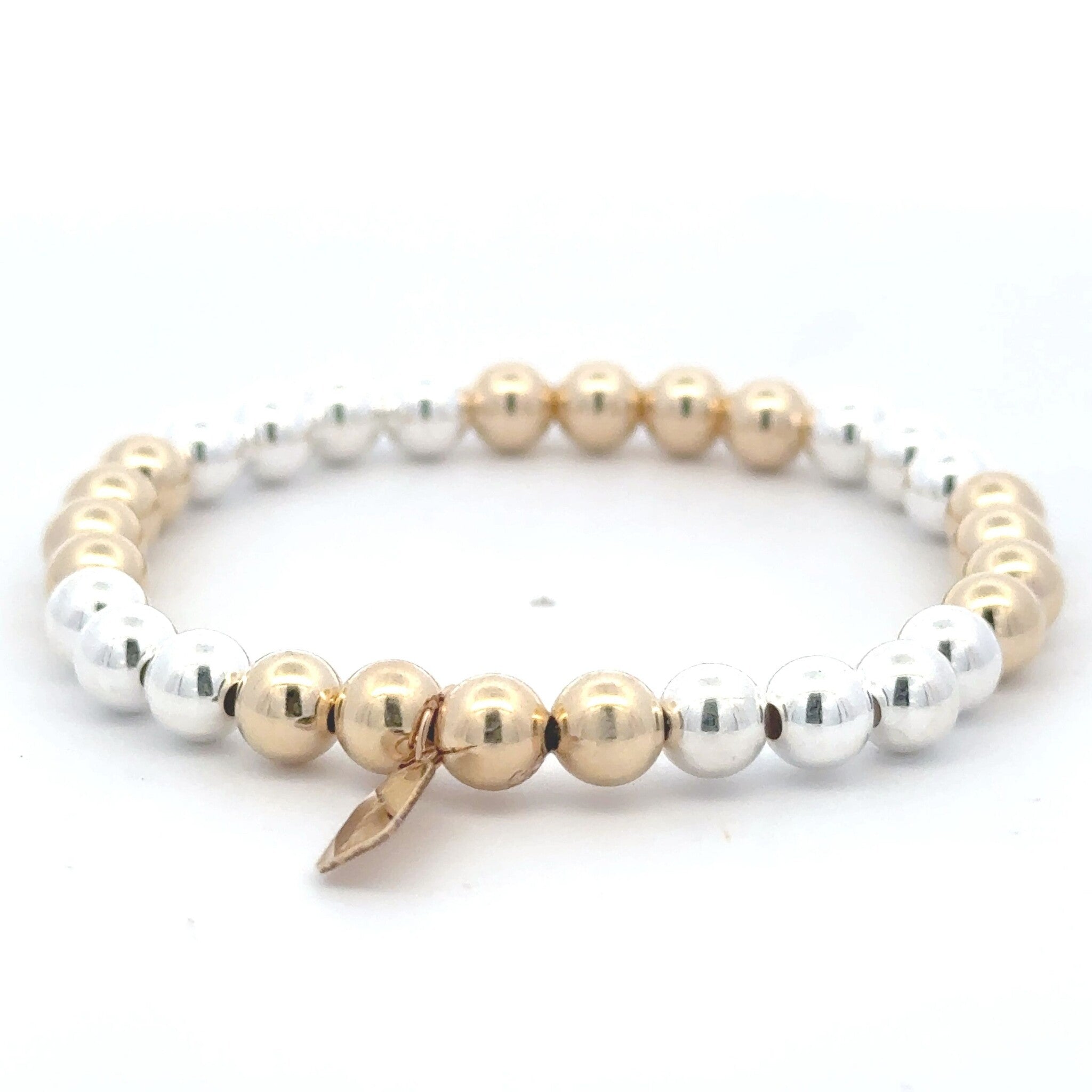 Bracelet élastique avec boules argentées et dorées.