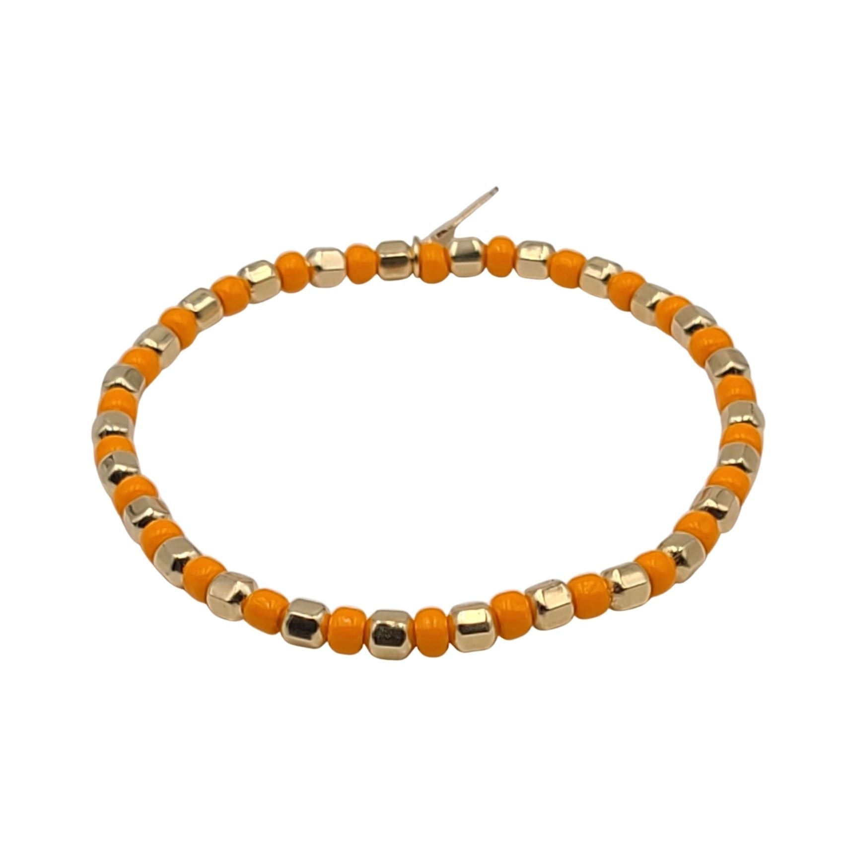 Bracelet élastique avec boules hexagonales dorées et colorées.