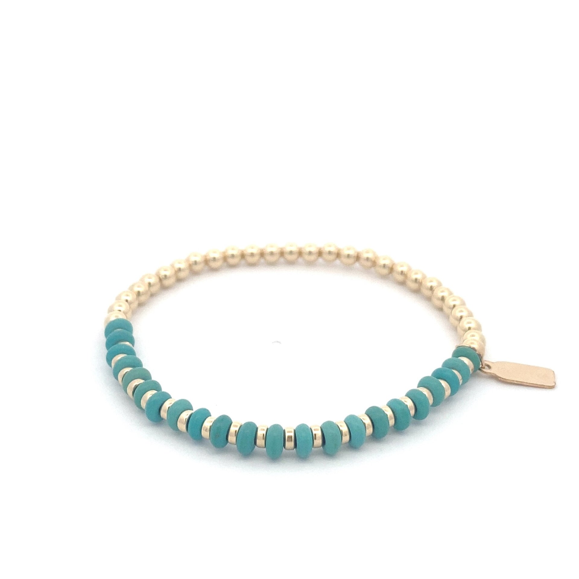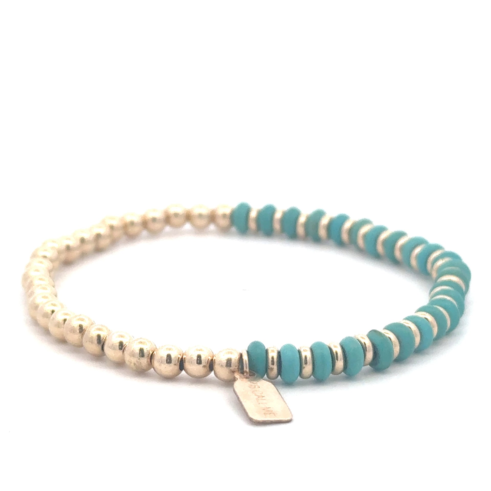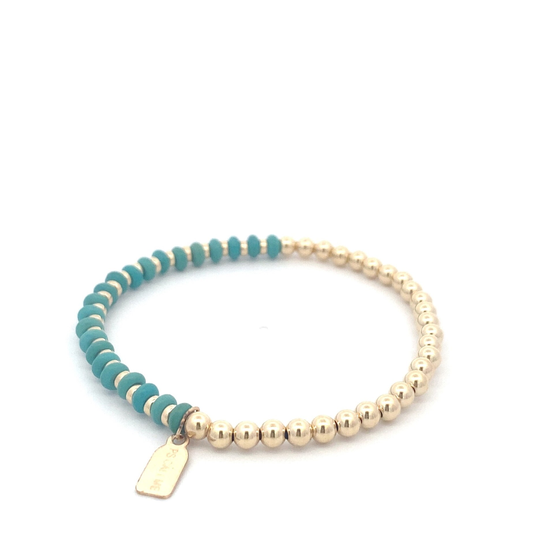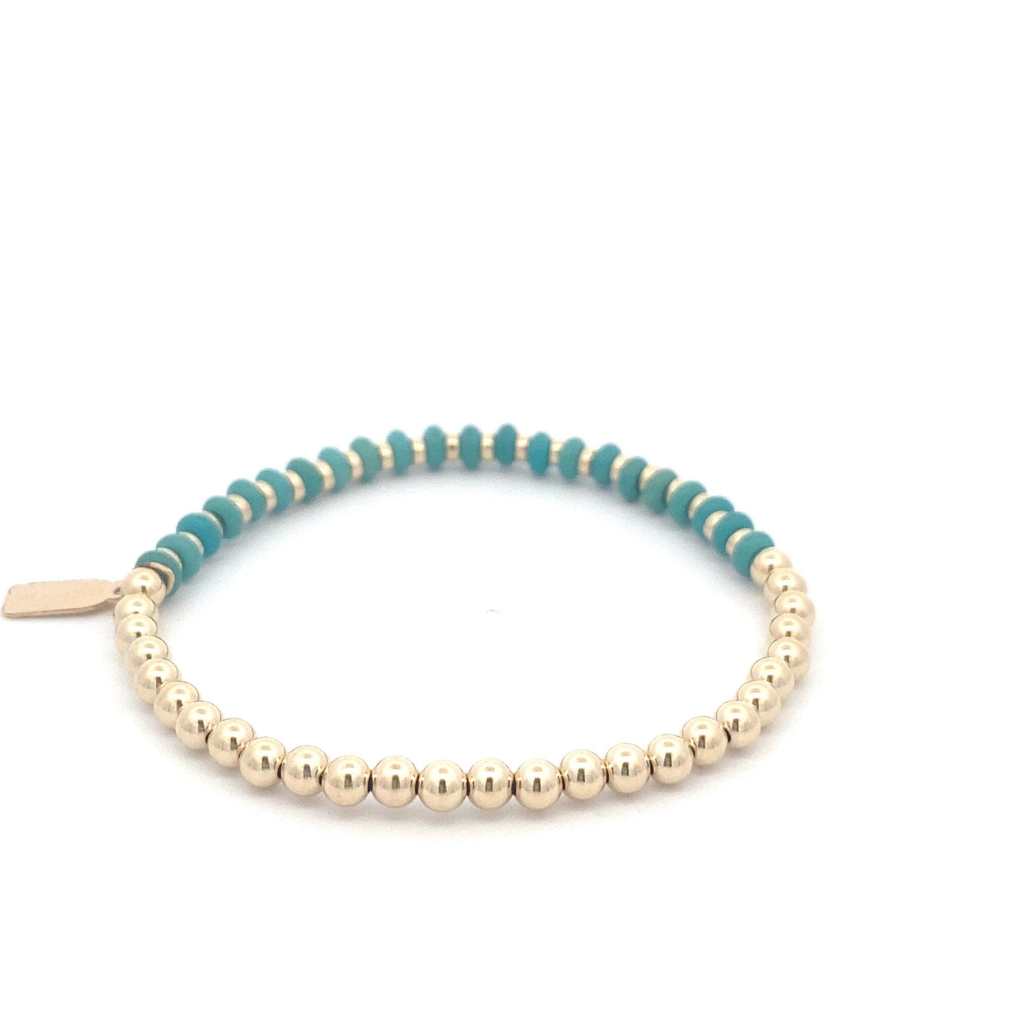 Bracelet élastique composé de boules rondes dorées et d'une moitié de perles colorées.