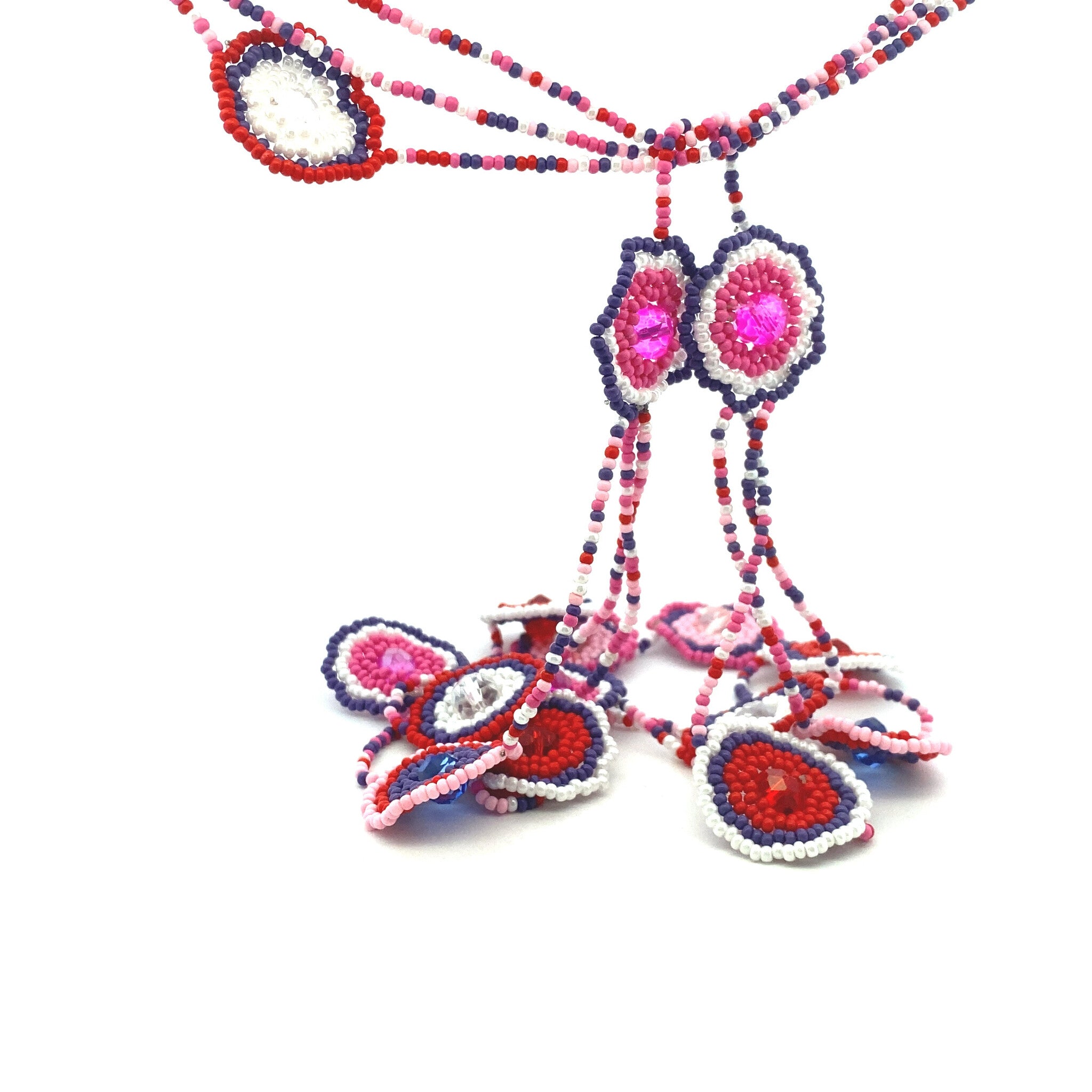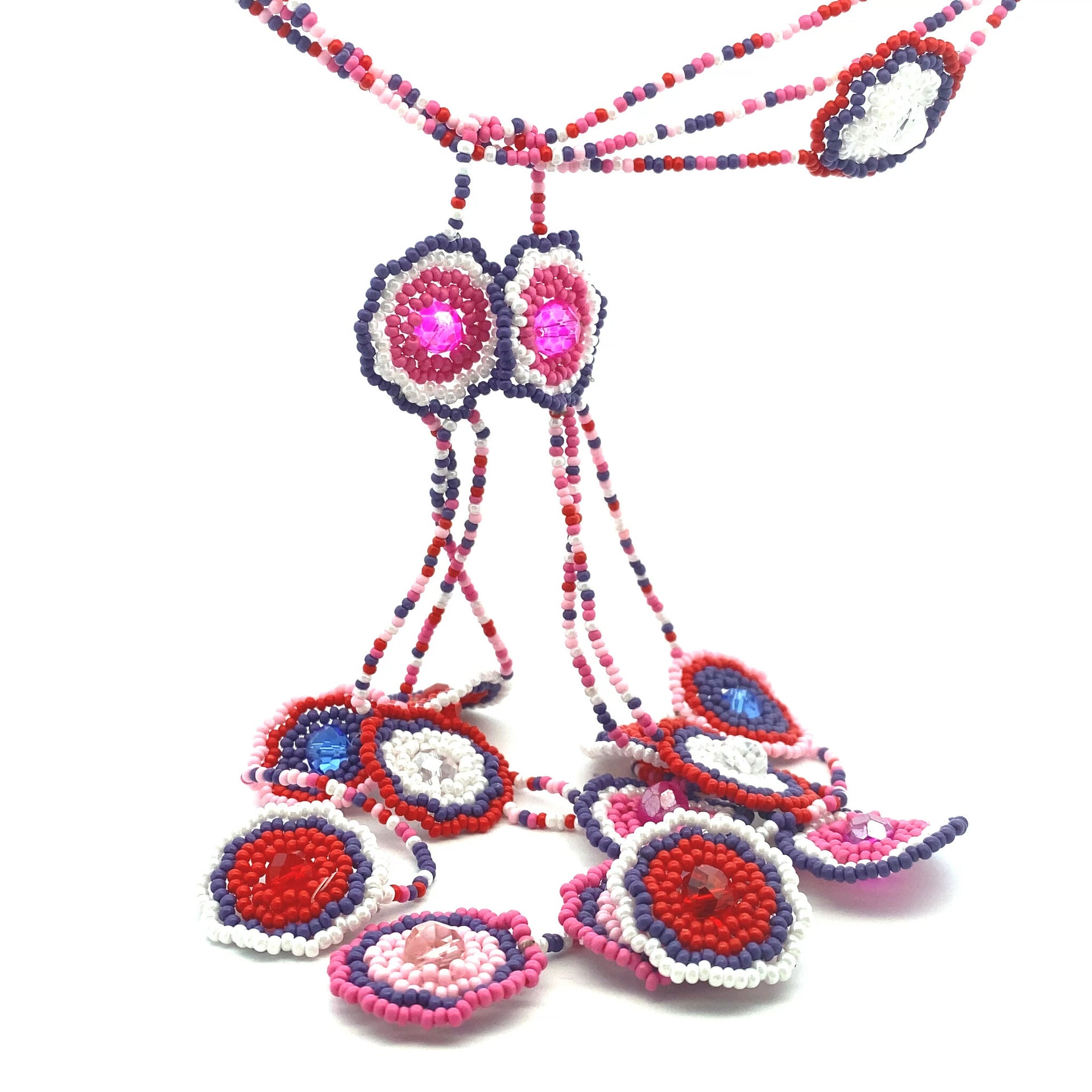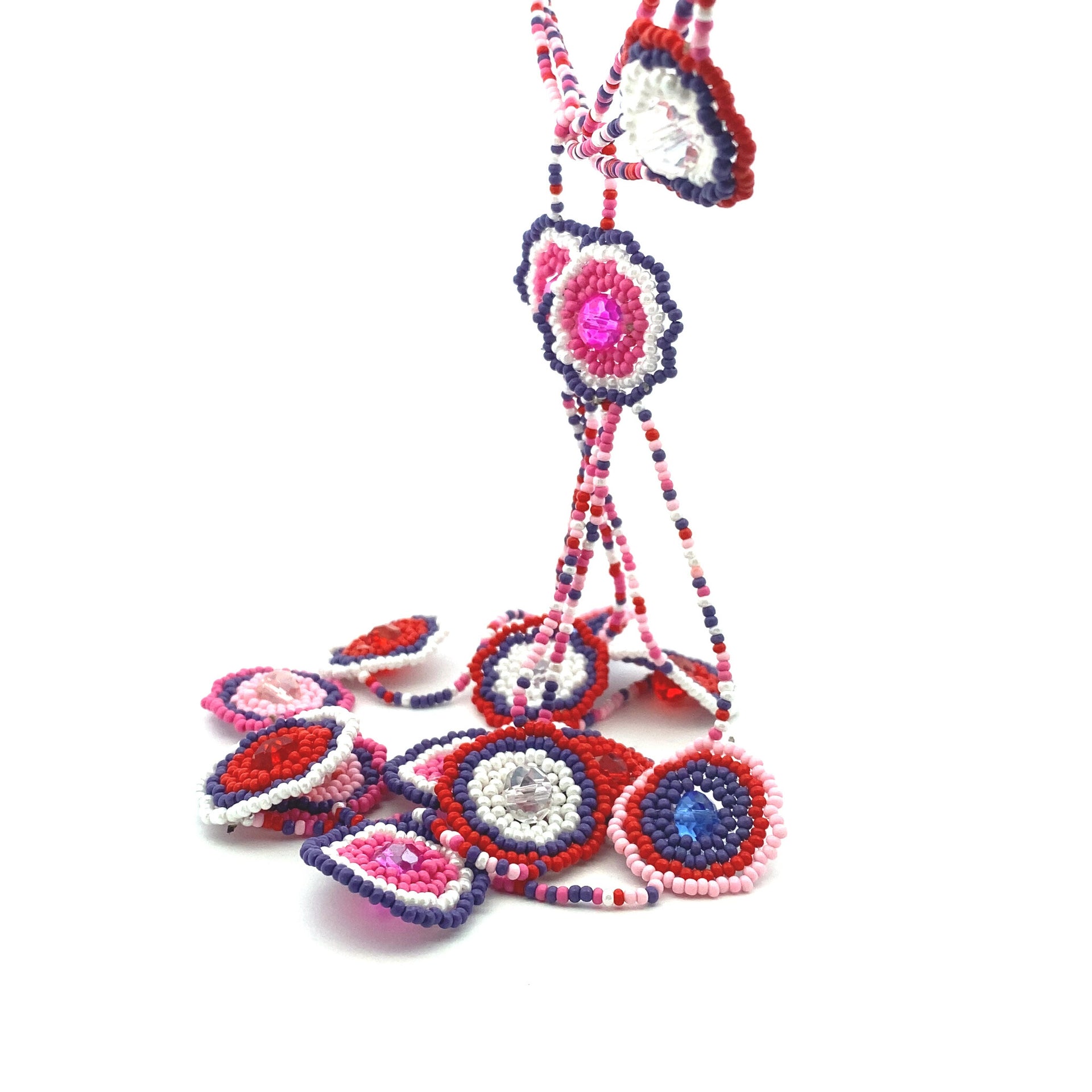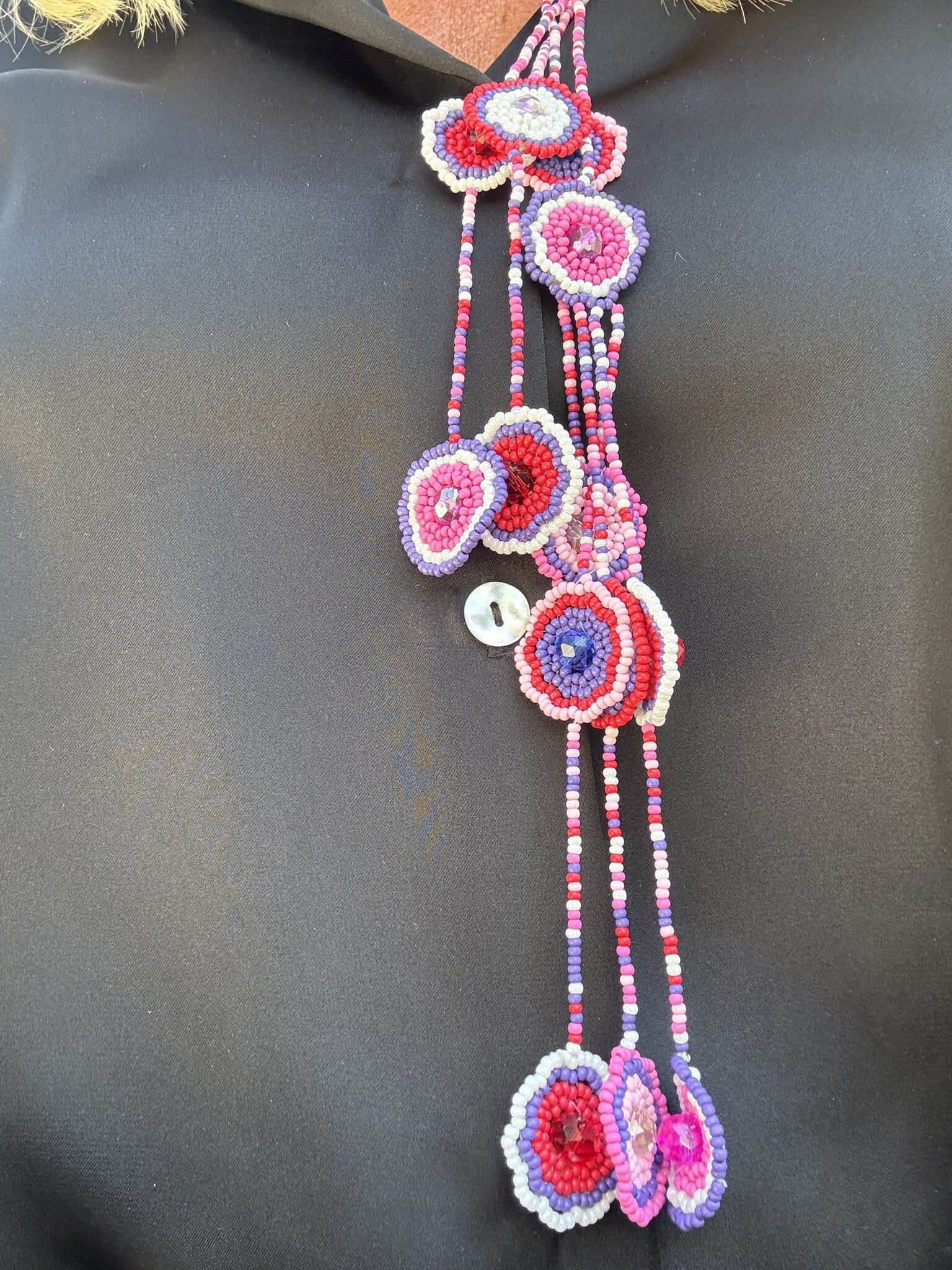Collier avec perles colorées et breloques en forme de fleur.