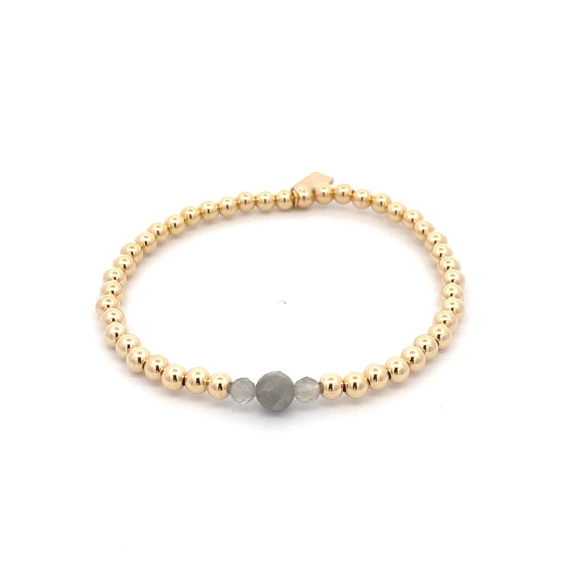 Bracelet élastique avec boules dorées et trois pierres colorées.