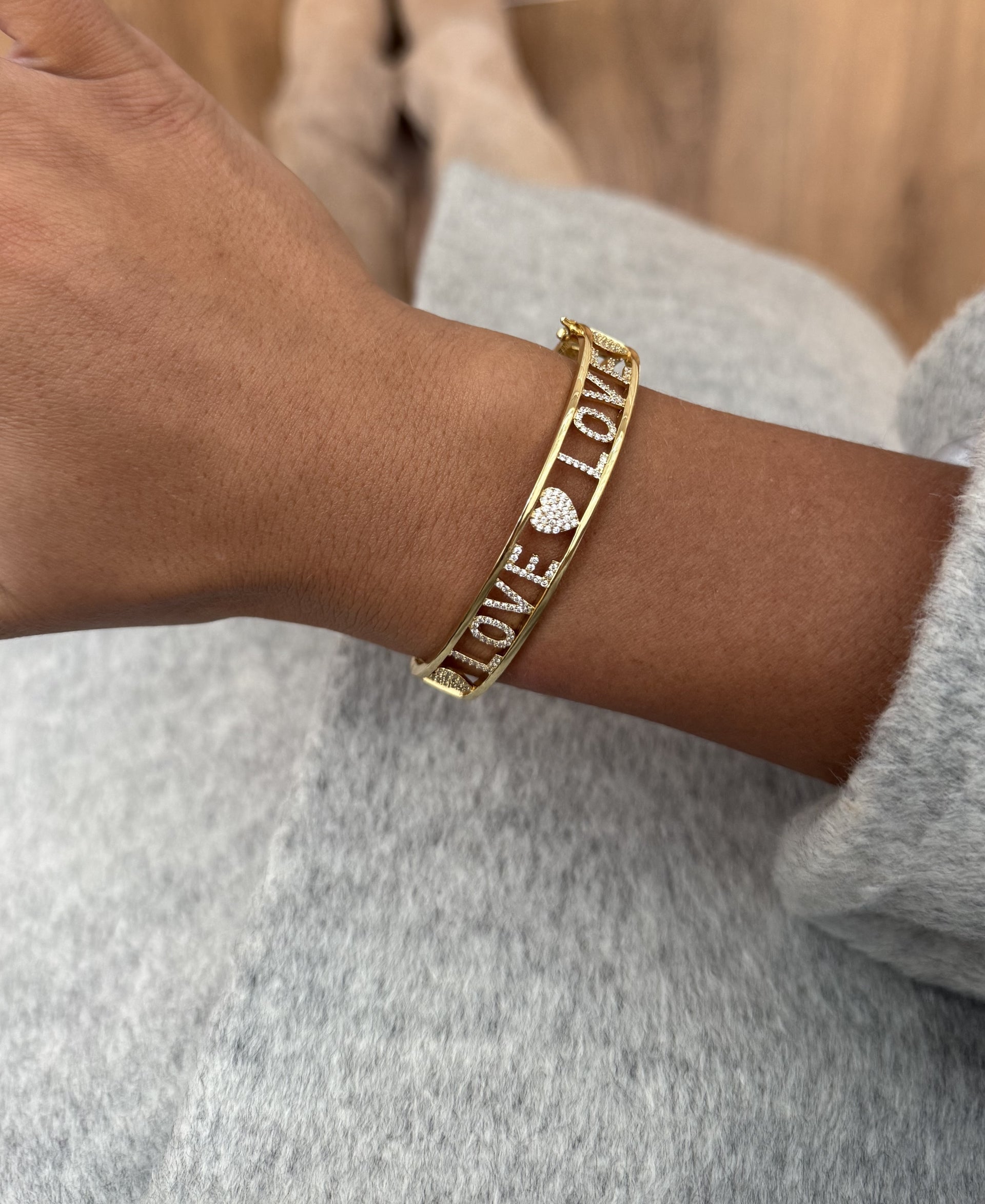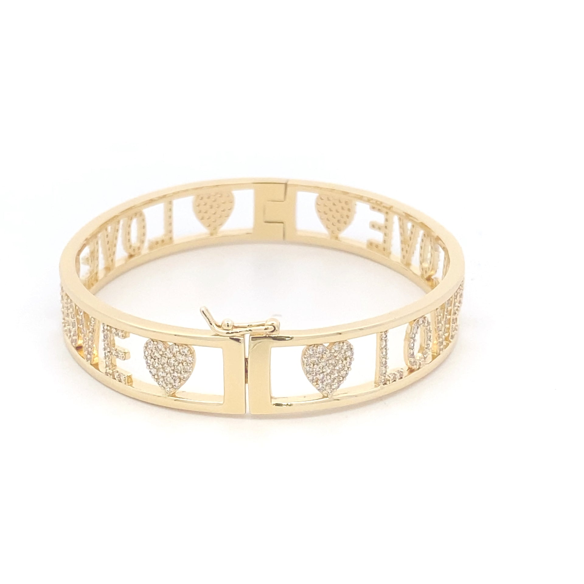 Bracciale rigido color oro con la scritta "Immagina tutte le persone che vivono in pace. Puoi dire io sono"