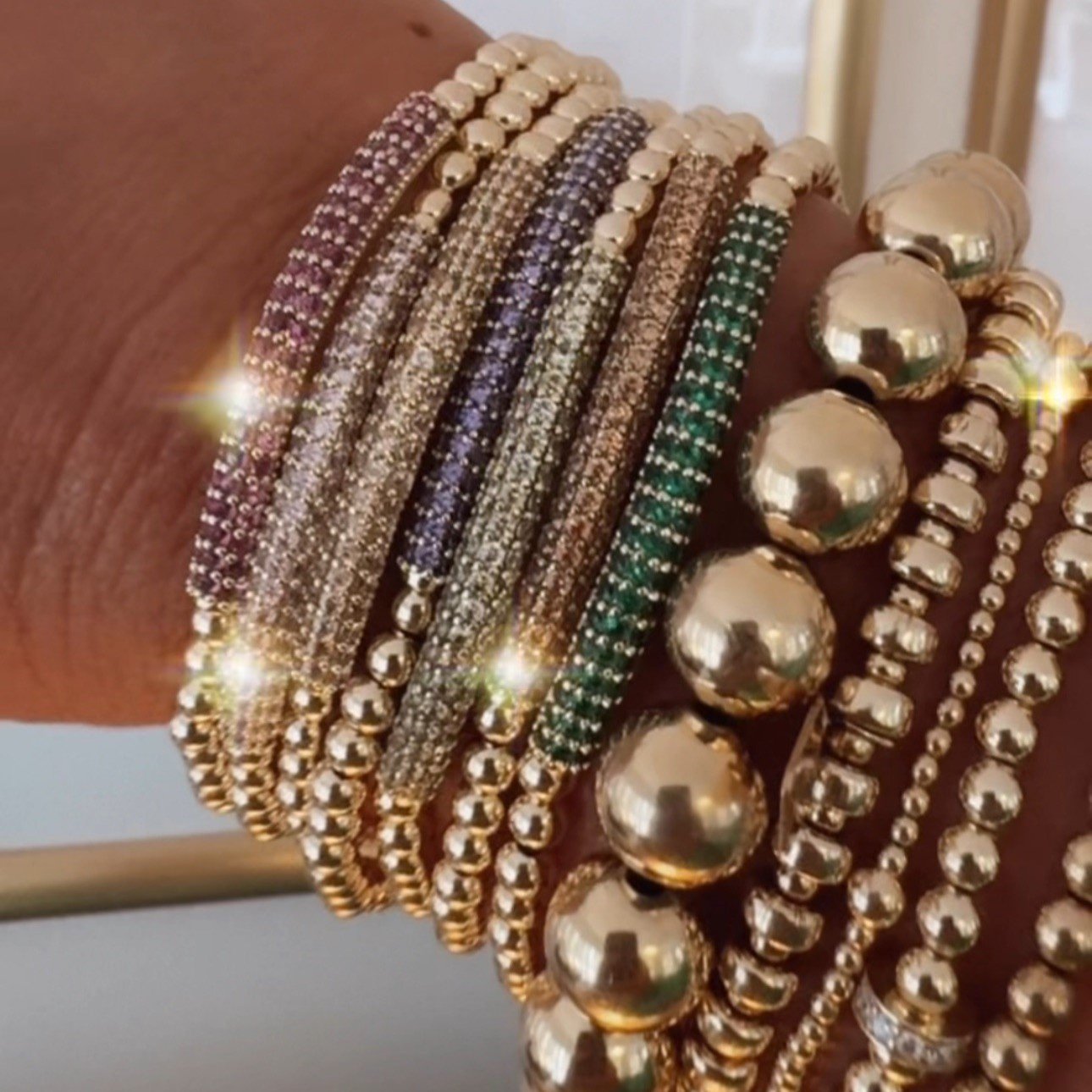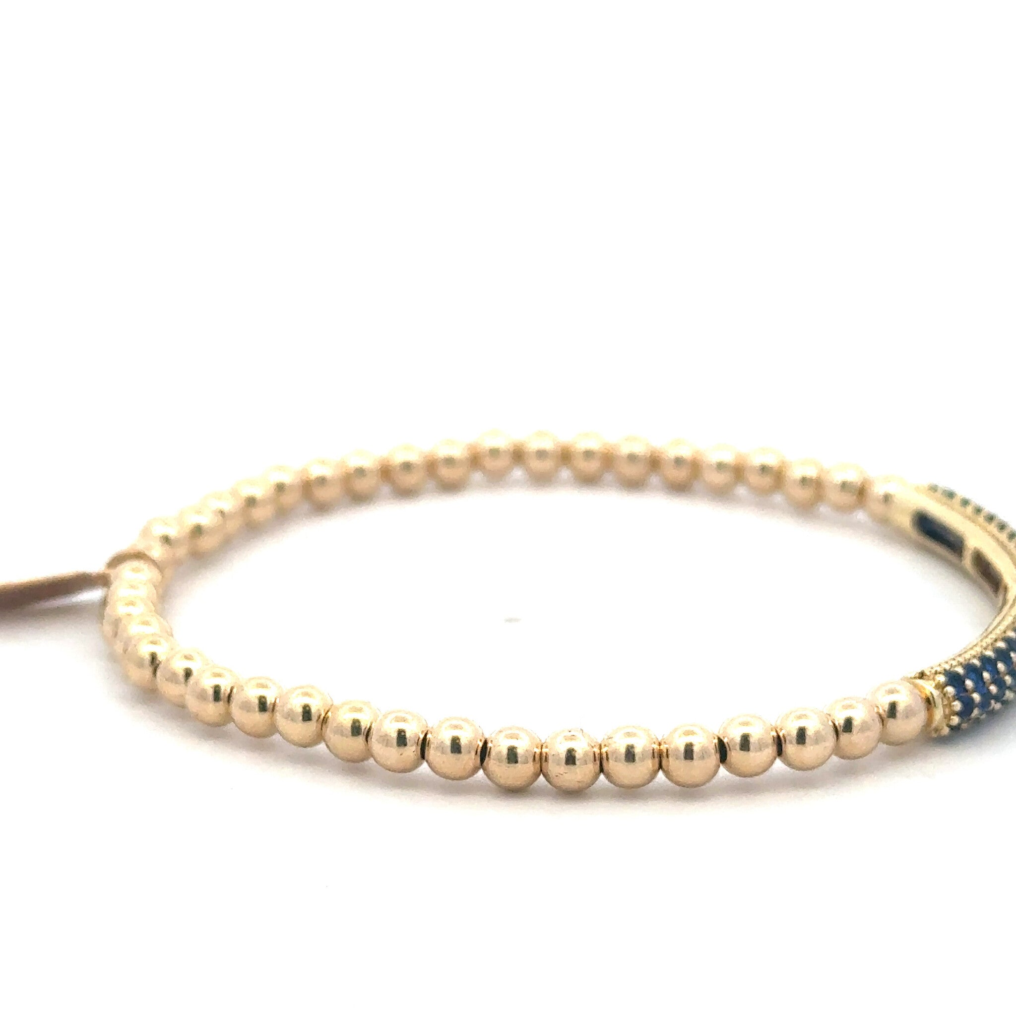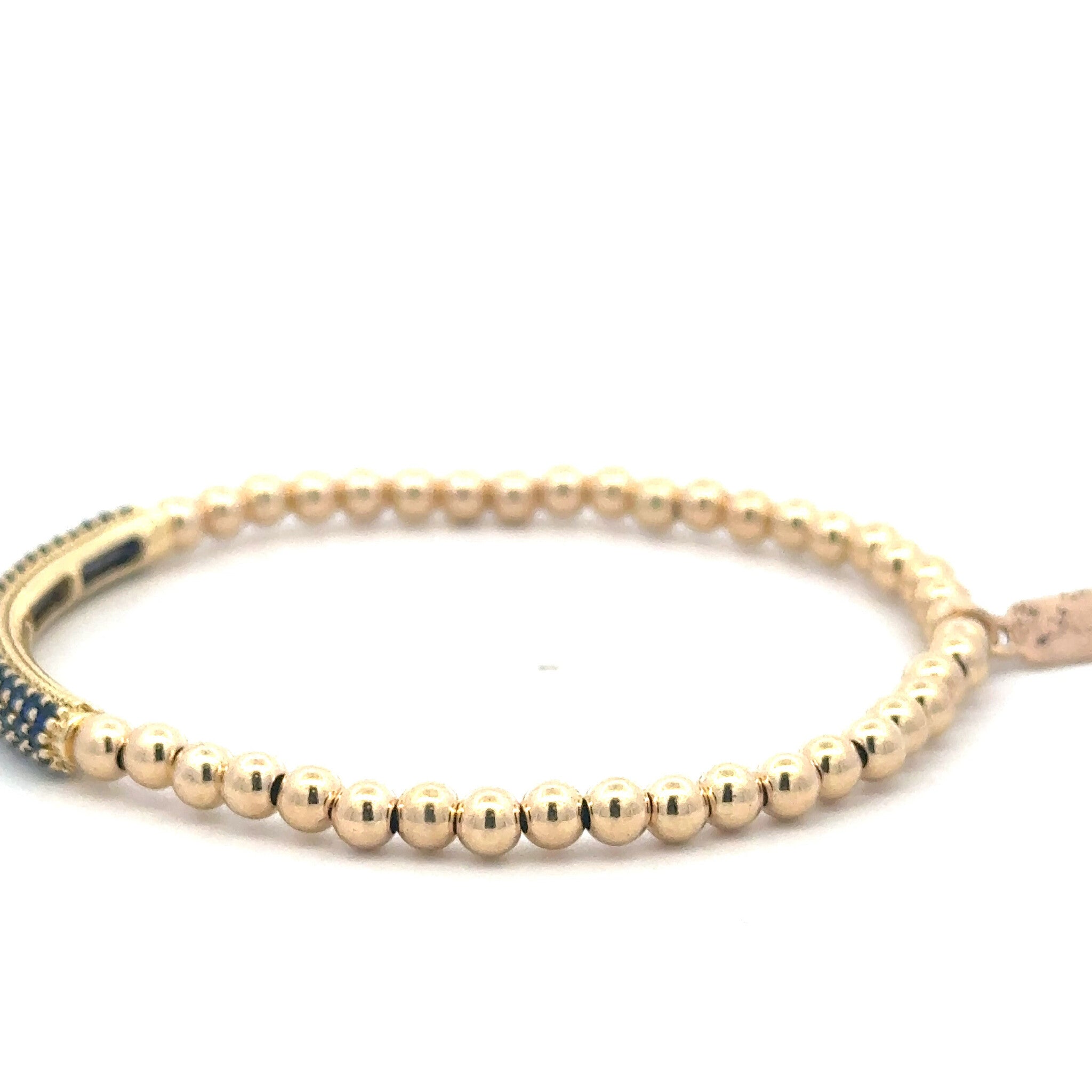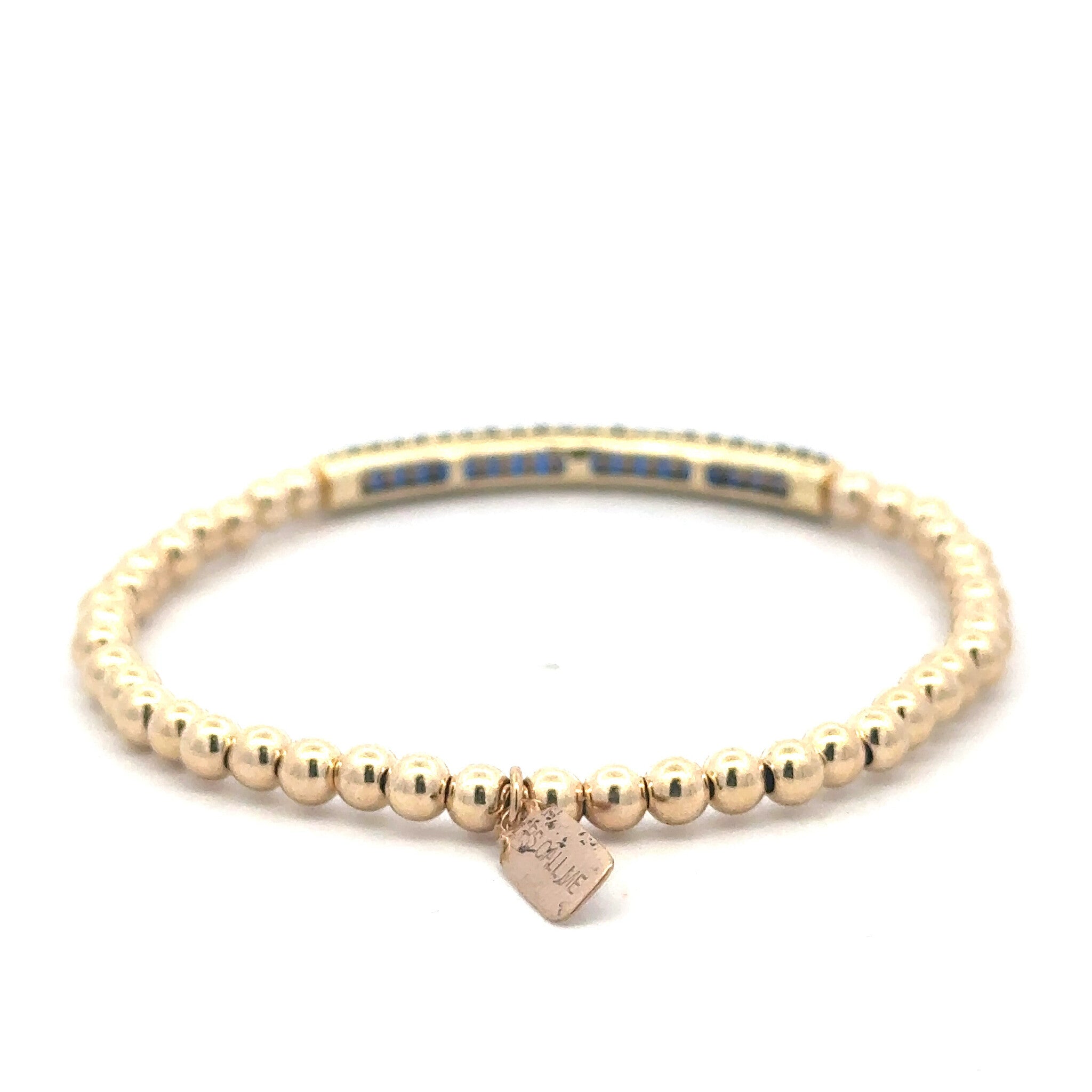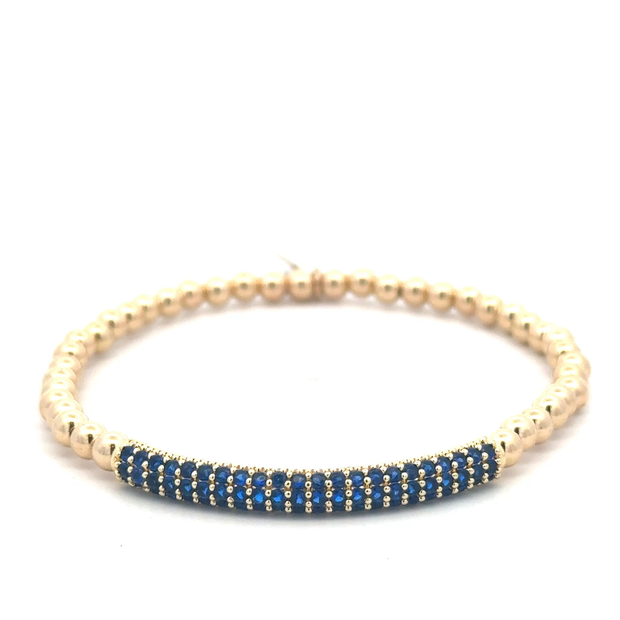 Bracciale elastico con palline color oro e una barretta di strass blu scuro.