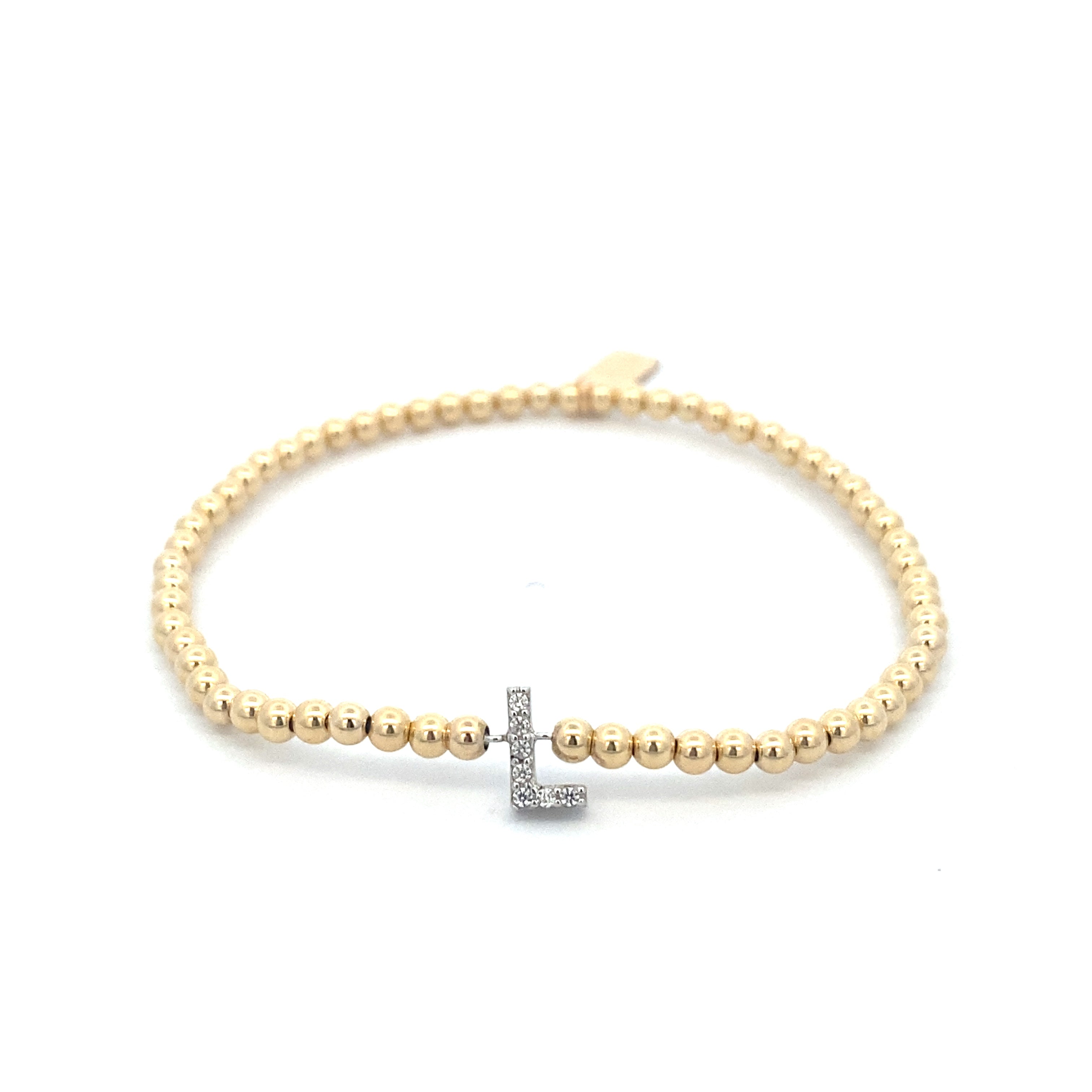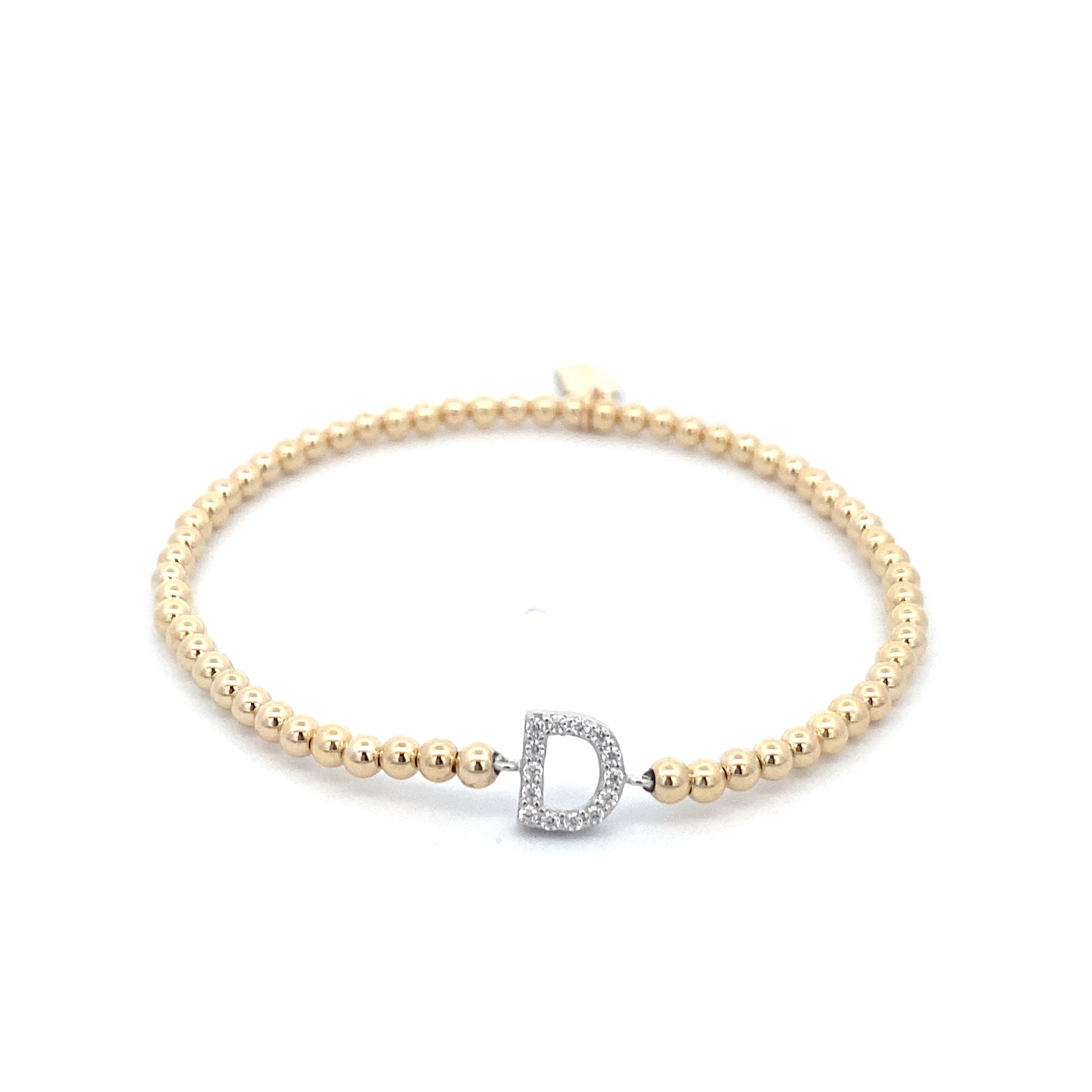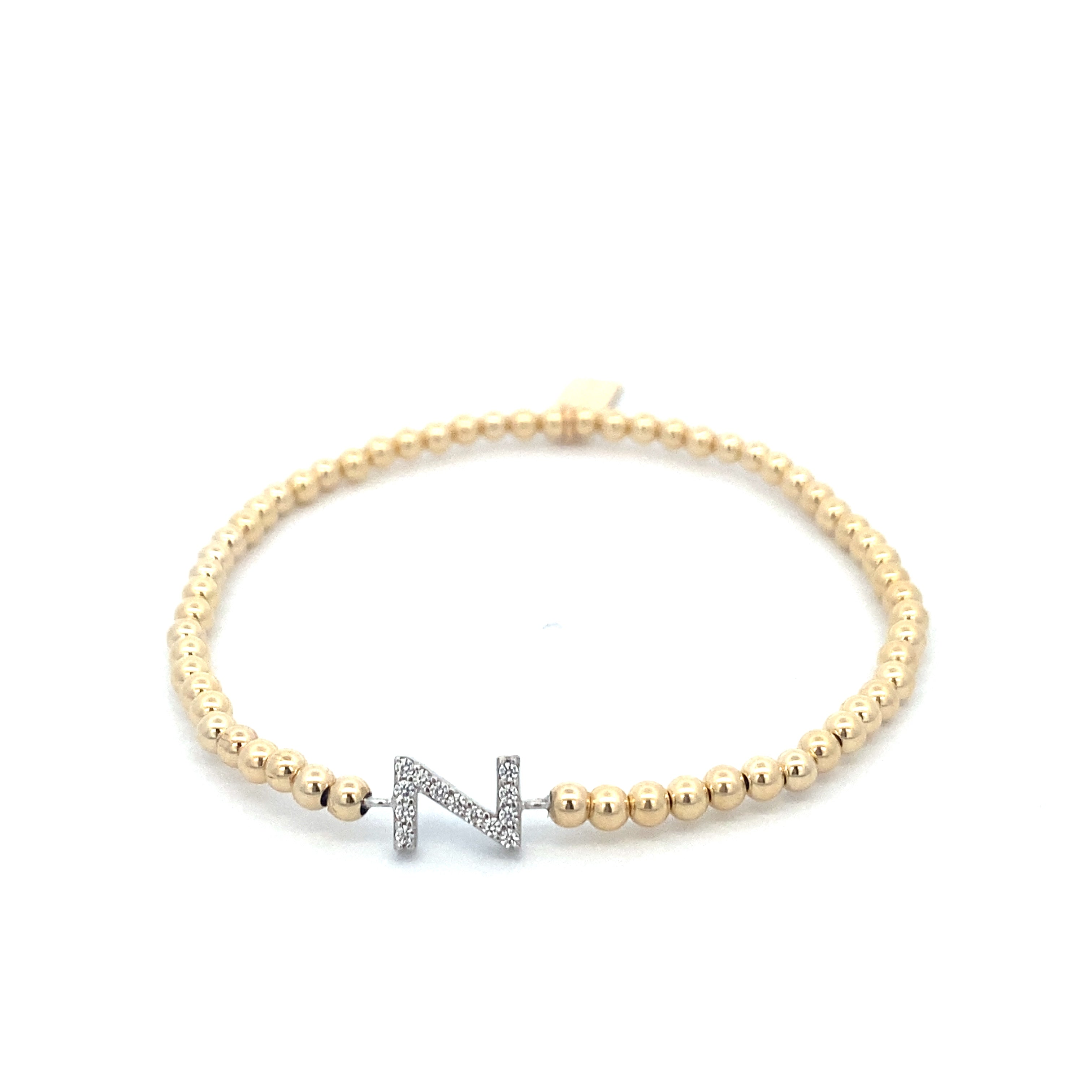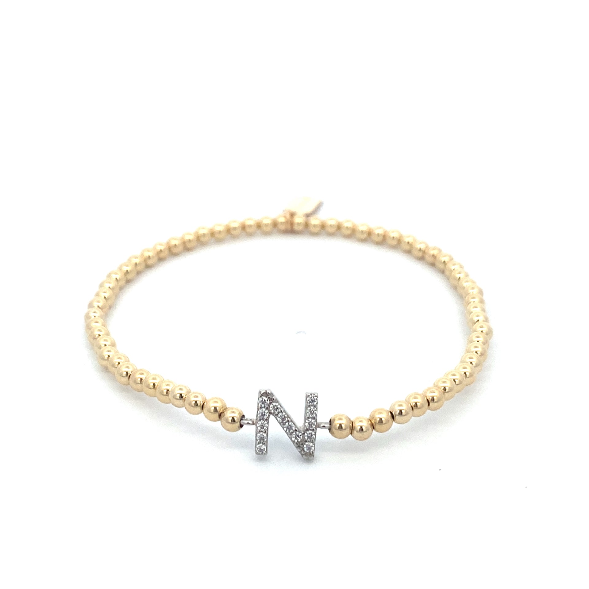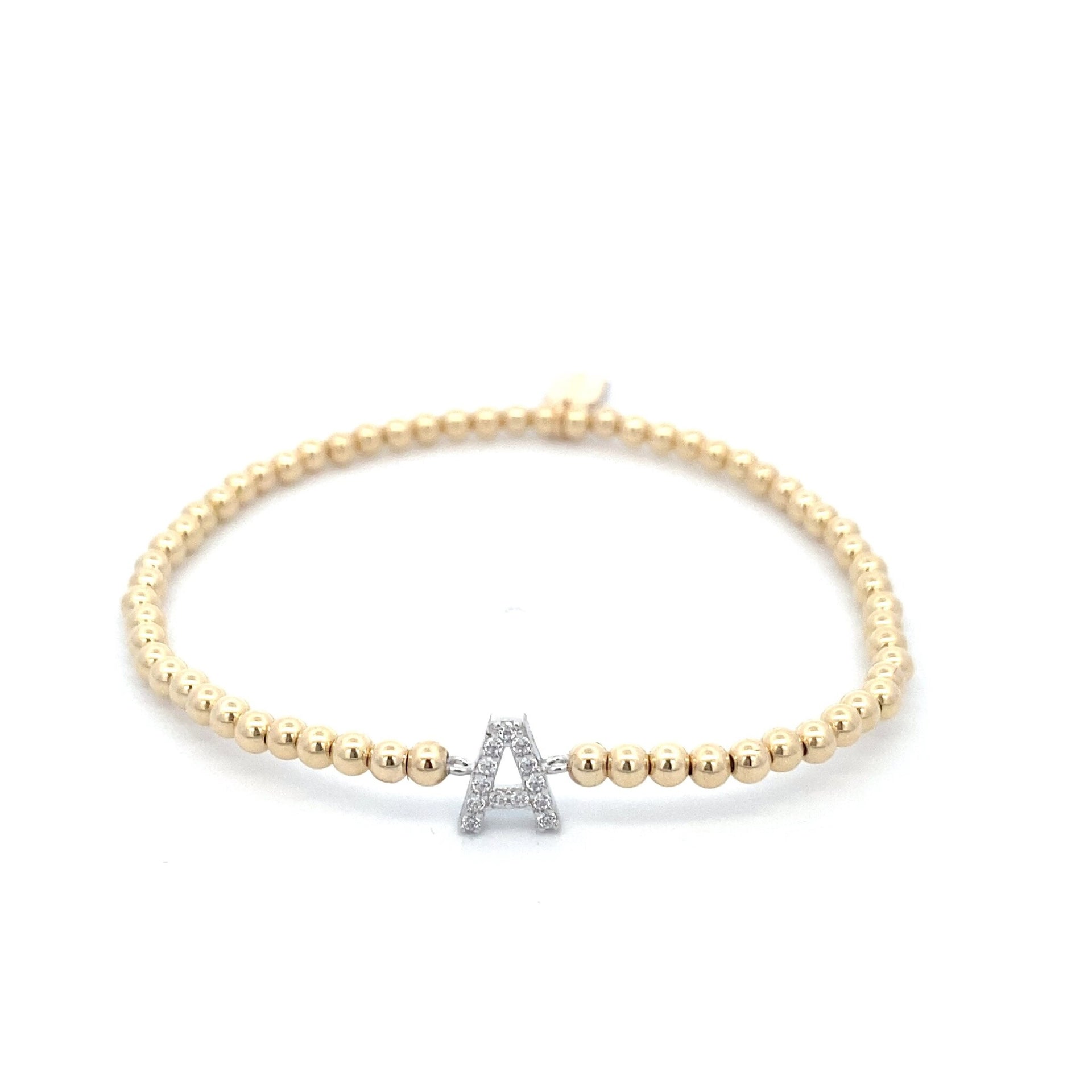 Bracciale elastico con palline color oro e ciondolo in argento con zirconi a forma di iniziale.