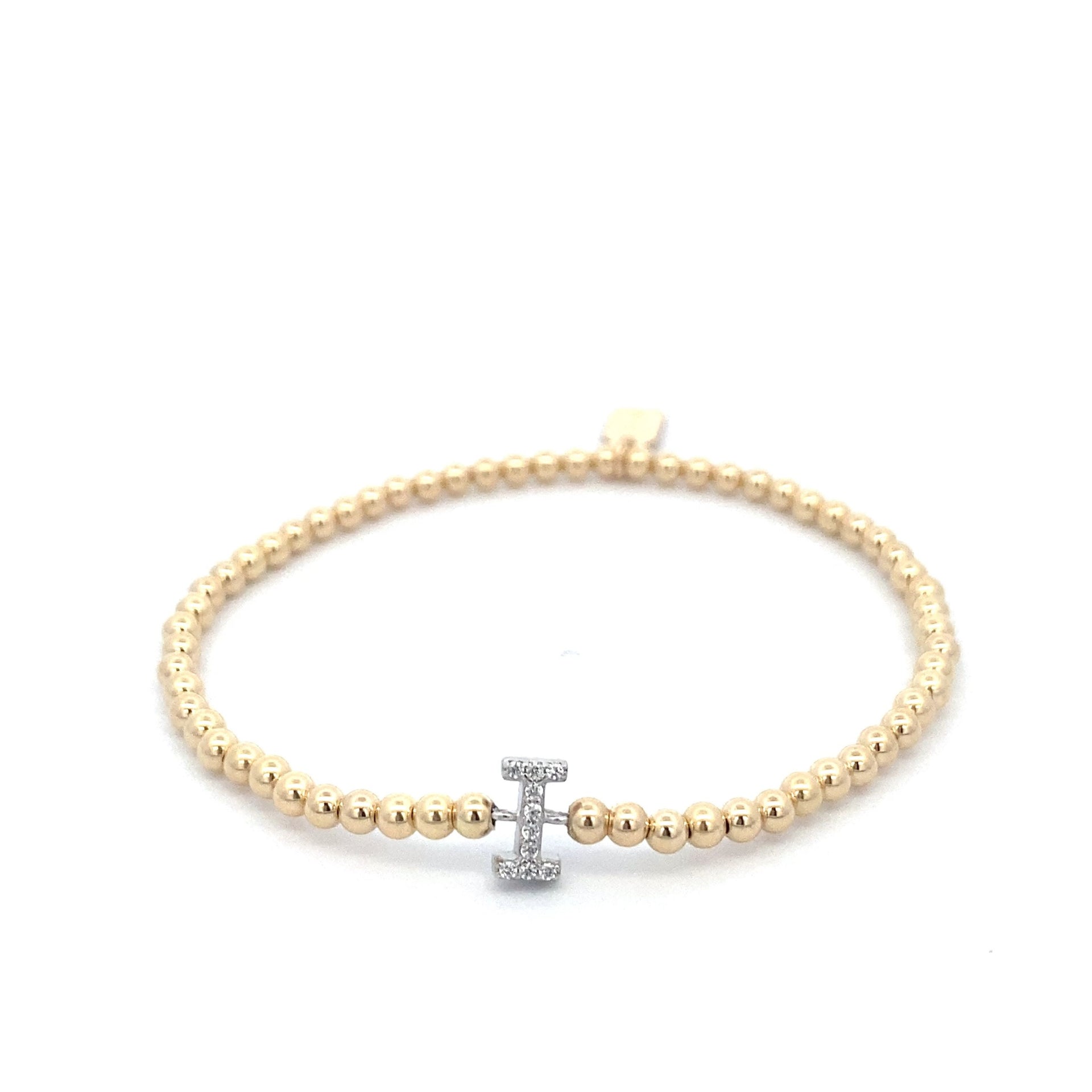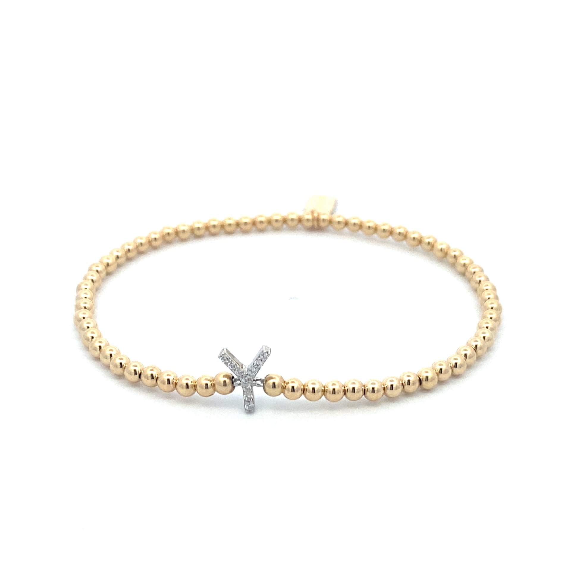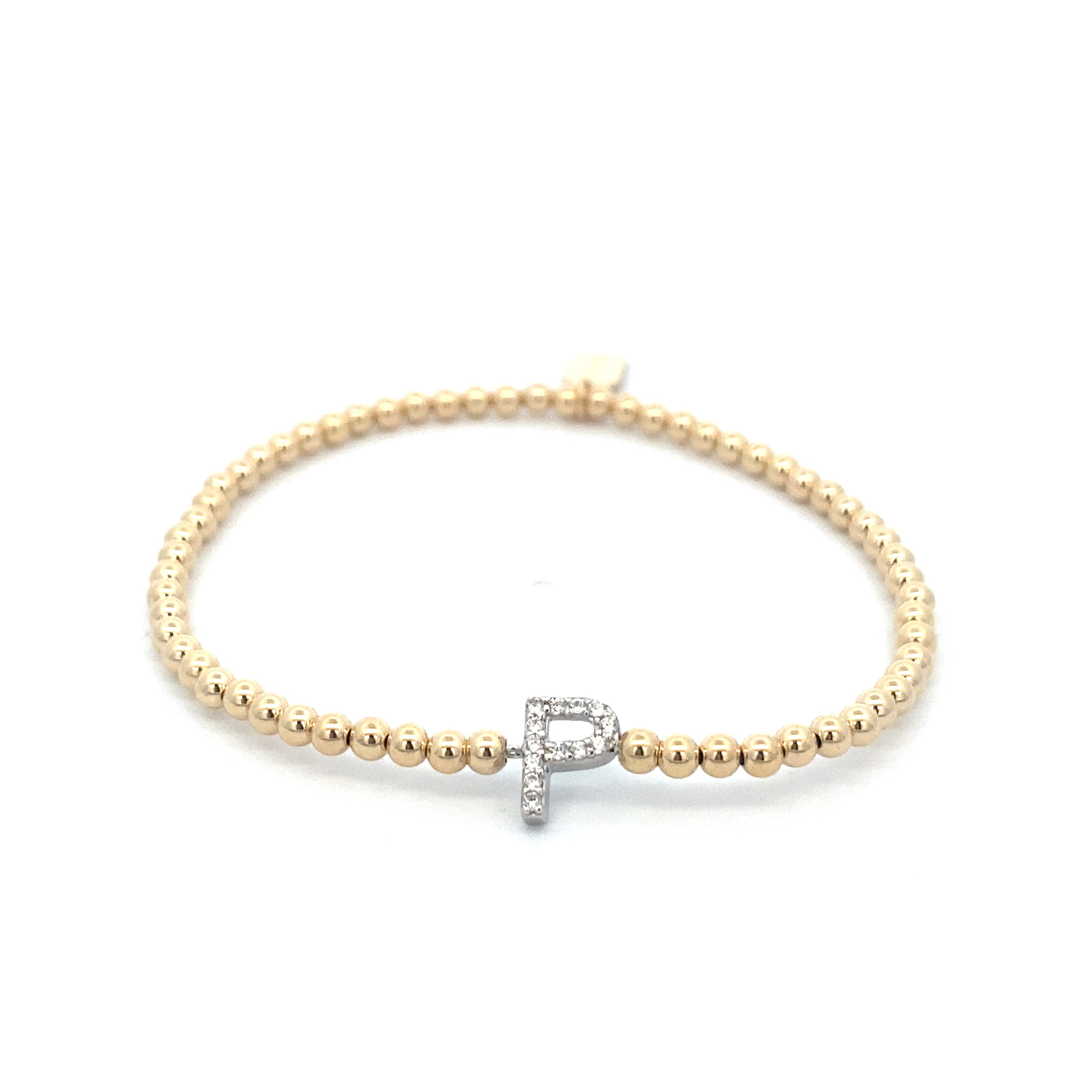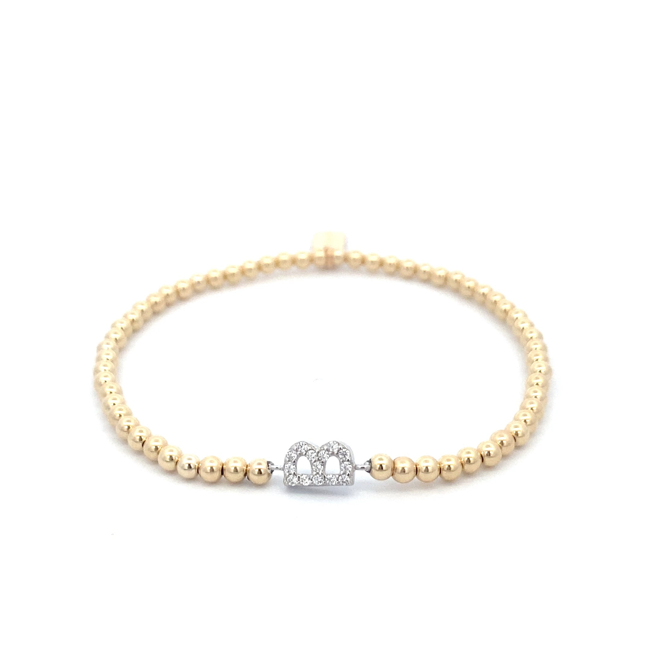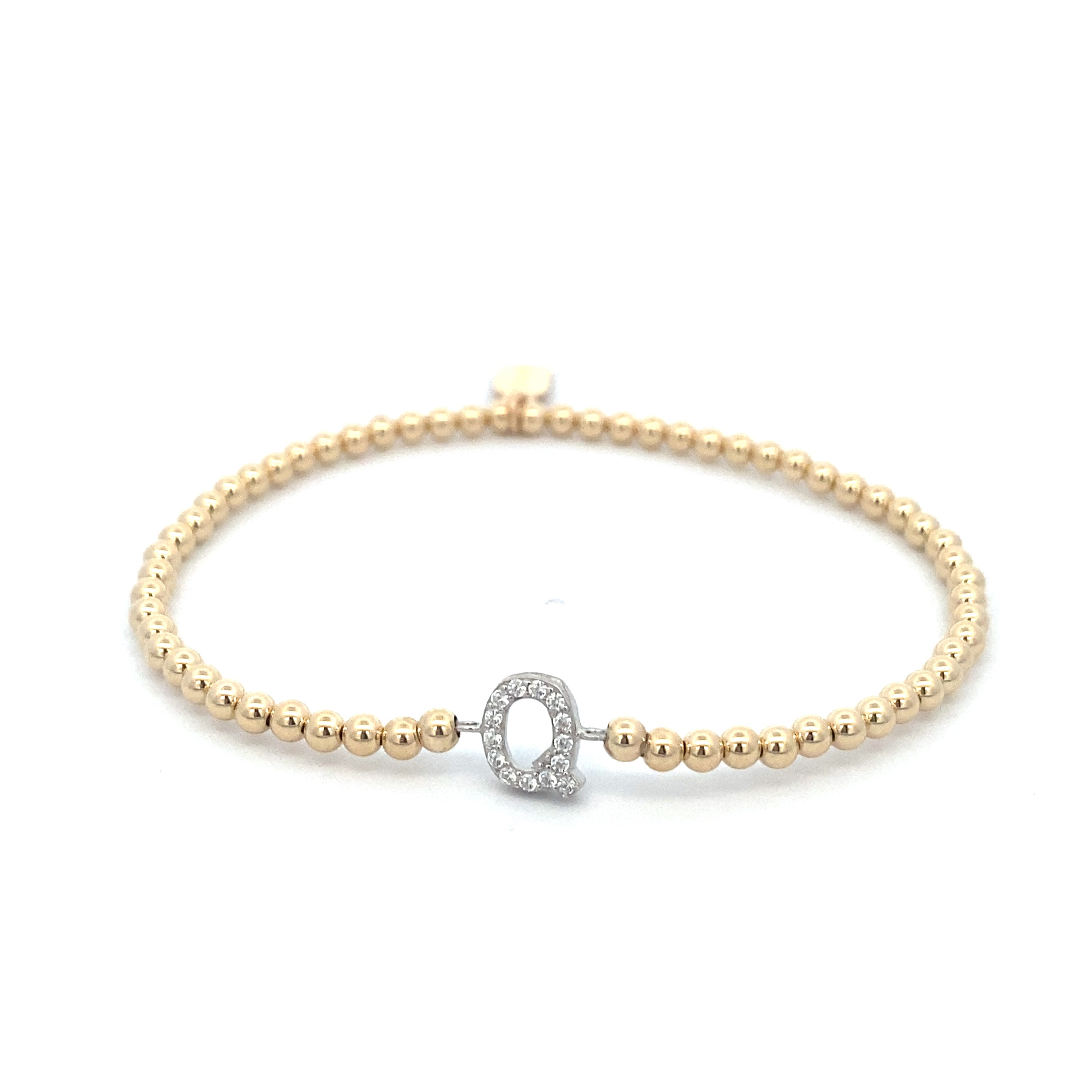 Bracciale elastico con palline color oro e ciondolo in argento con zirconi a forma di iniziale.