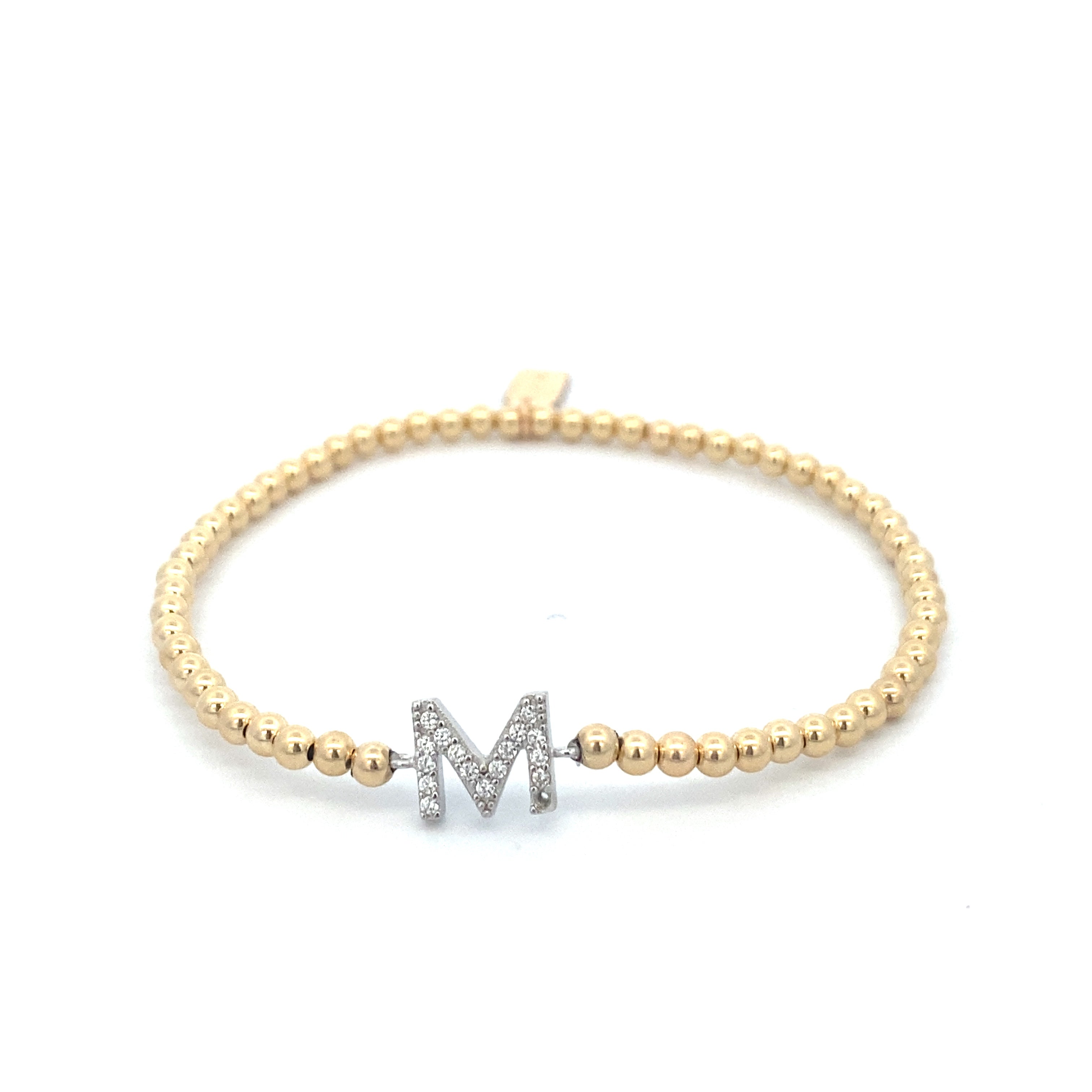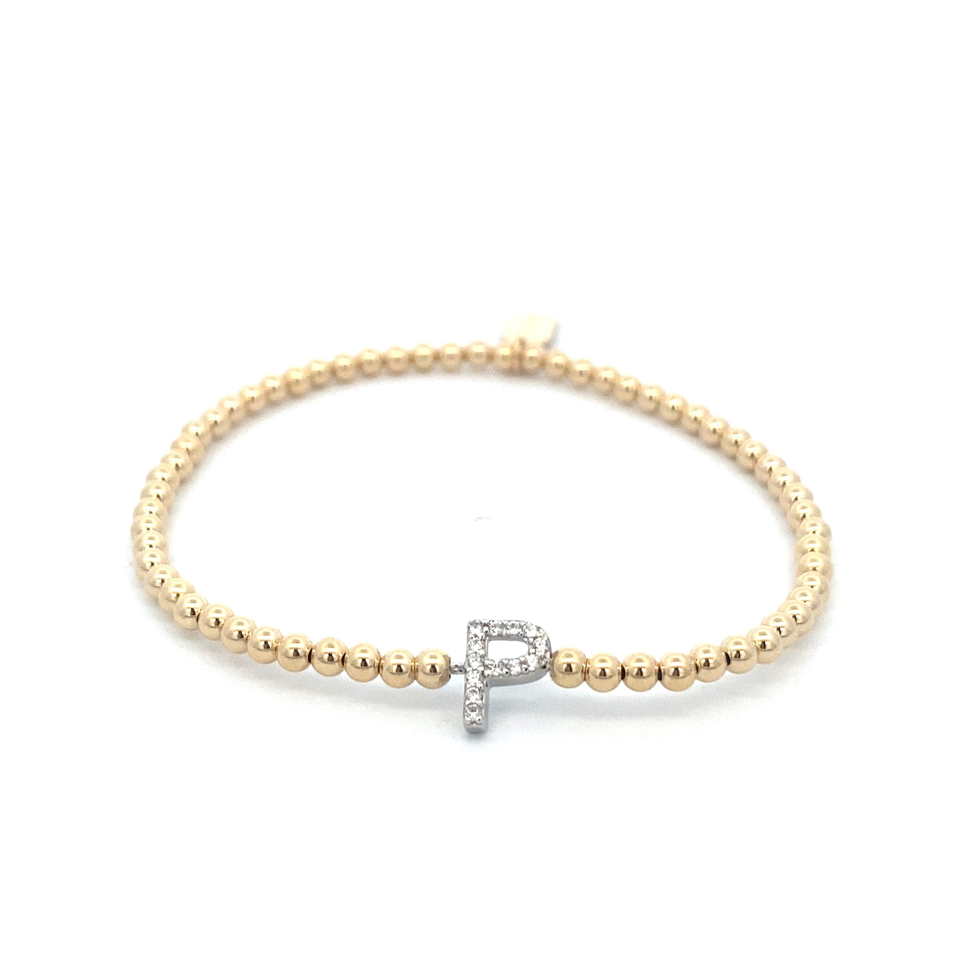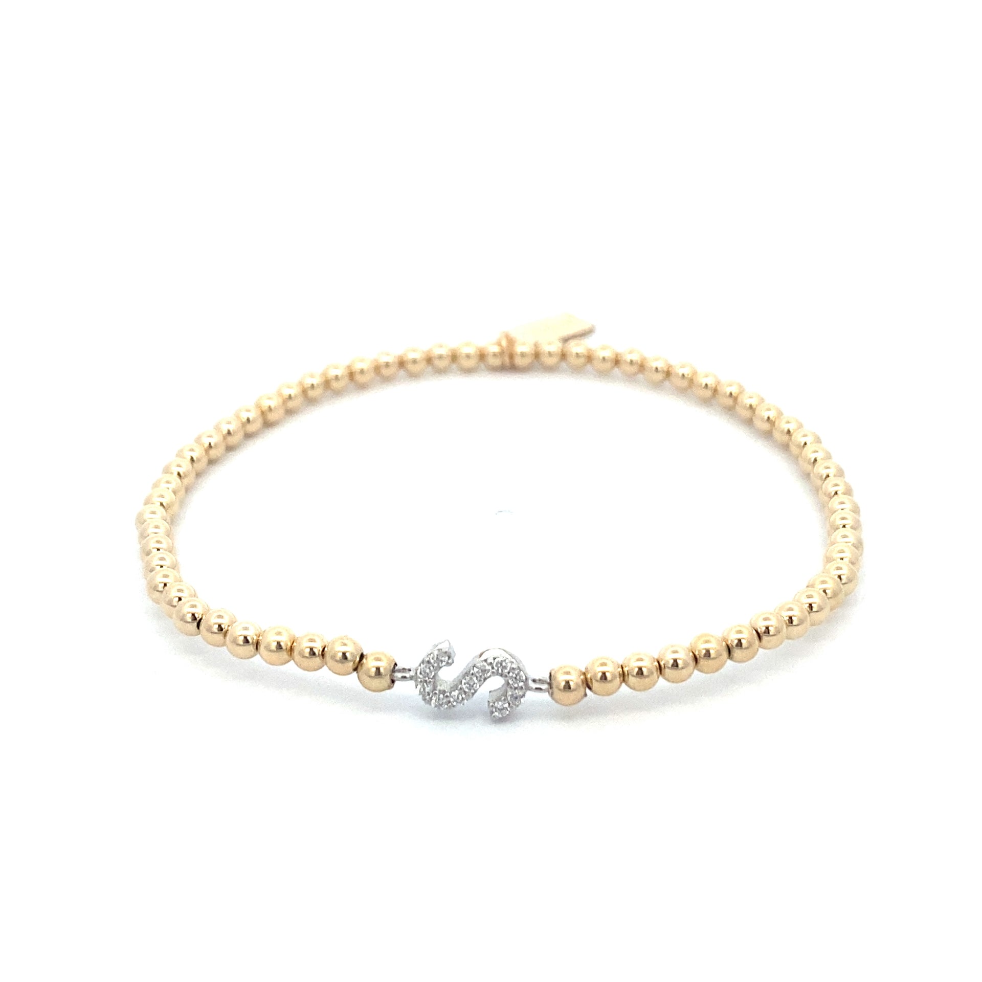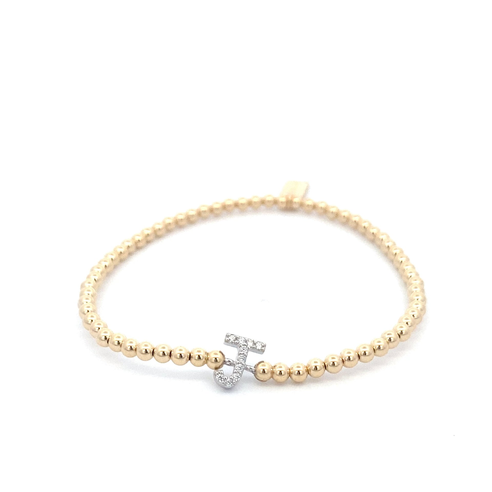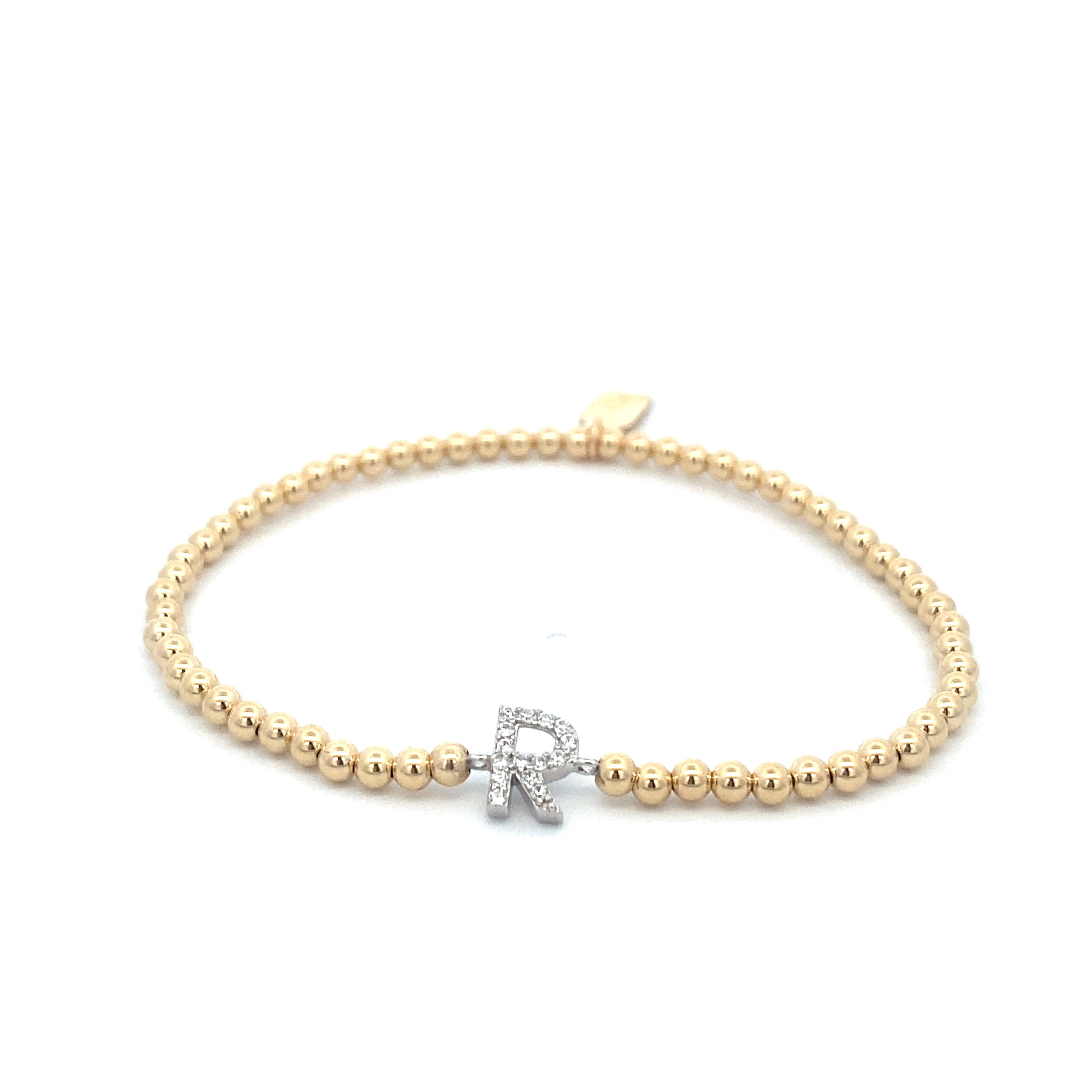 Bracciale elastico con palline color oro e ciondolo in argento con zirconi a forma di iniziale.