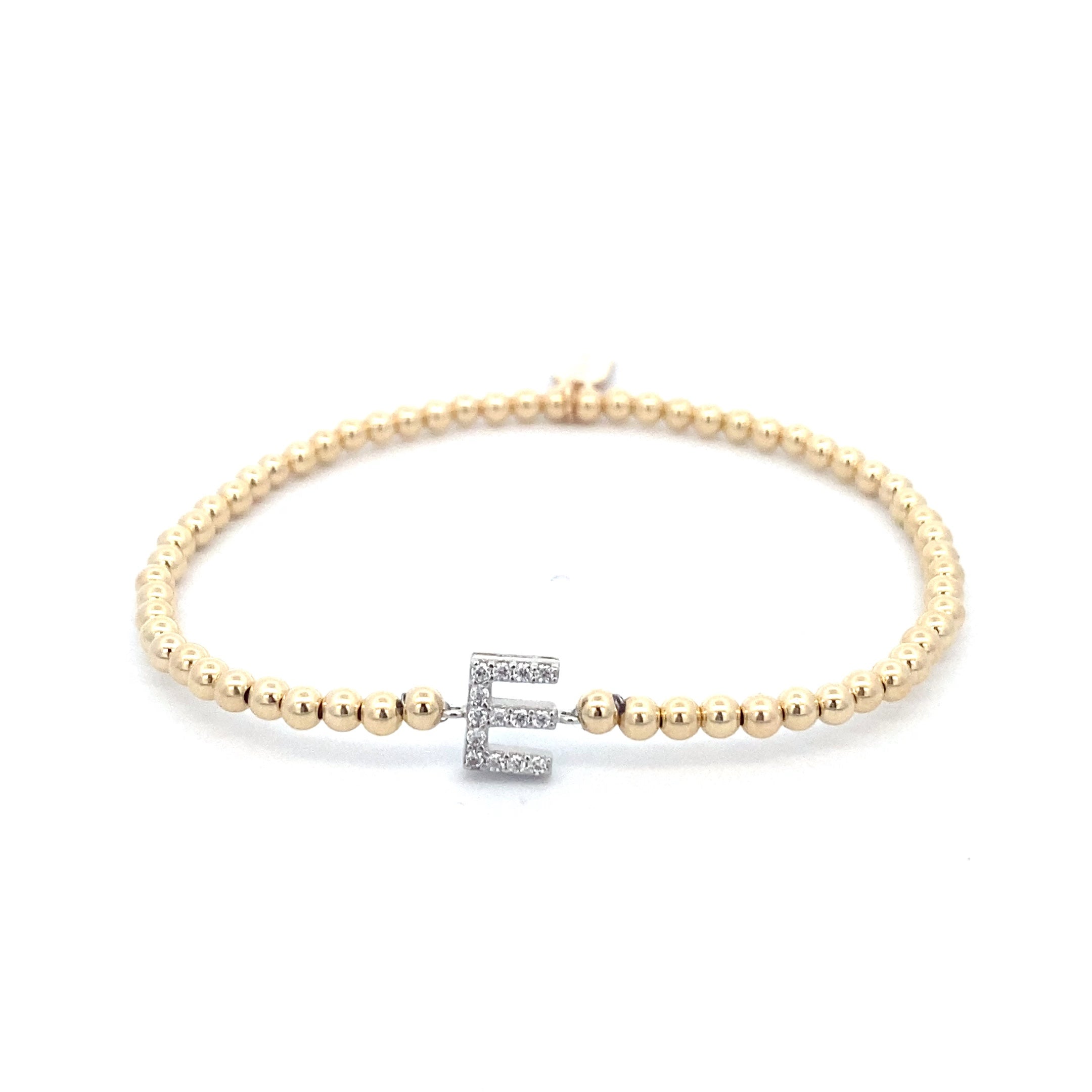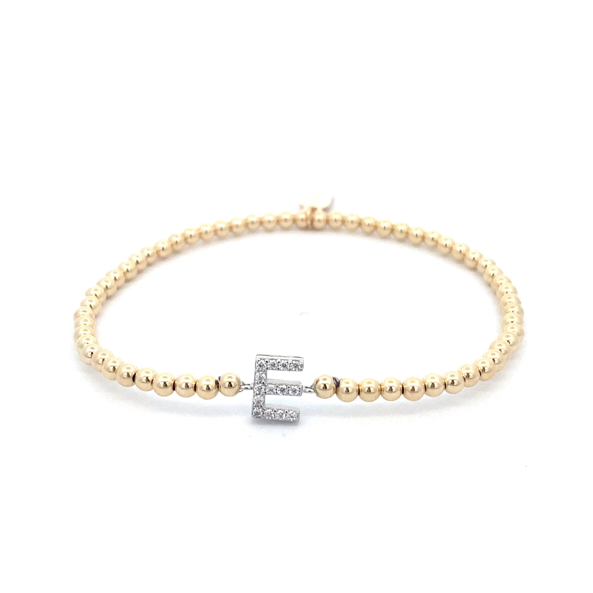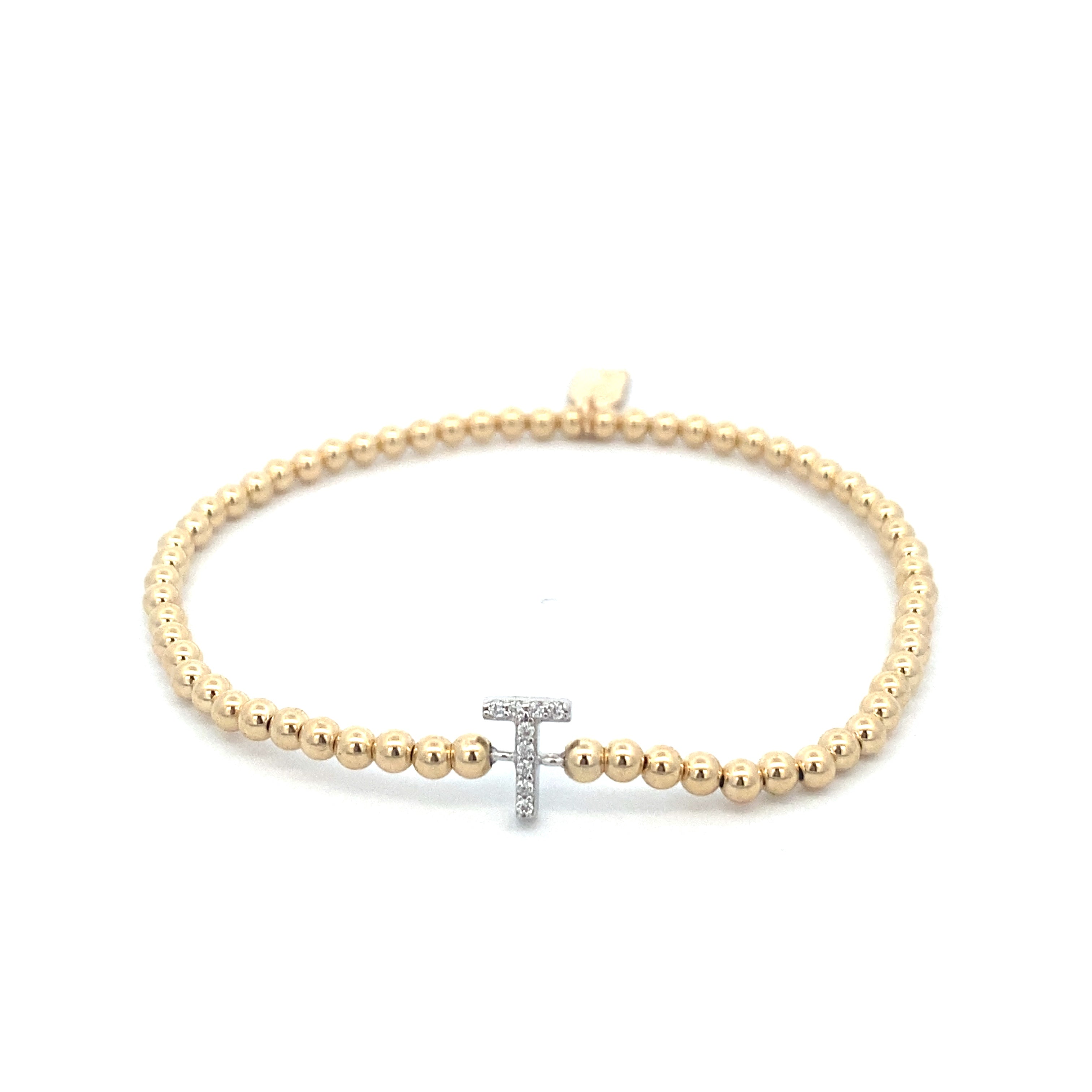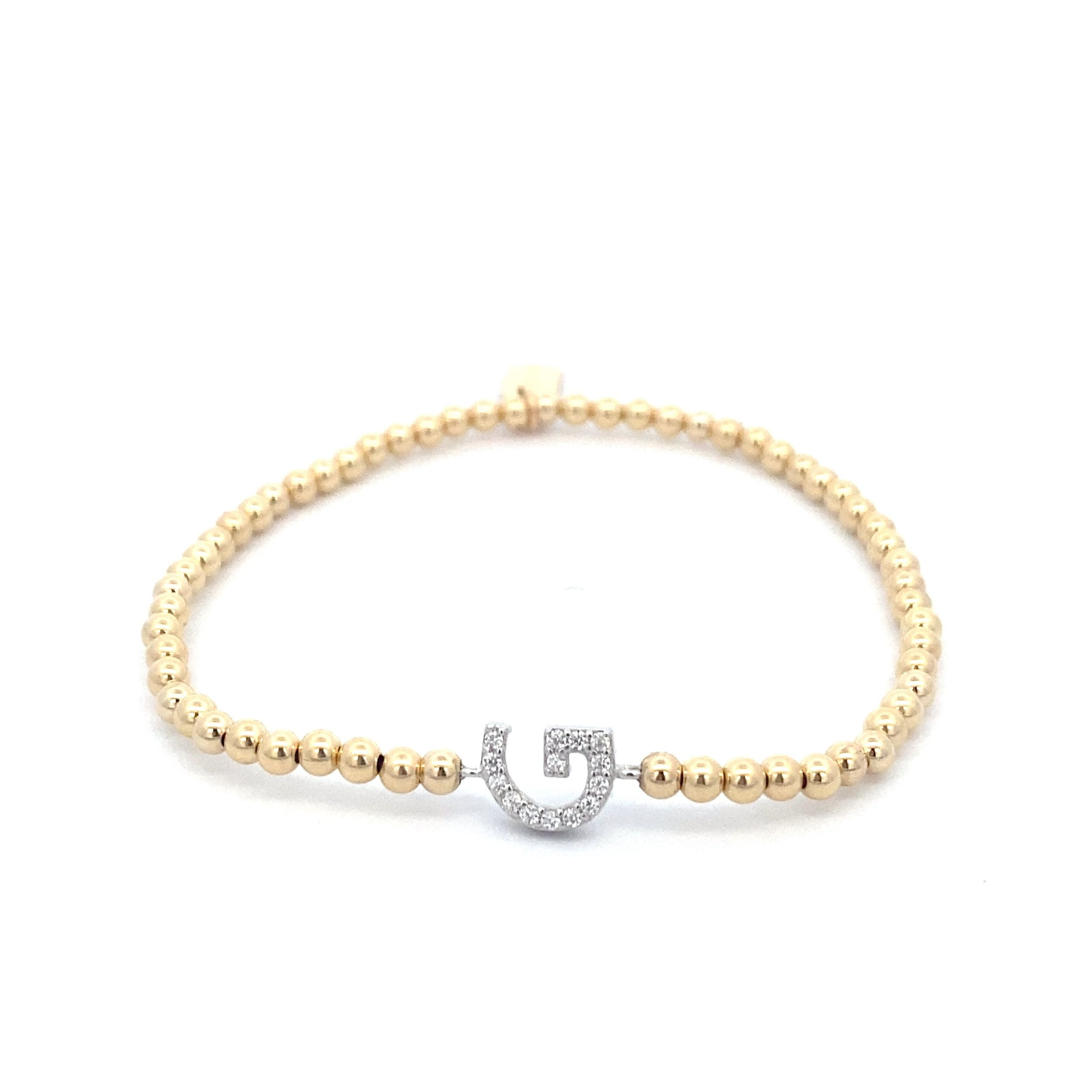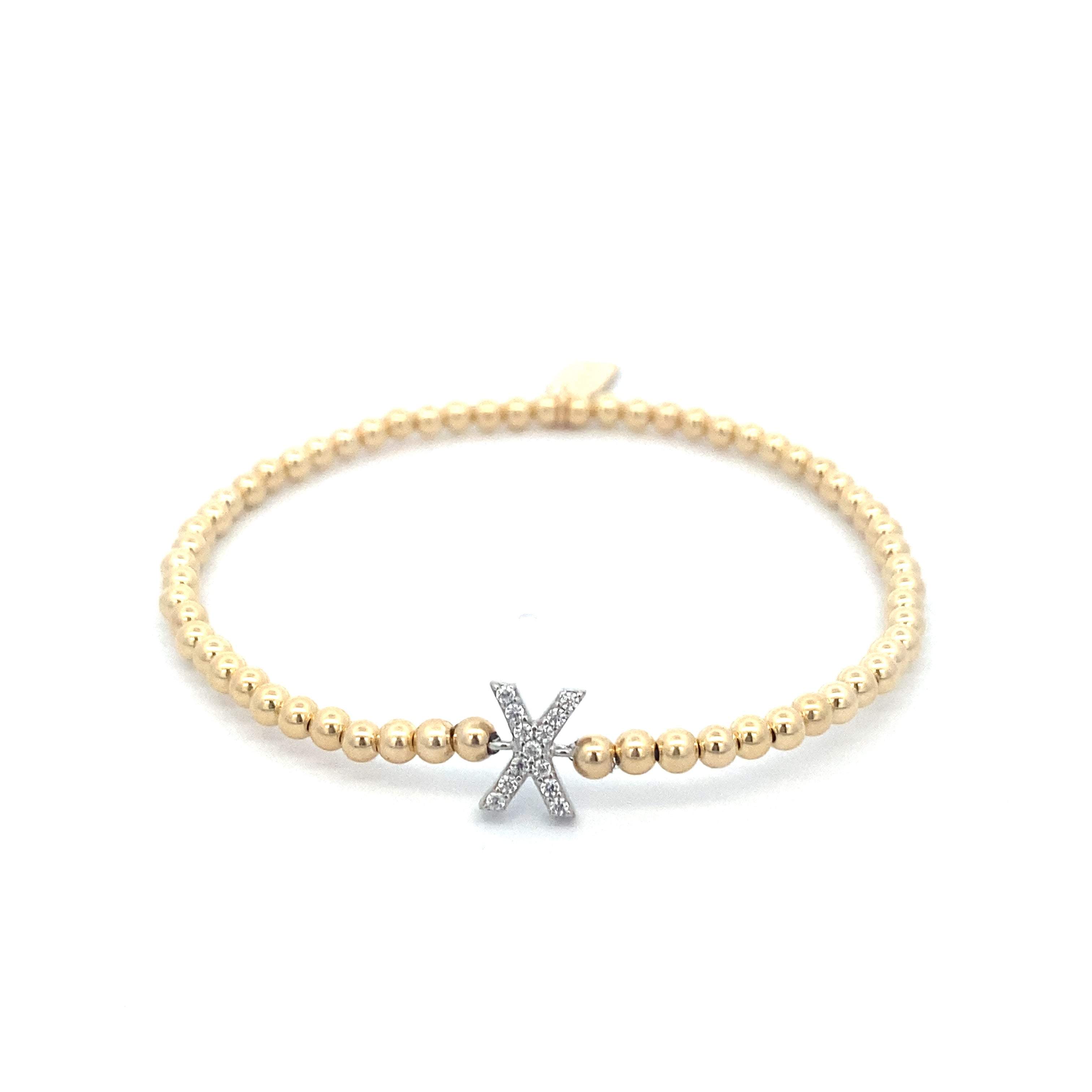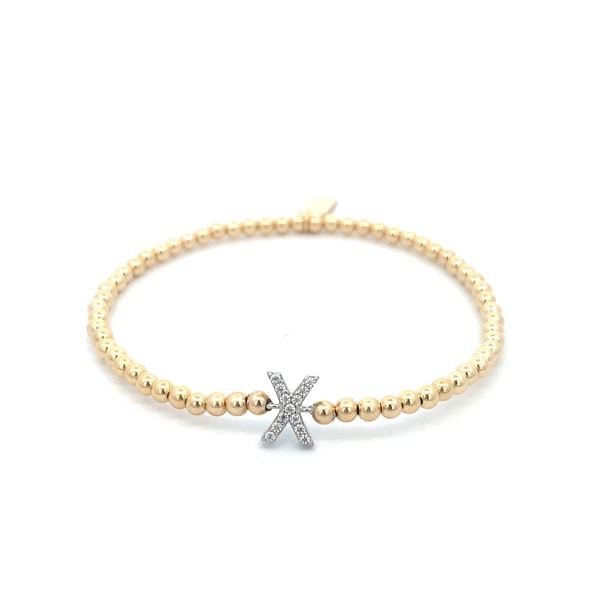 Bracciale elastico con palline color oro e ciondolo in argento con zirconi a forma di iniziale.