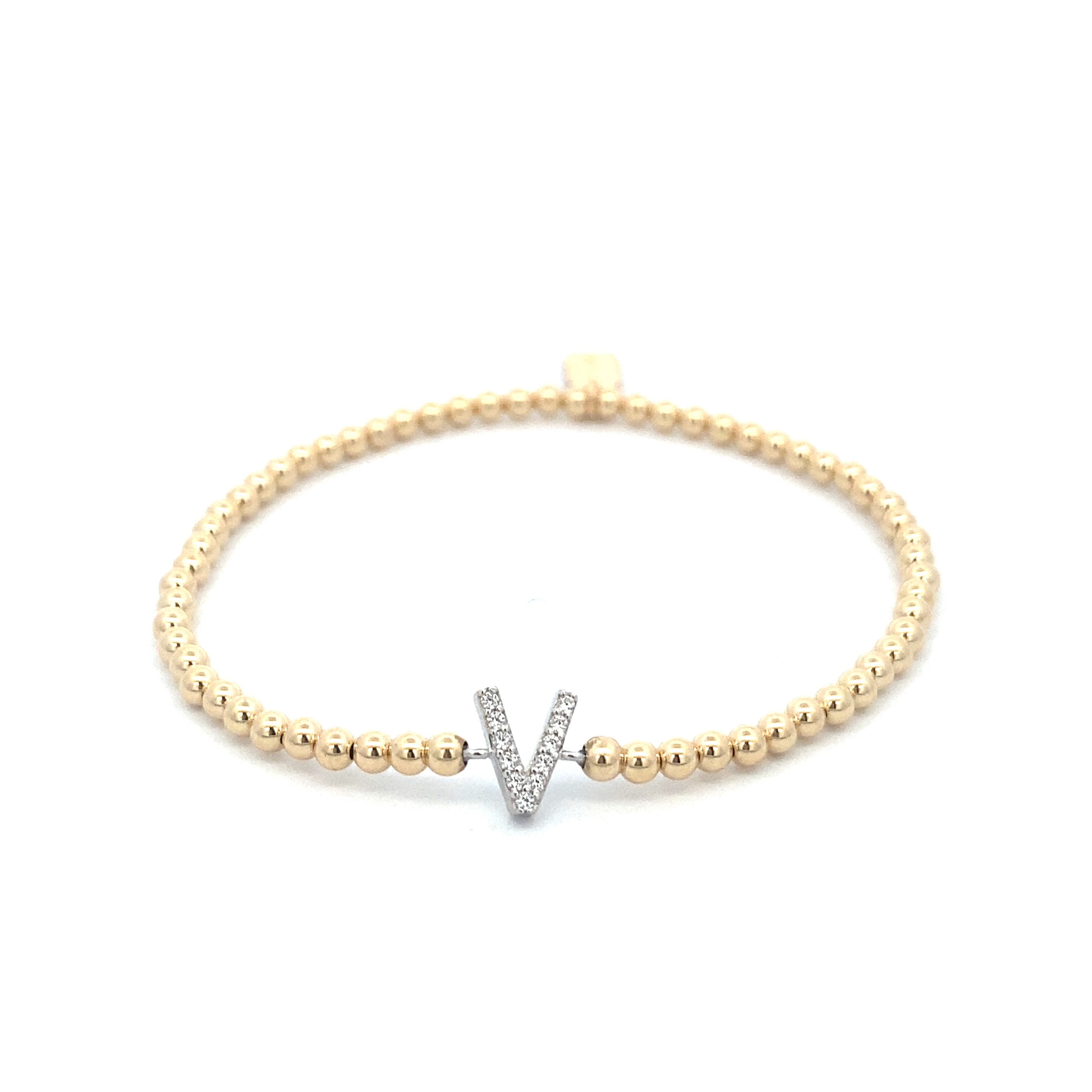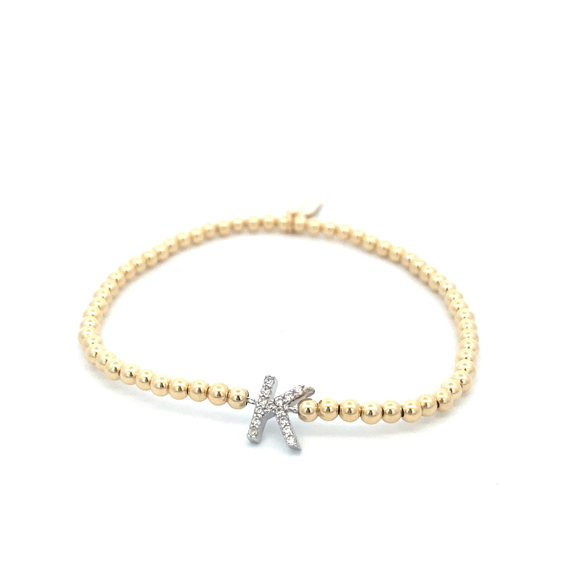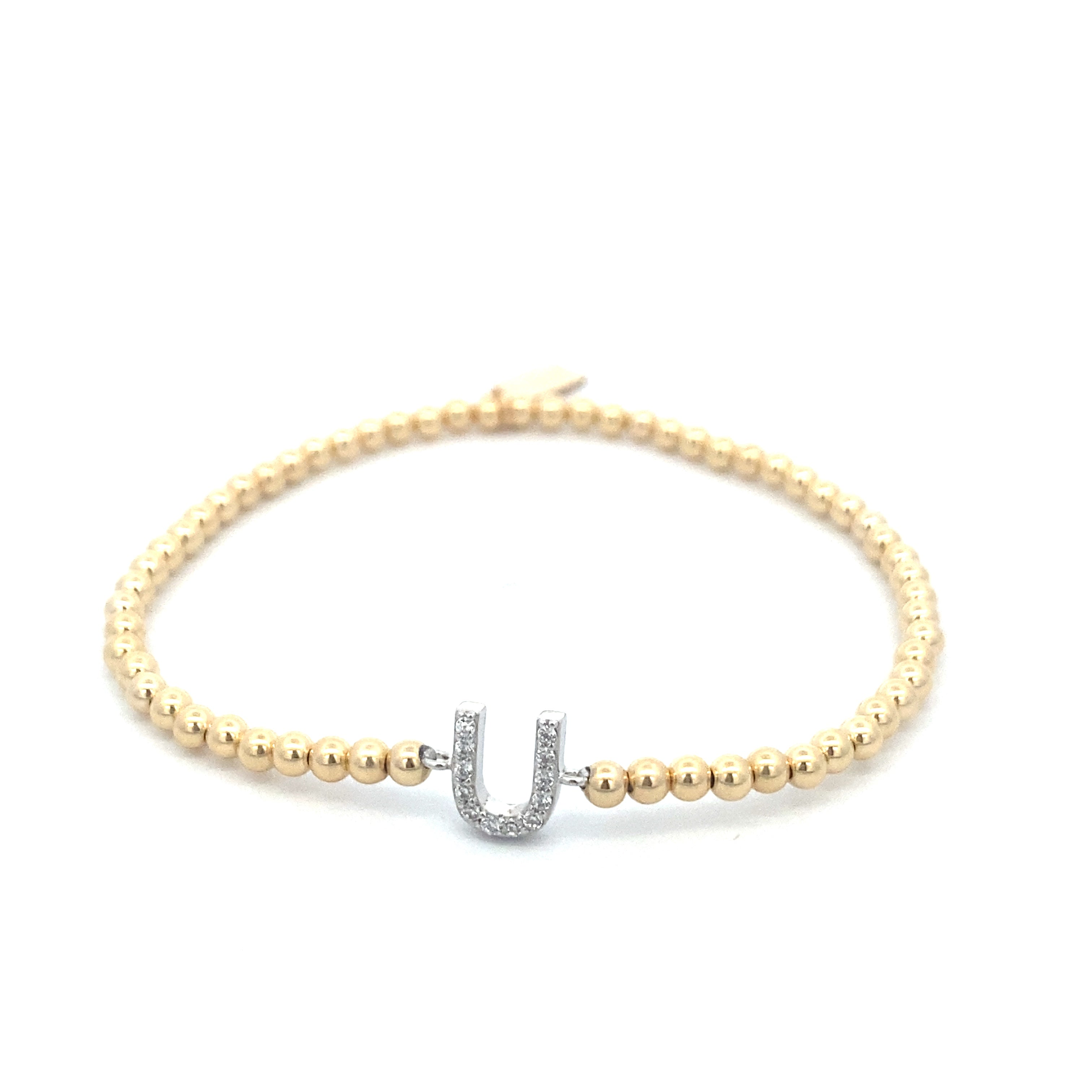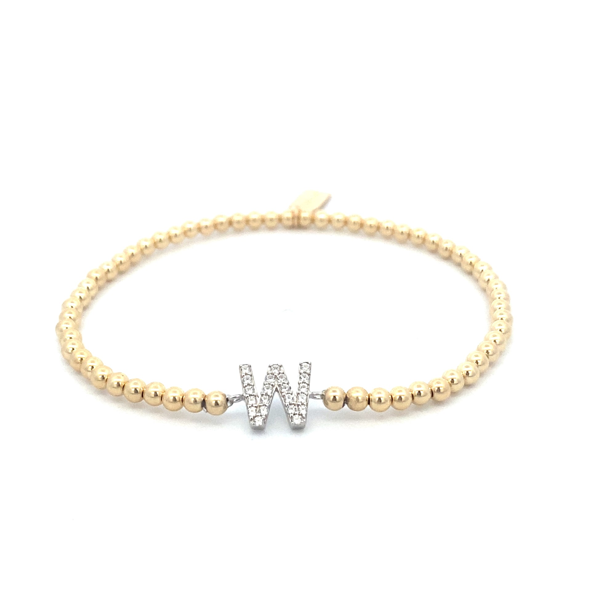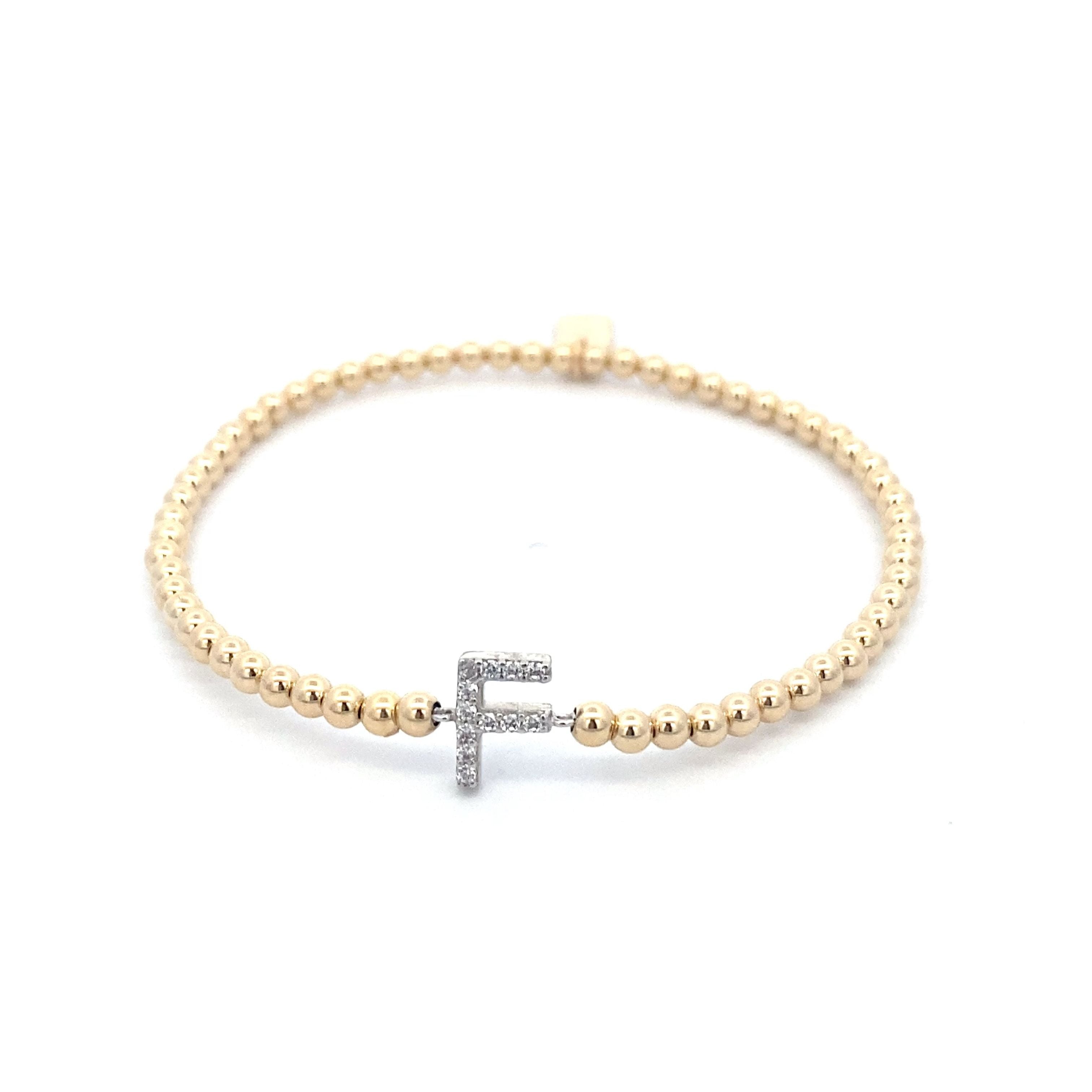 Bracciale elastico con palline color oro e ciondolo in argento con zirconi a forma di iniziale.