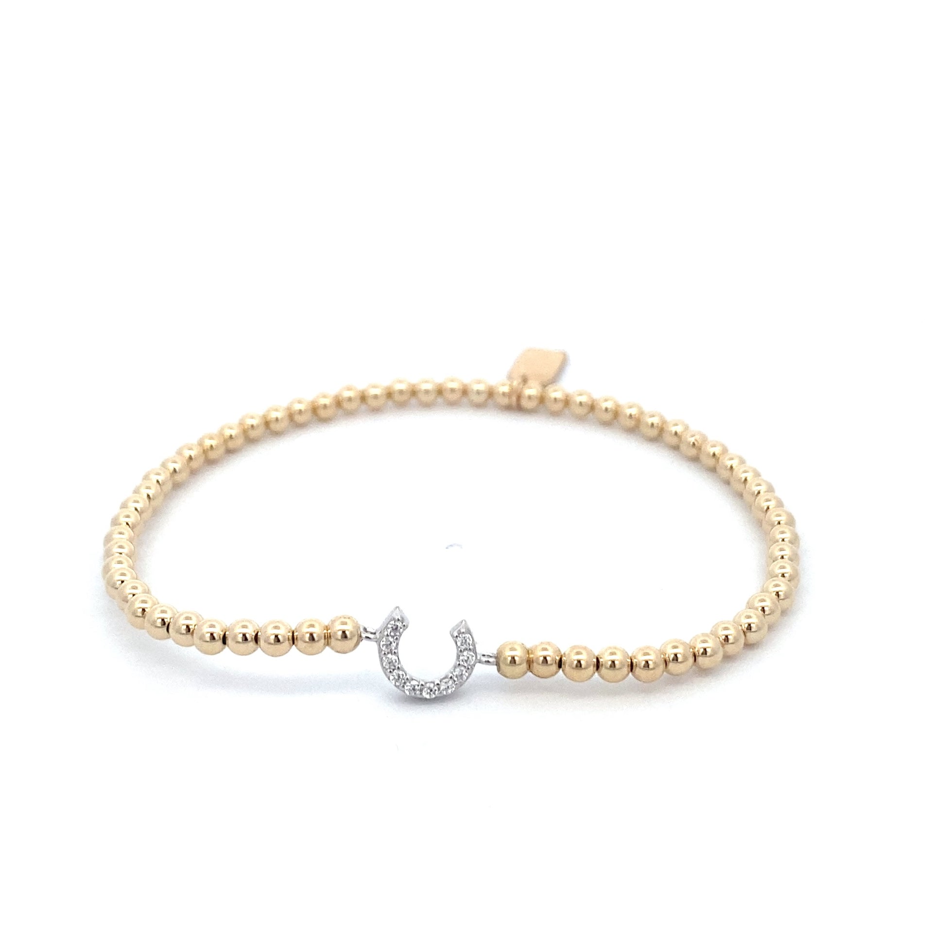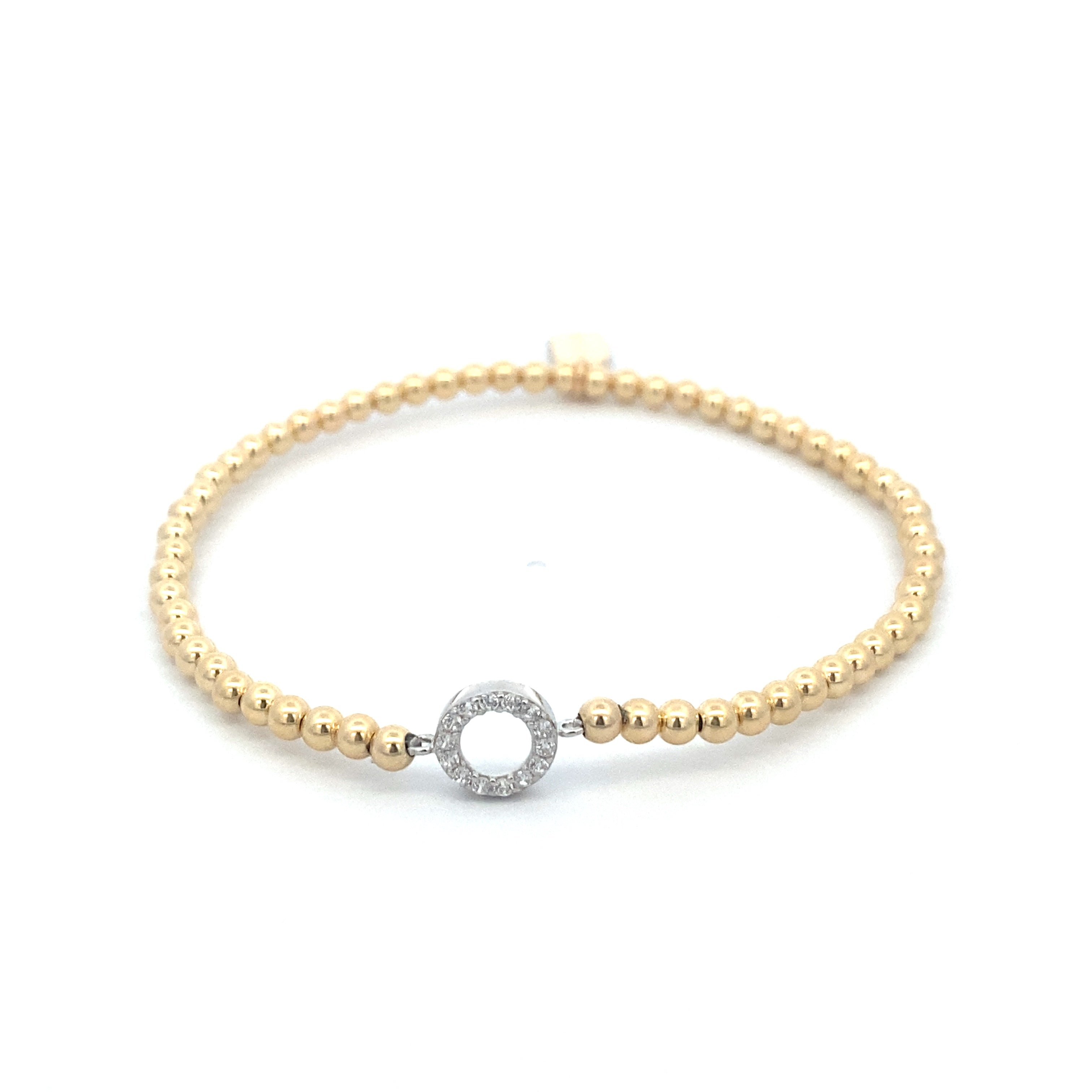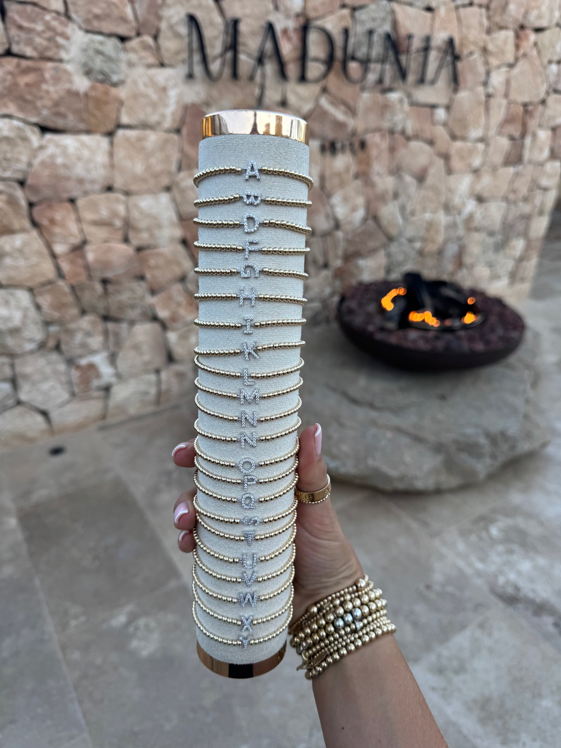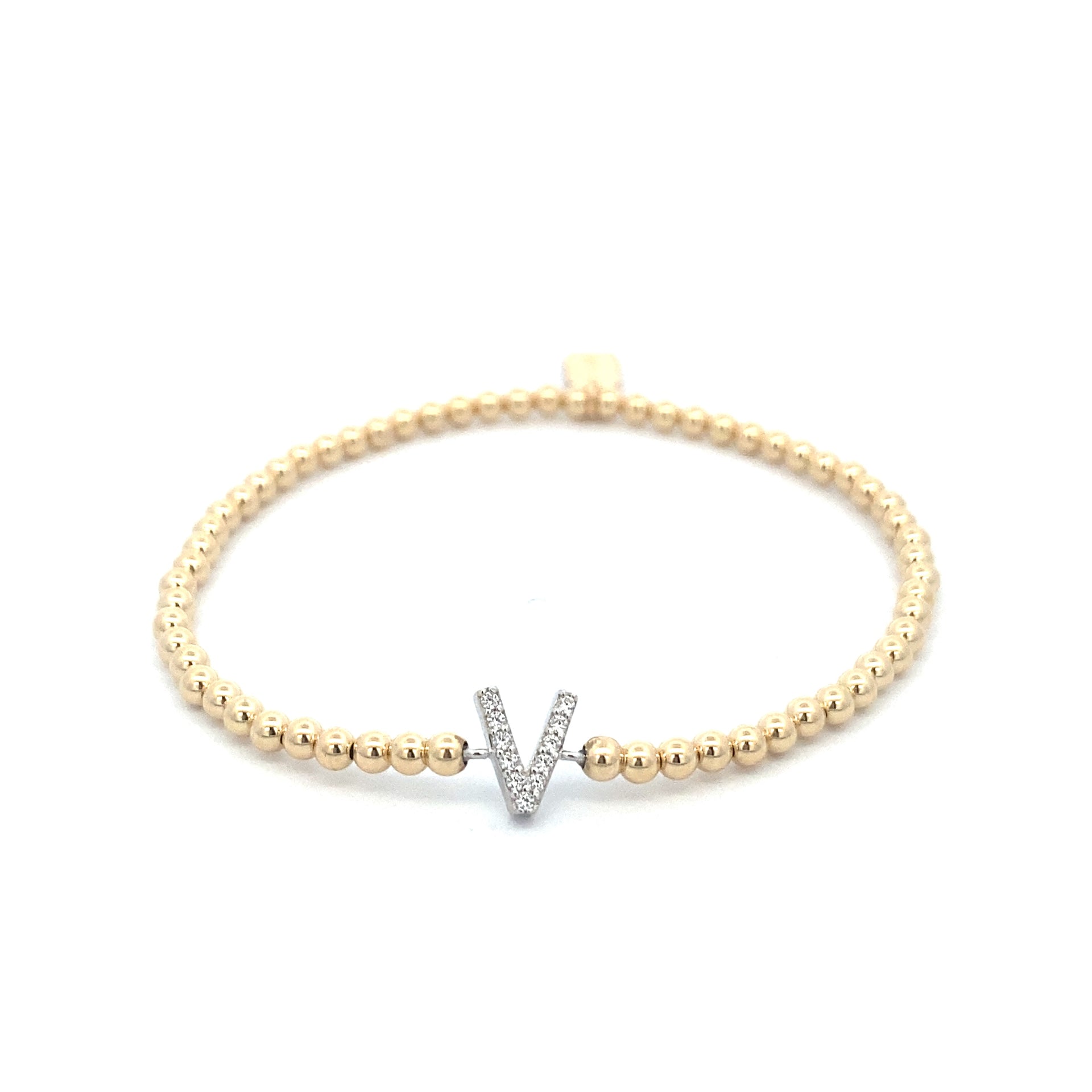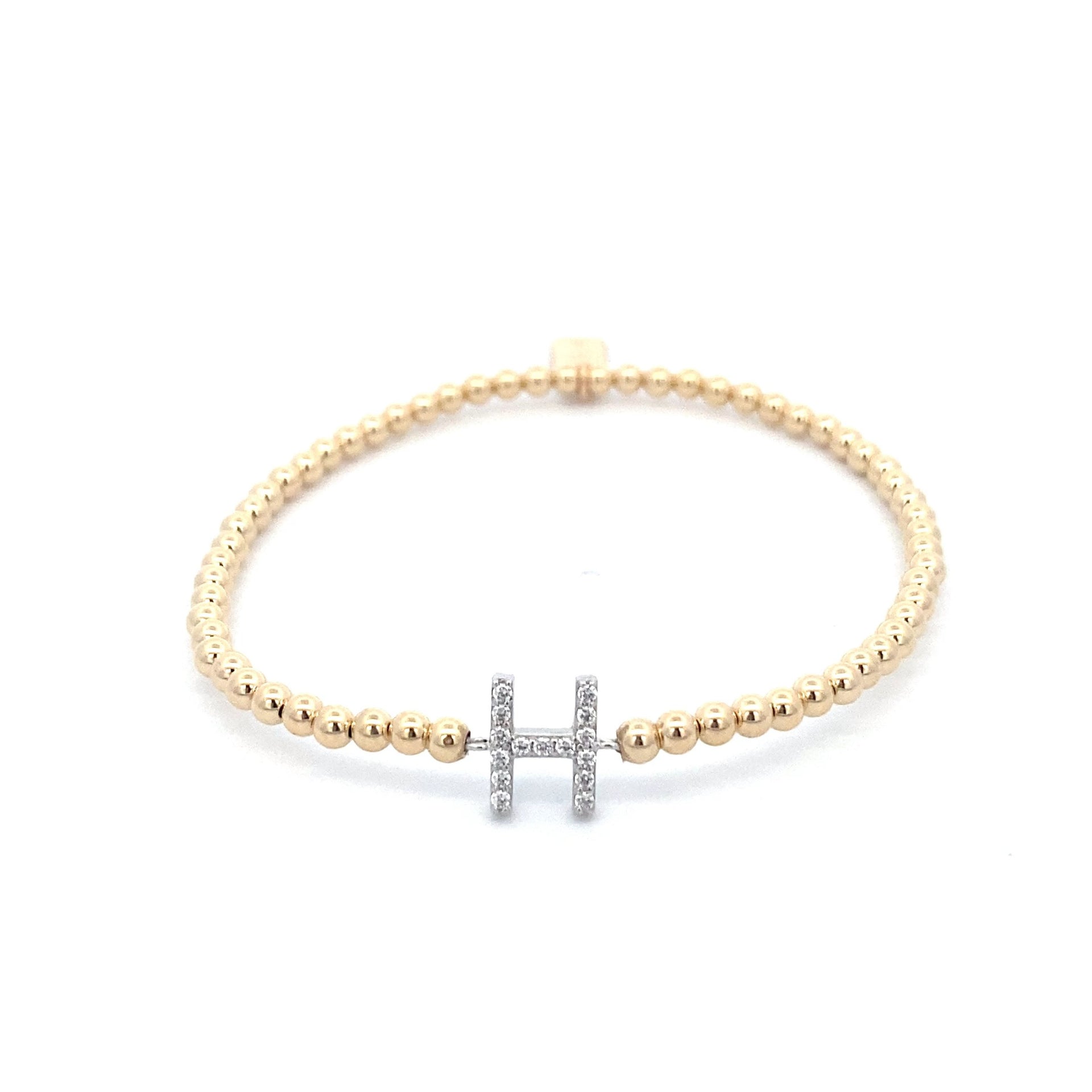 Bracciale elastico con palline color oro e ciondolo in argento con zirconi a forma di iniziale.