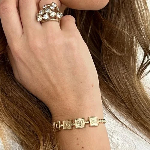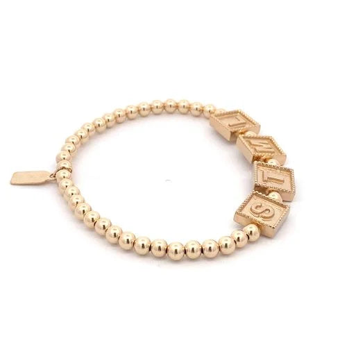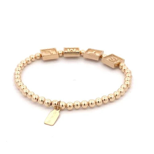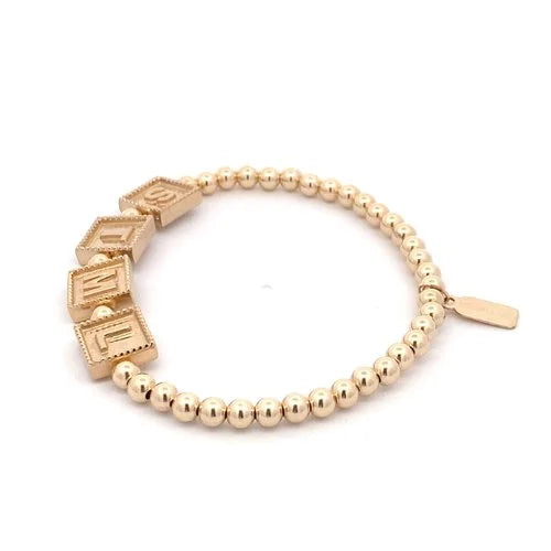 Bracciale elastico con palline color oro e ciondoli quadrati a forma di lettera.