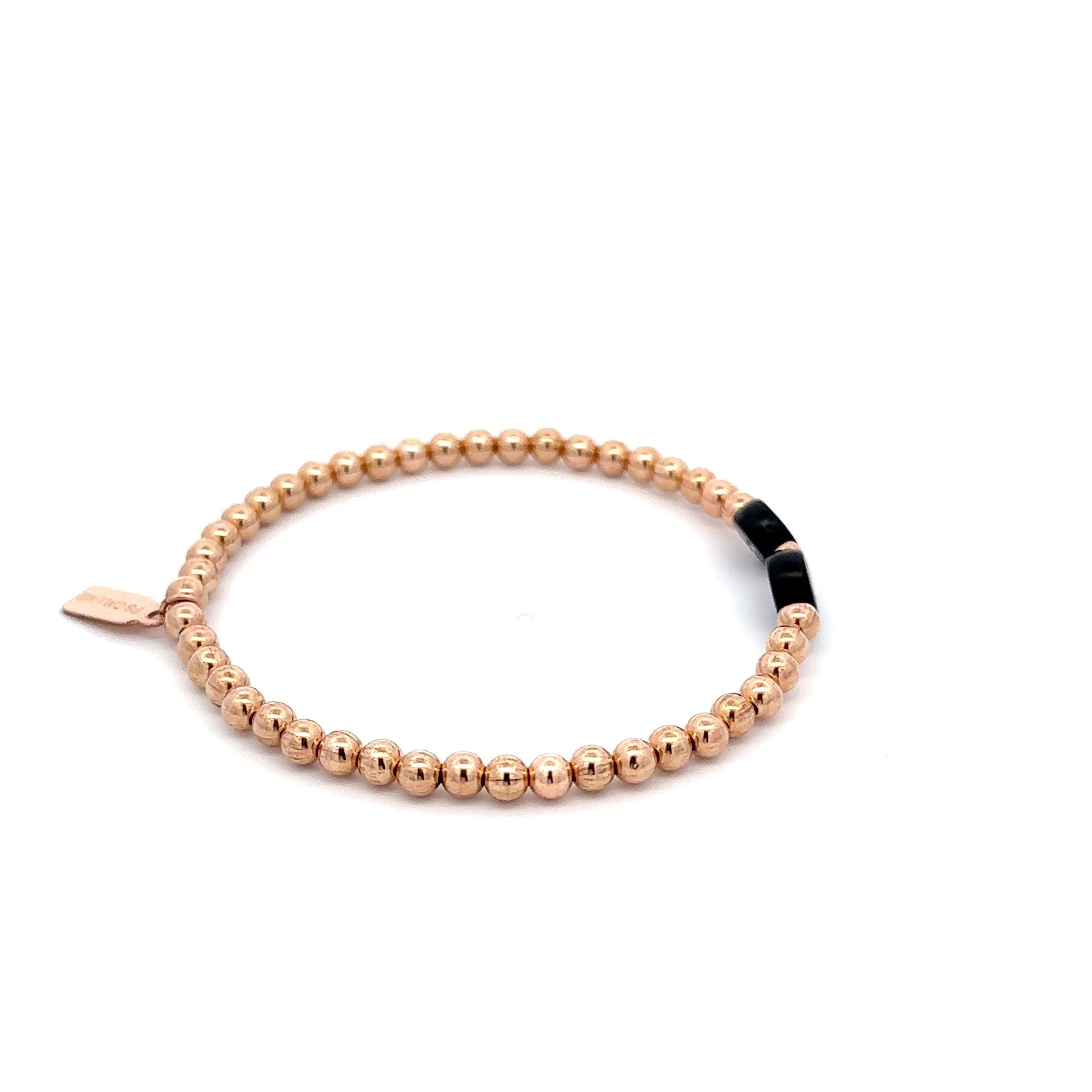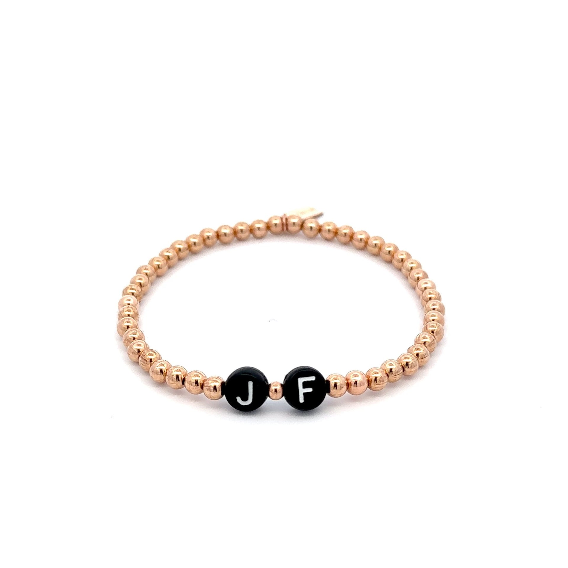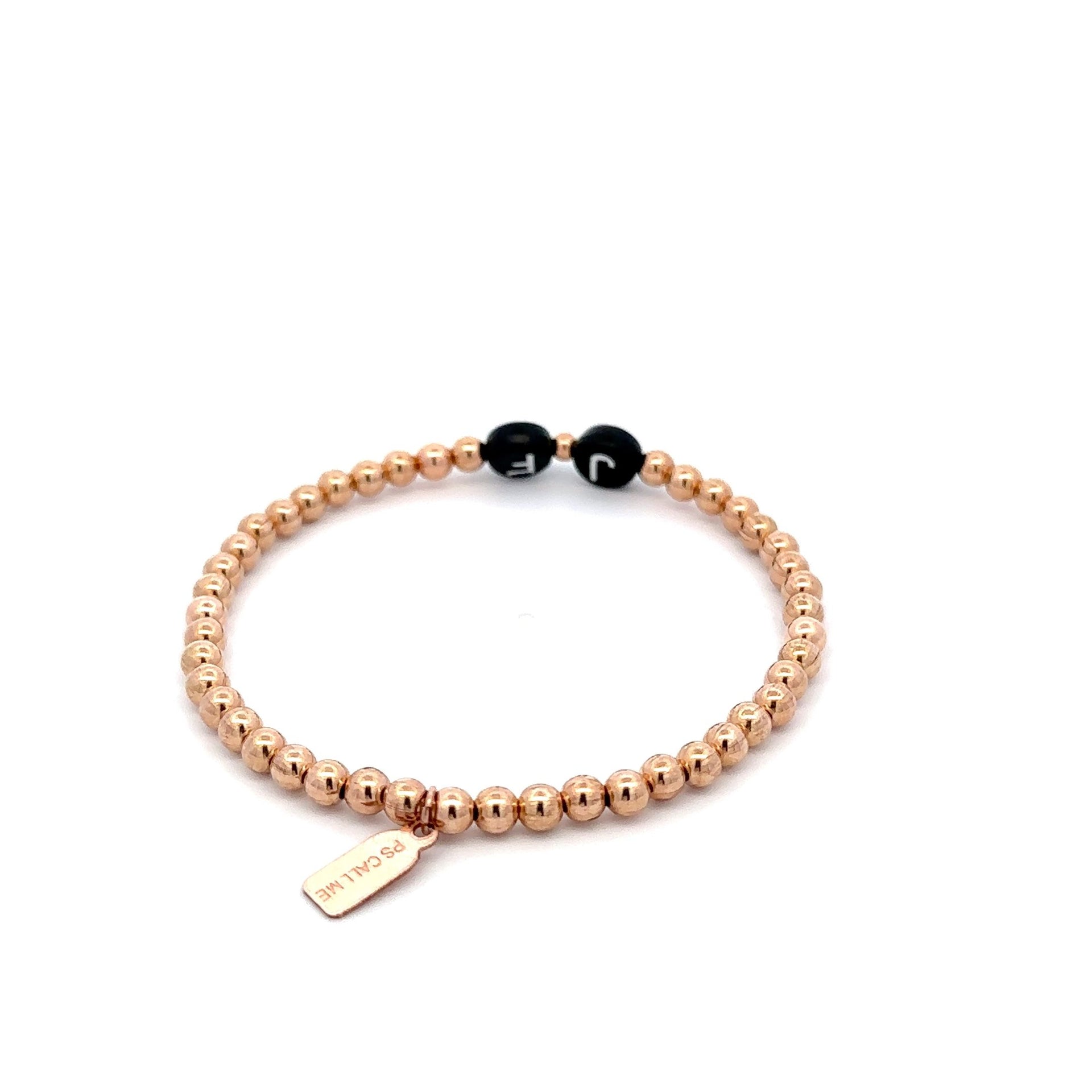 Bracciale elastico con perline color oro rosa e iniziali nere.