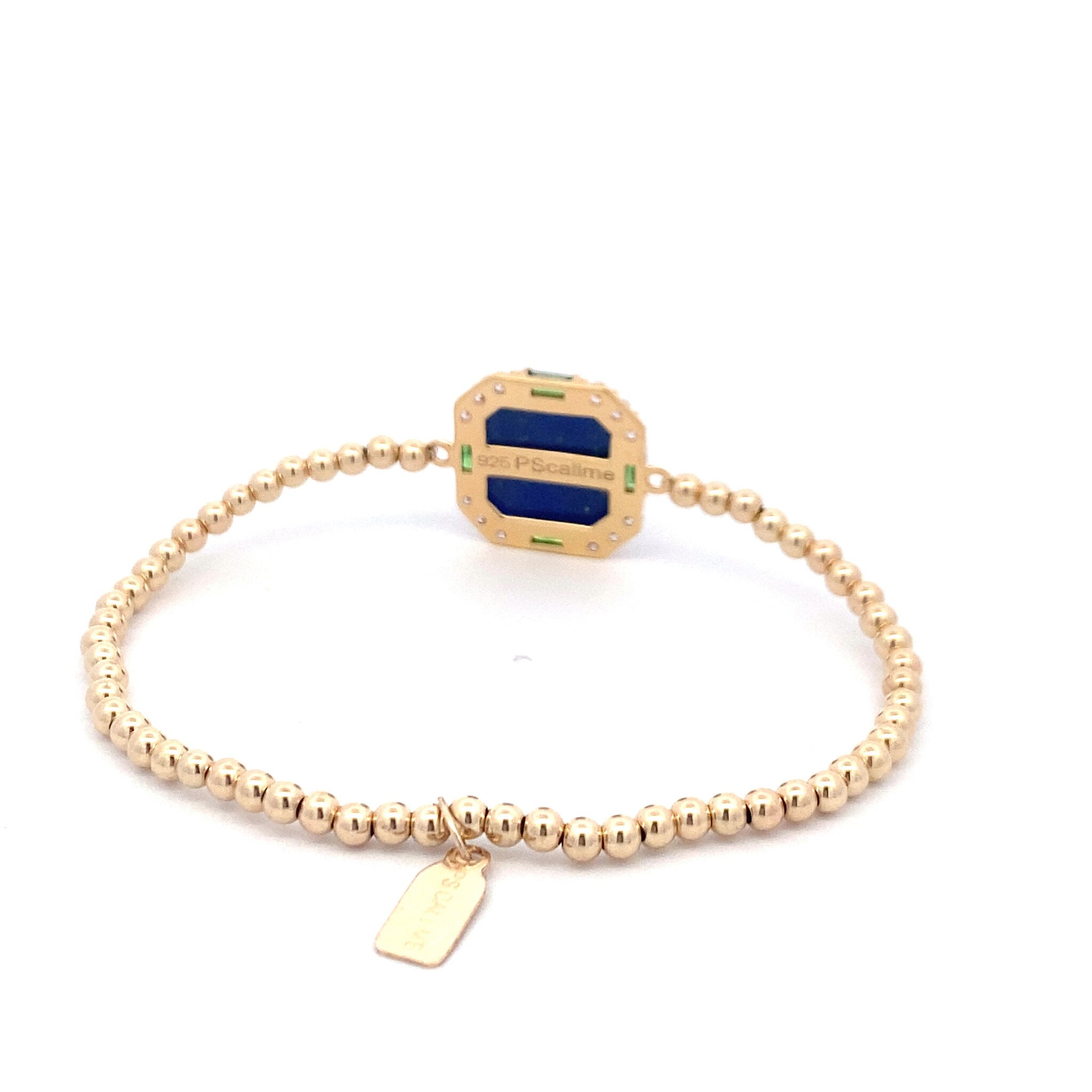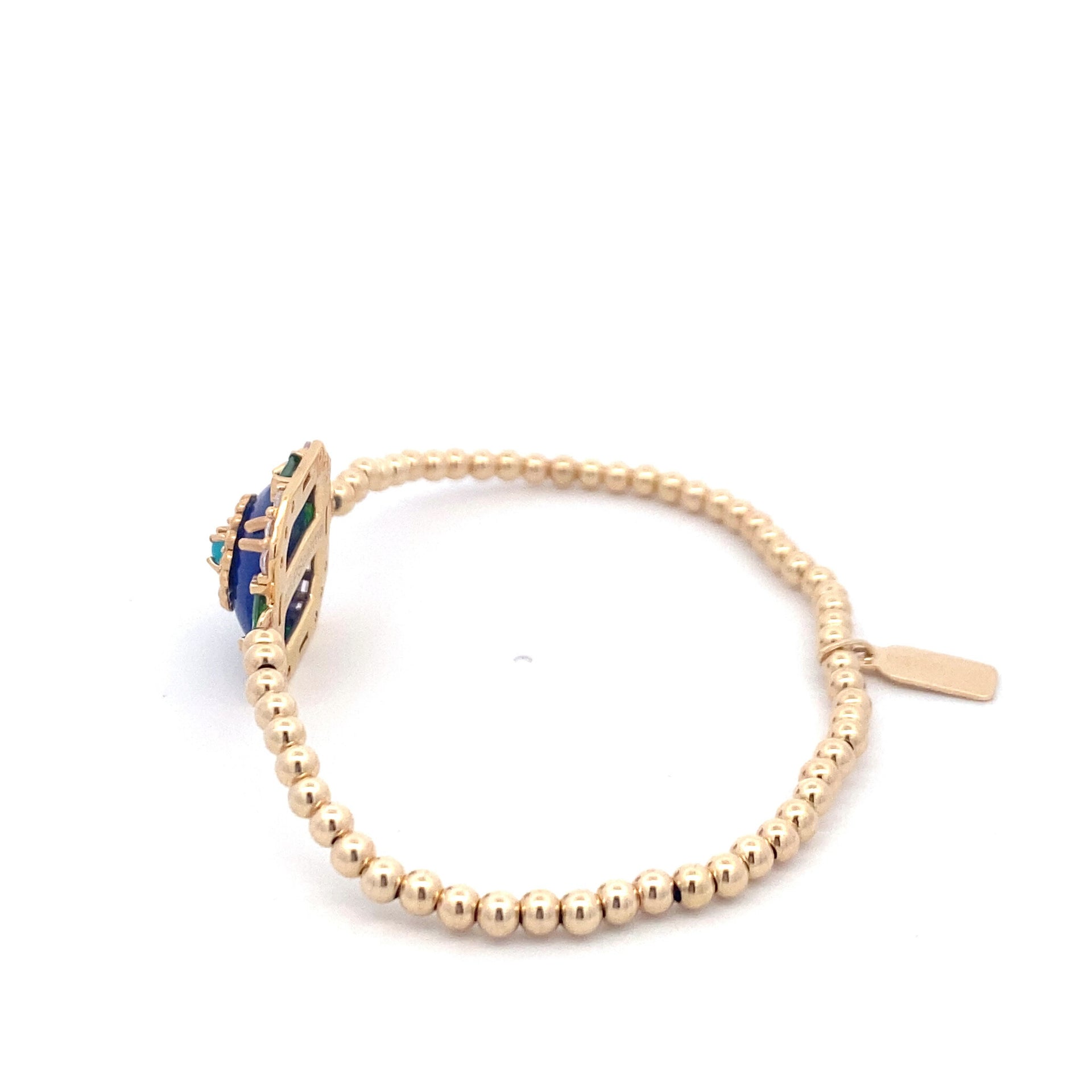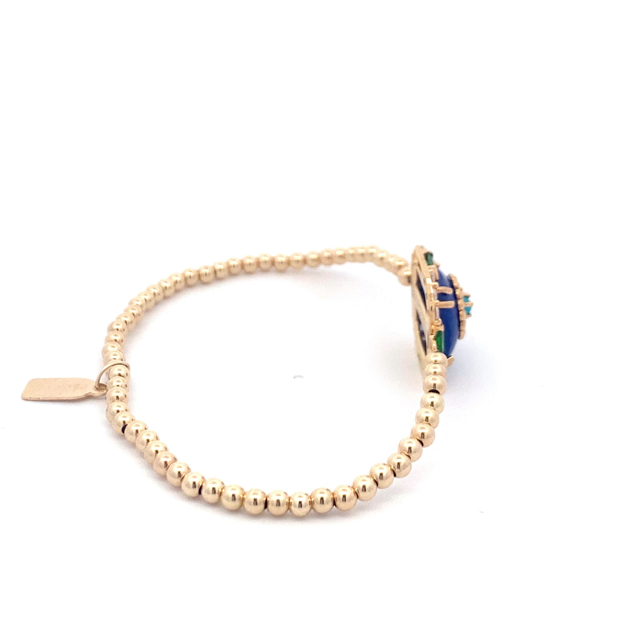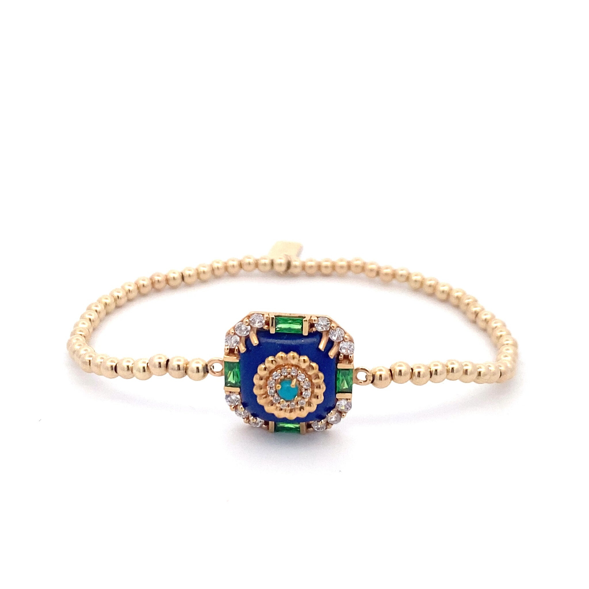 Bracciale elastico con palline color oro e una pietra quadrata di zirconia blu.