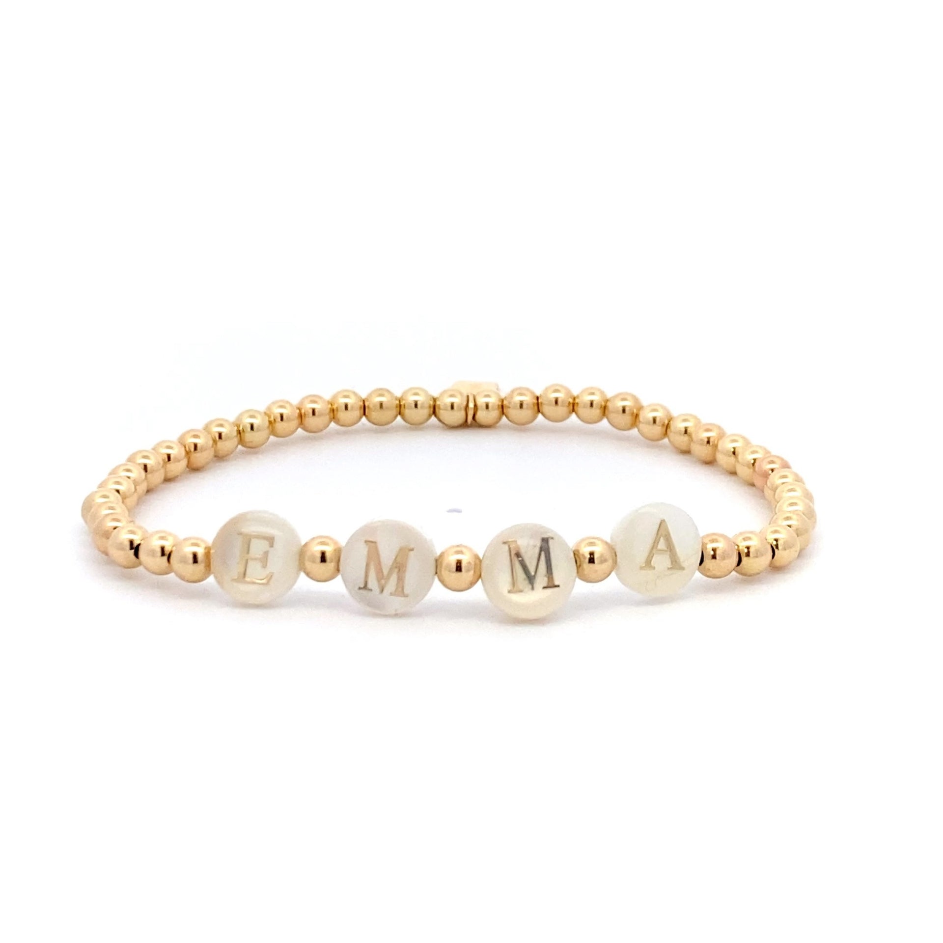 Bracciale elastico con palline color oro e iniziali in madreperla bianca.