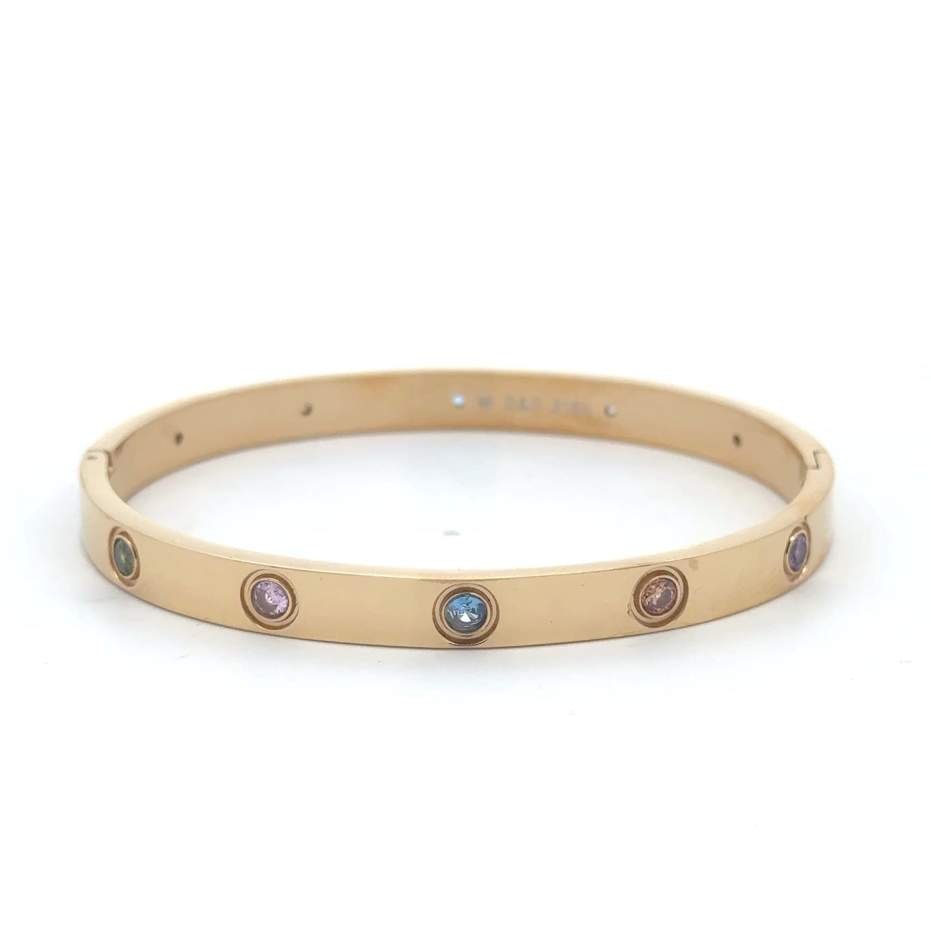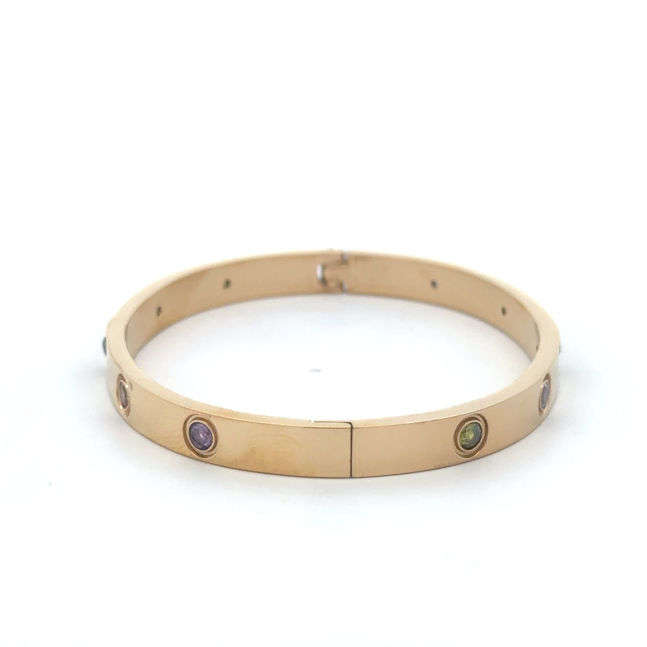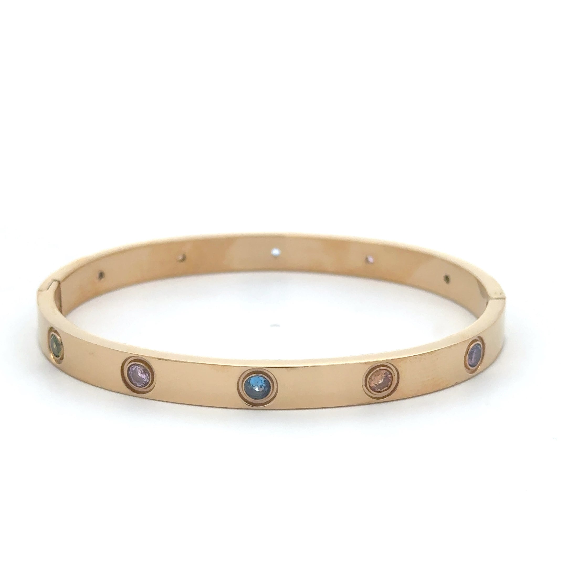 Goudkleurige bangle met gekleurde steentjes in de kleur roze. De bangle is te openen met een kliksysteem aan de zijkant.