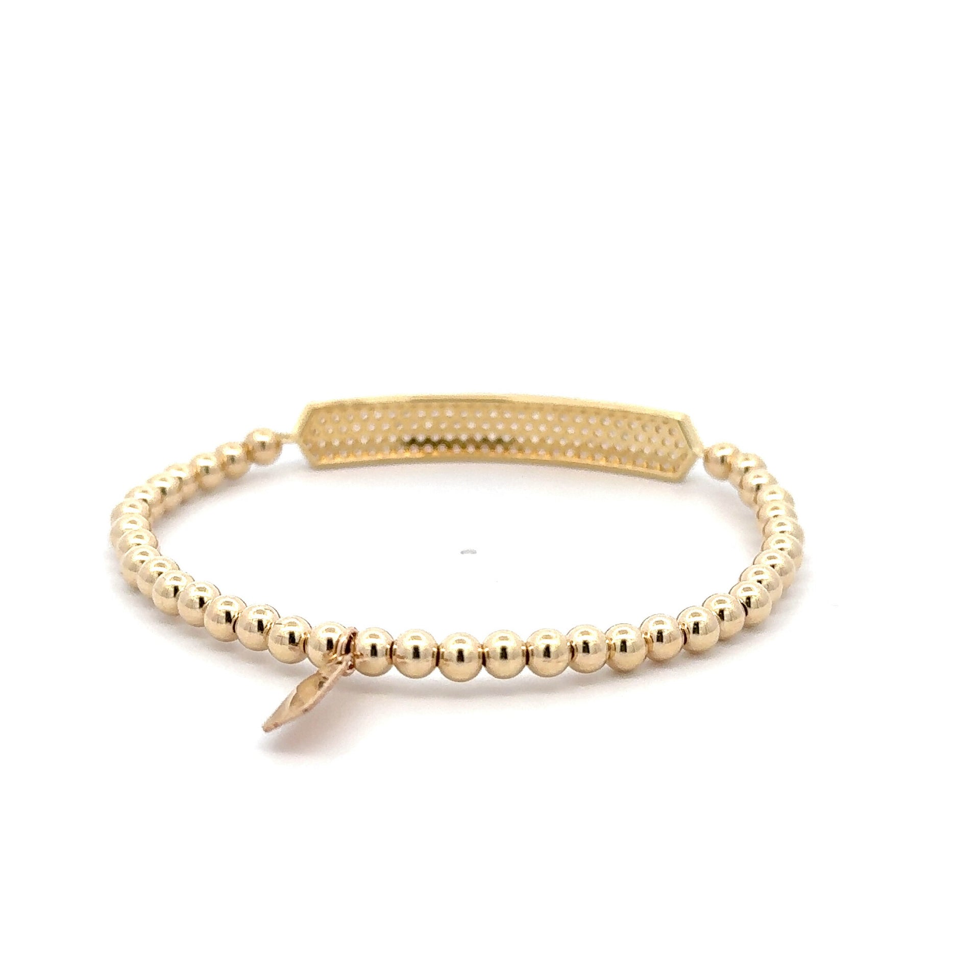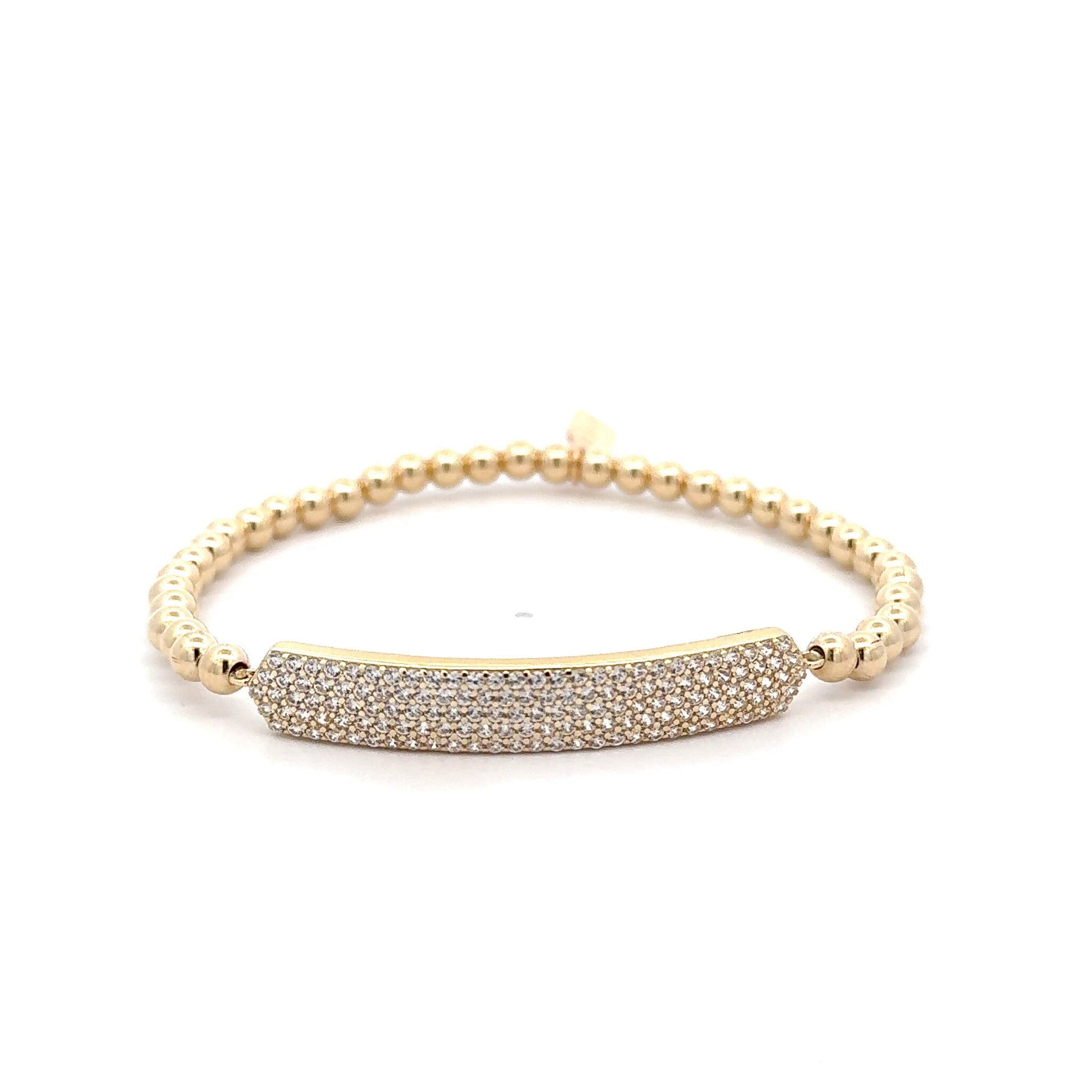 Elastische armband met goudkleurige balletjes en een grote bar bedel met zirkonia stenen