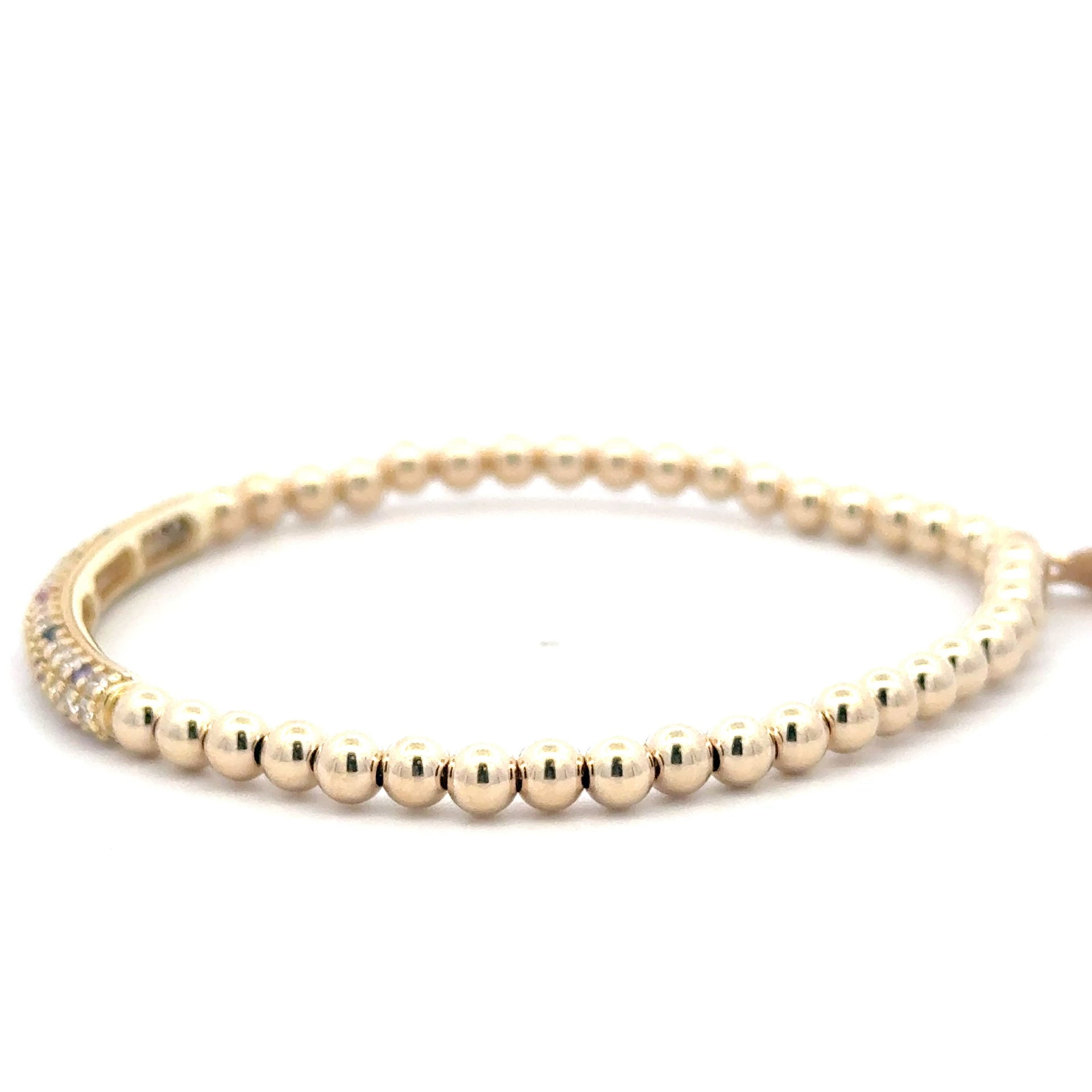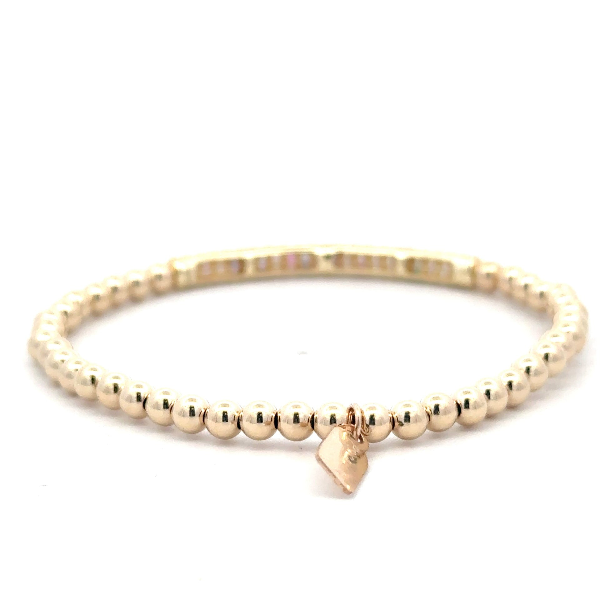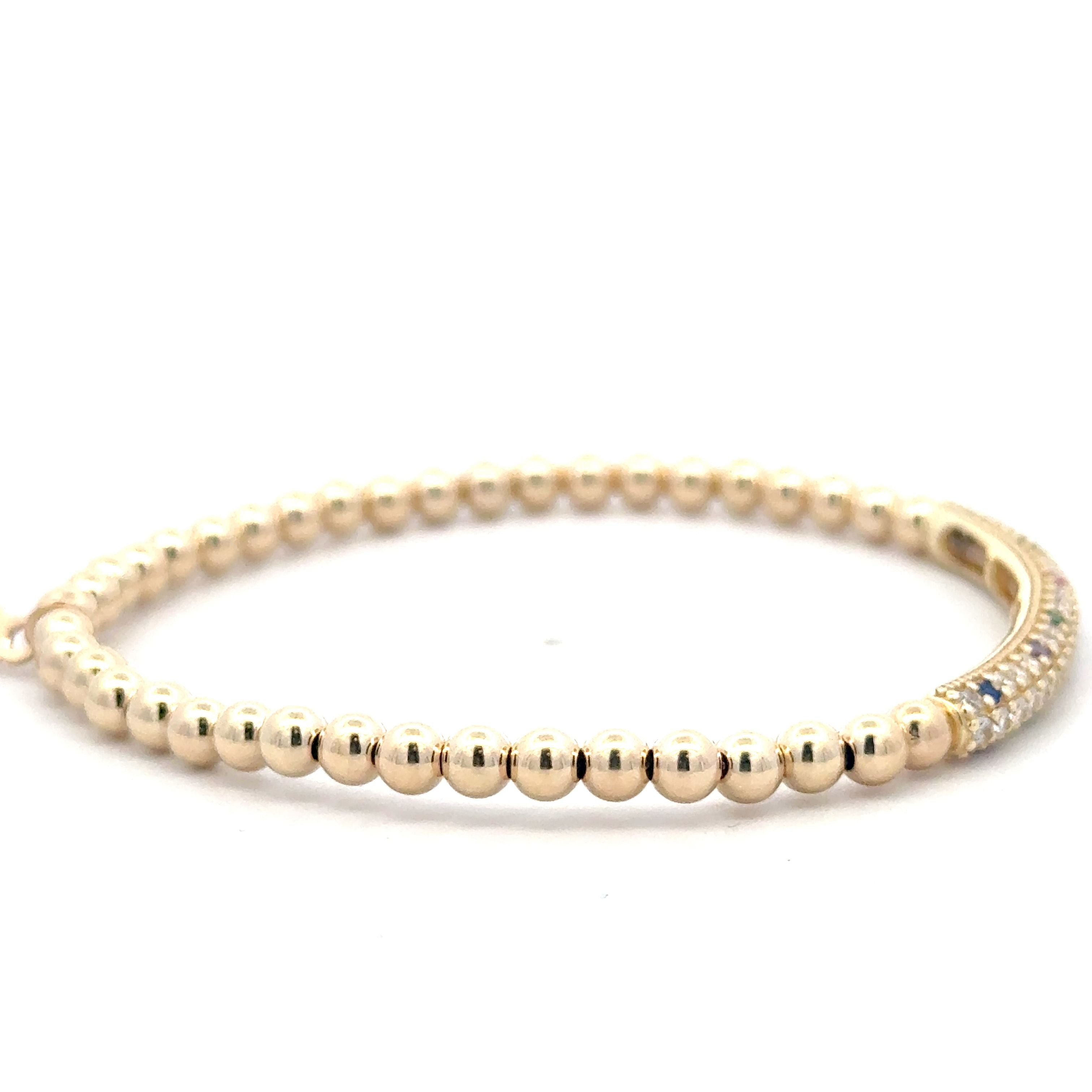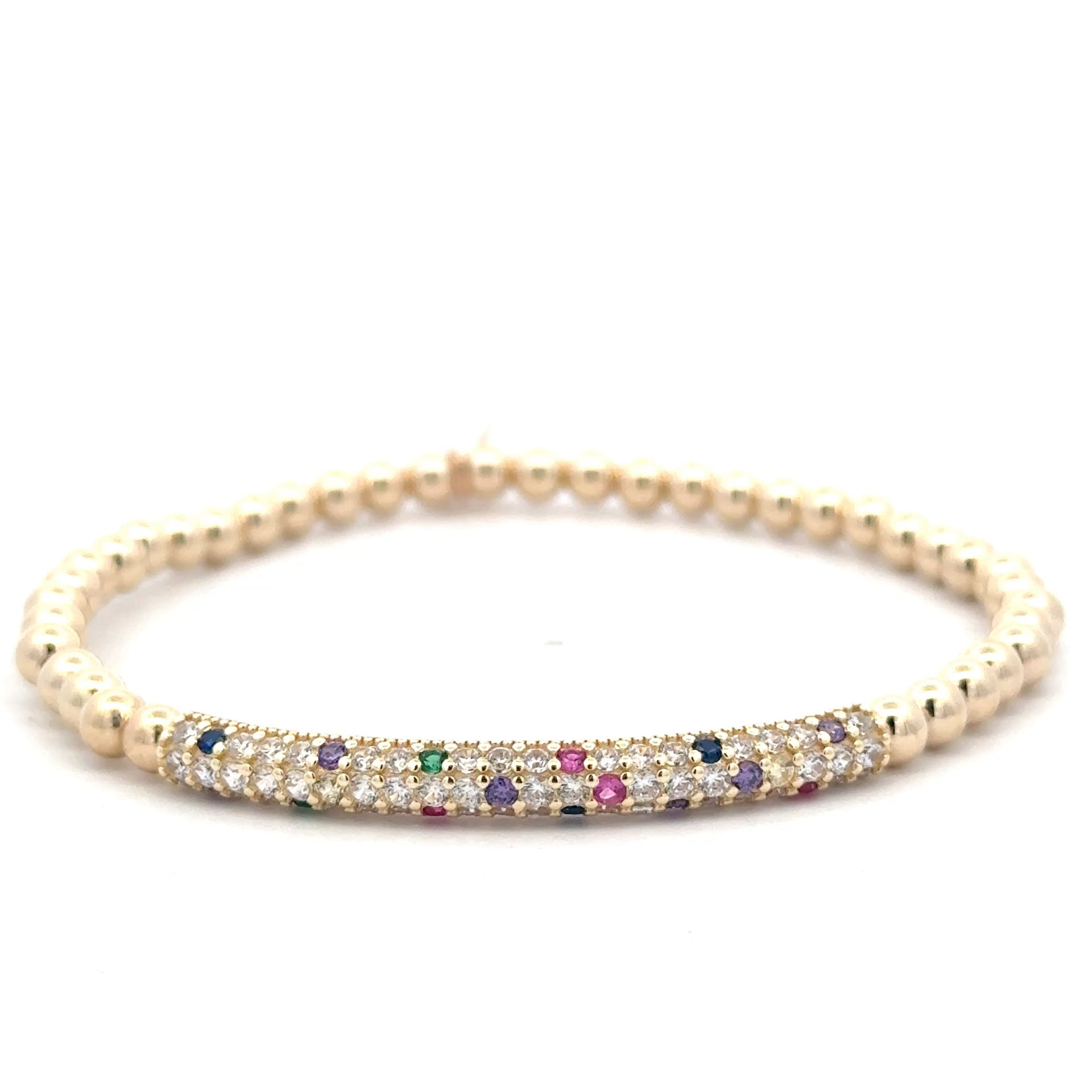 Elastische armband met goudkleurige balletjes en een bar met gekleurde zirkonia