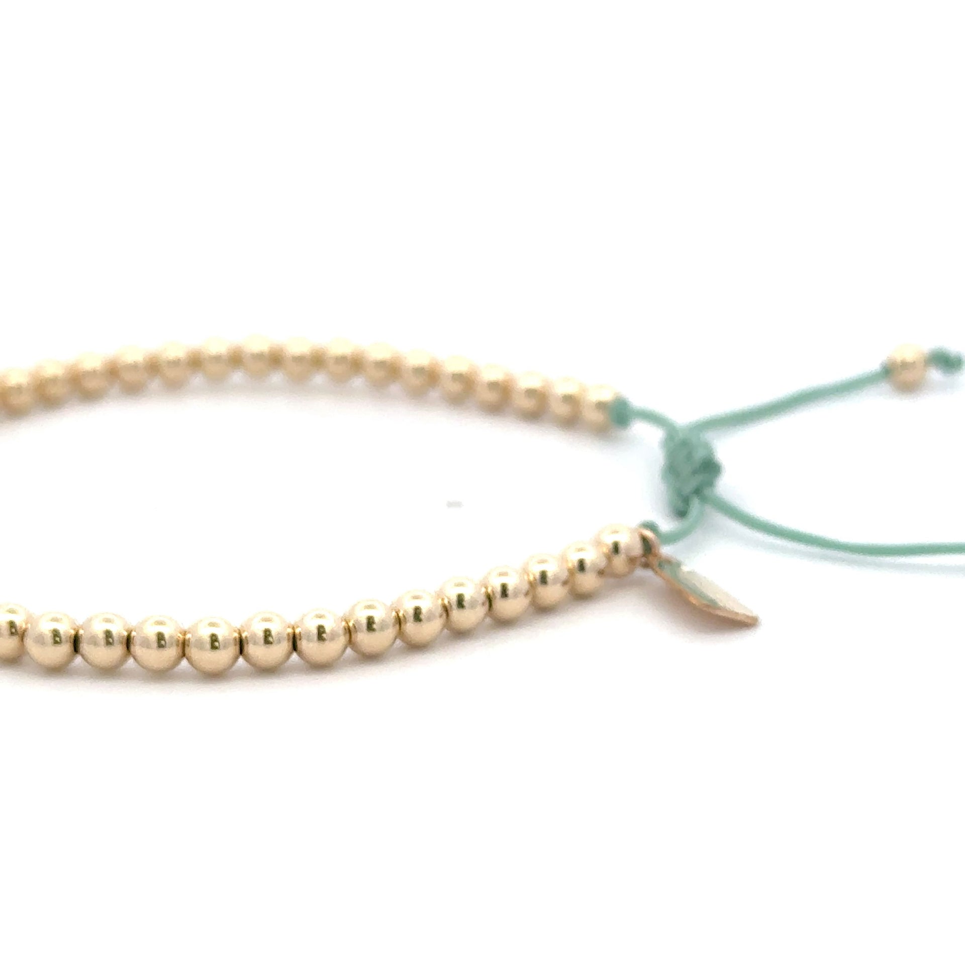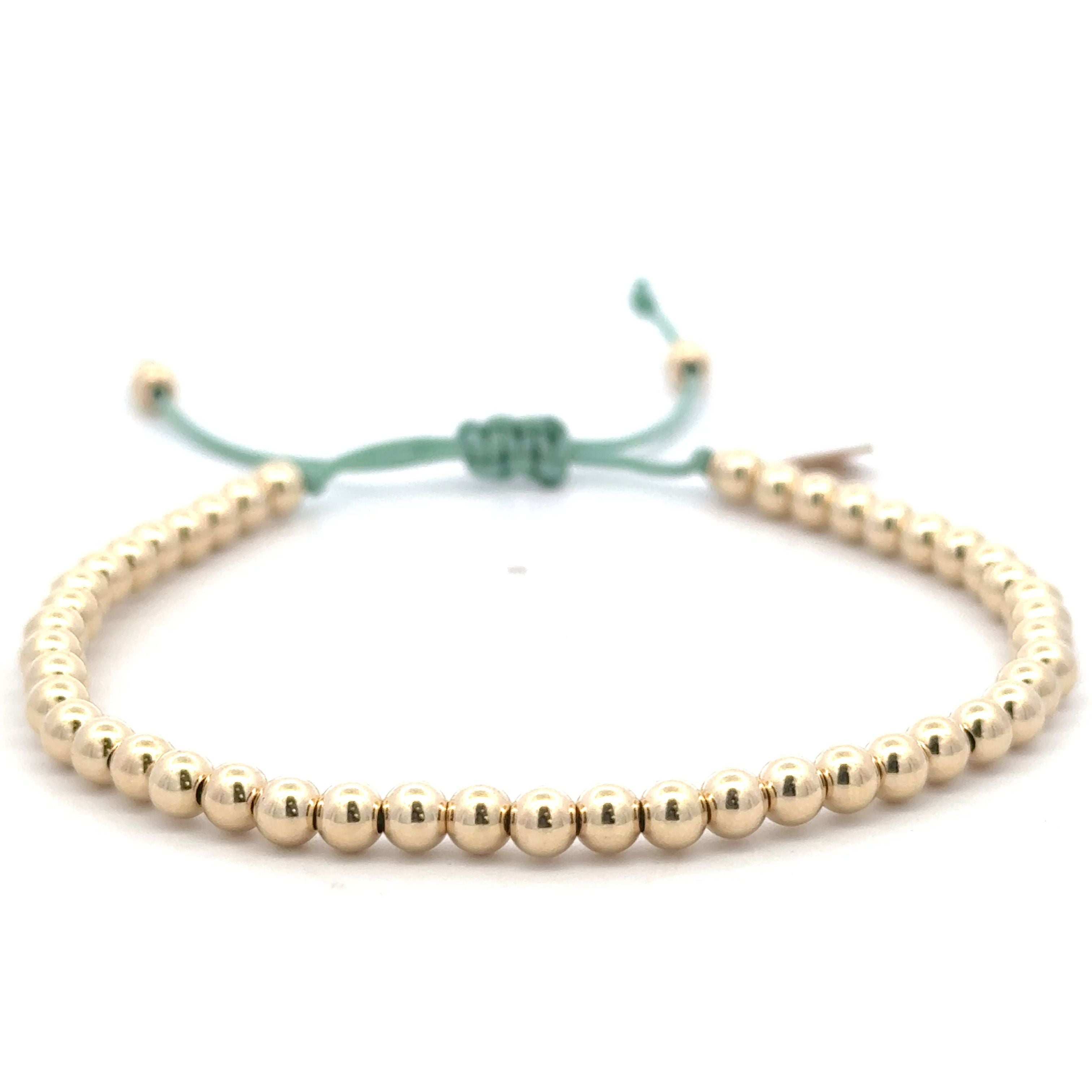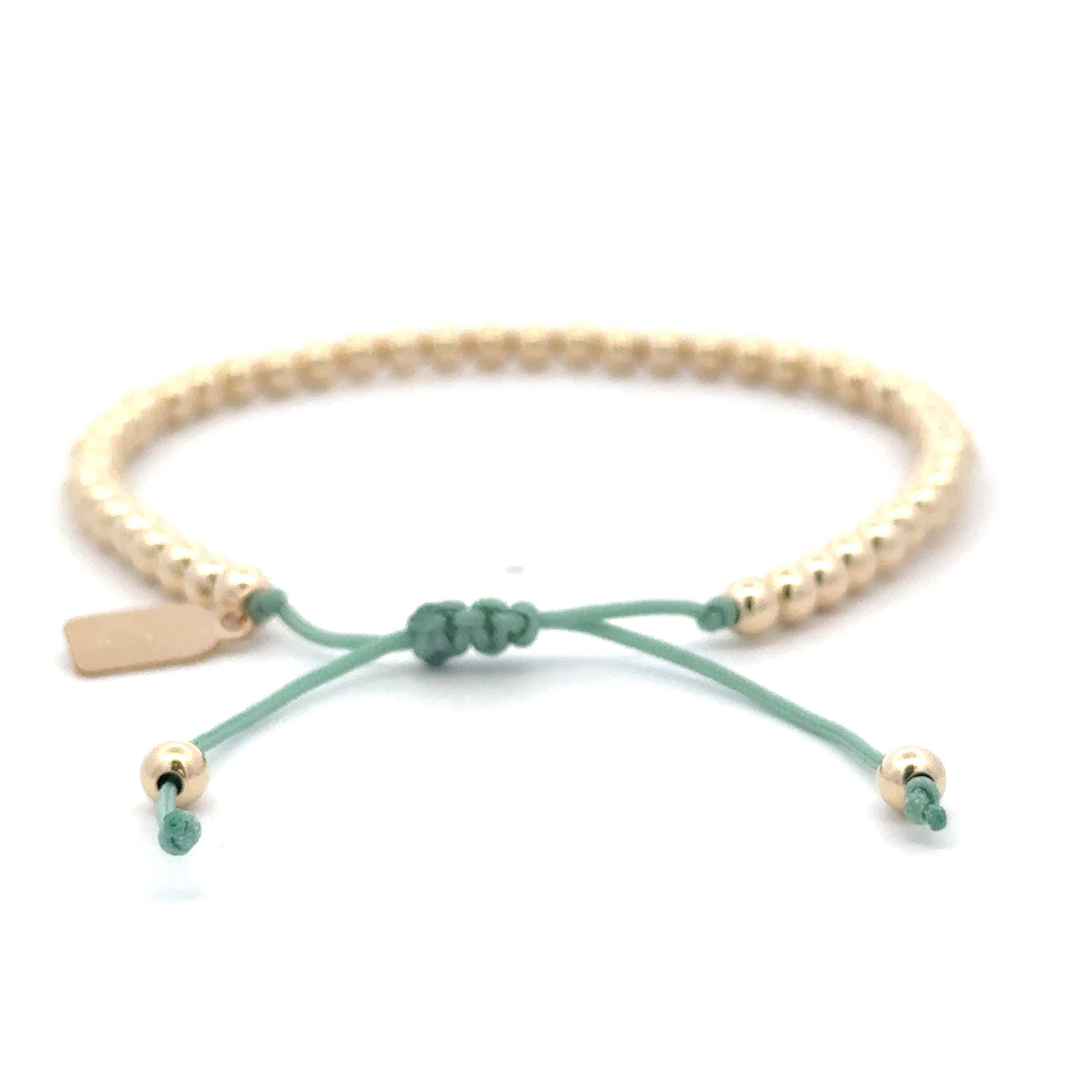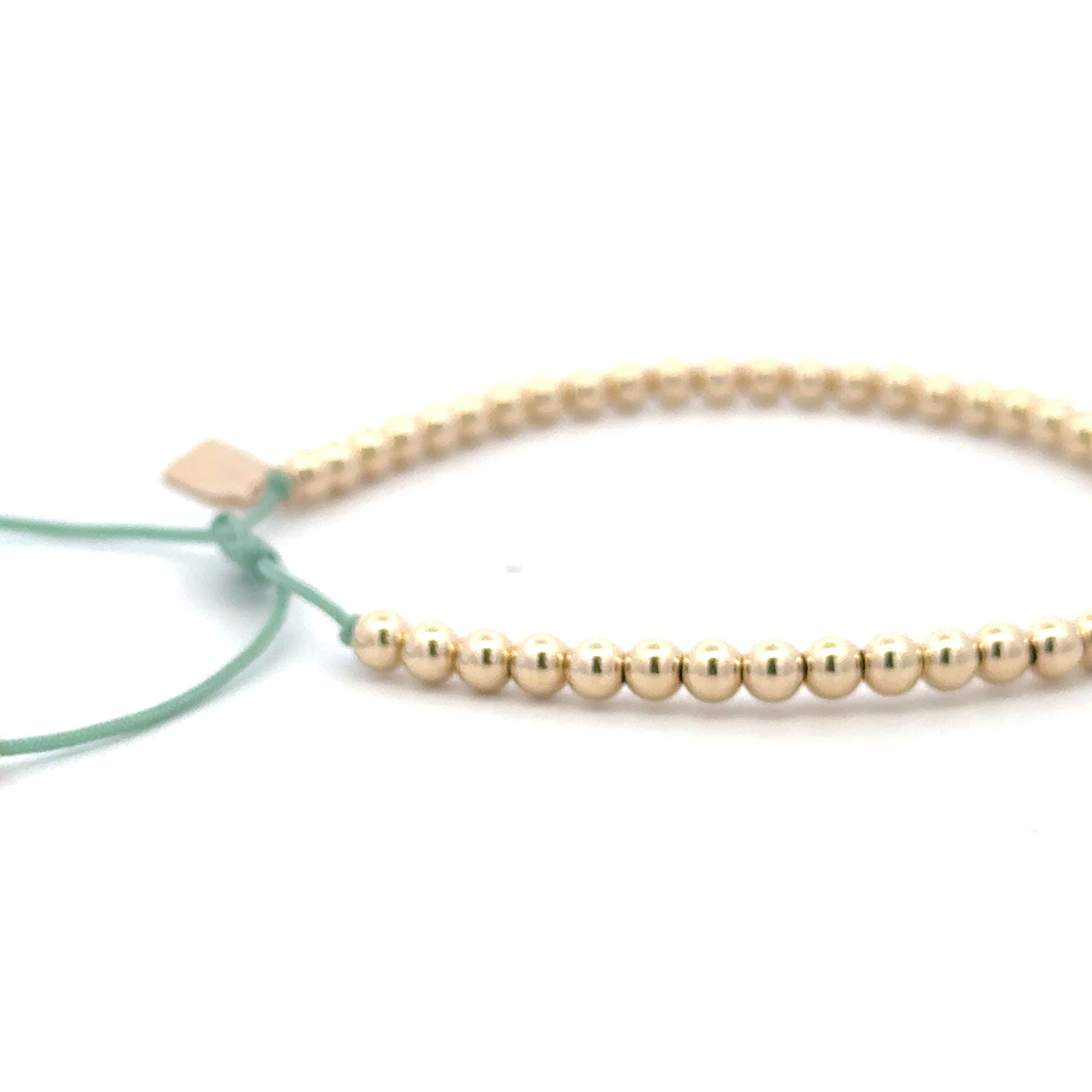 Armband gemaakt van gekleurd koord met goudkleurige bolletjes.