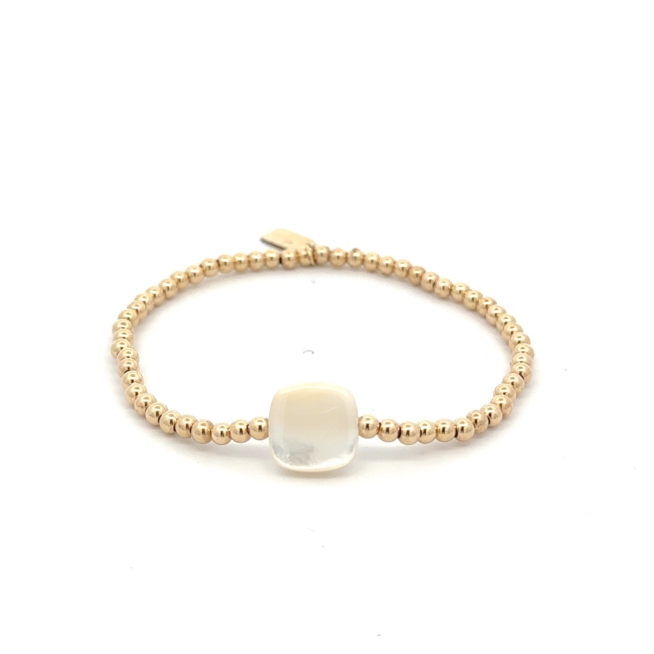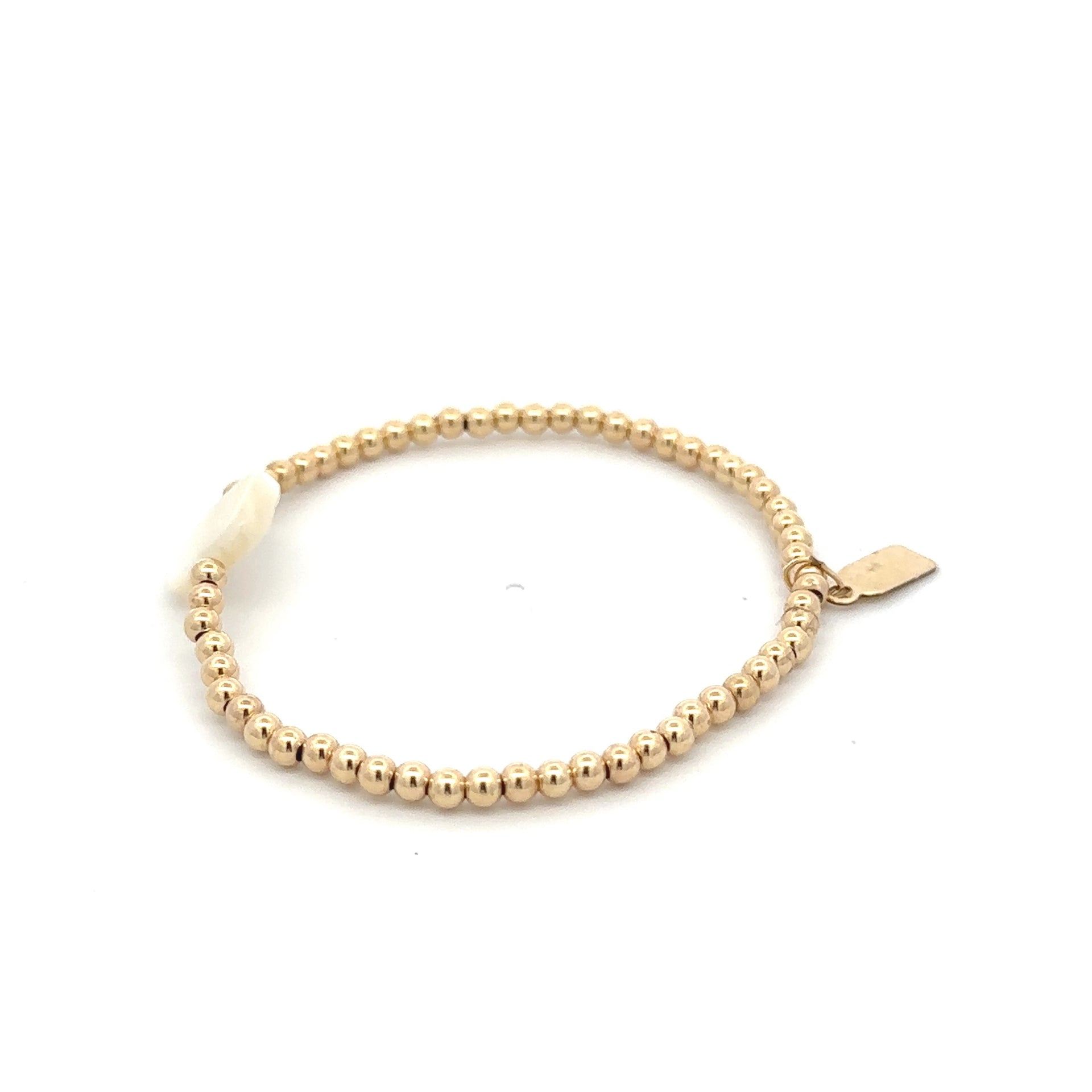 Elastische armband met goudkleurige bolletjes en een gekleurde steen.