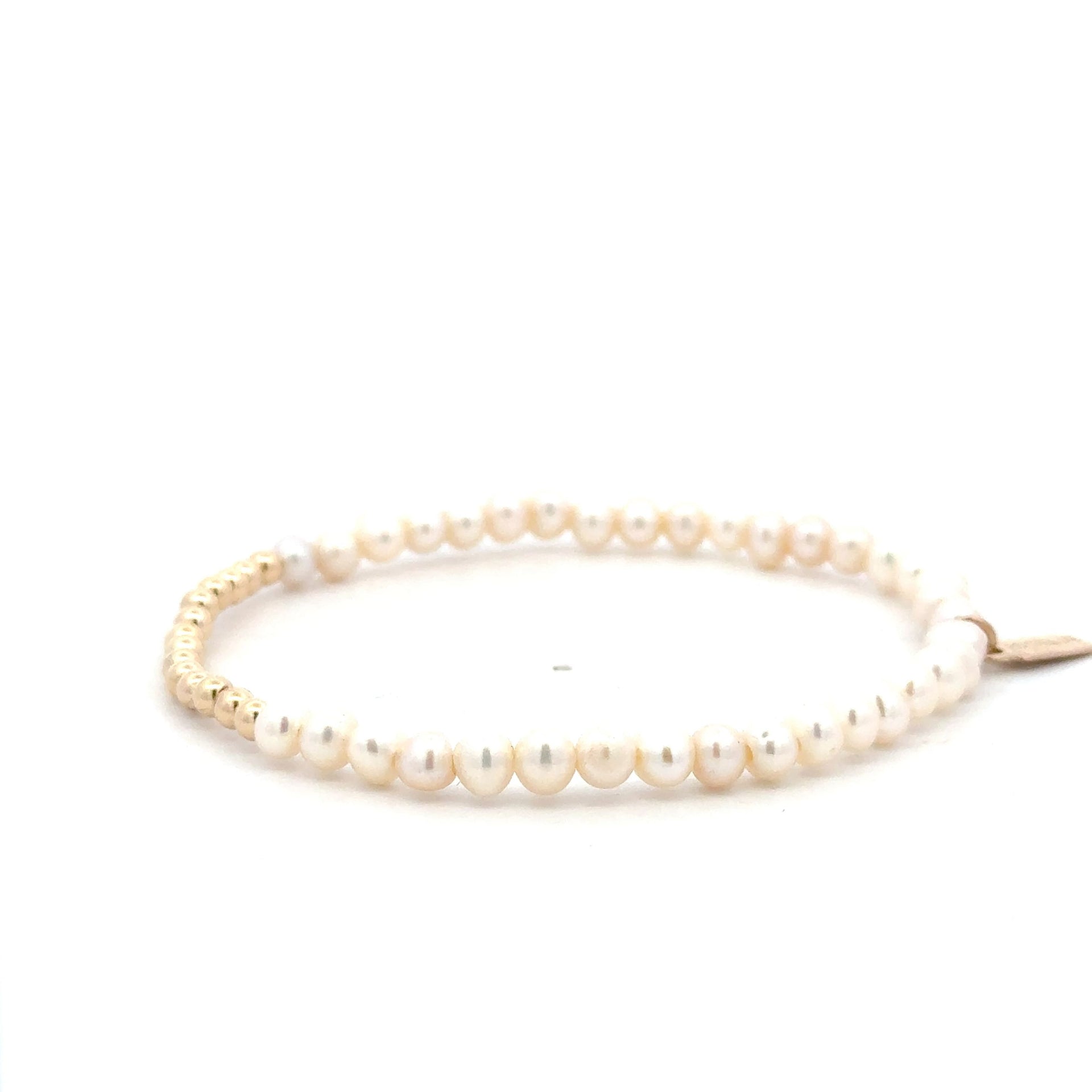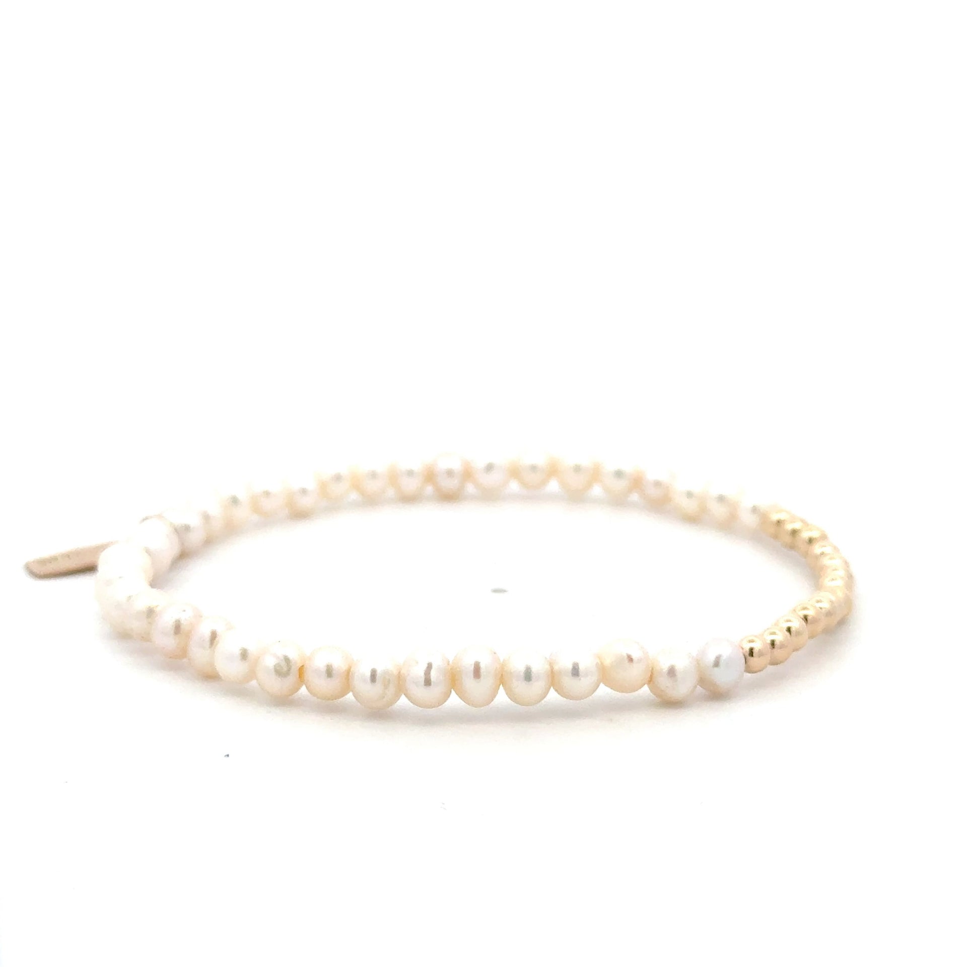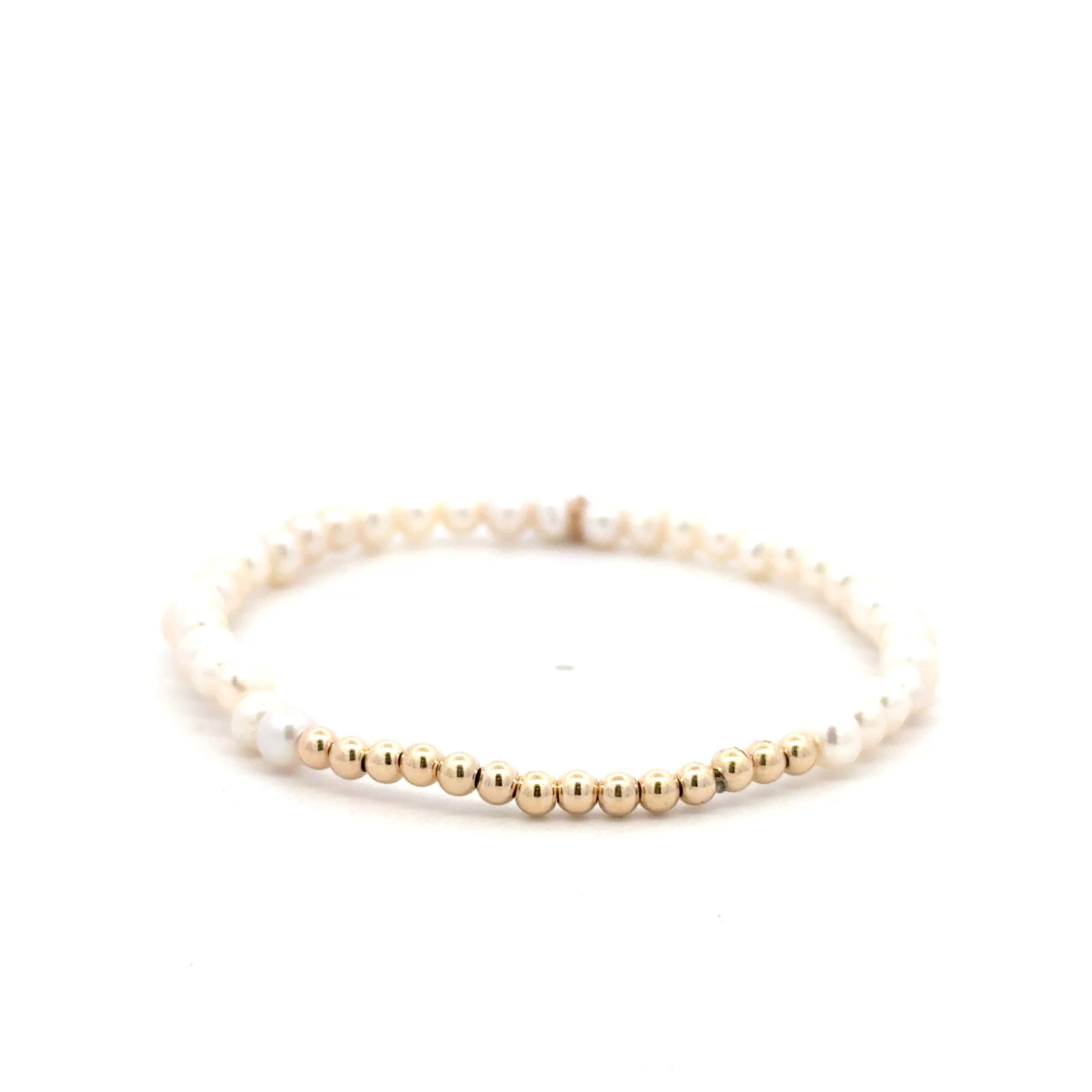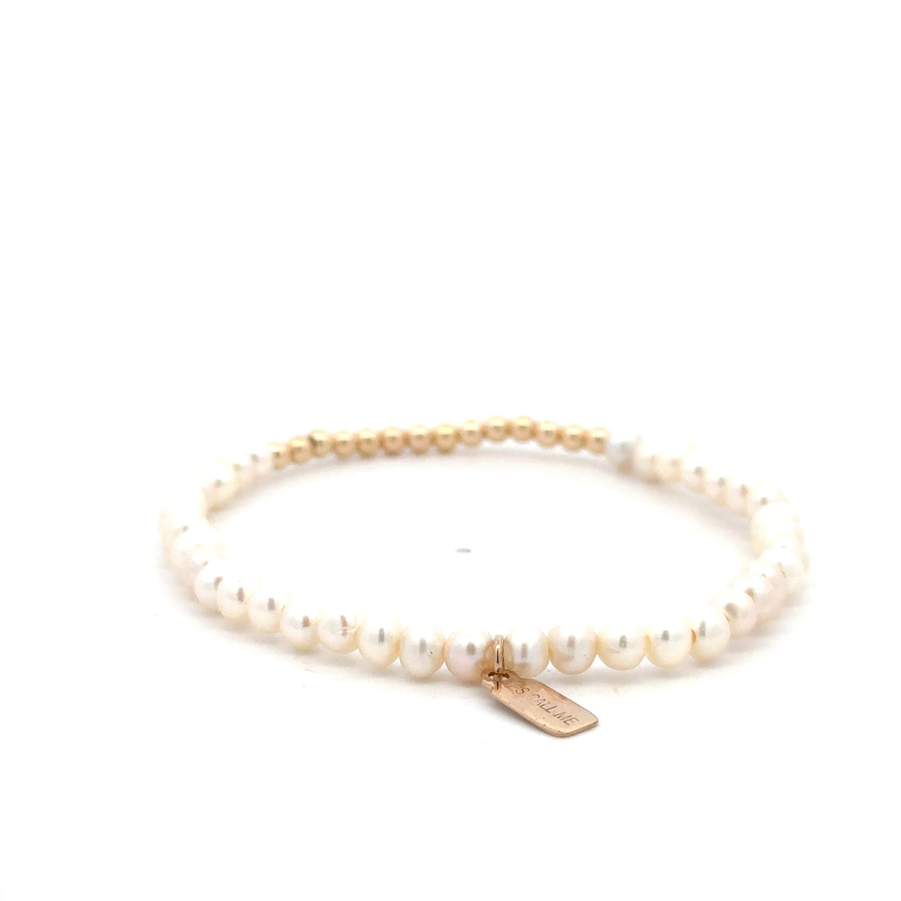 Elastische armband met gekleurde stenen en een rij gouden bolletjes.
