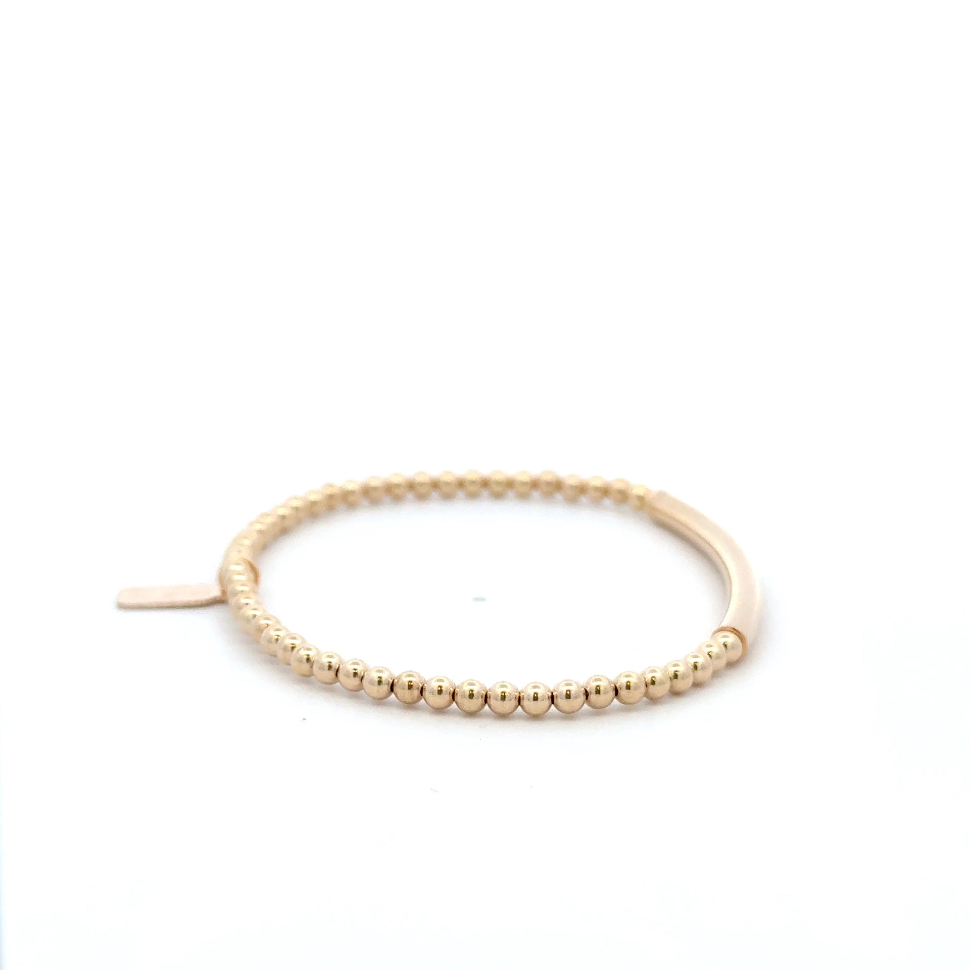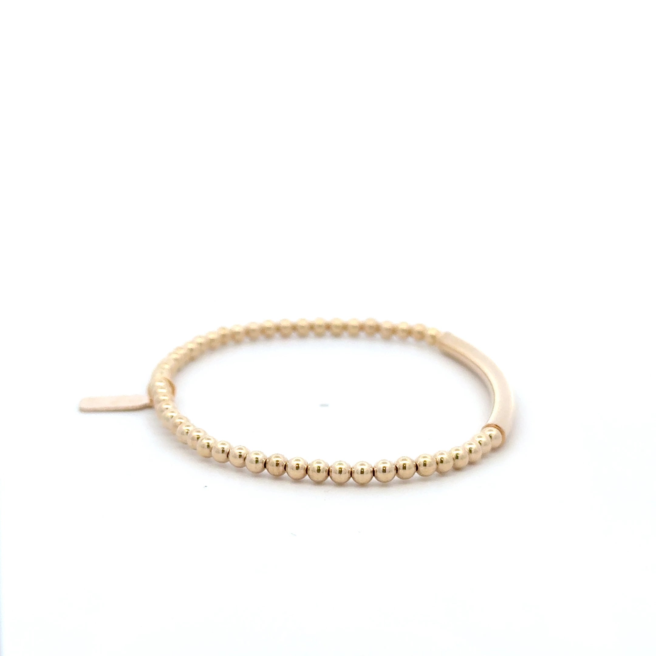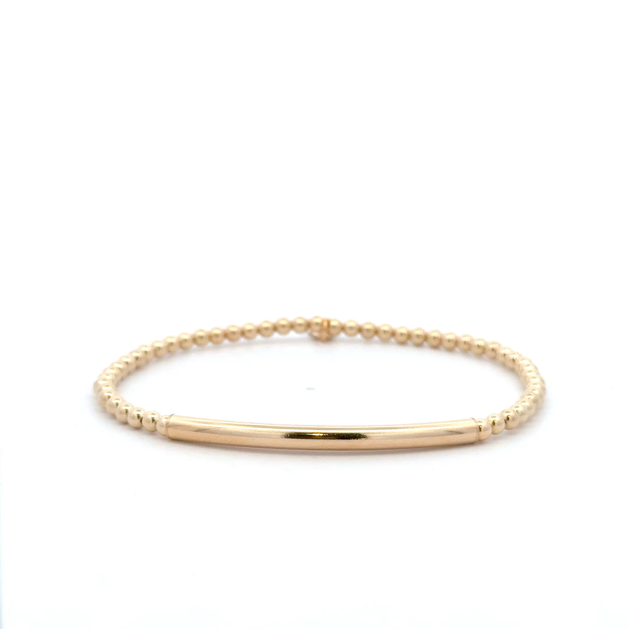Elastic bracelet with gold-colored beads and a gold-colored bar charm.