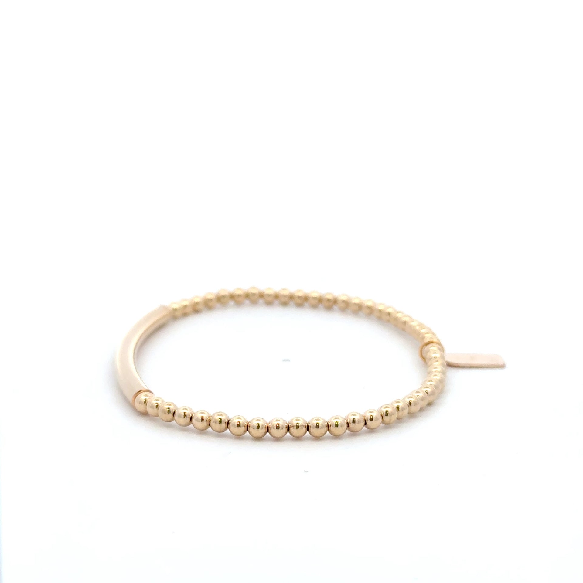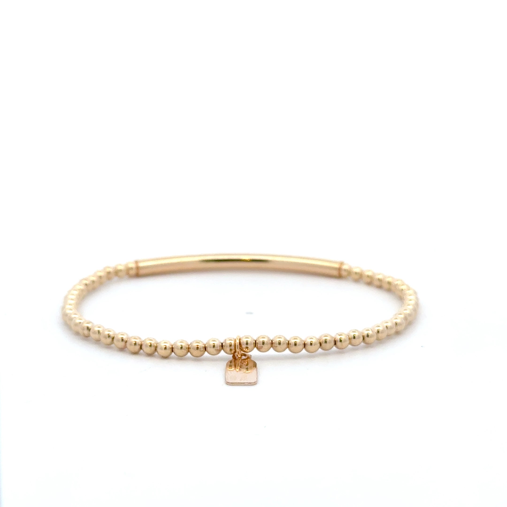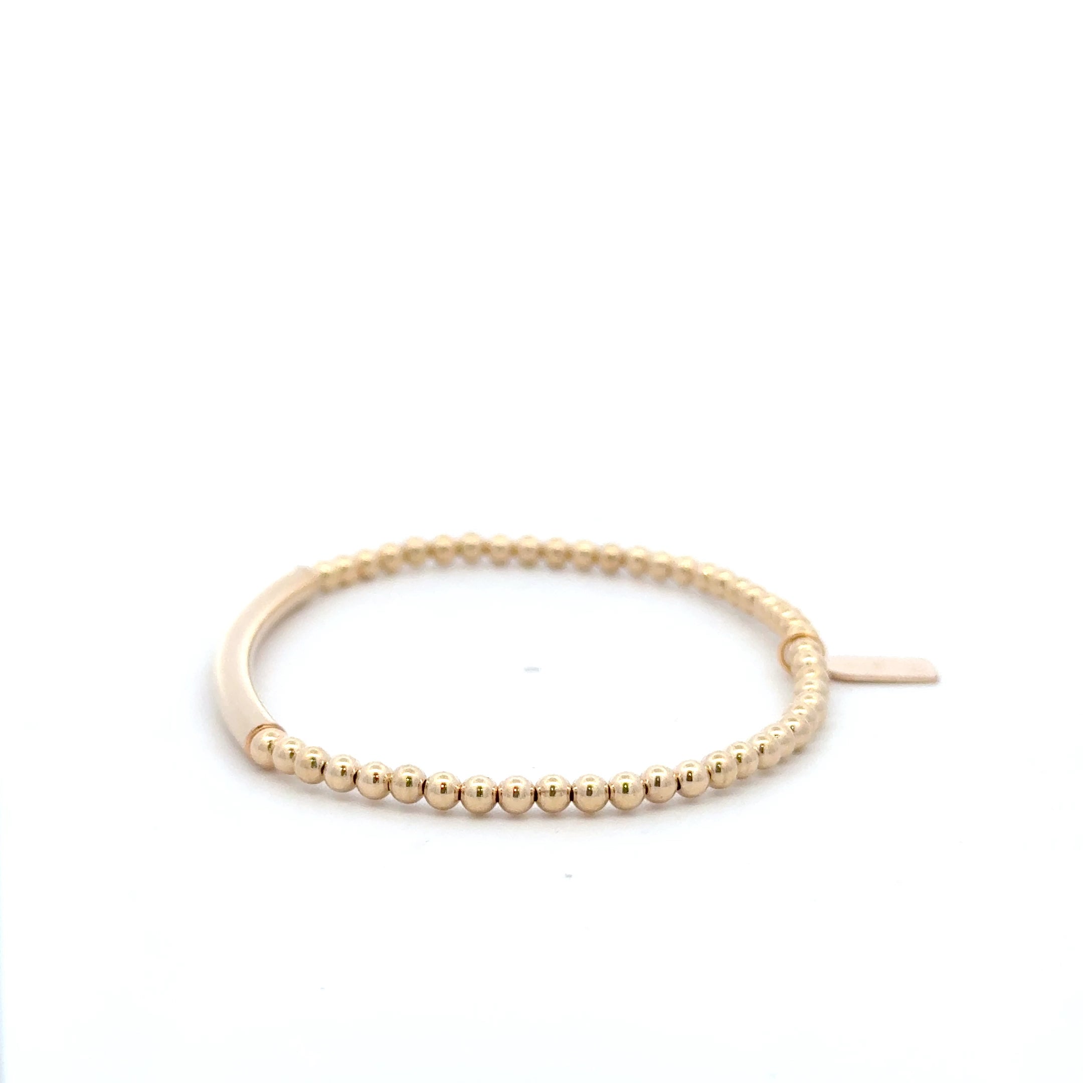 Elastic bracelet with gold-colored beads and a gold-colored bar charm.