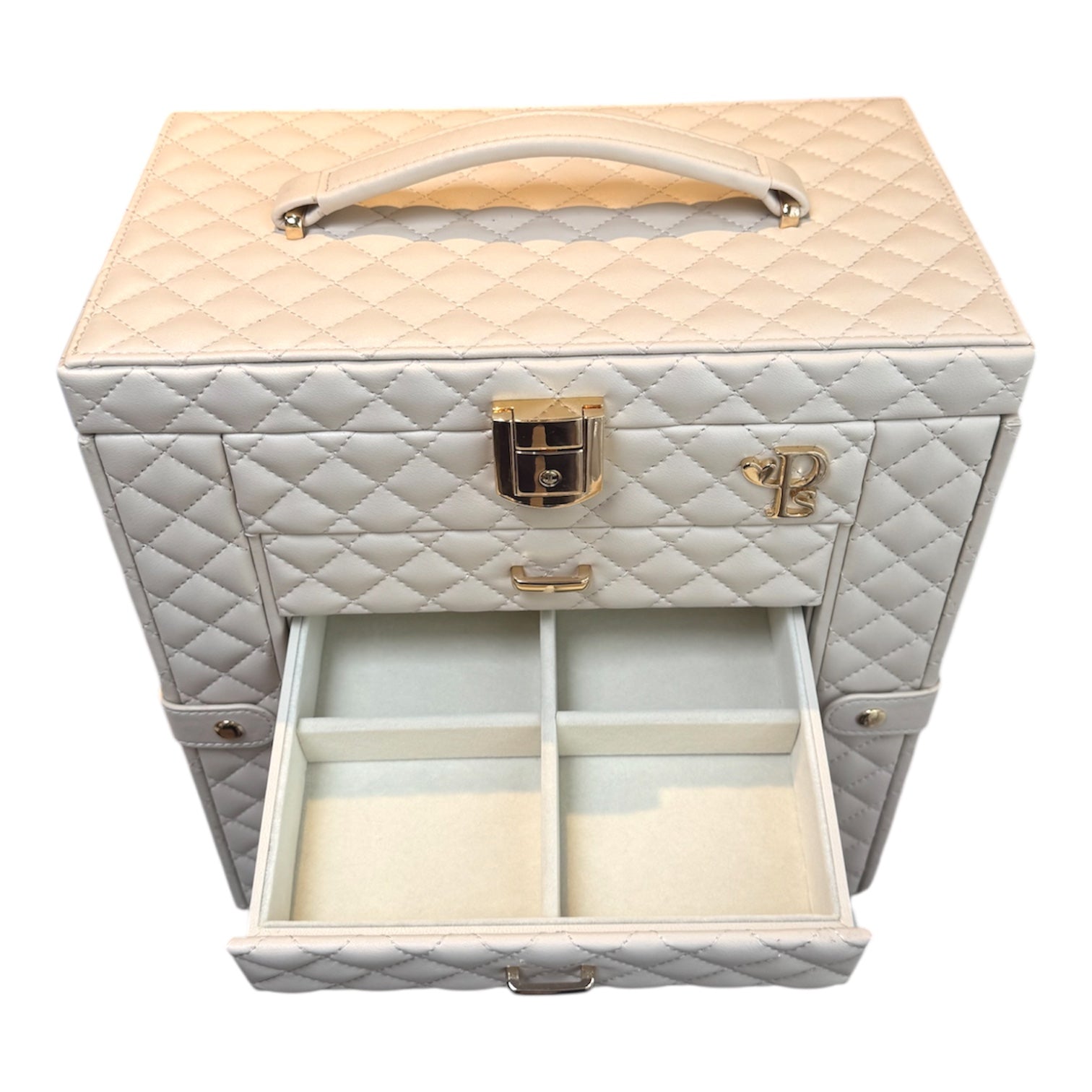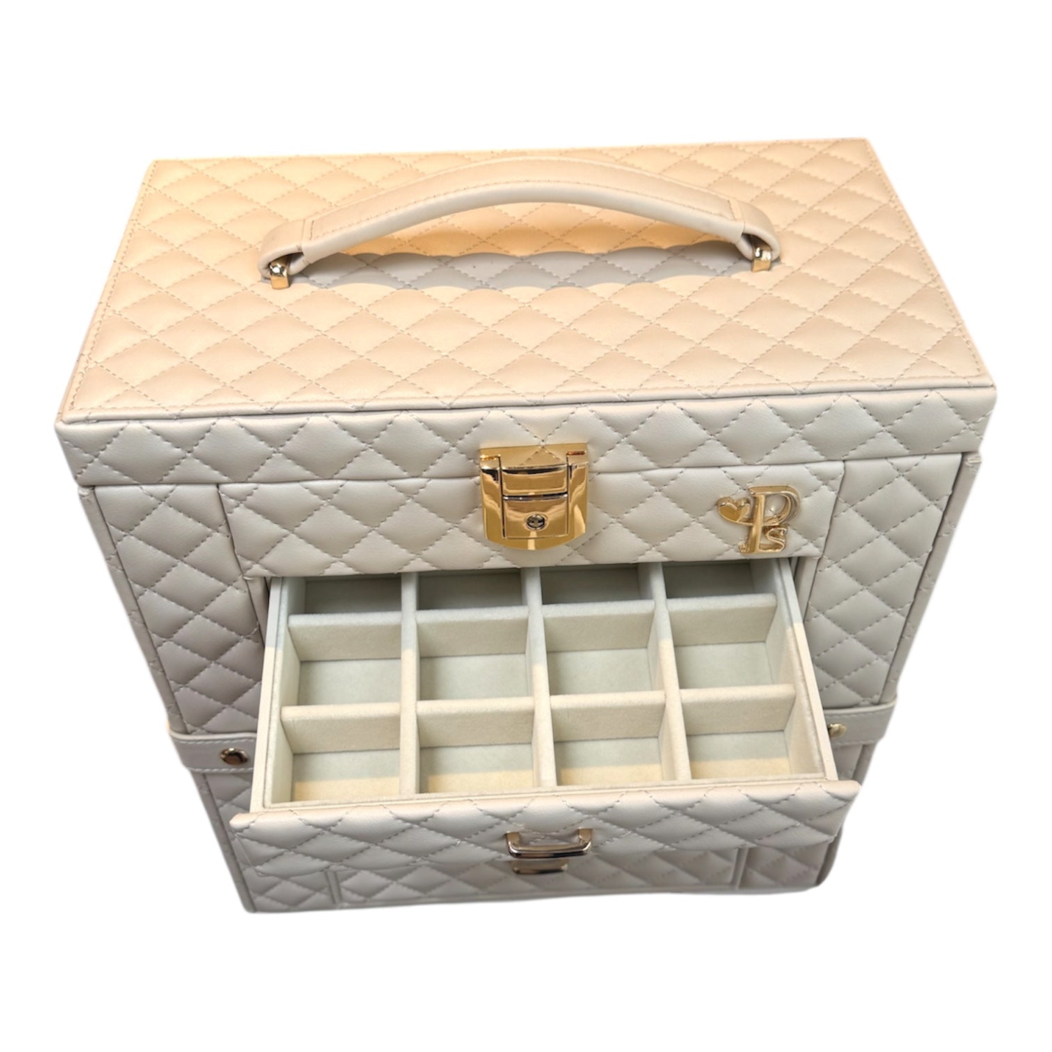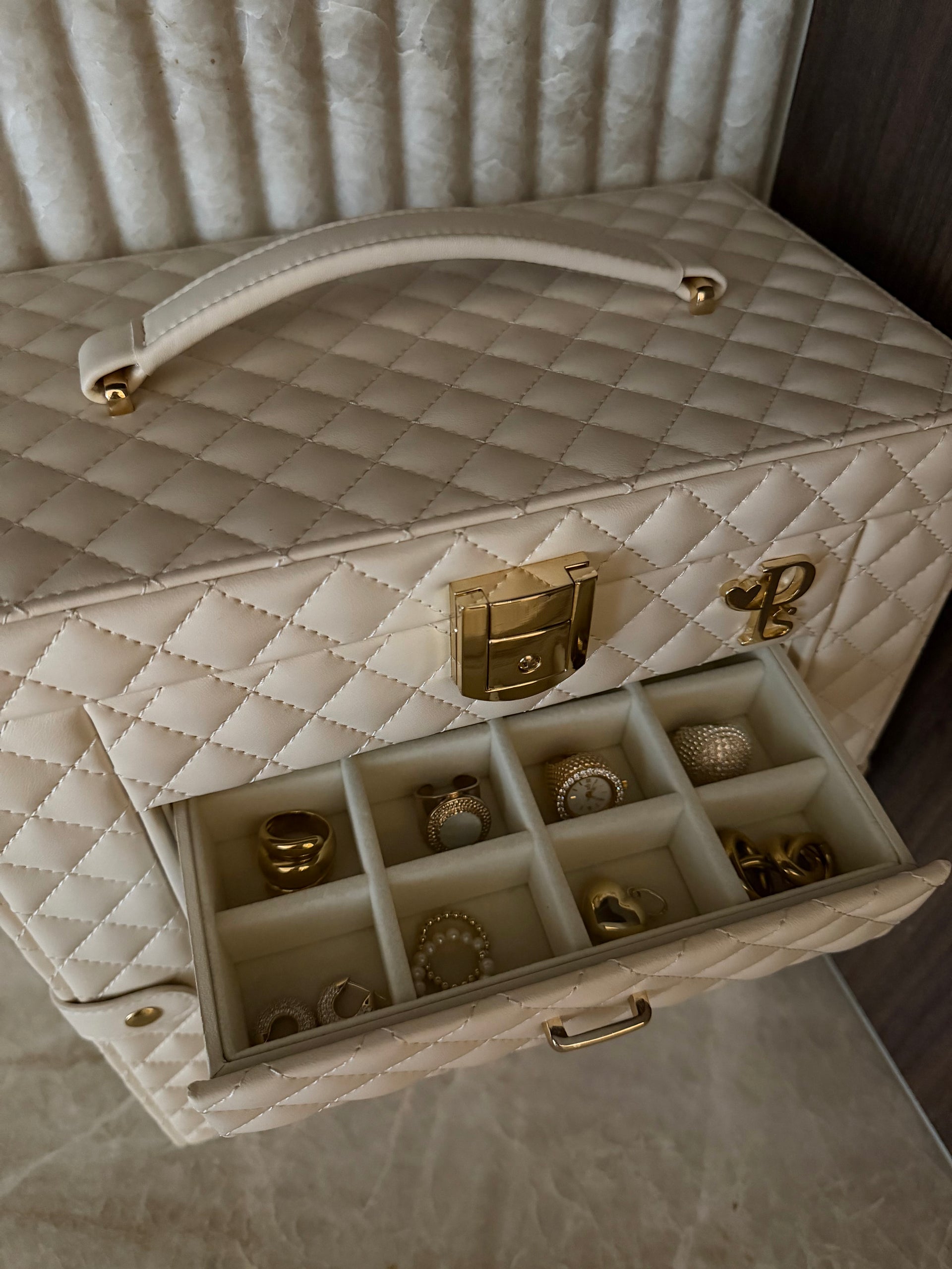 Store your jewelry in style with this elegant quilted jewelry box. The soft, cream-colored exterior with diamond stitching gives a luxurious look, while the gold details from the lock to the handles add a refined, timeless touch.