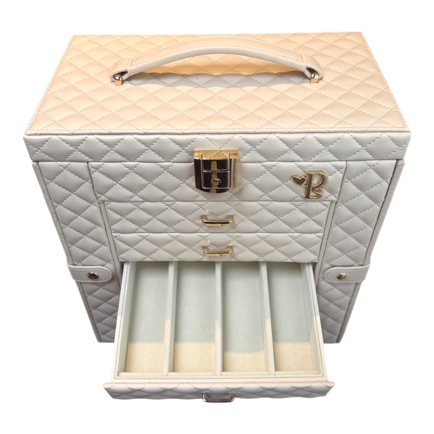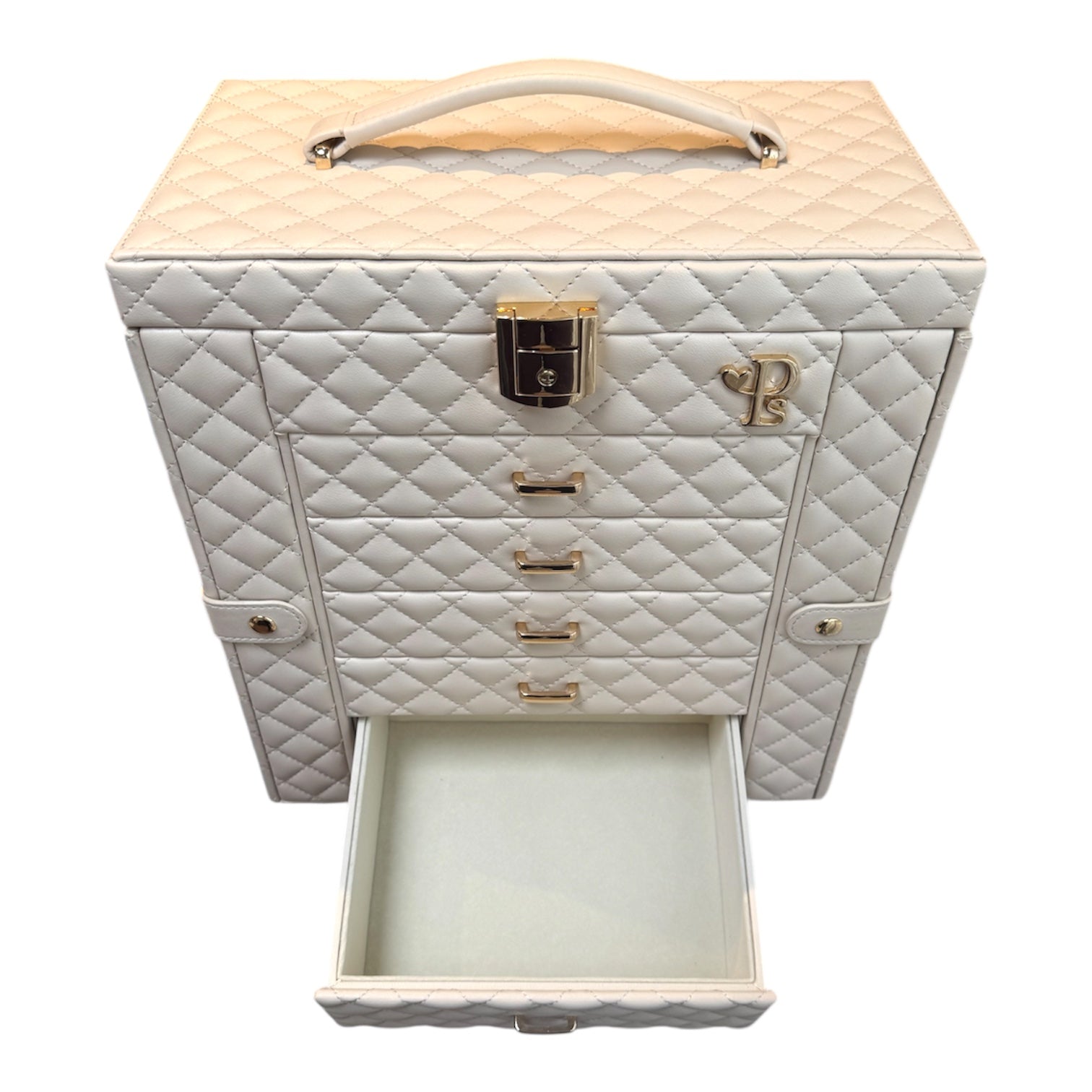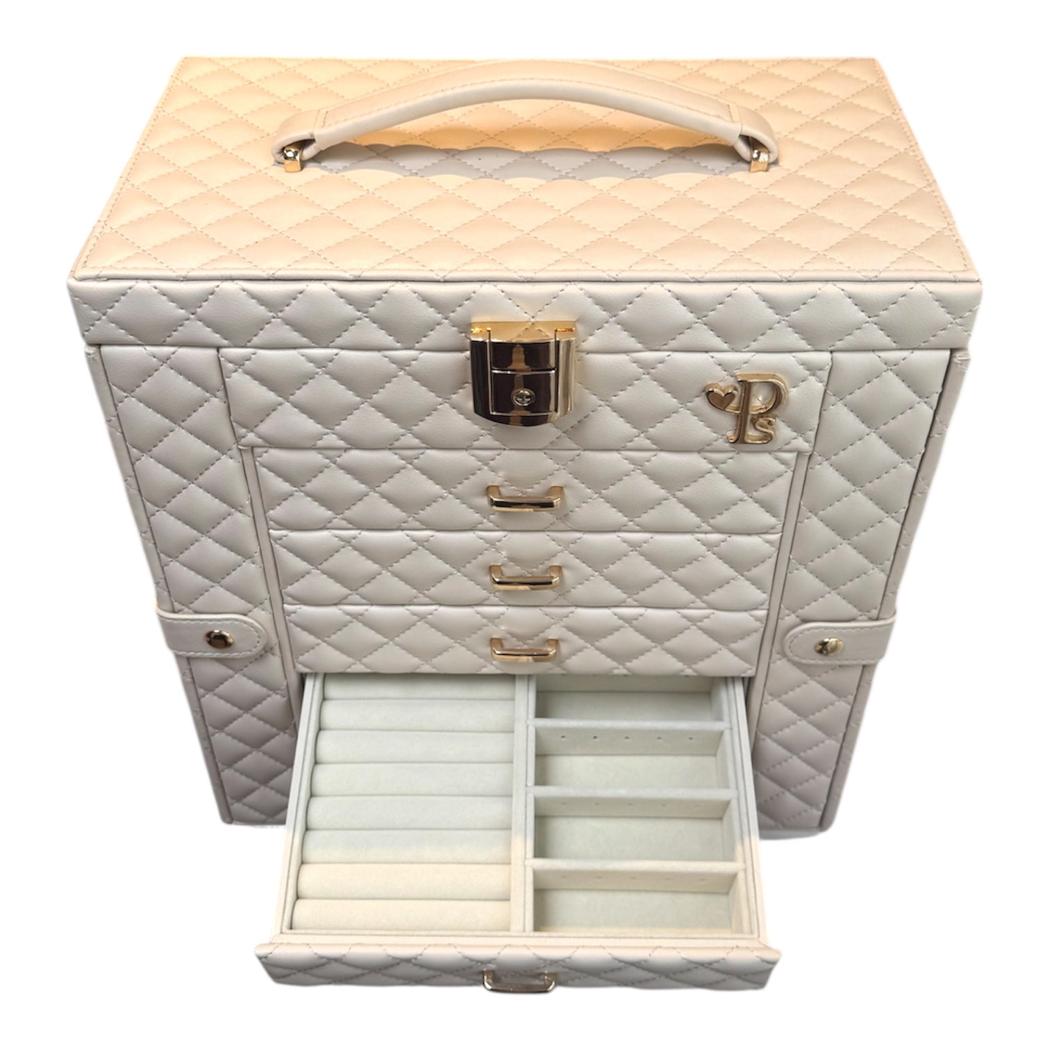 Store your jewelry in style with this elegant quilted jewelry box. The soft, cream-colored exterior with diamond stitching gives a luxurious look, while the gold details from the lock to the handles add a refined, timeless touch.