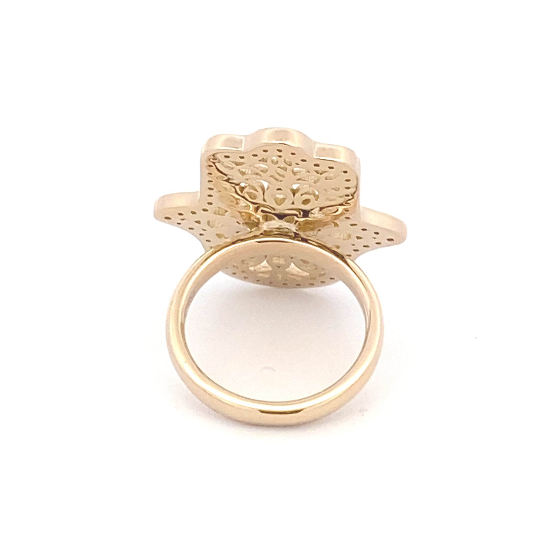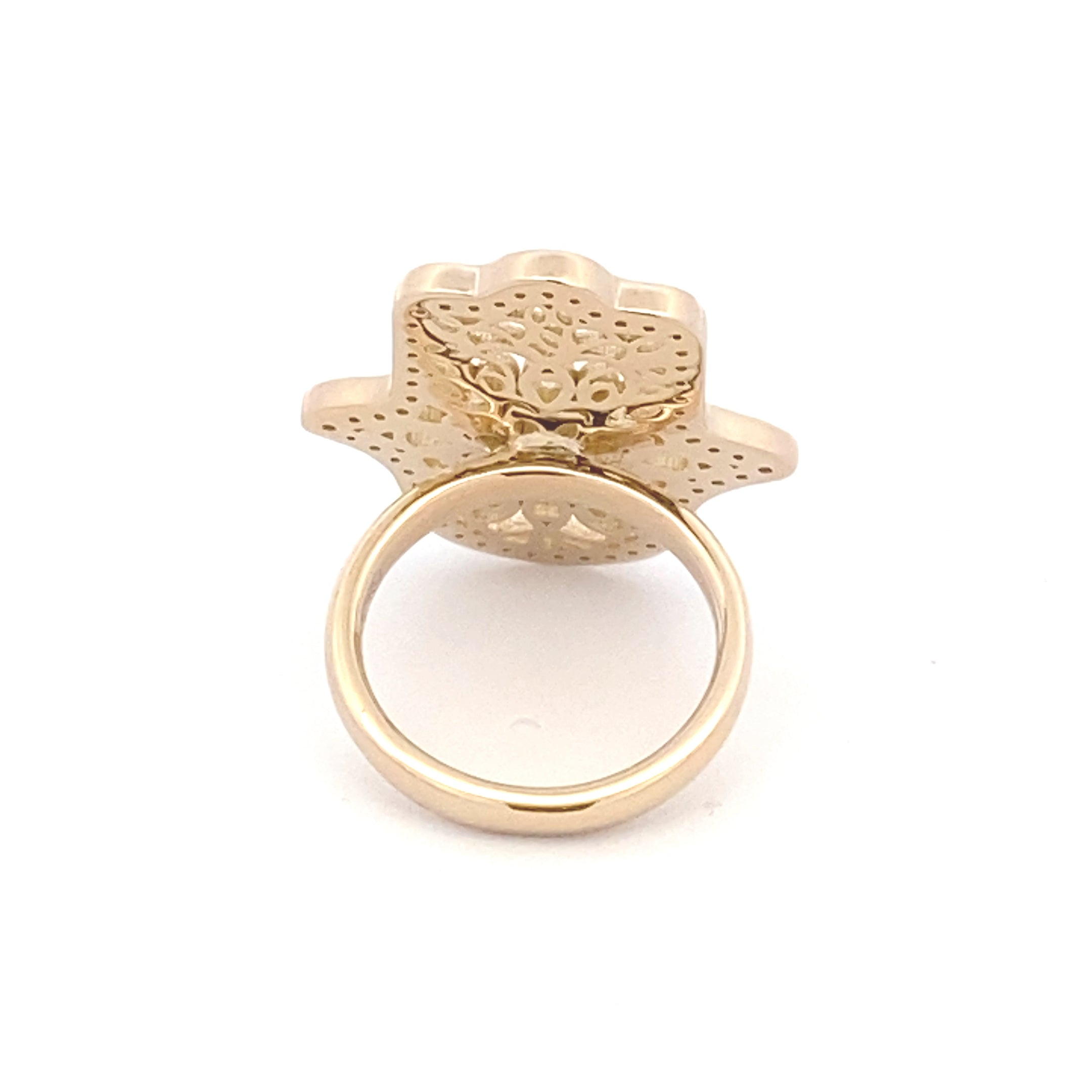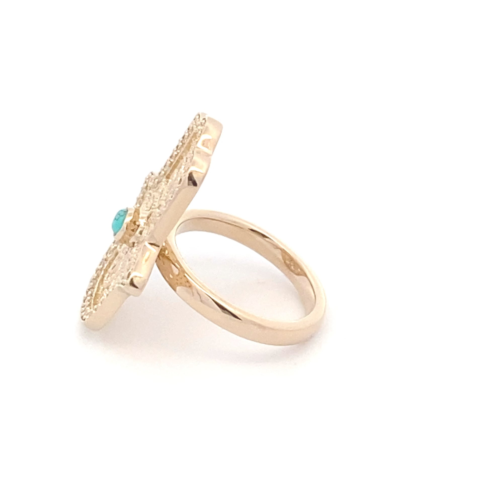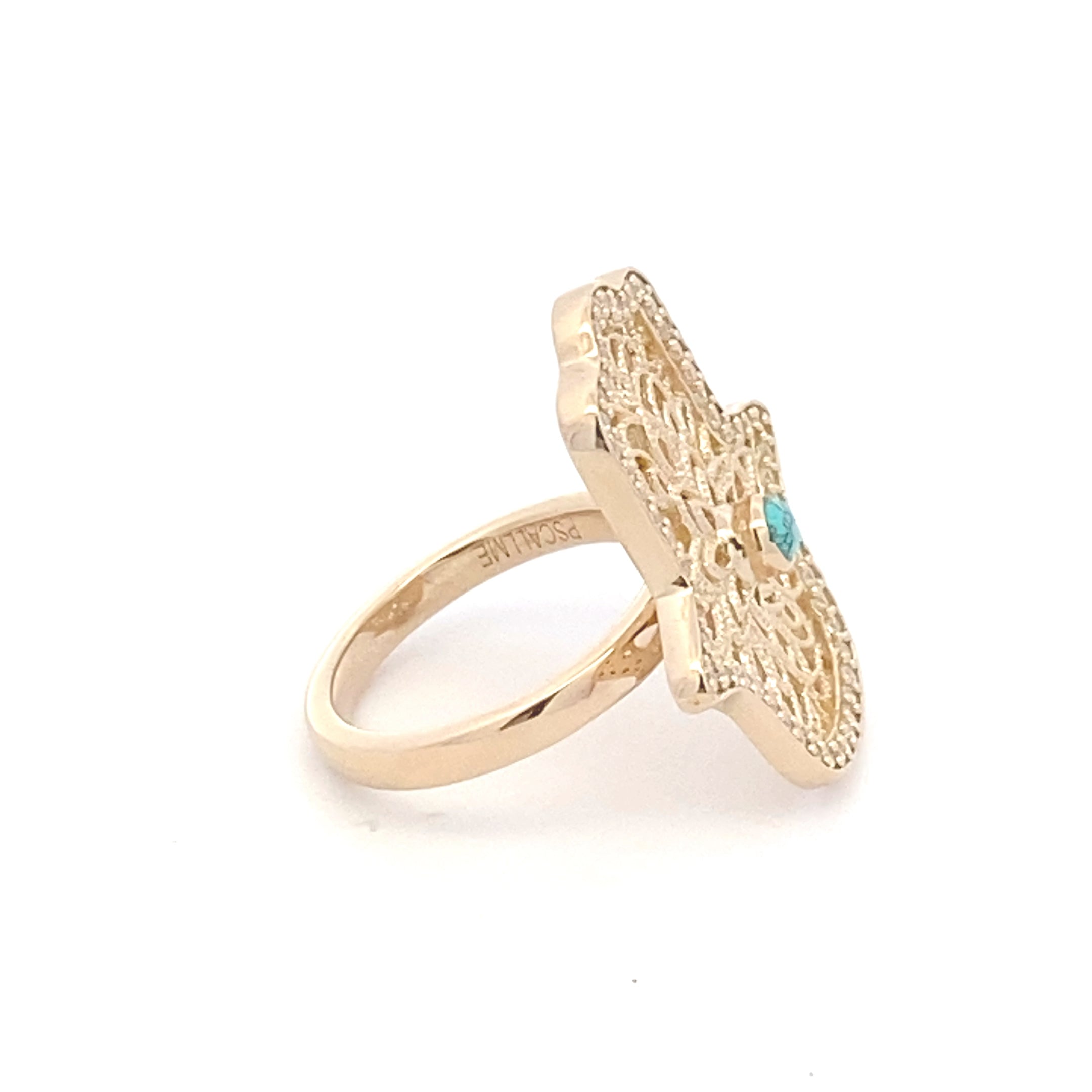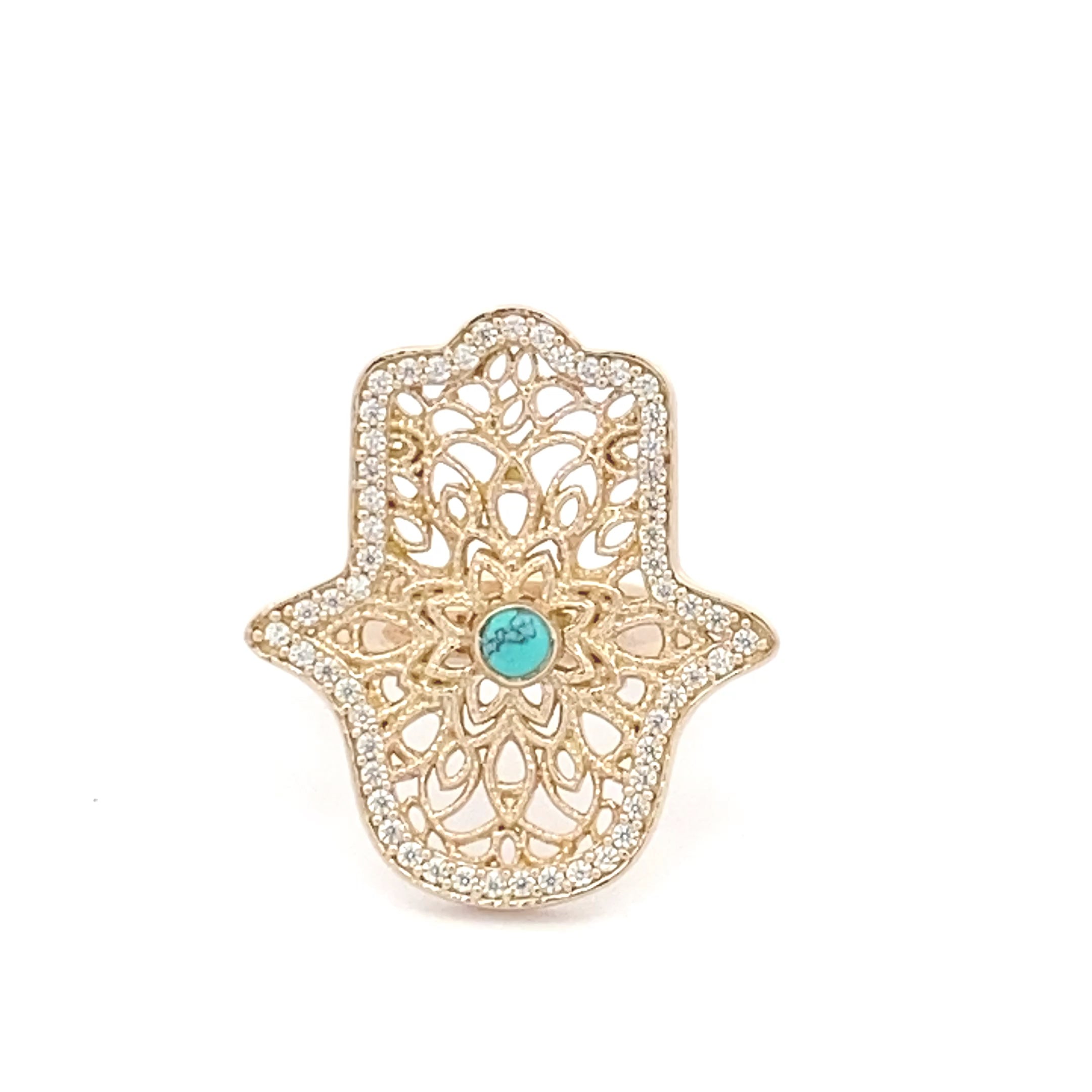 A special eye catcher with meaning! This beautiful gold-tone Hamsa ring symbolizes protection, happiness and strength. The openwork details are delicately finished and framed with sparkling zirconia stones. A turquoise stone shines in the center, symbolizing tranquility and positive energy.