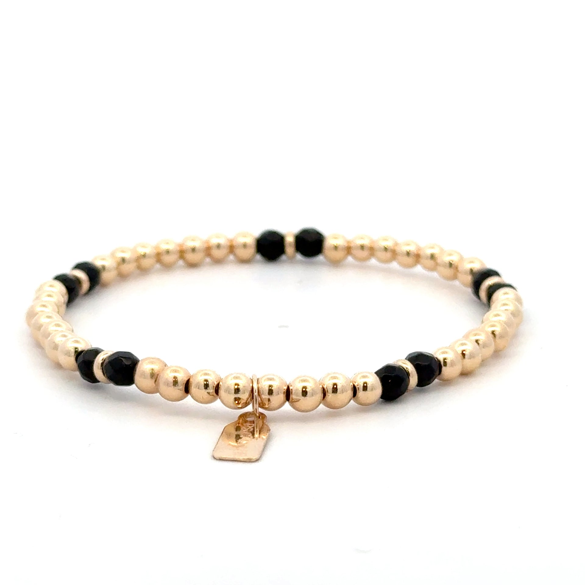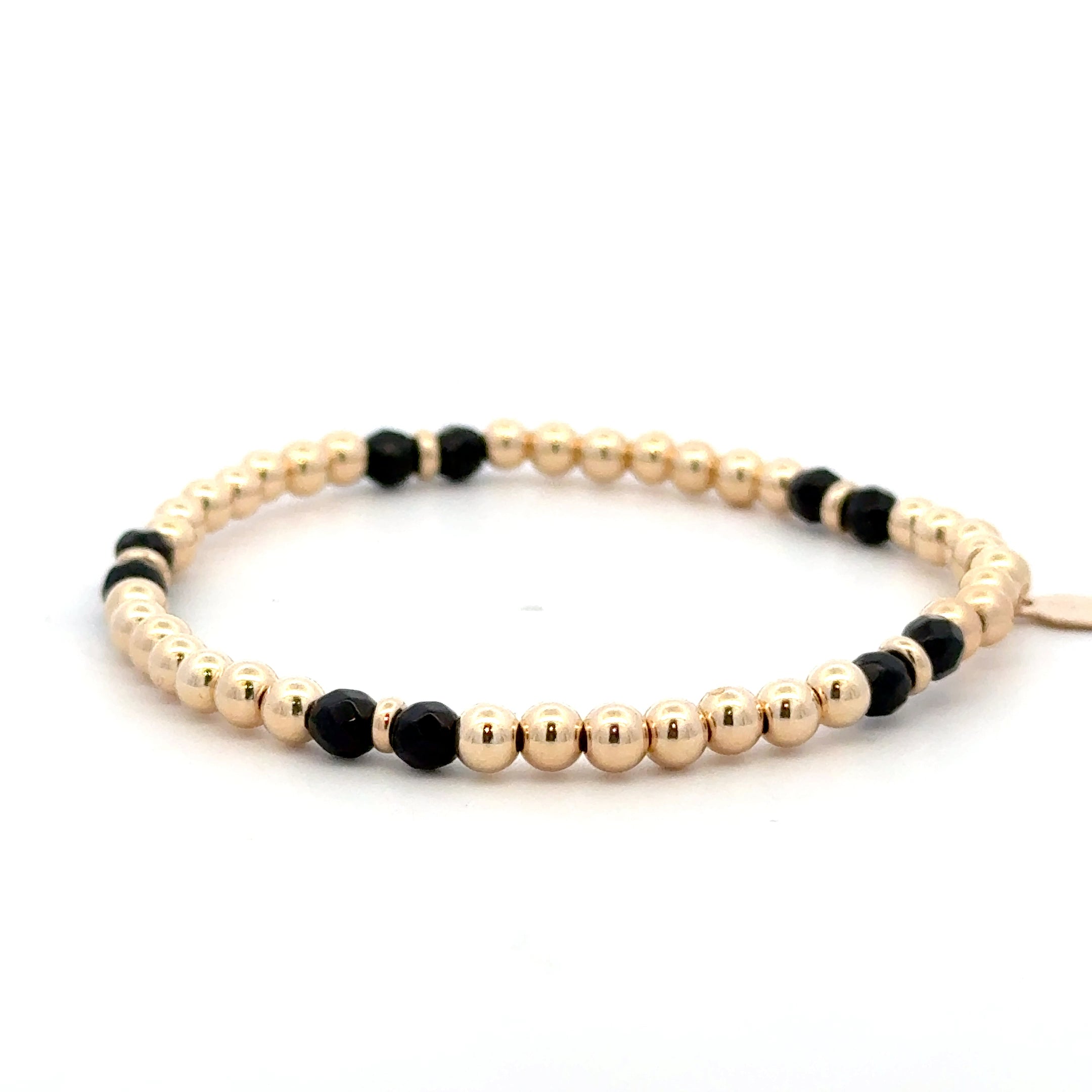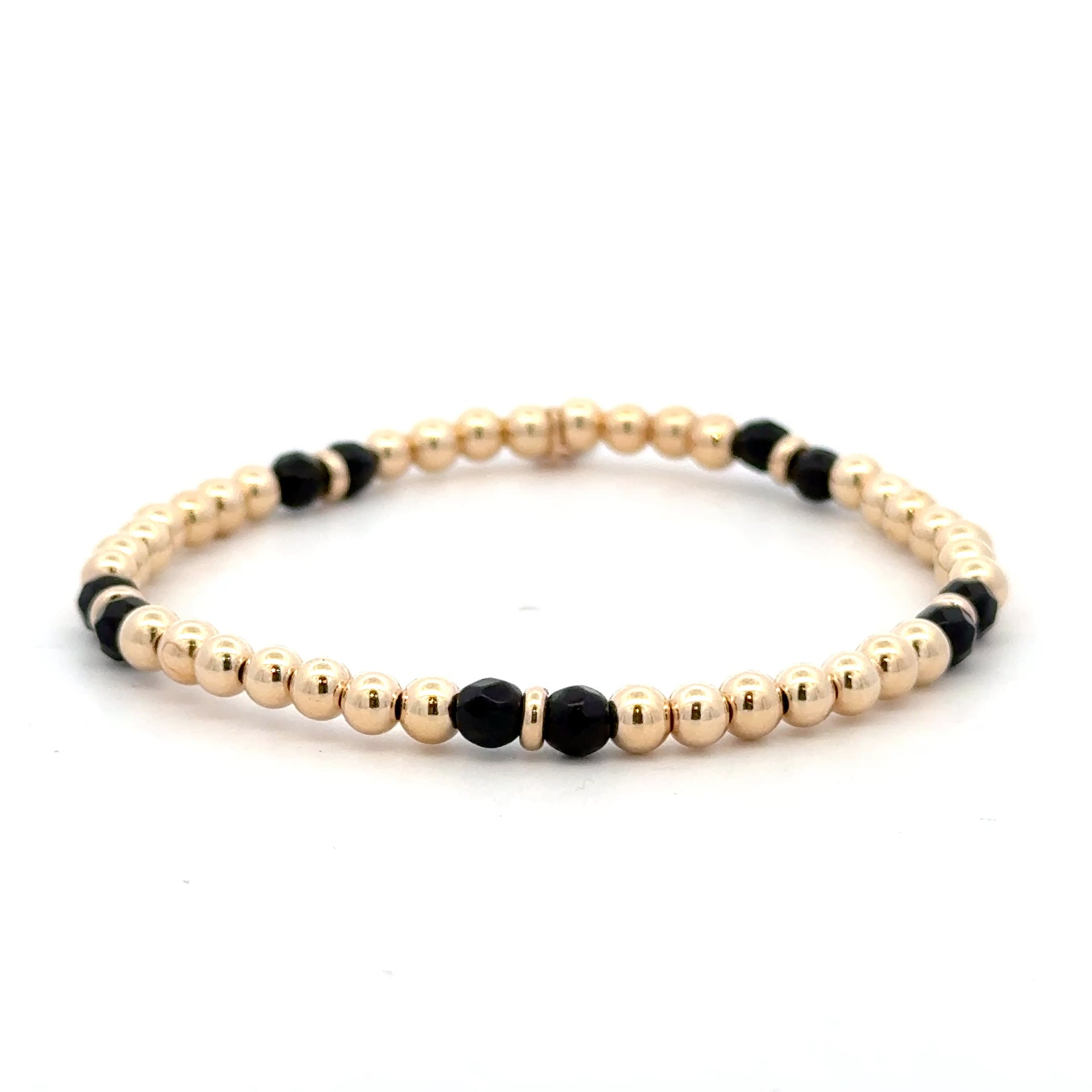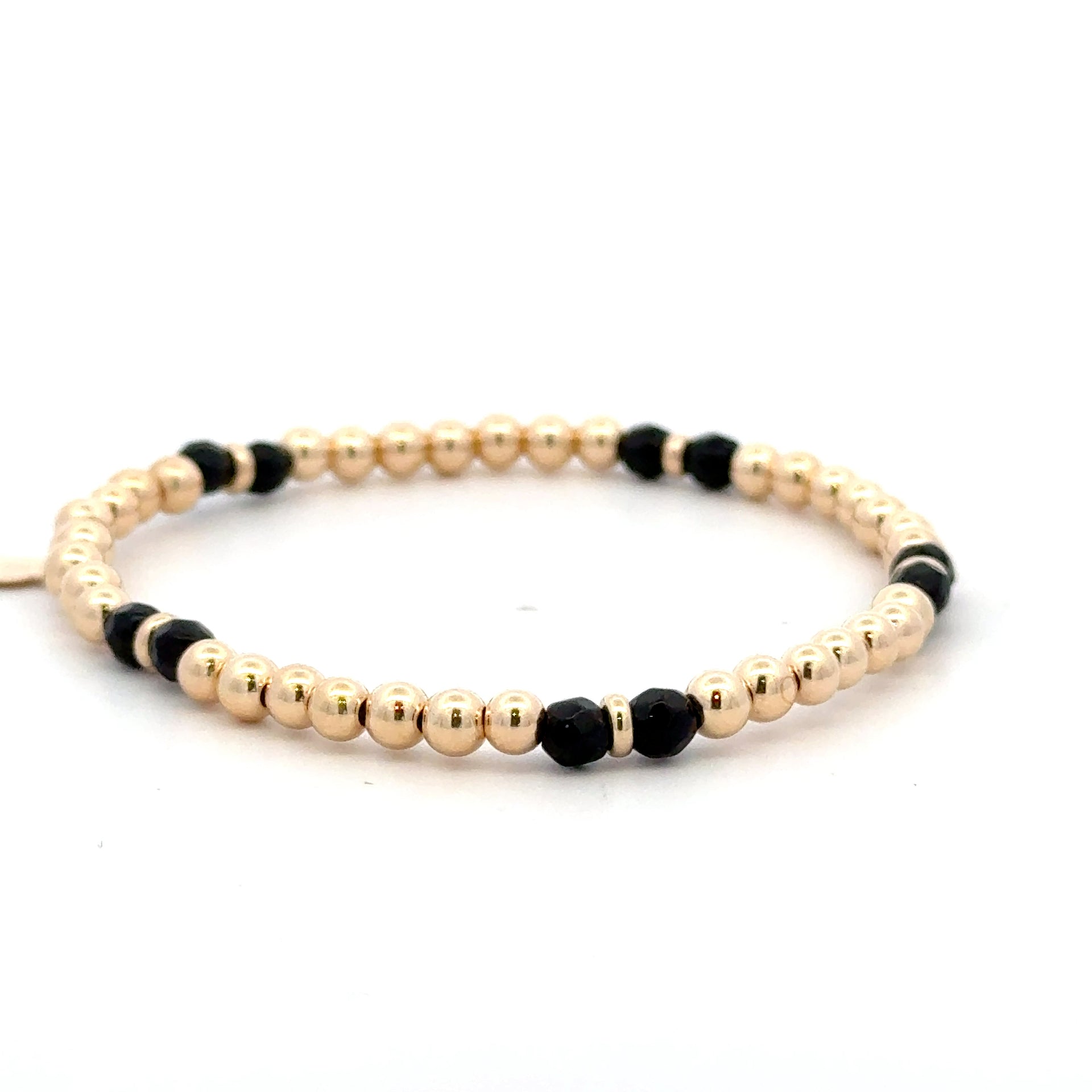 Elastic bracelet with gold-colored beads, five disc-shaped spacers, and a black bead next to each
