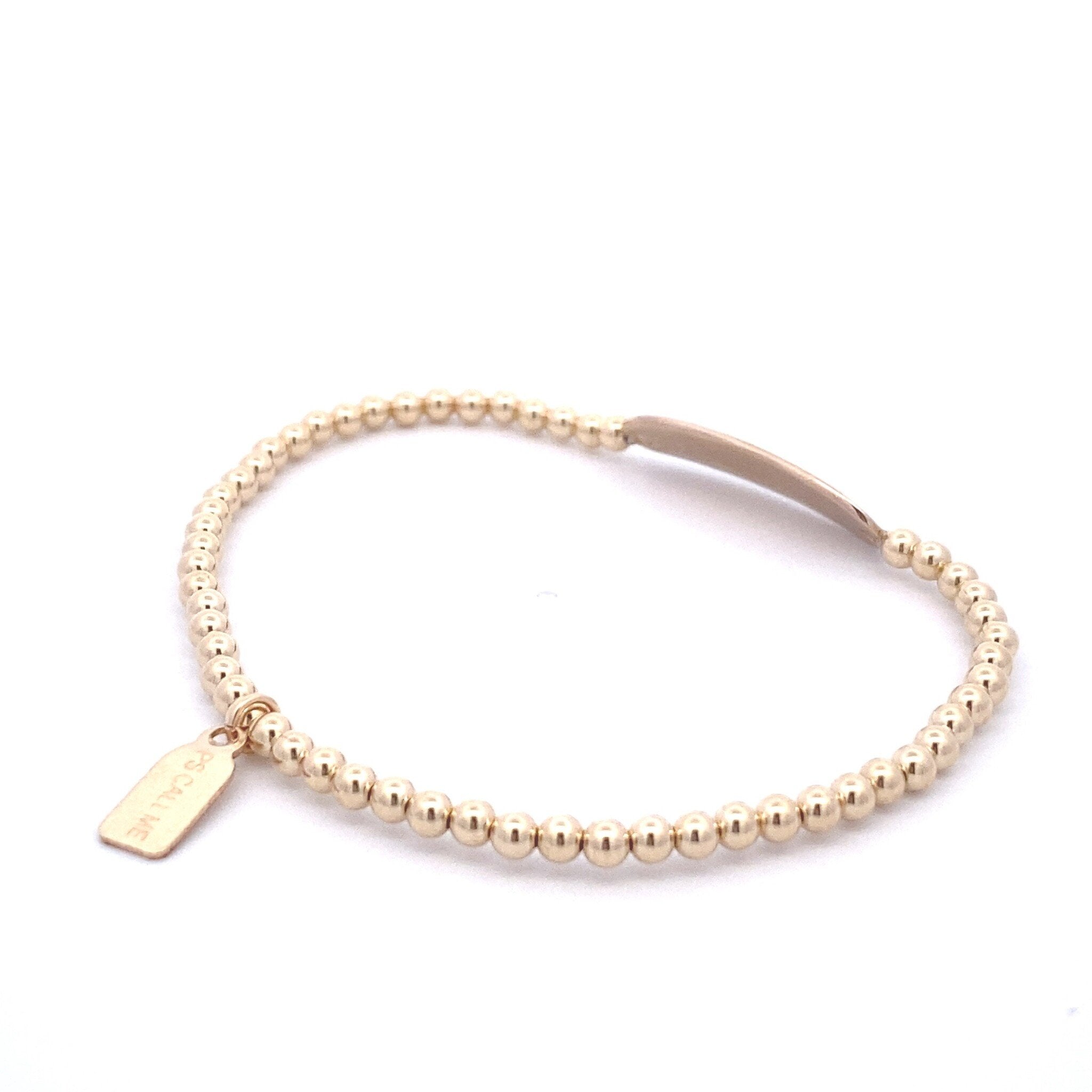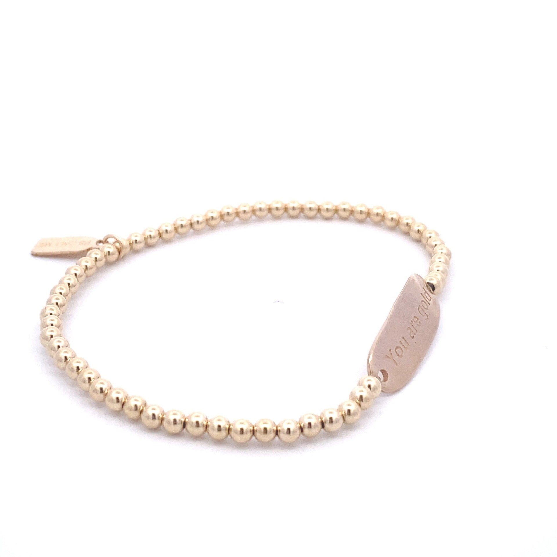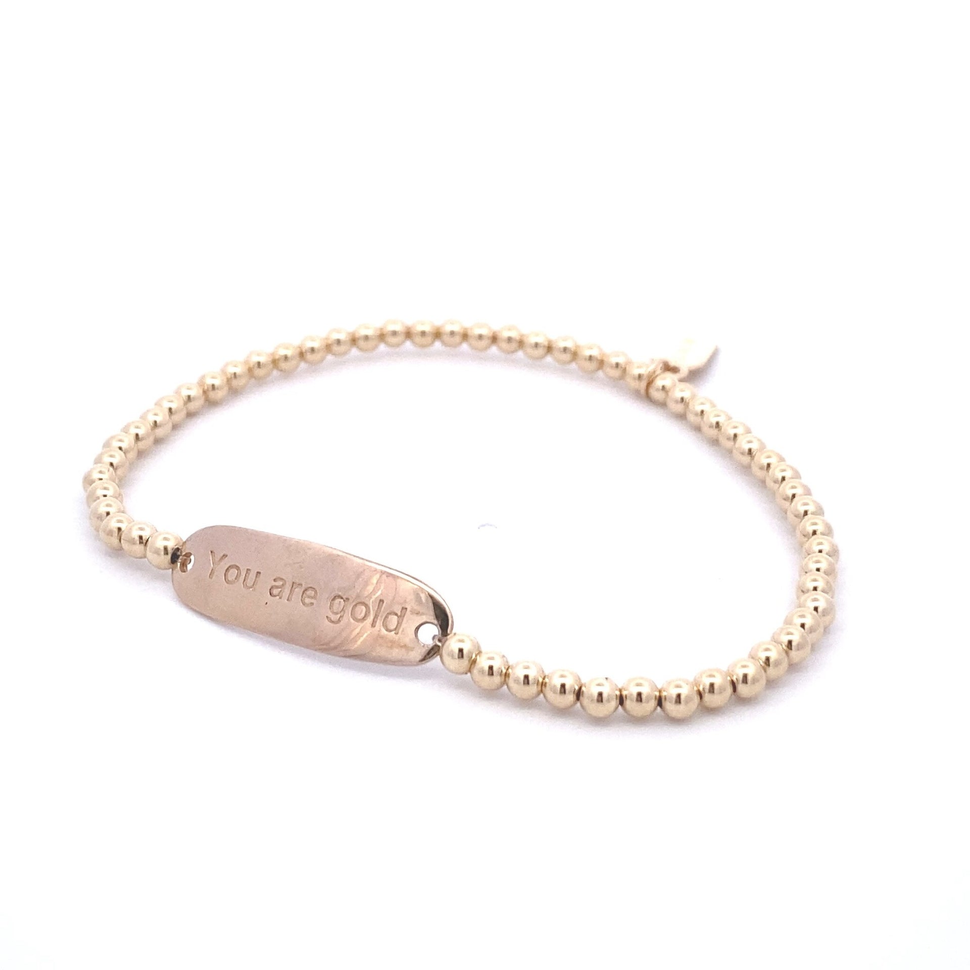 Elastisches Armband mit goldfarbenen Kugeln und einem goldfarbenen Balkenanhänger mit dem Text „You are gold“ darauf.