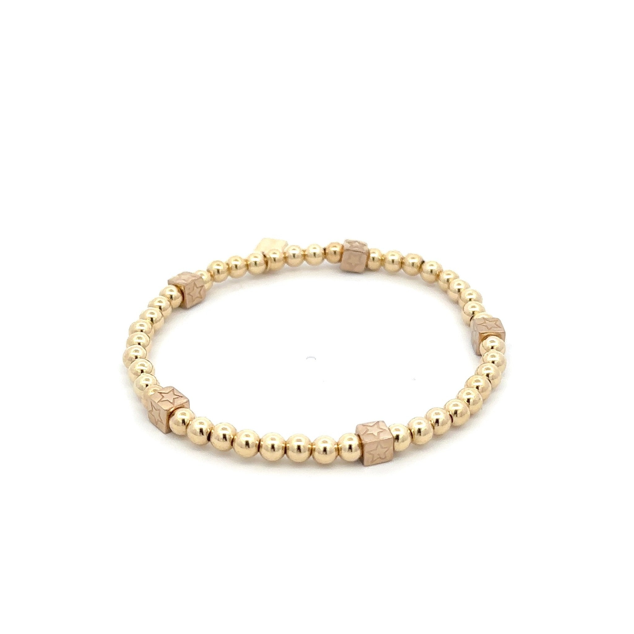 Elastisches Armband mit goldfarbenen Kugeln und 5 goldfarbenen Anhängern.