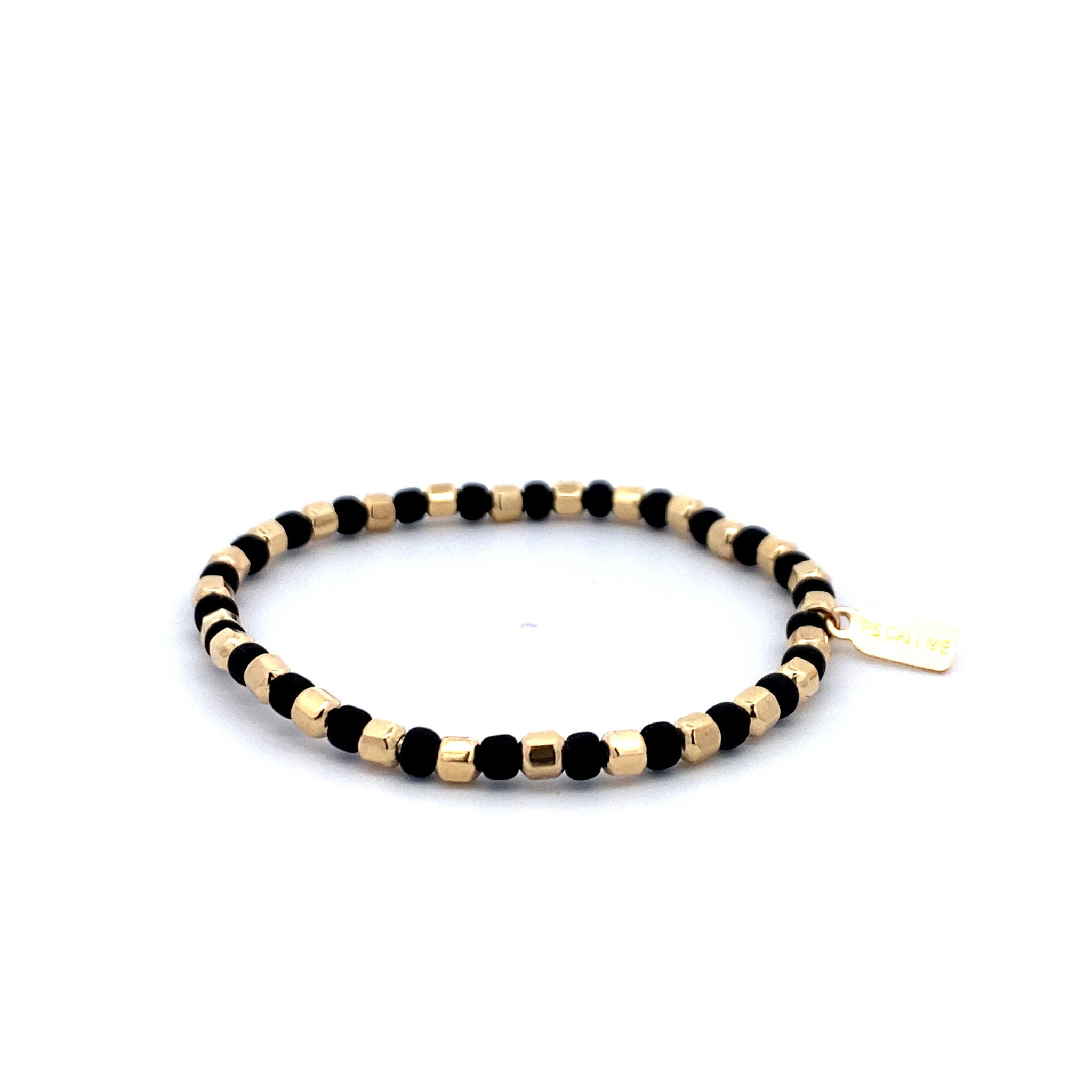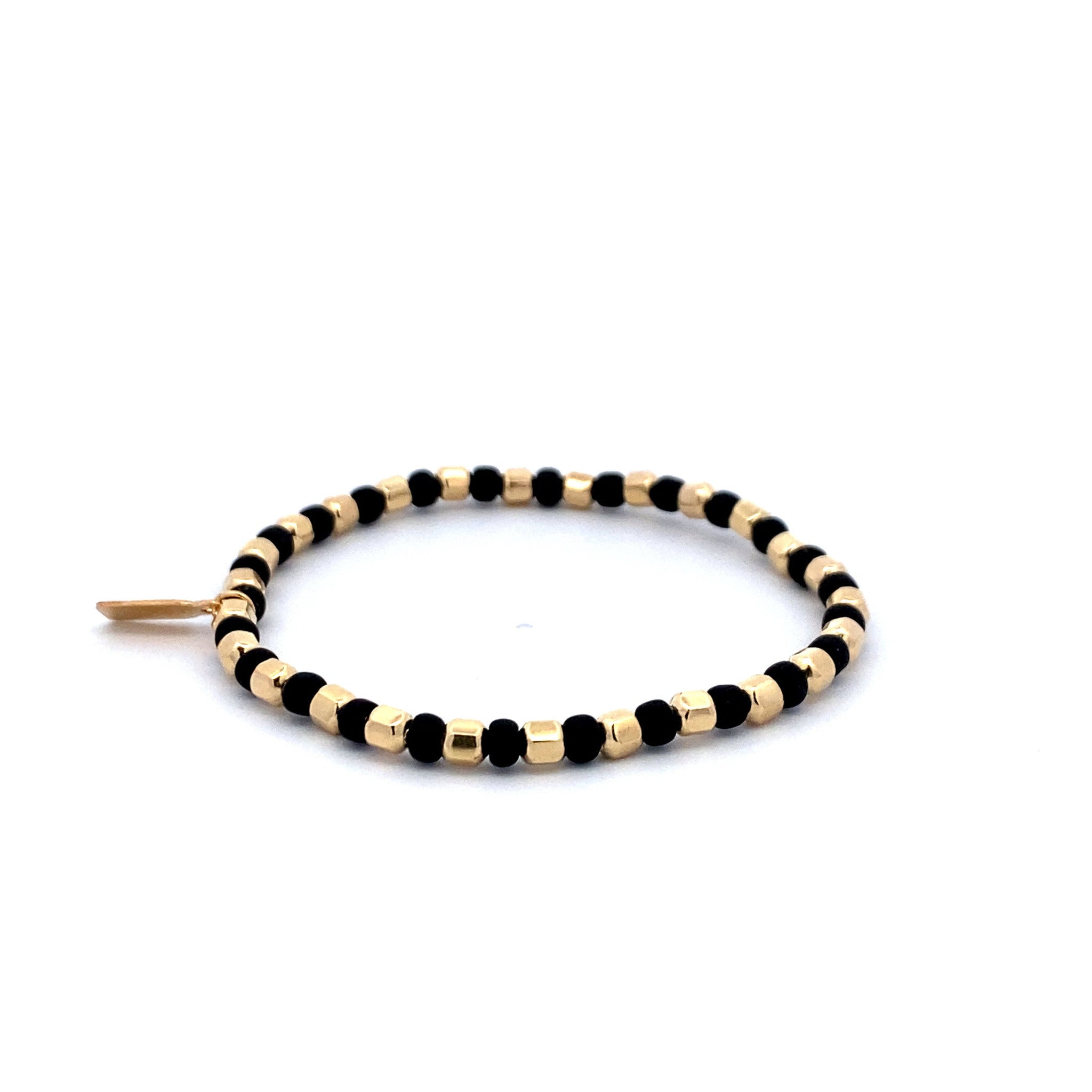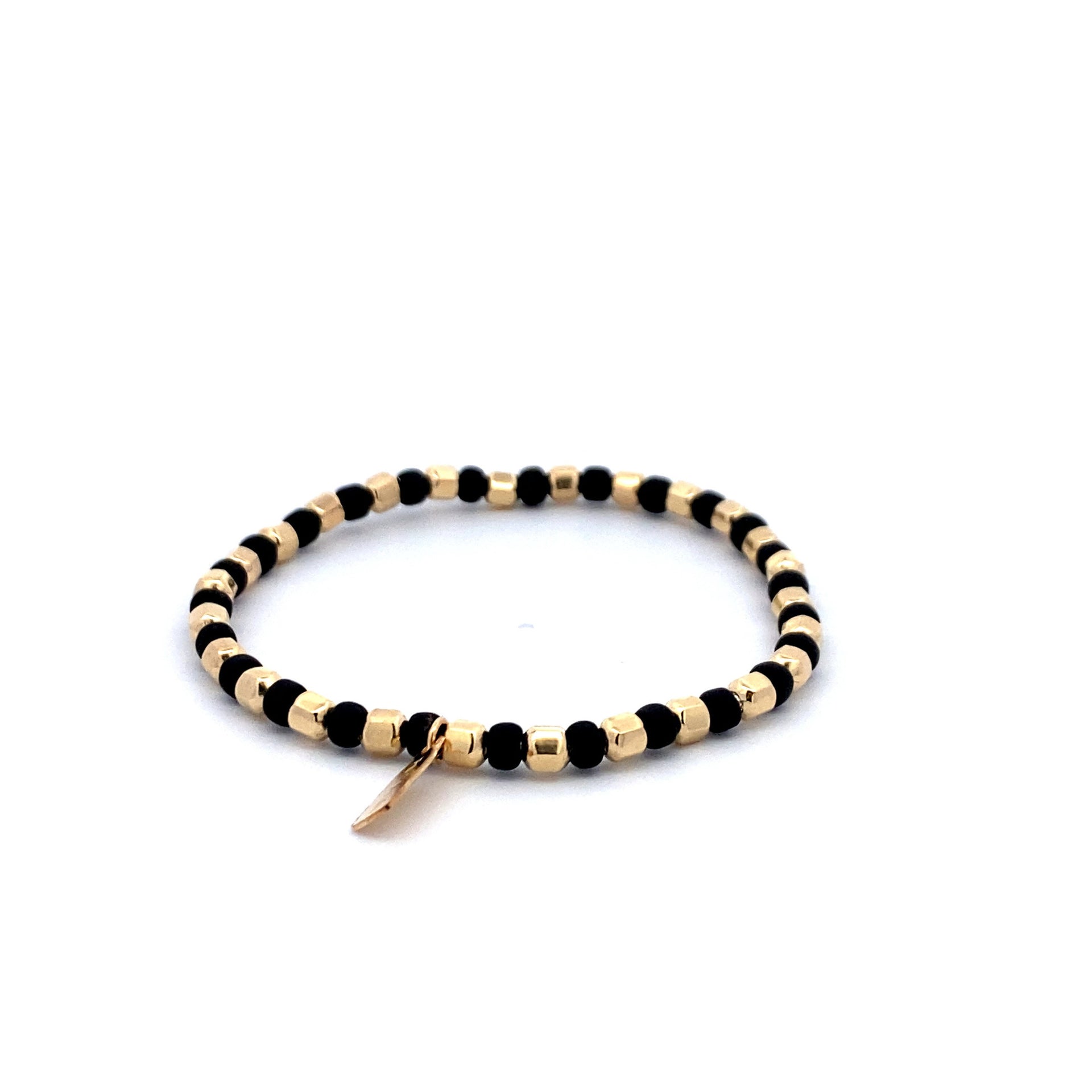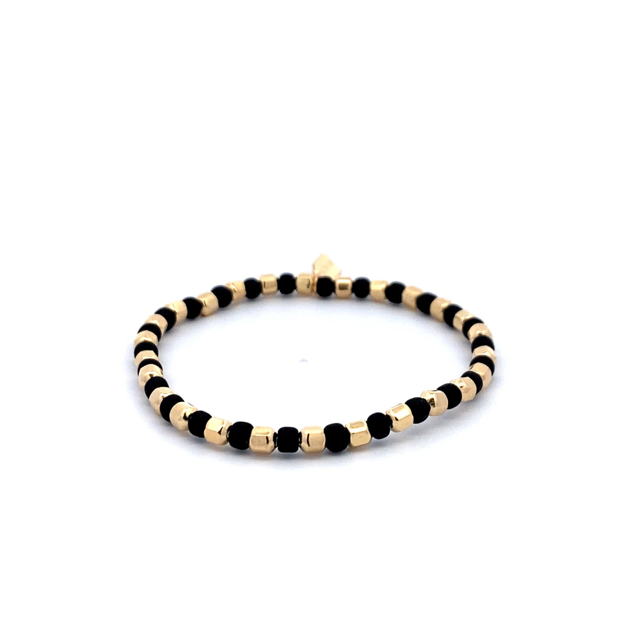 Elastisches Armband mit goldenen und schwarzen Sechseckkugeln.