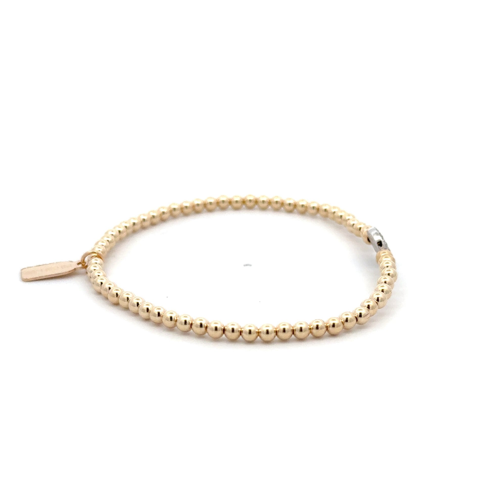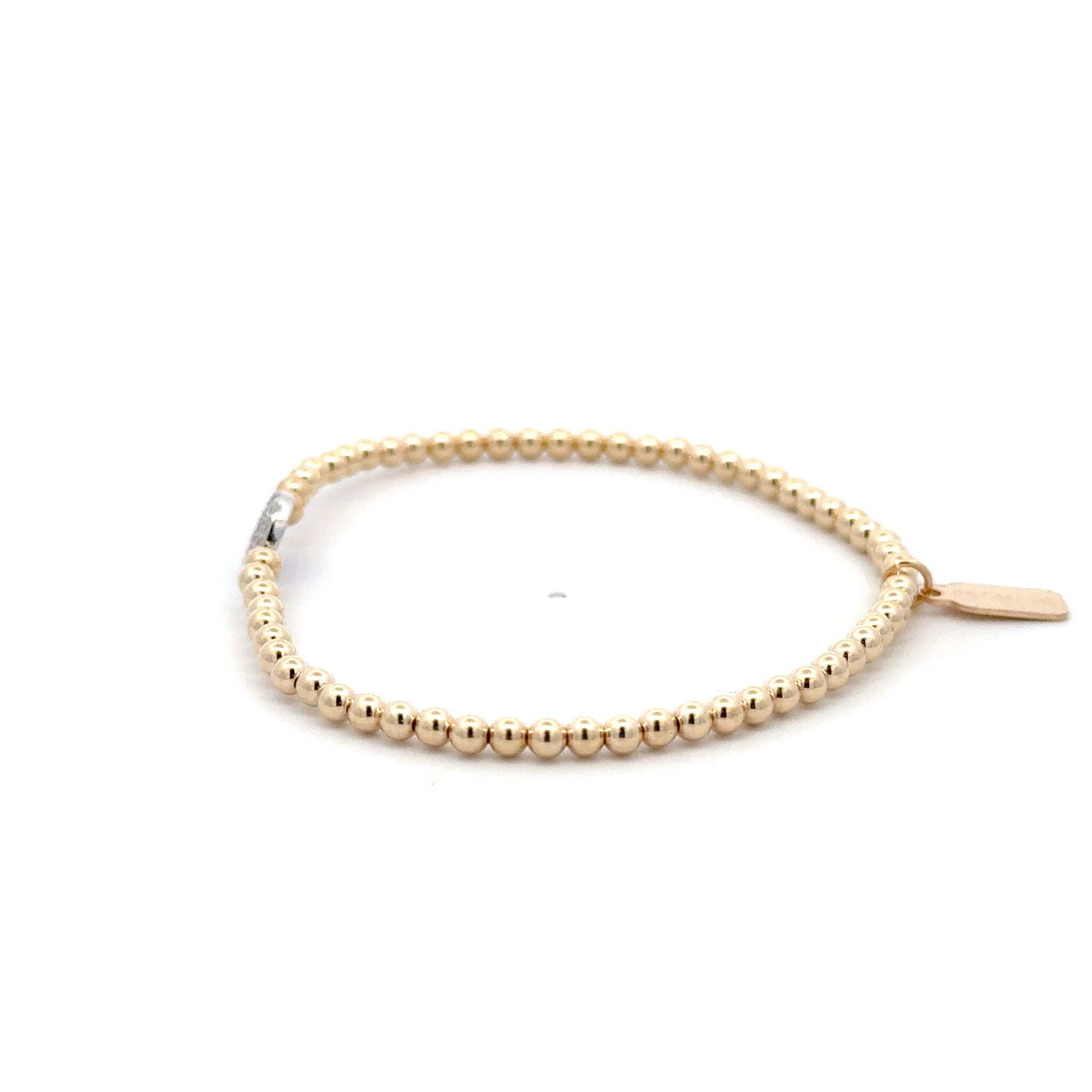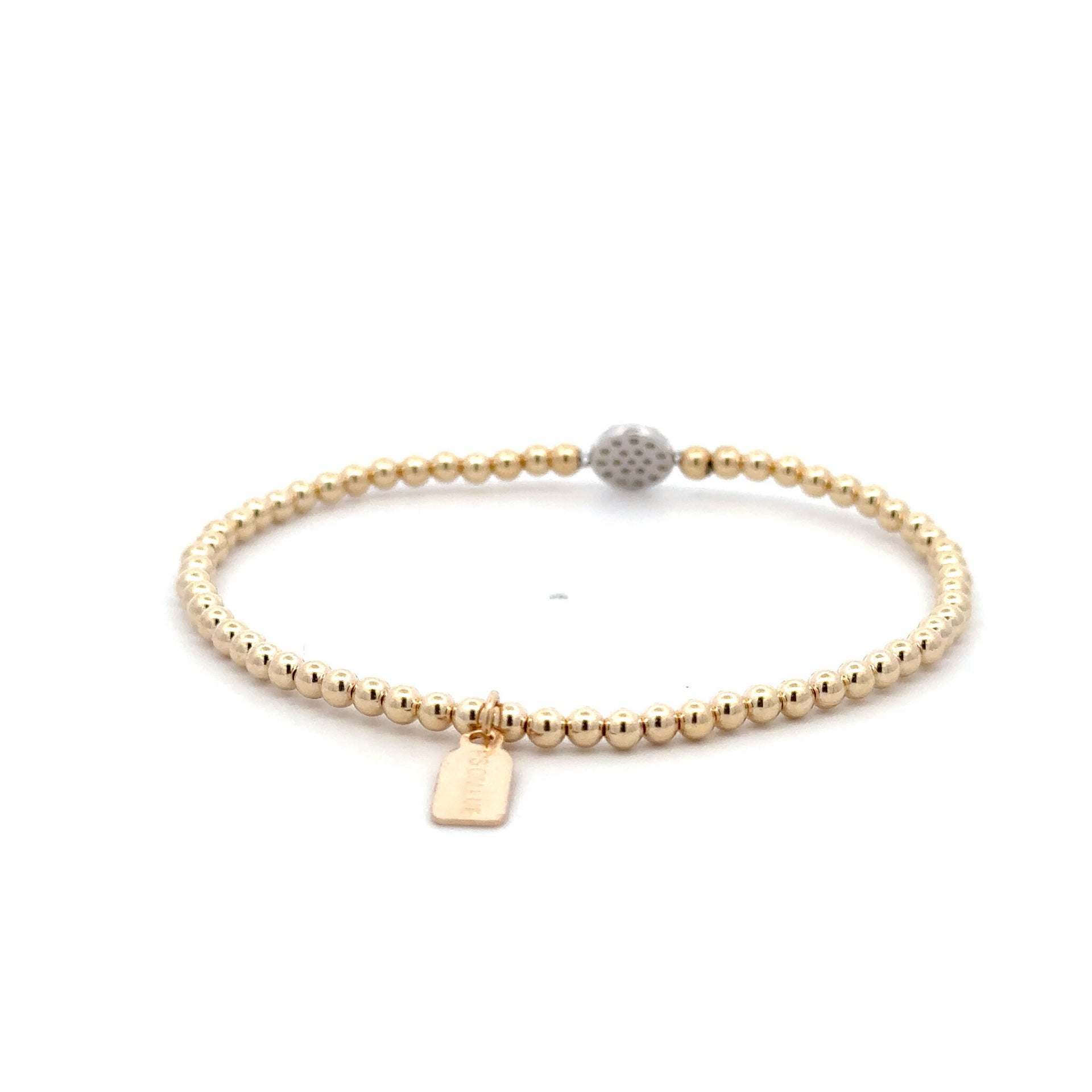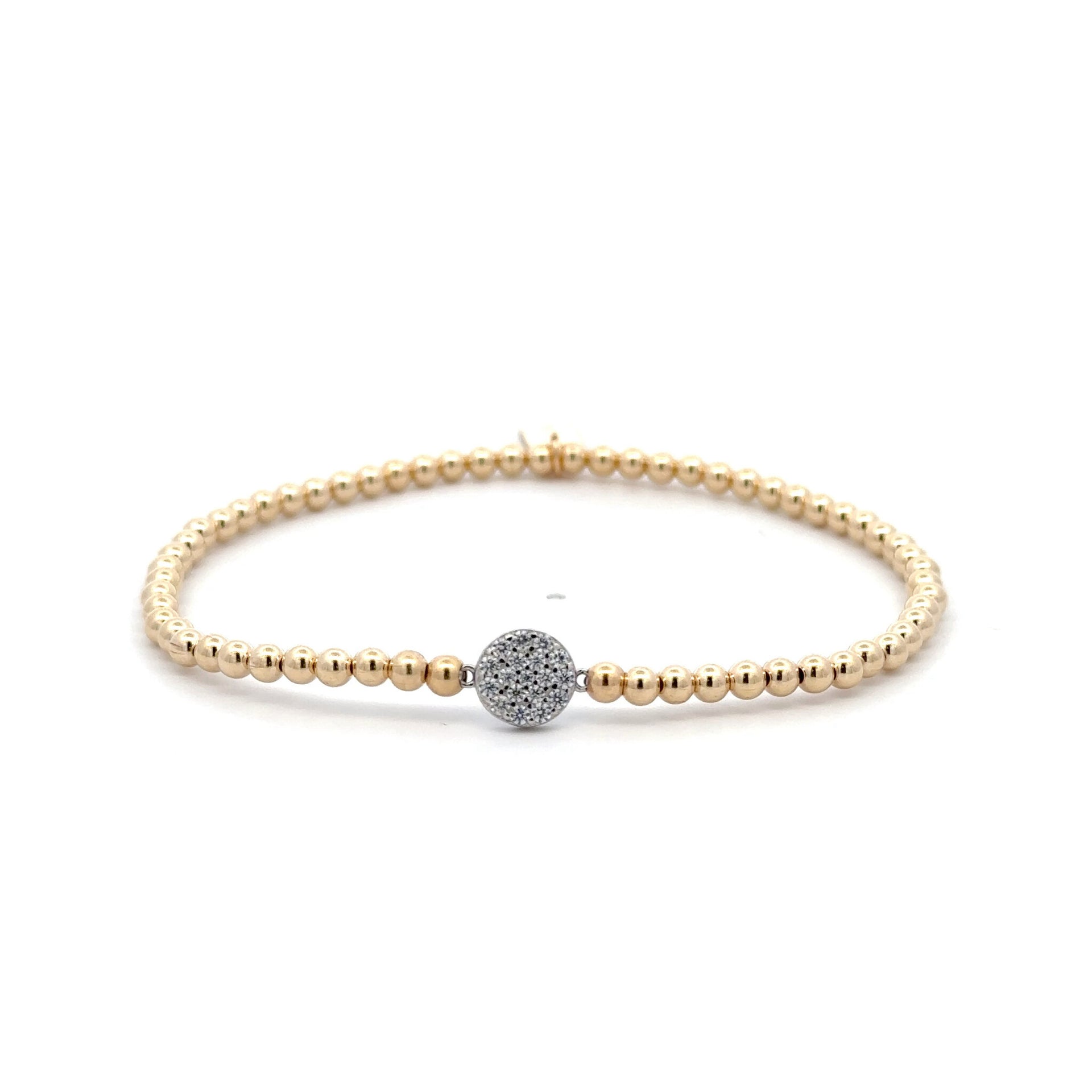 Elastisches Armband mit goldfarbenen Perlen und einem silbernen runden Charm mit Zirkoniasteinen