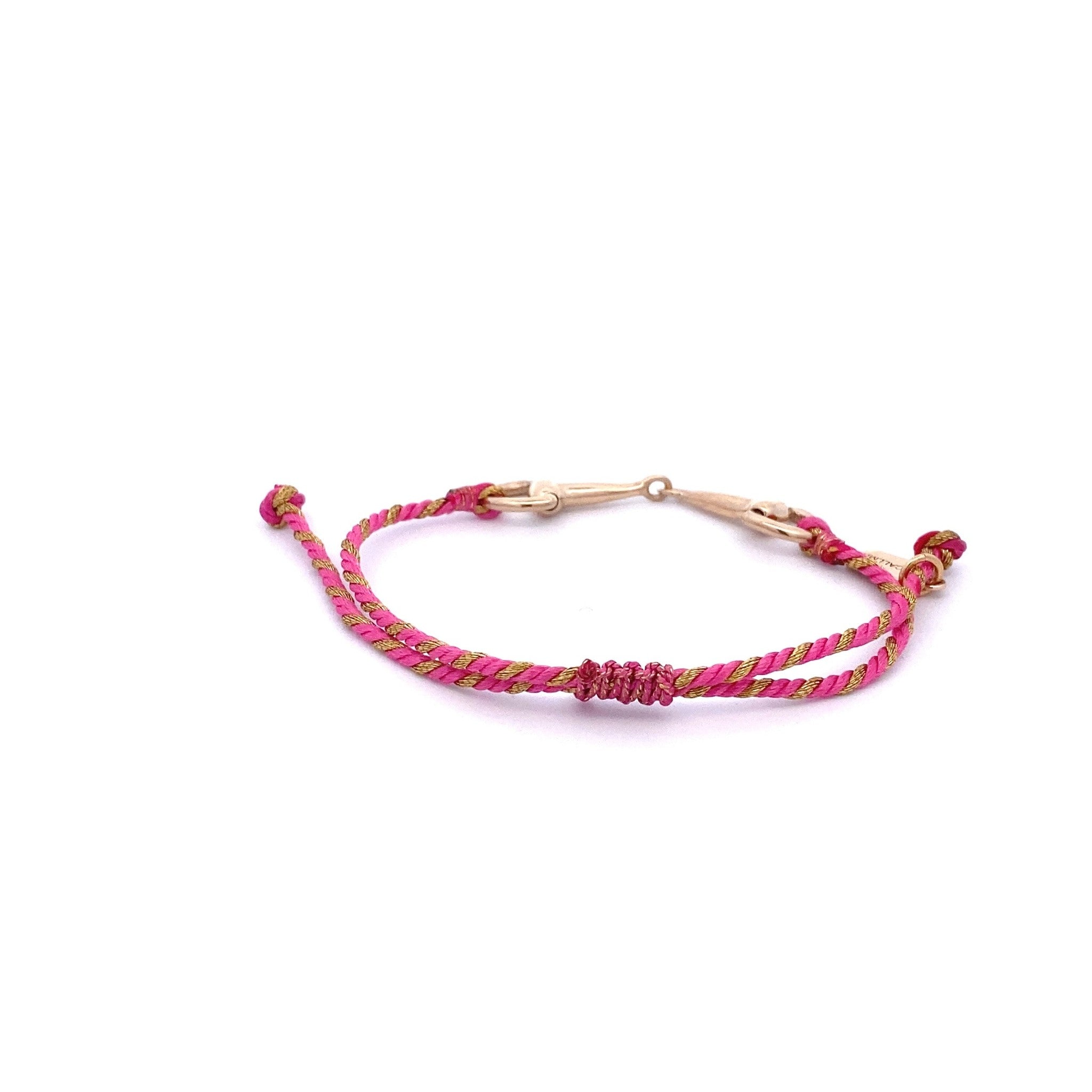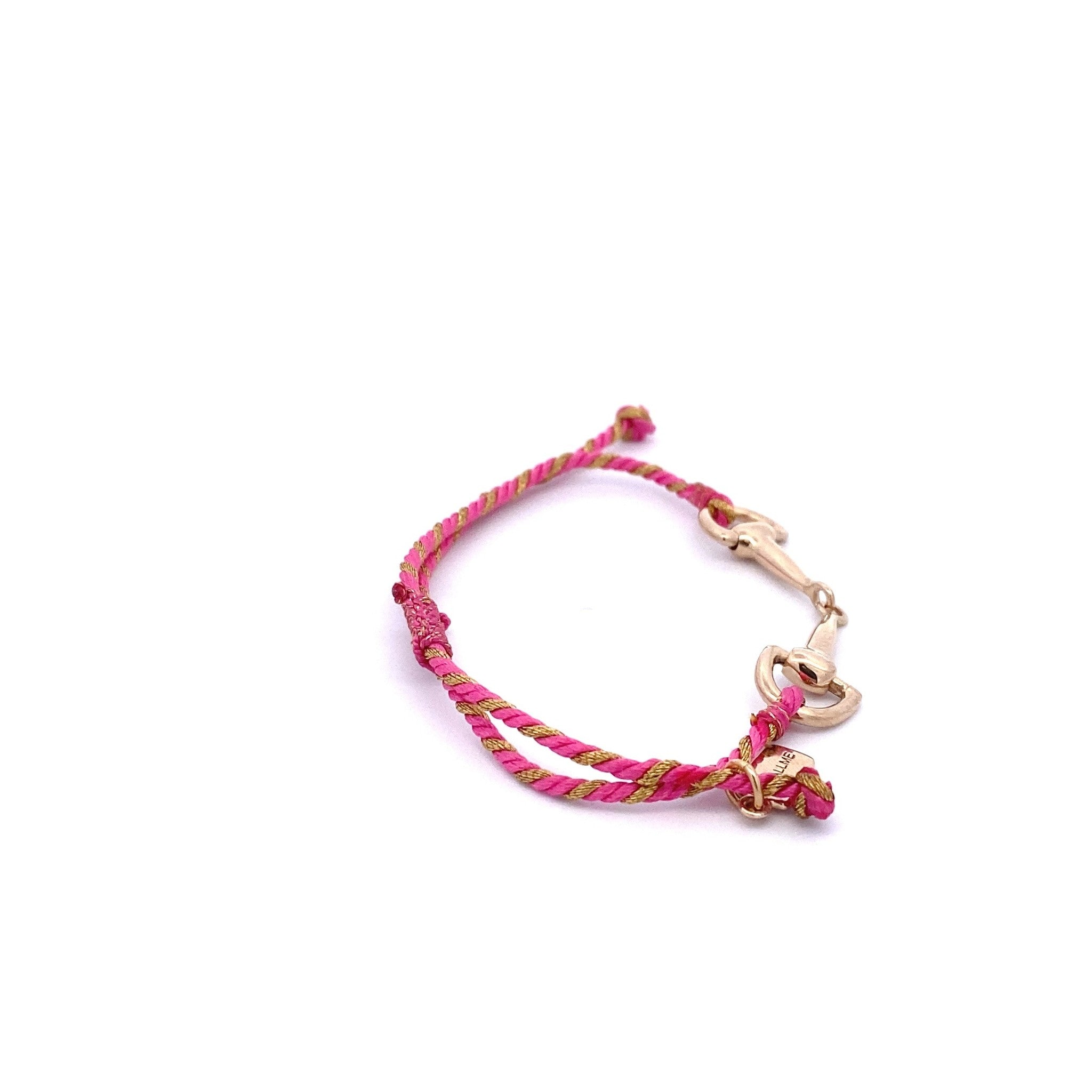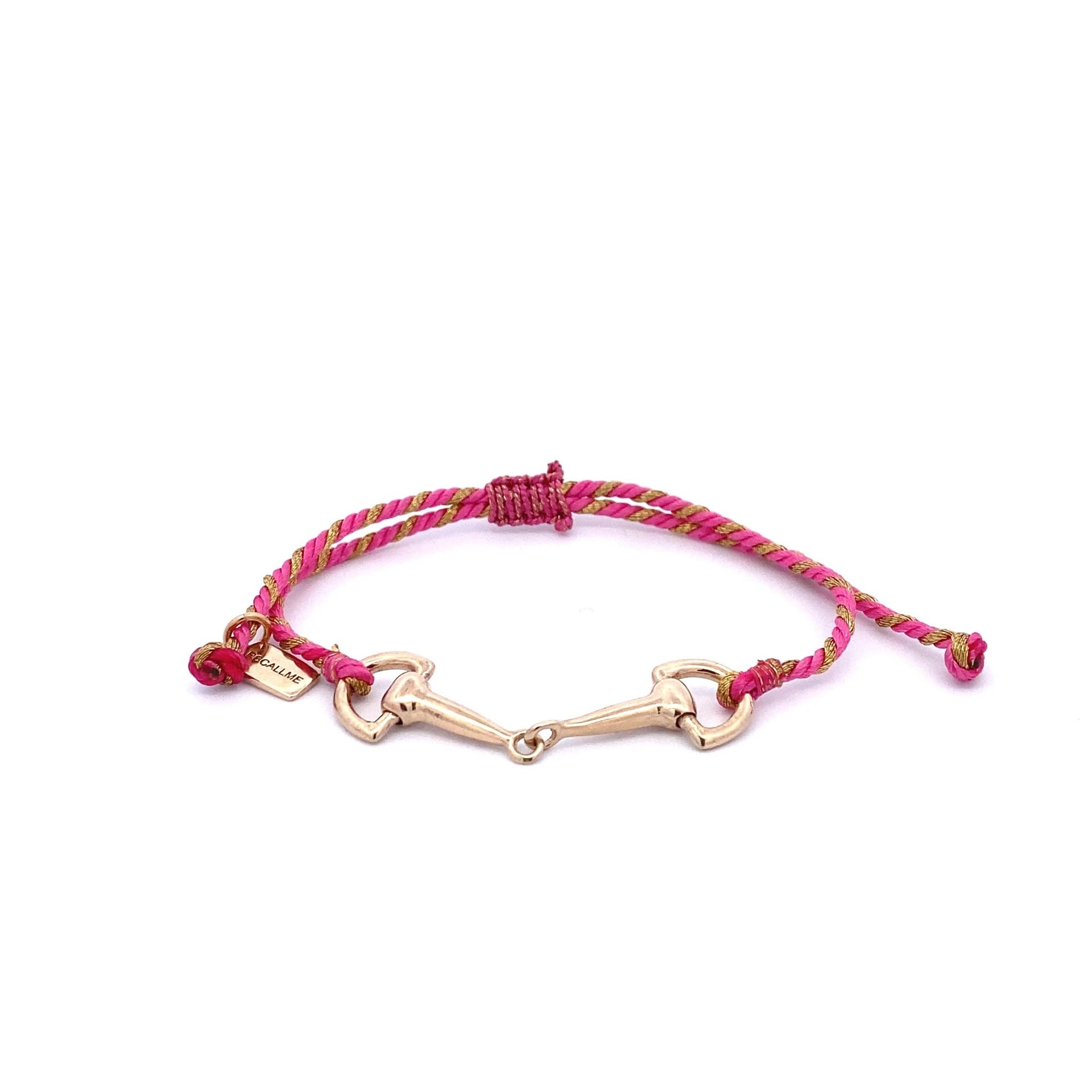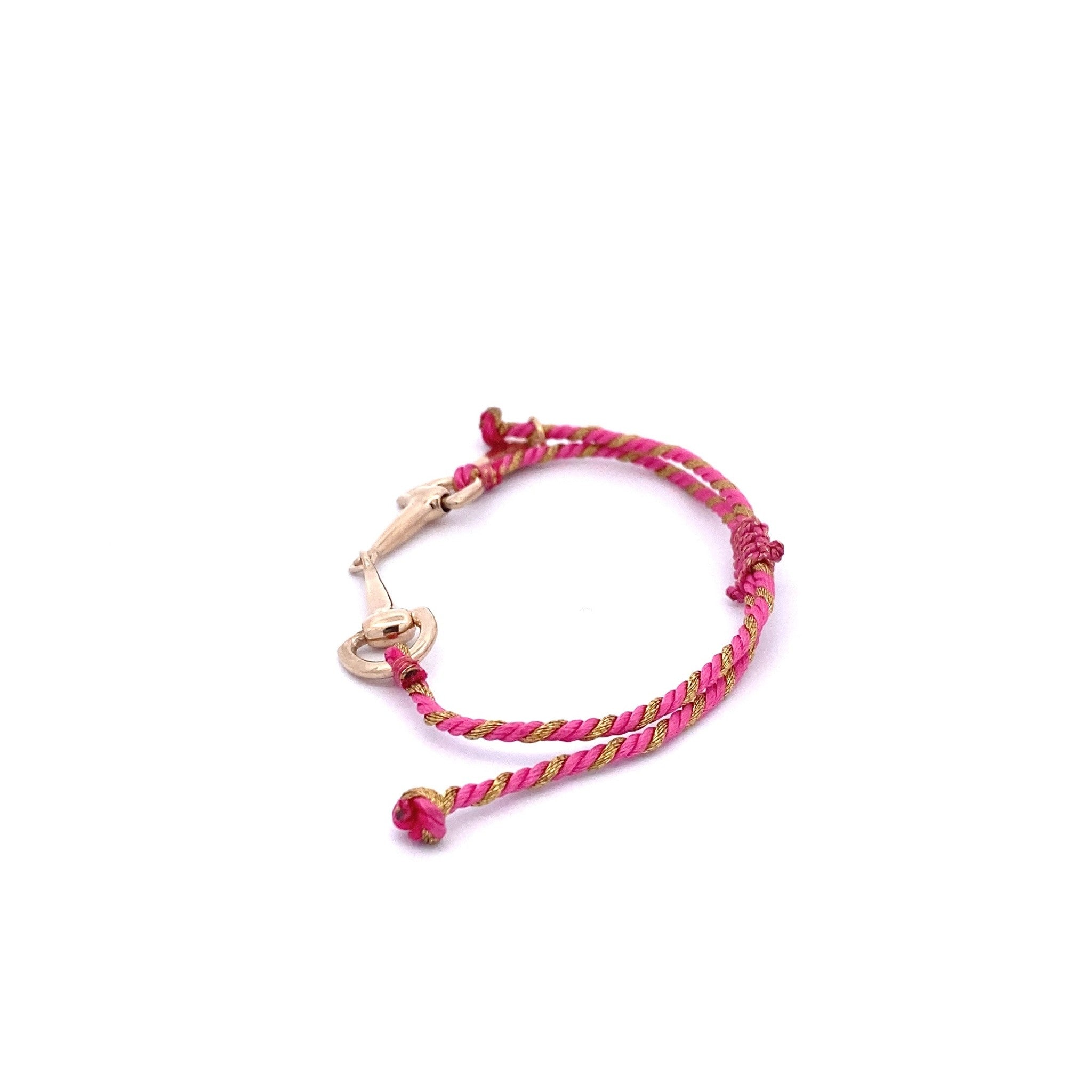 Armband aus farbiger Kordel mit einem goldfarbenen Trensenanhänger.