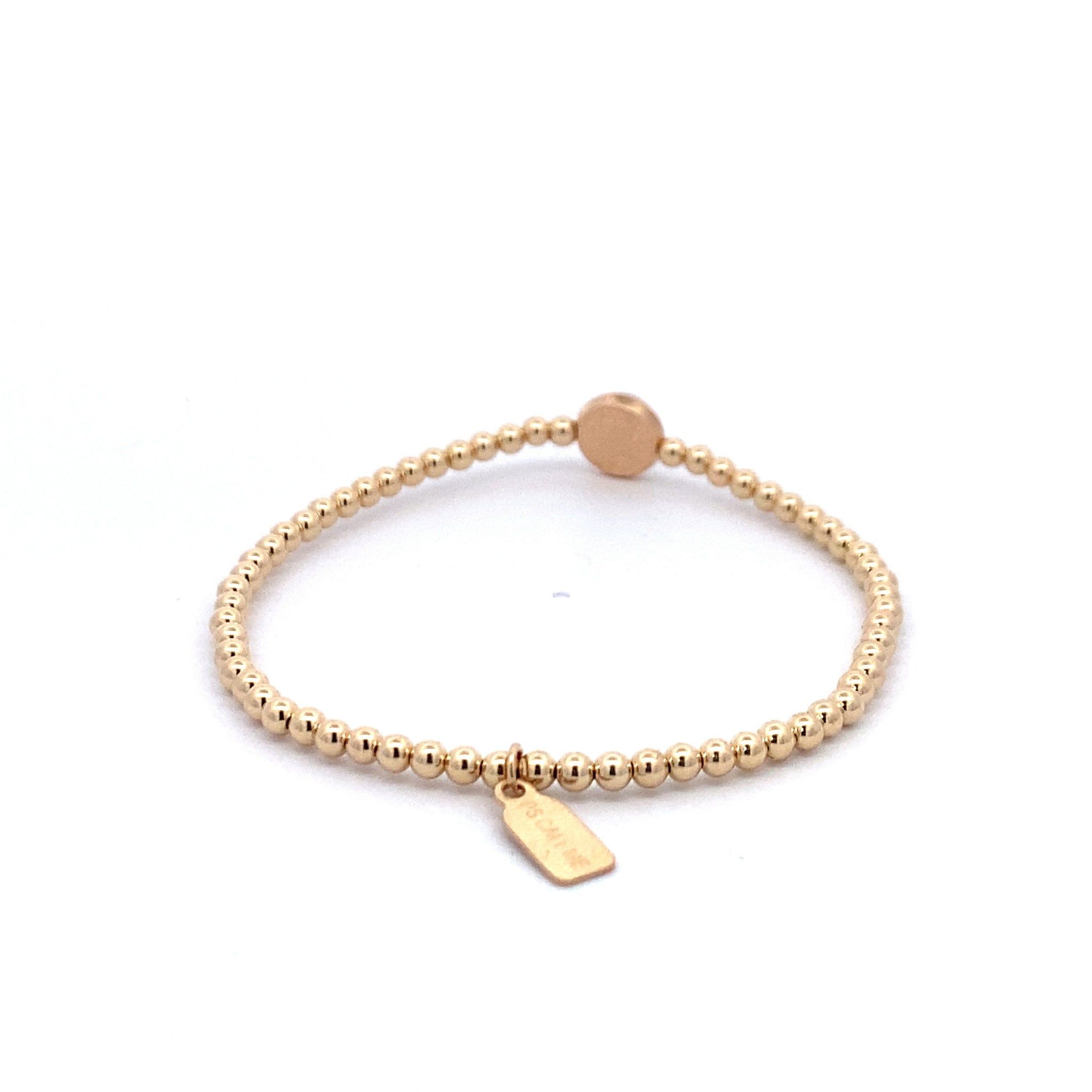 Elastisches Armband mit goldfarbenen Kugeln und einer Glücksmünze.