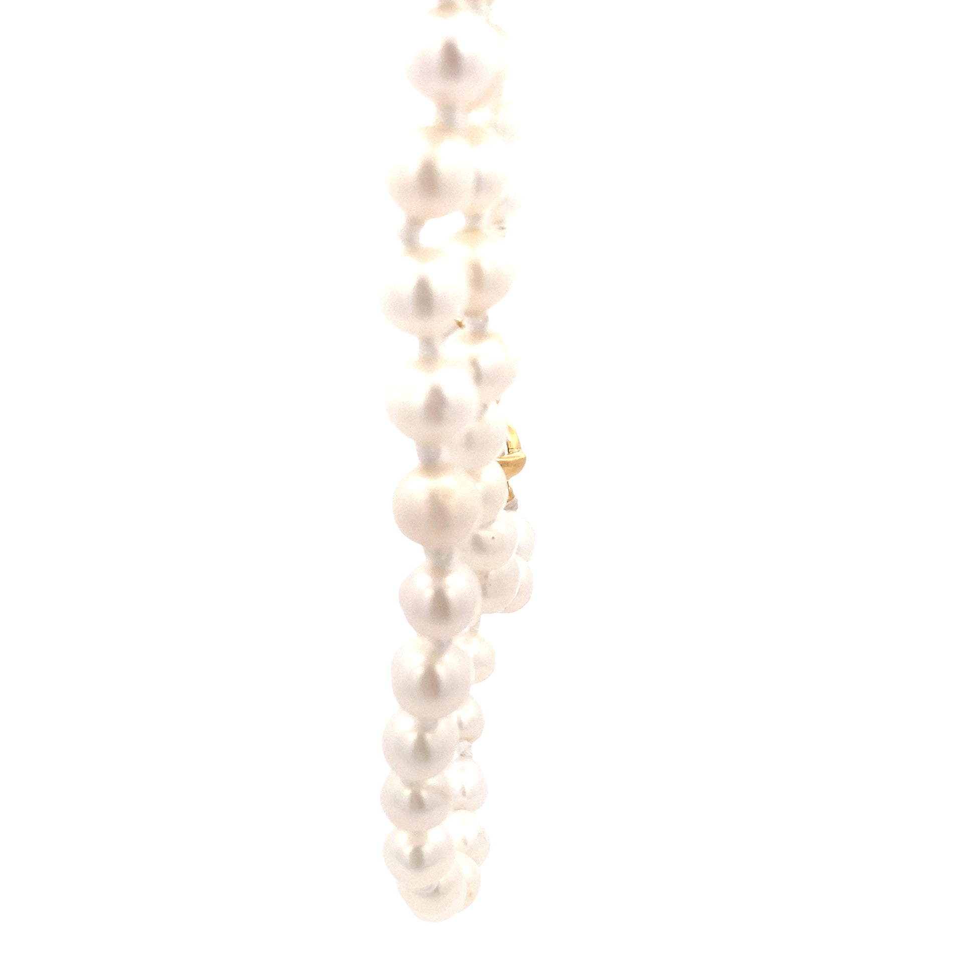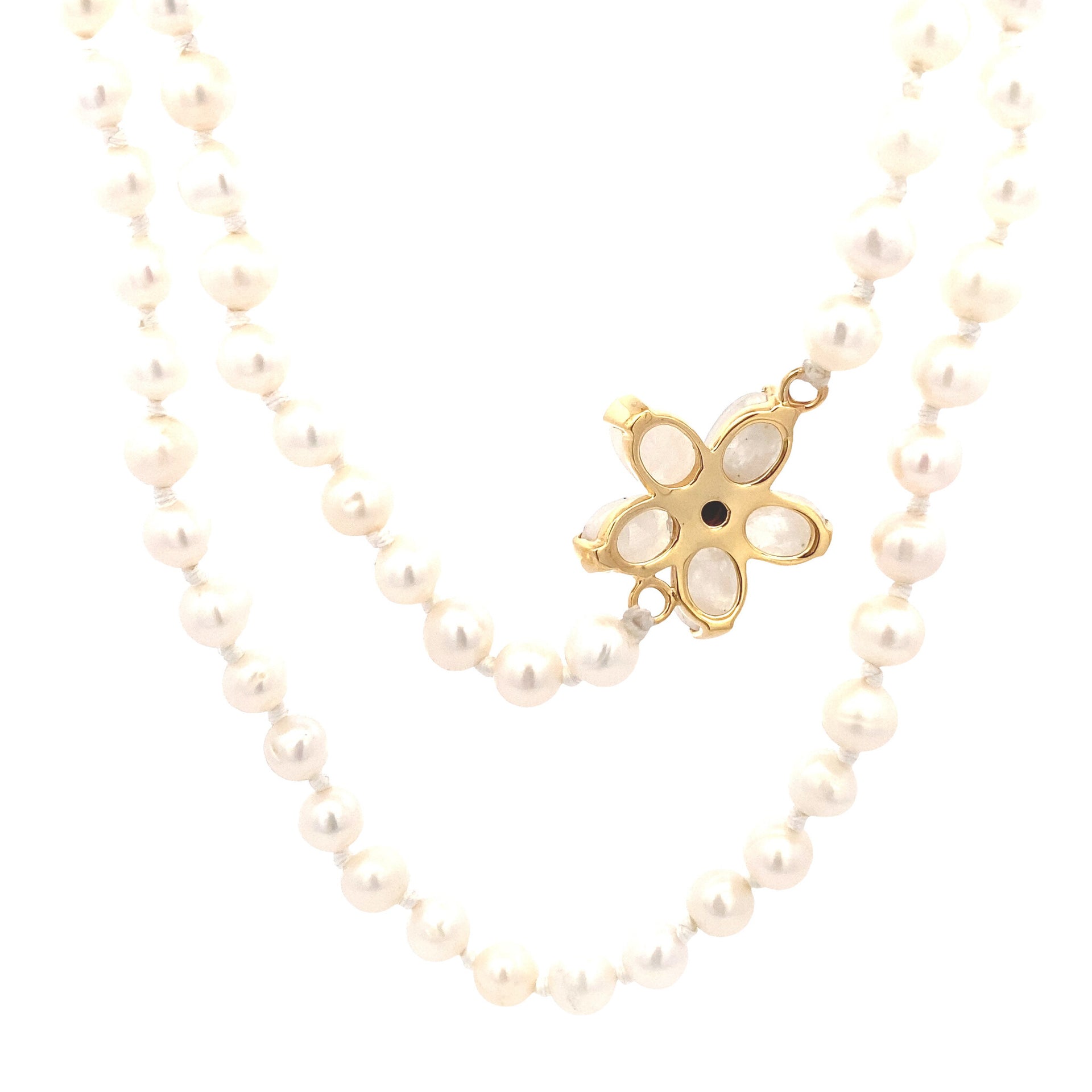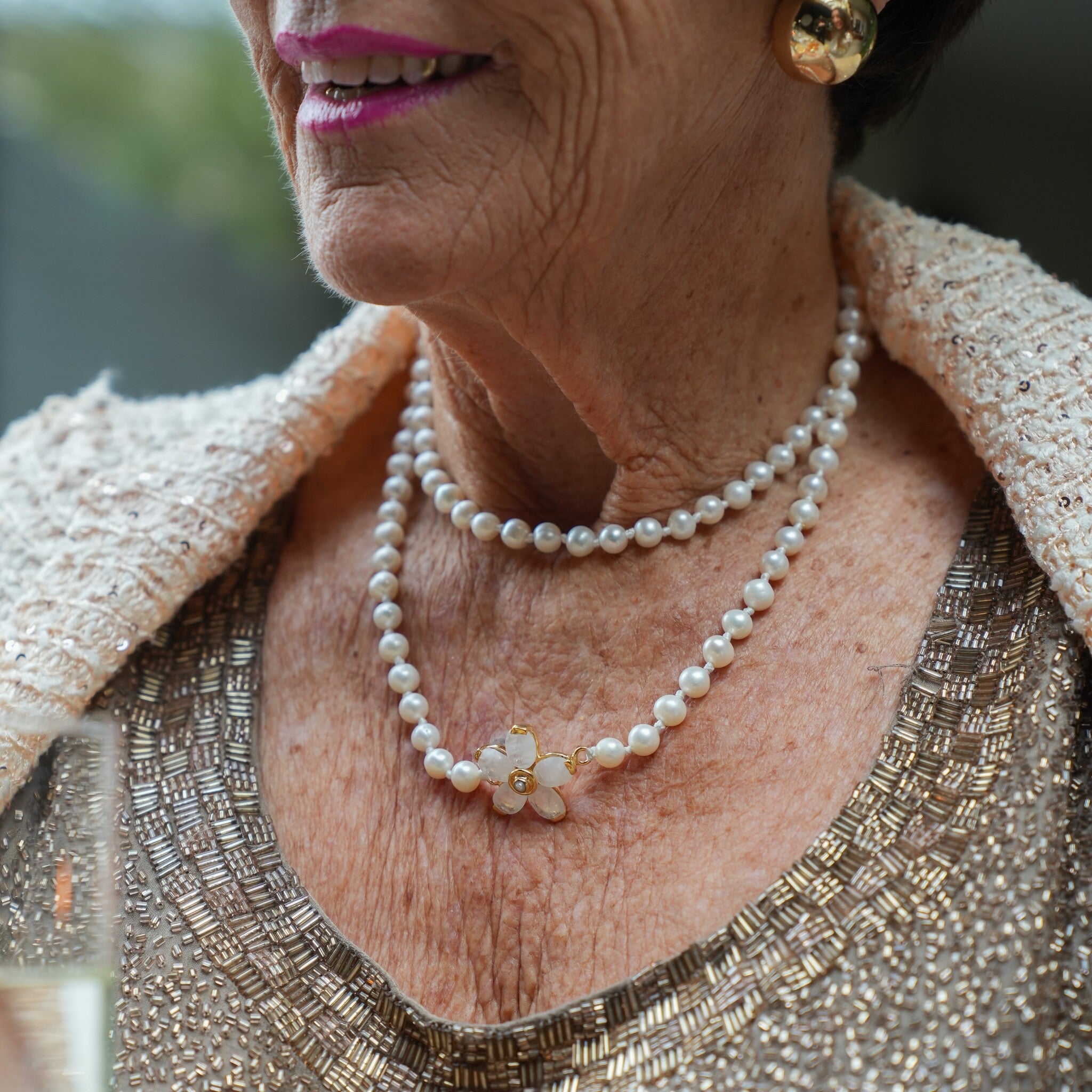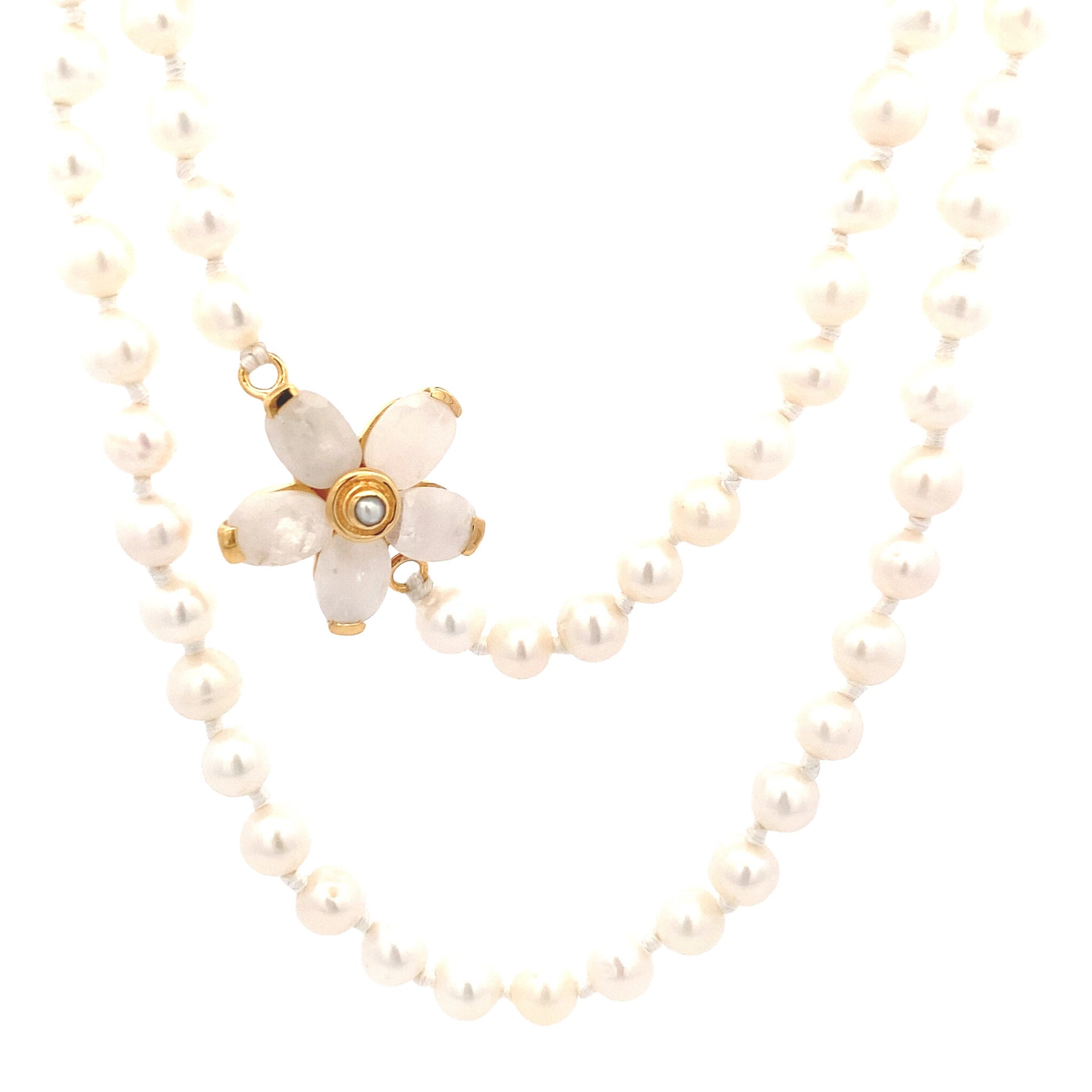 Halskette aus Süßwasserperlen und einem einzelnen blumenförmigen Anhänger. Sie können diese Halskette lang oder kurz tragen, indem Sie sie zweimal um den Hals wickeln.