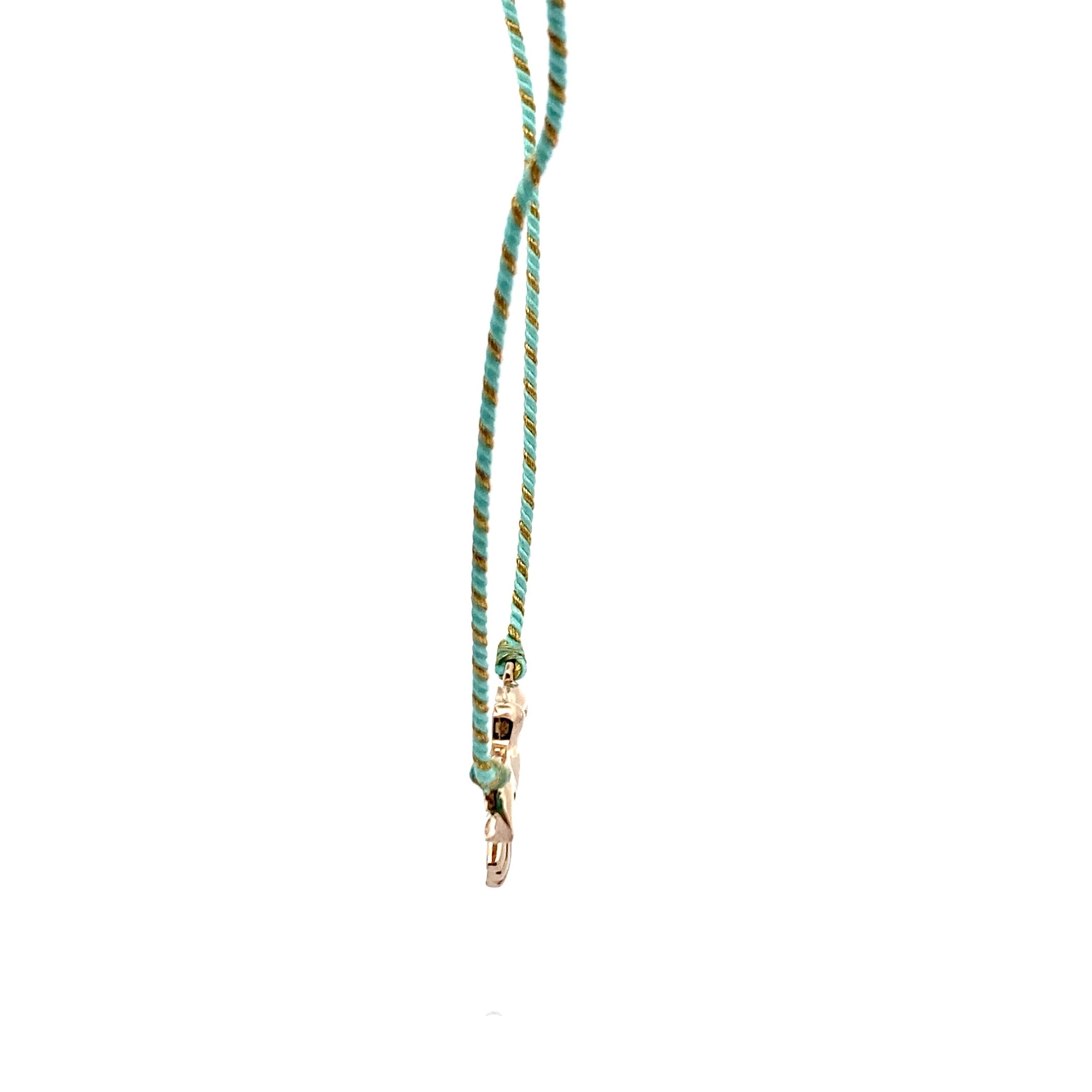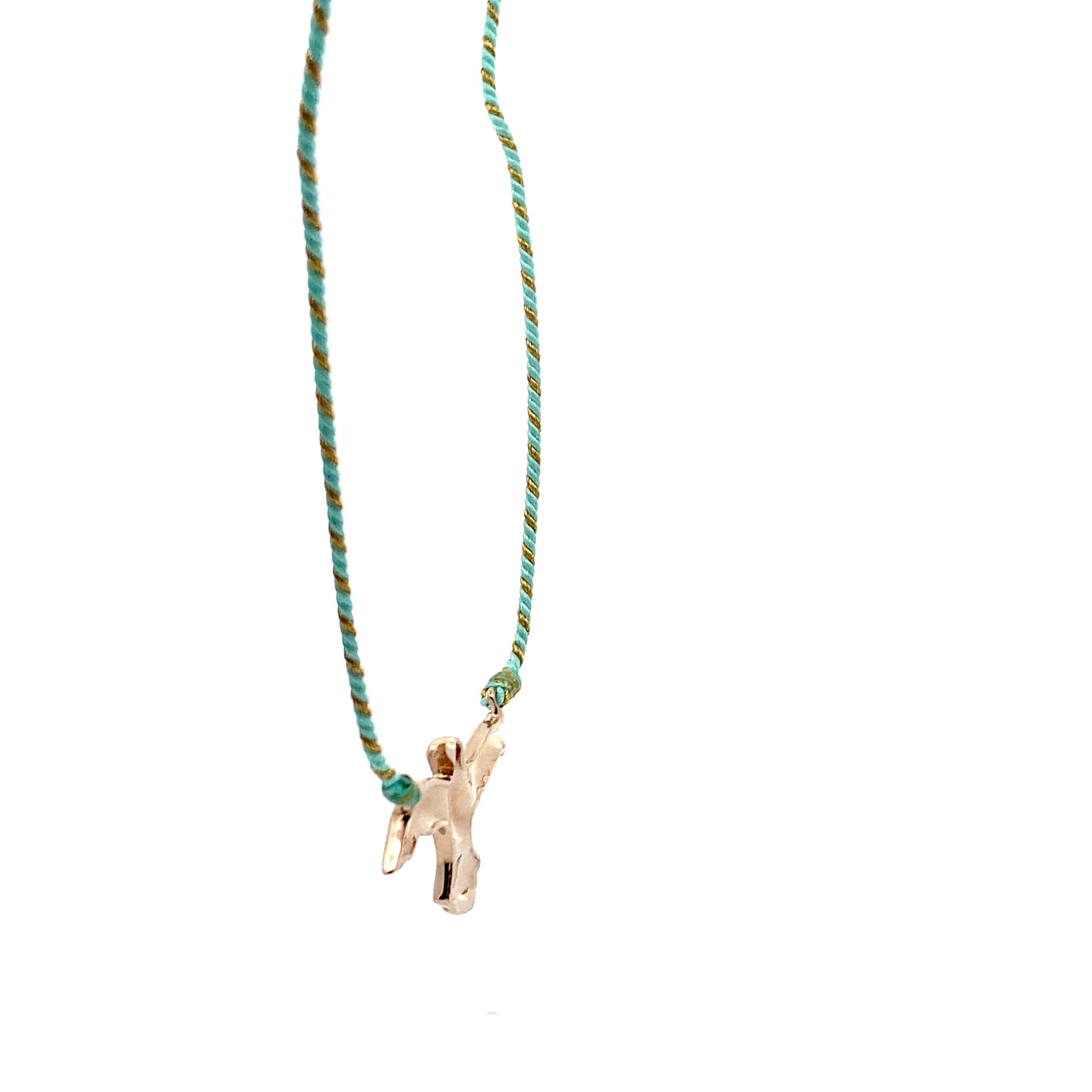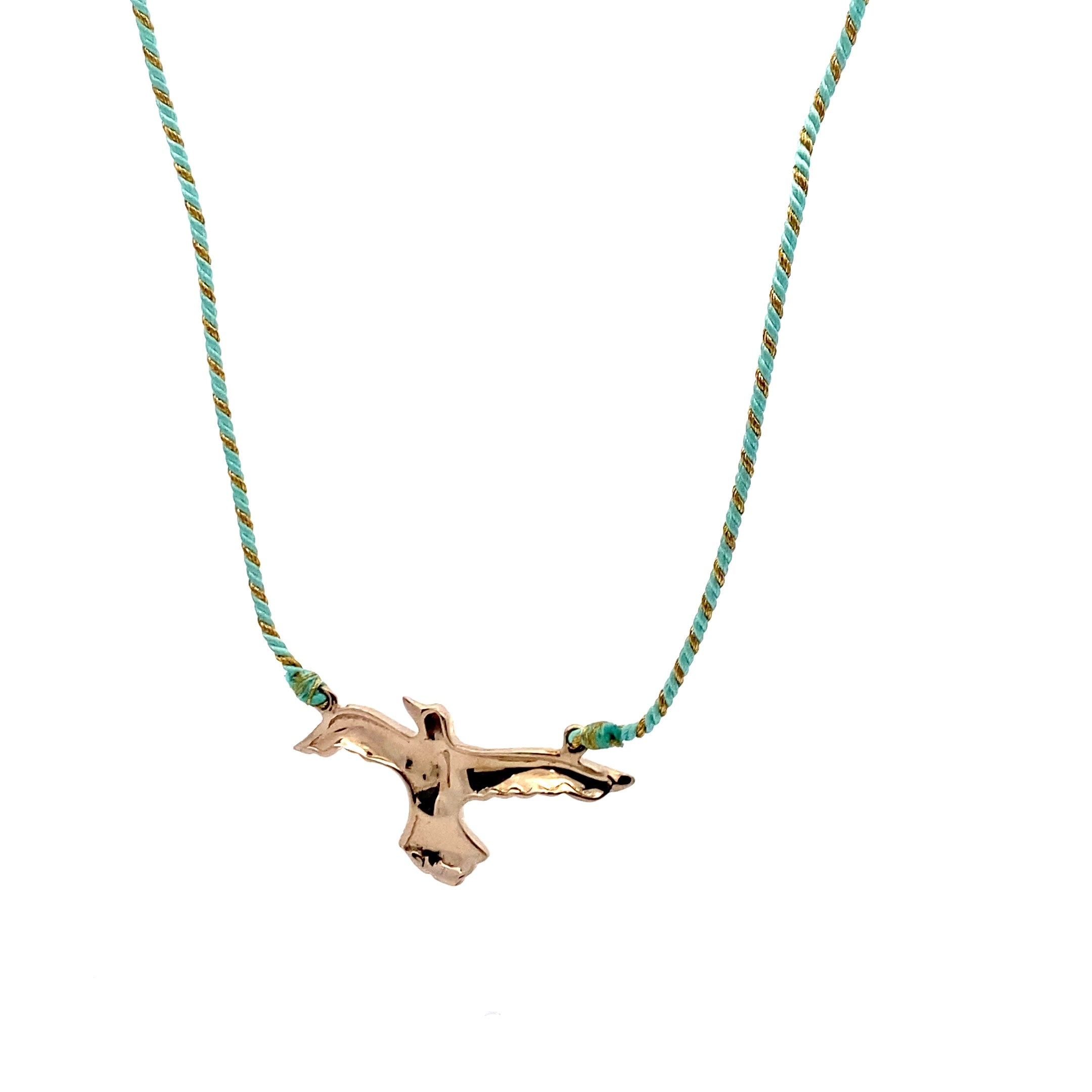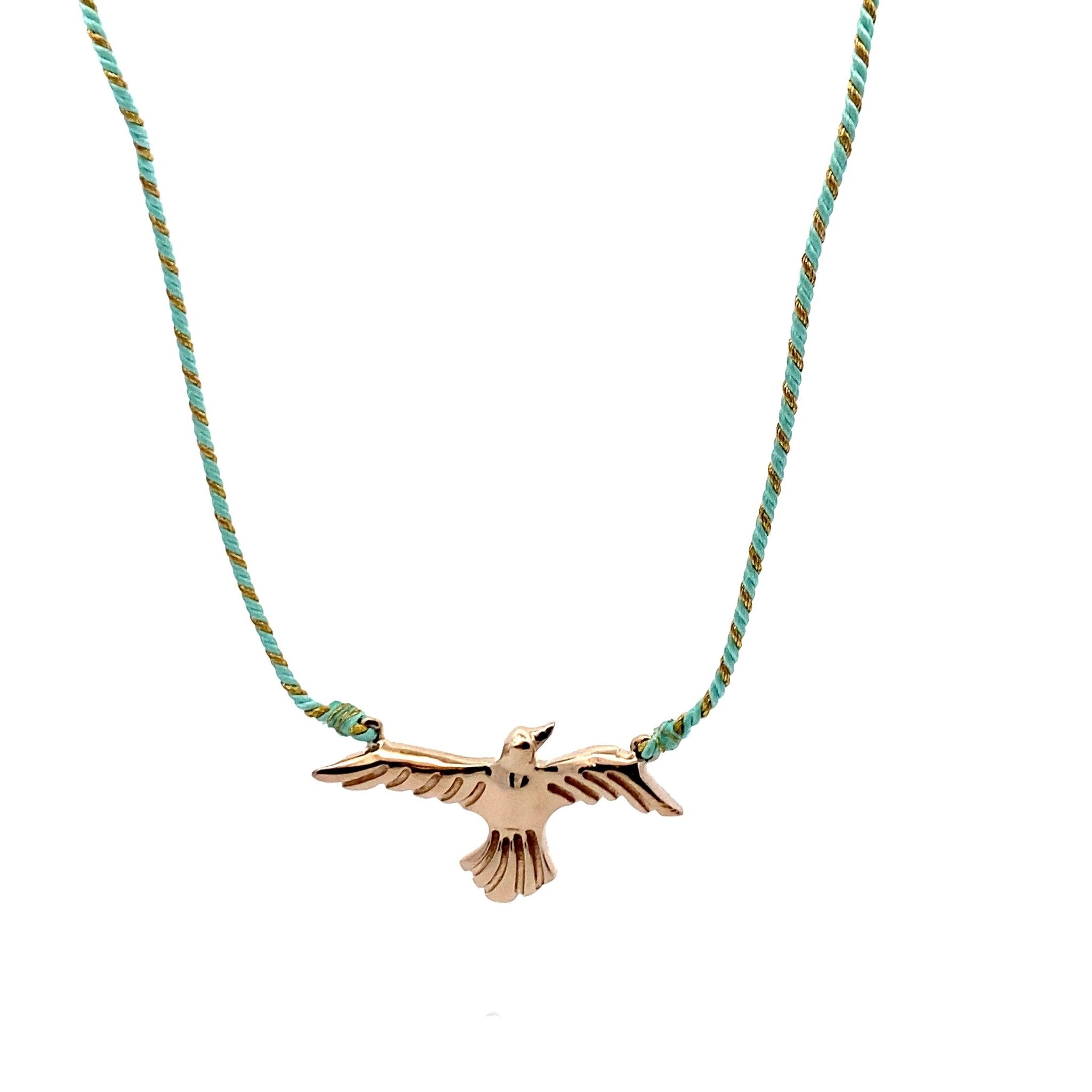 Halskette mit farbiger Kordel und einem goldfarbenen Anhänger in Vogelform