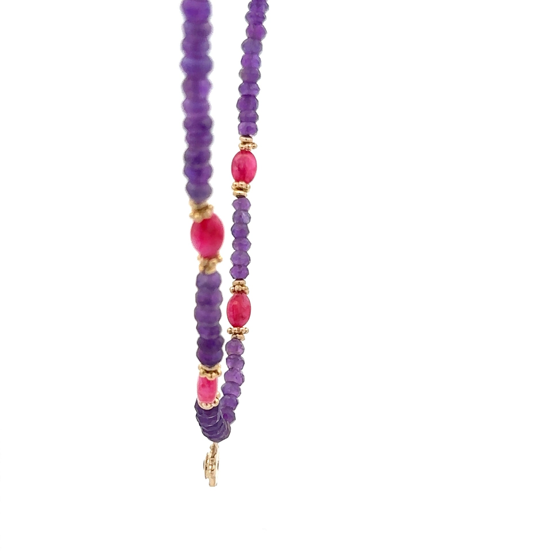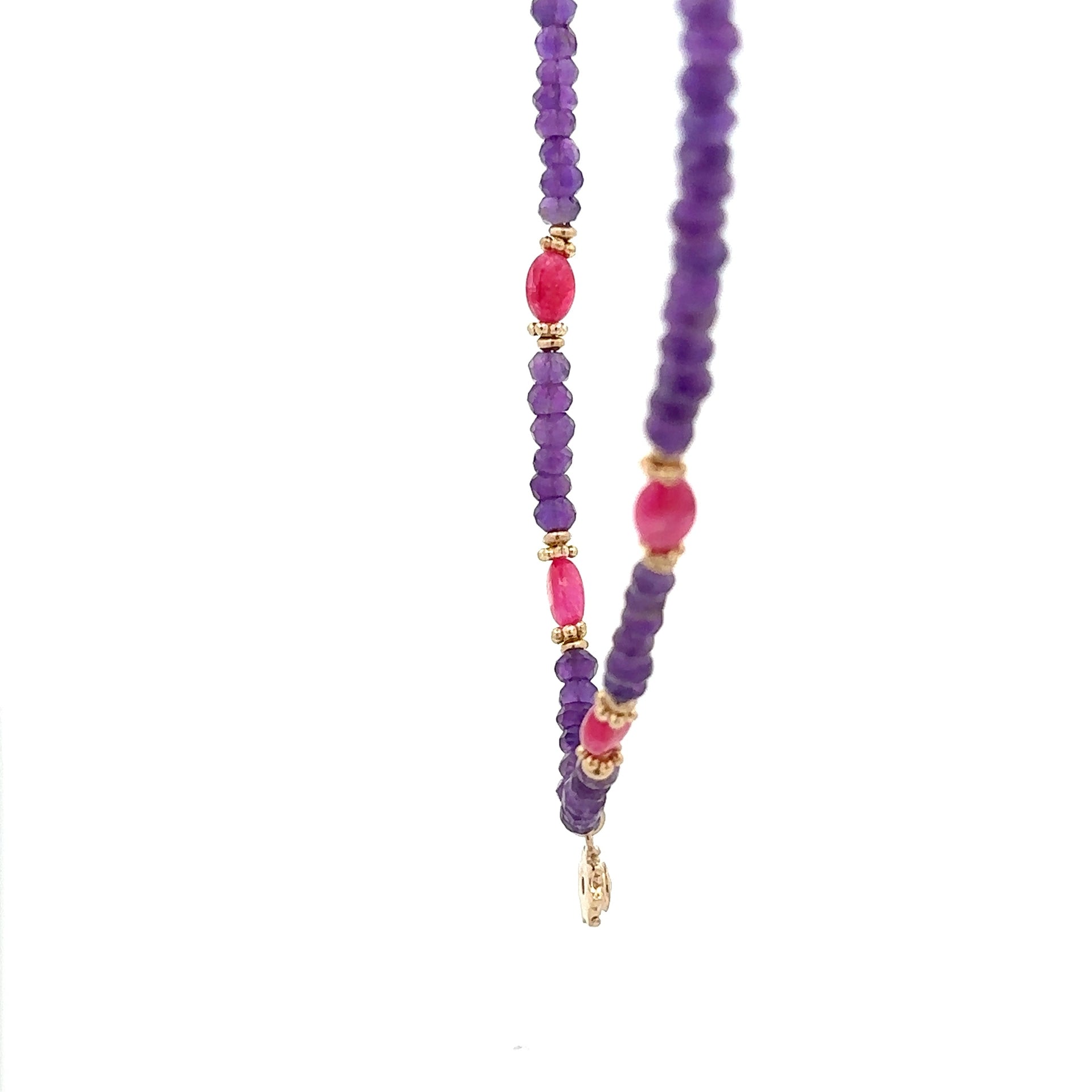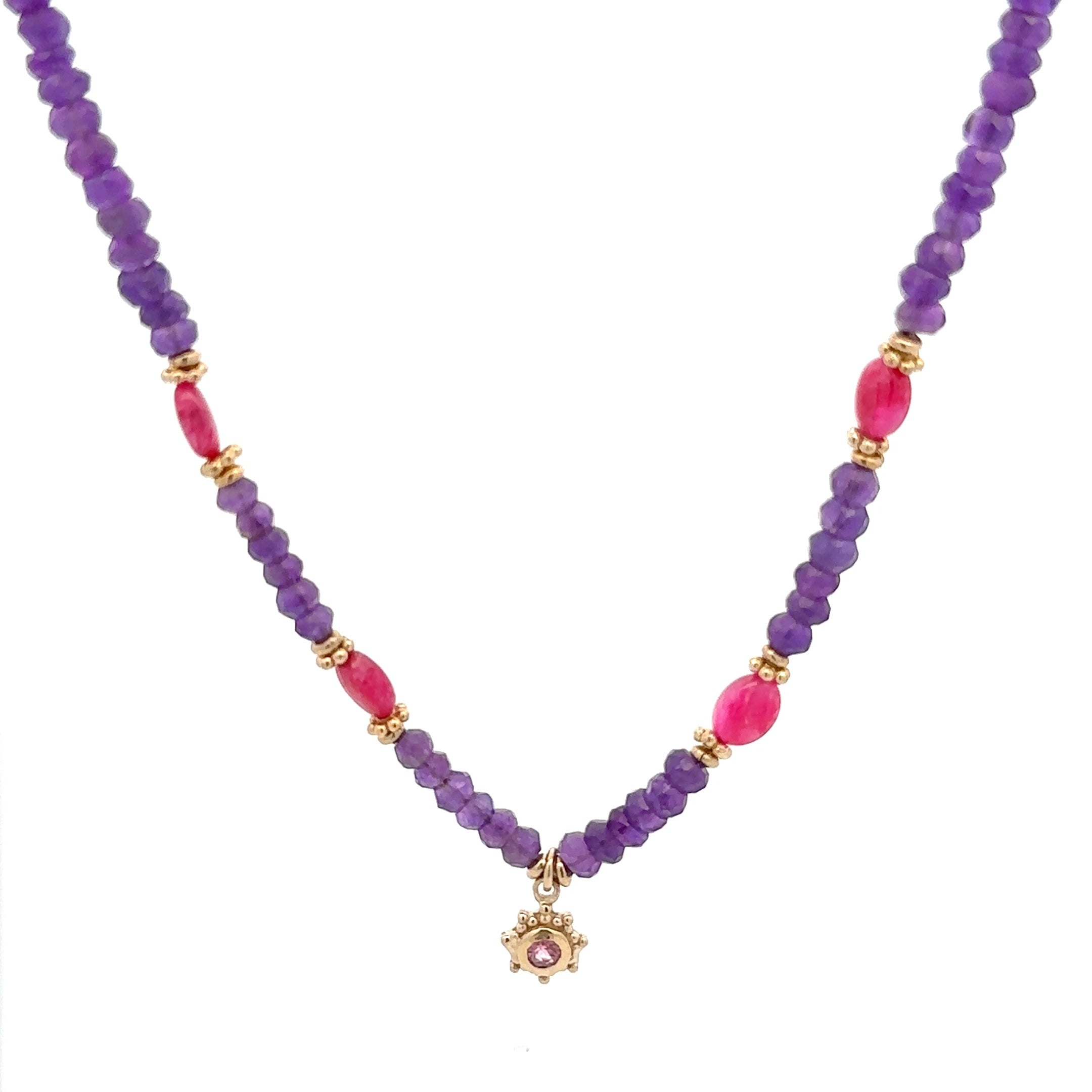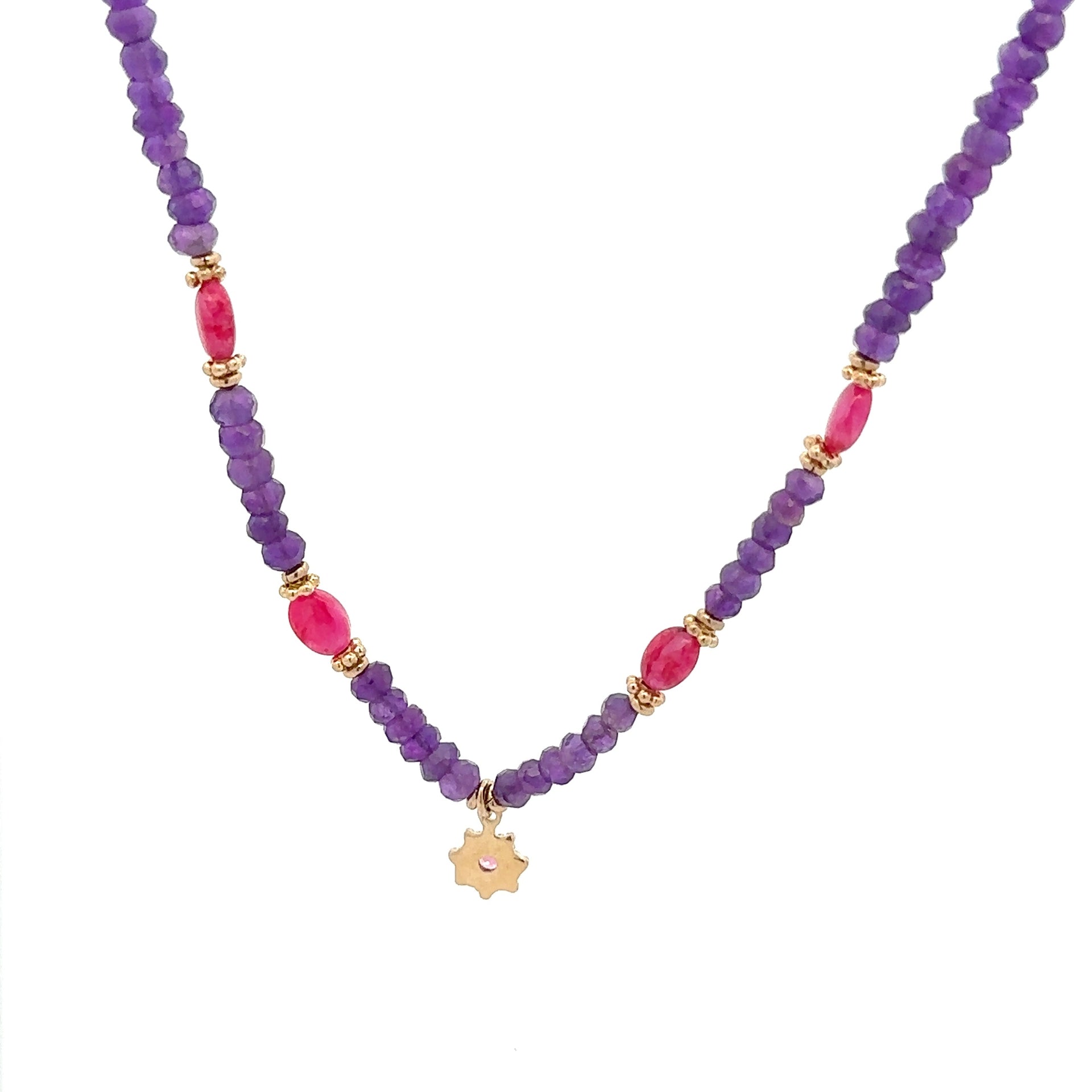 Halskette mit farbigen Steinen und einem baumelnden Anhänger.
