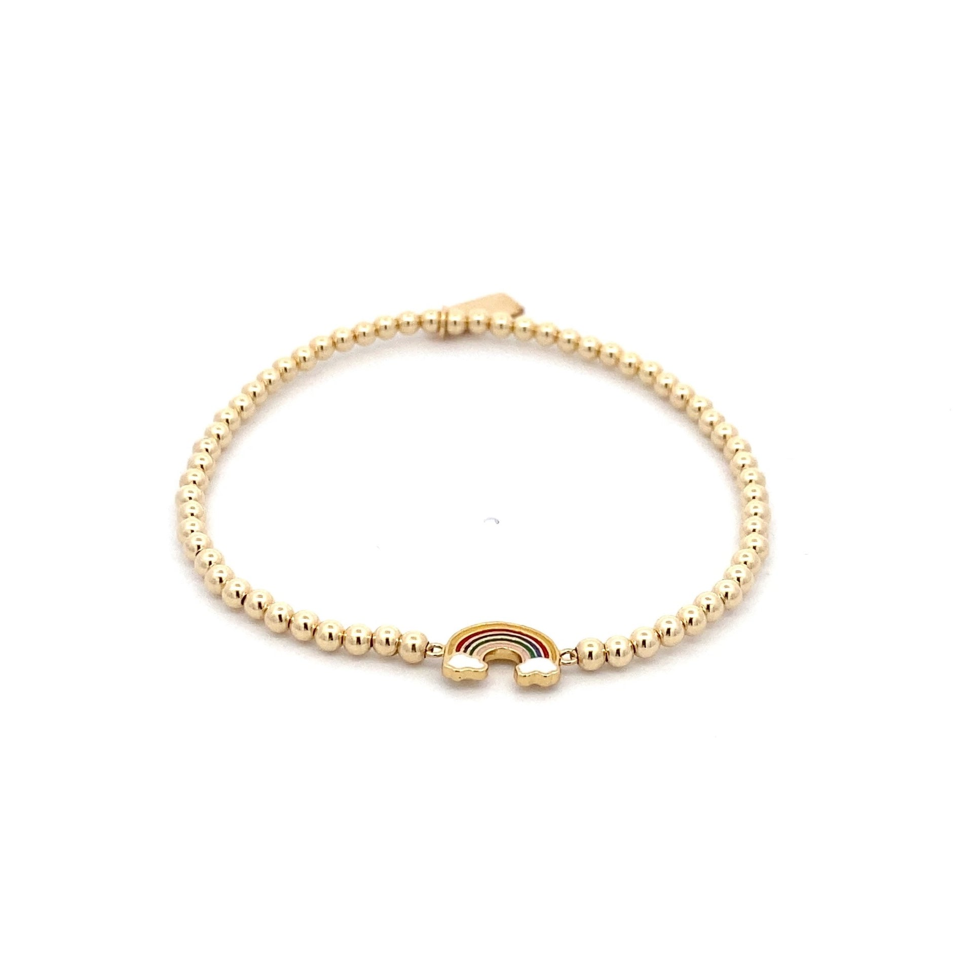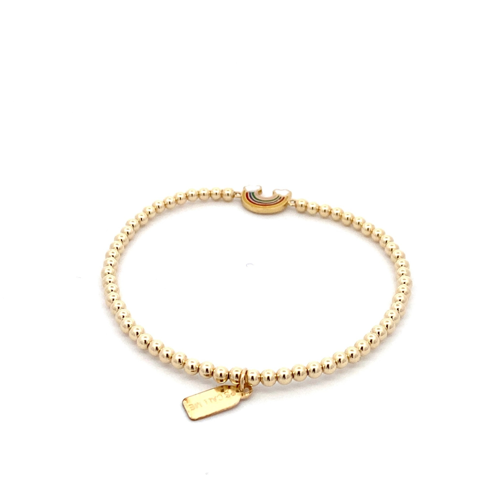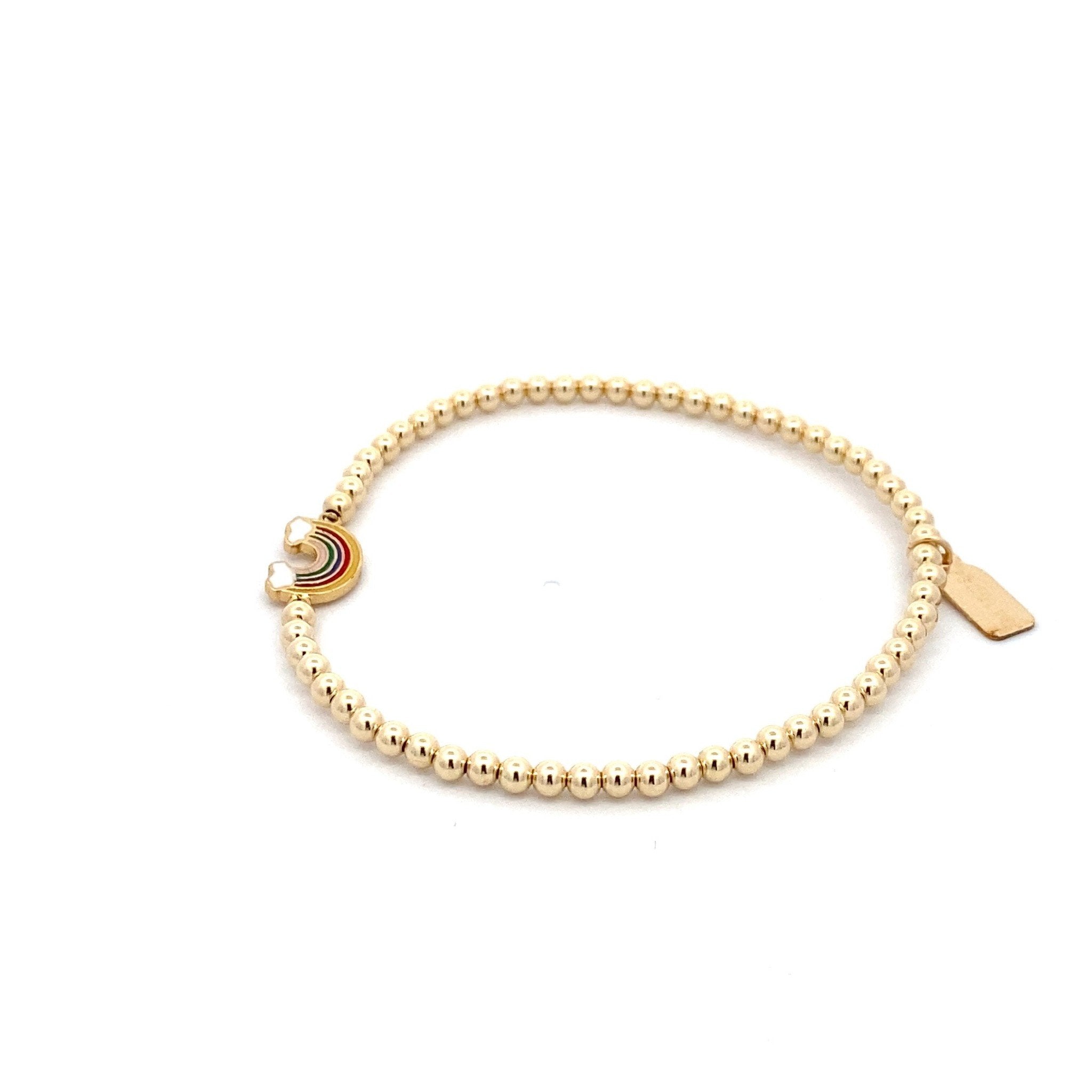 Elastisches Armband mit goldfarbenen Kugeln und einem Regenbogenanhänger.