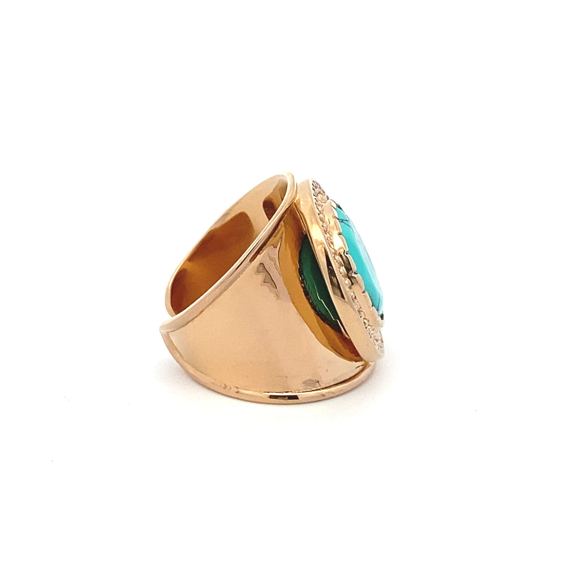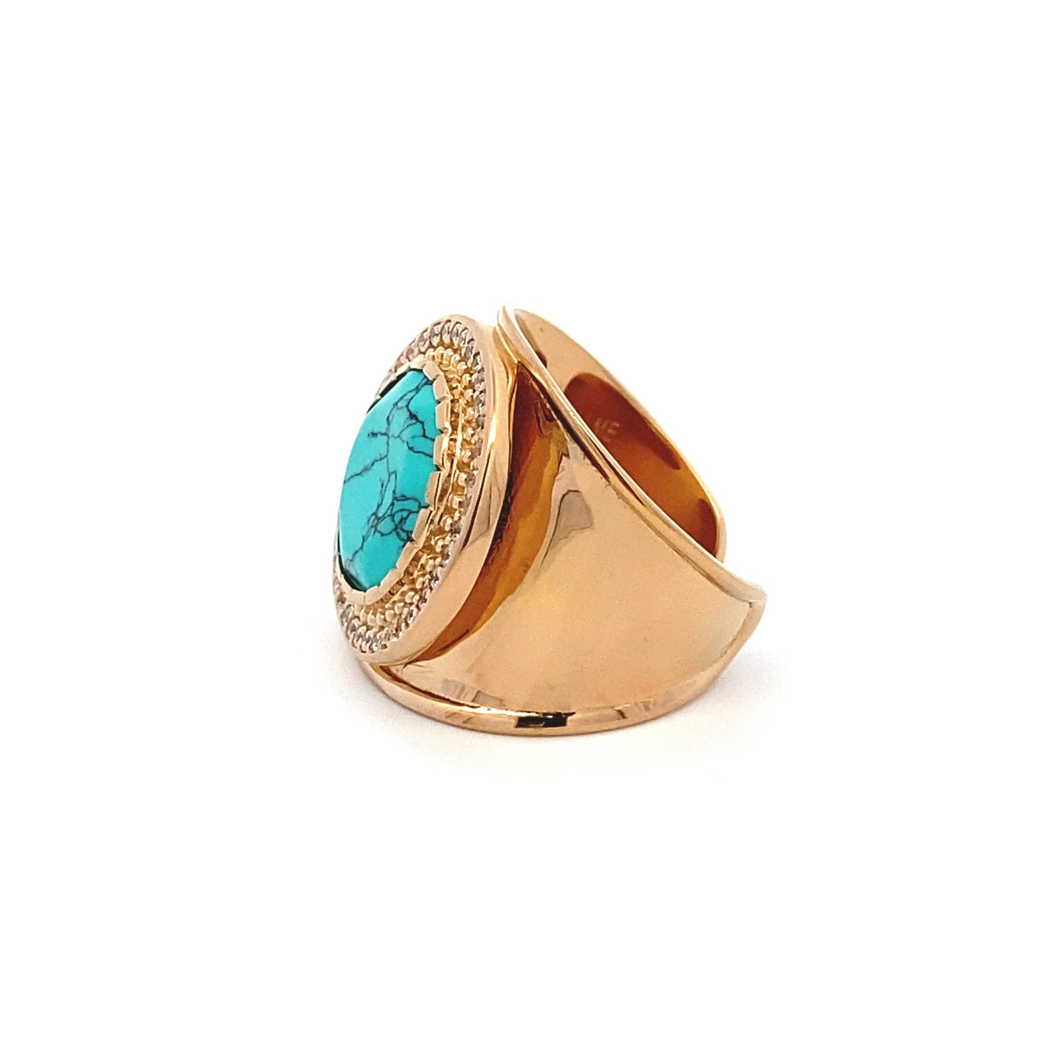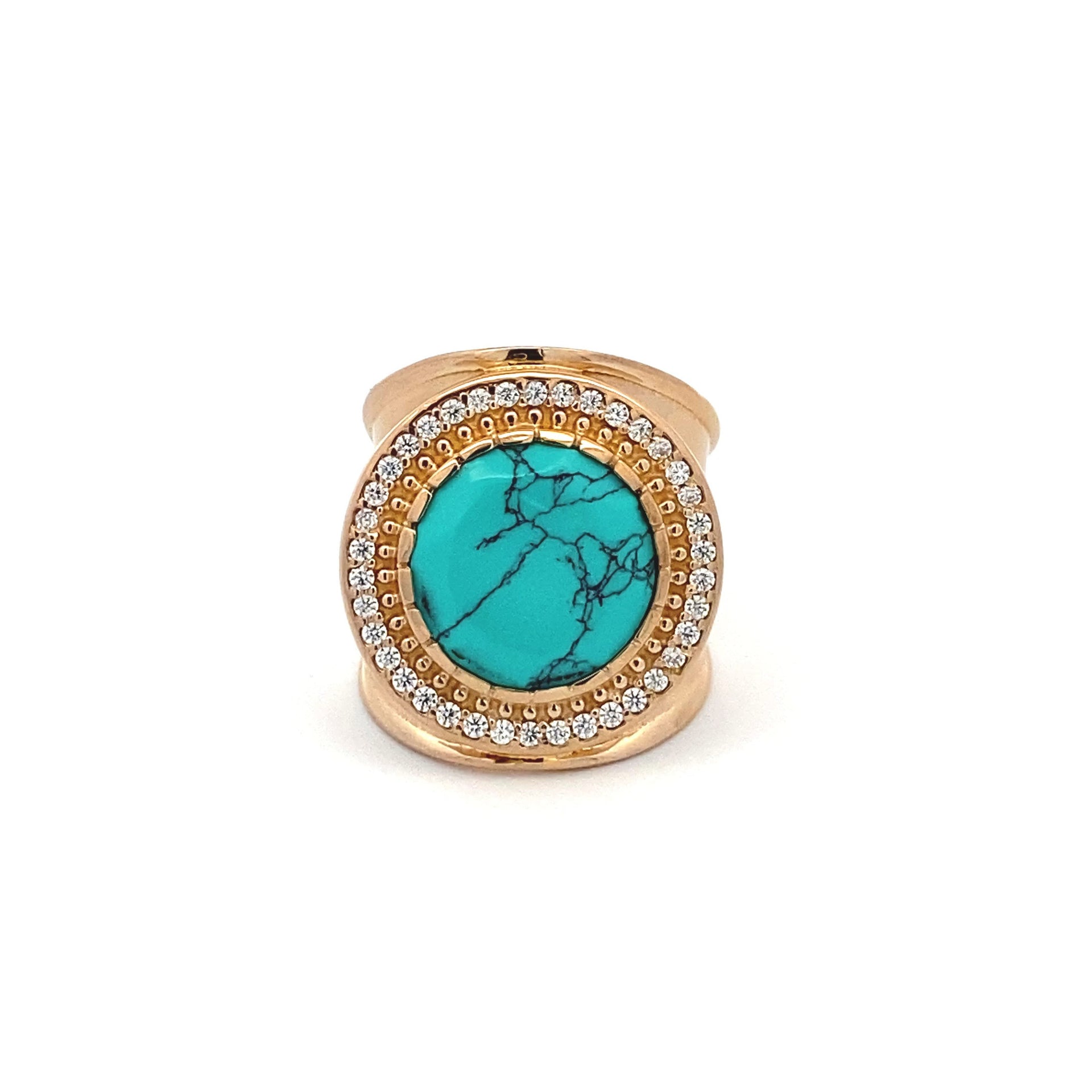 Goldfarbener Ring mit farbigem runden Stein und den Stein umgebenden Zirkoniasteinen