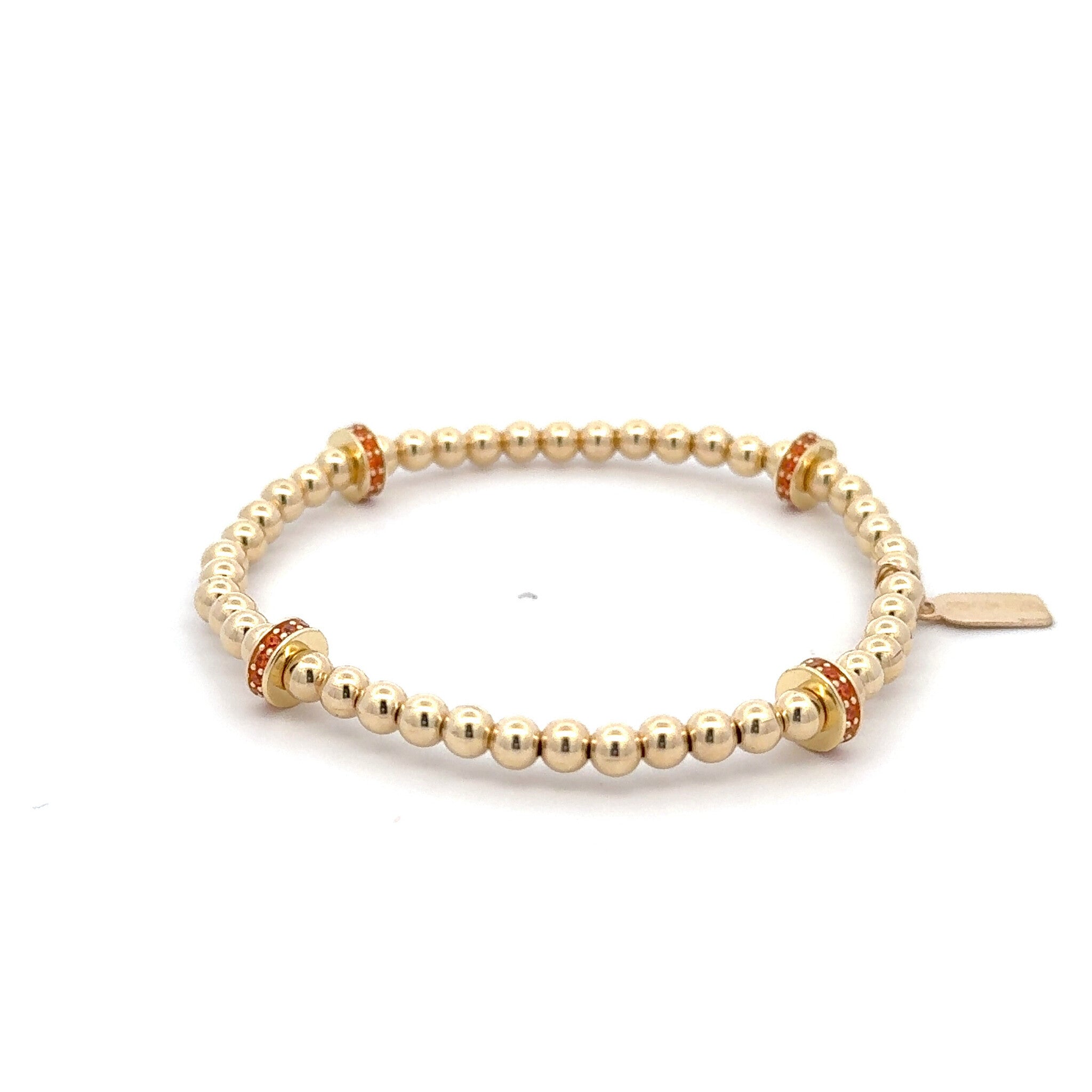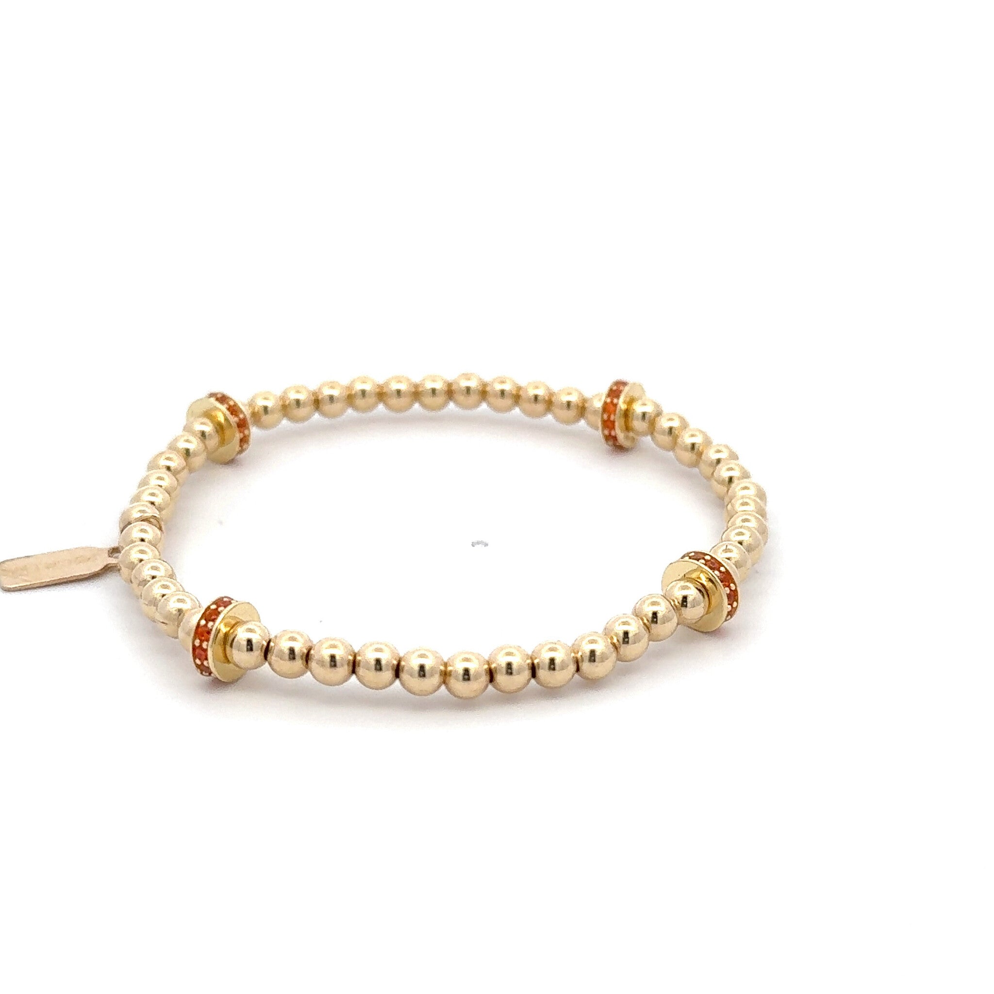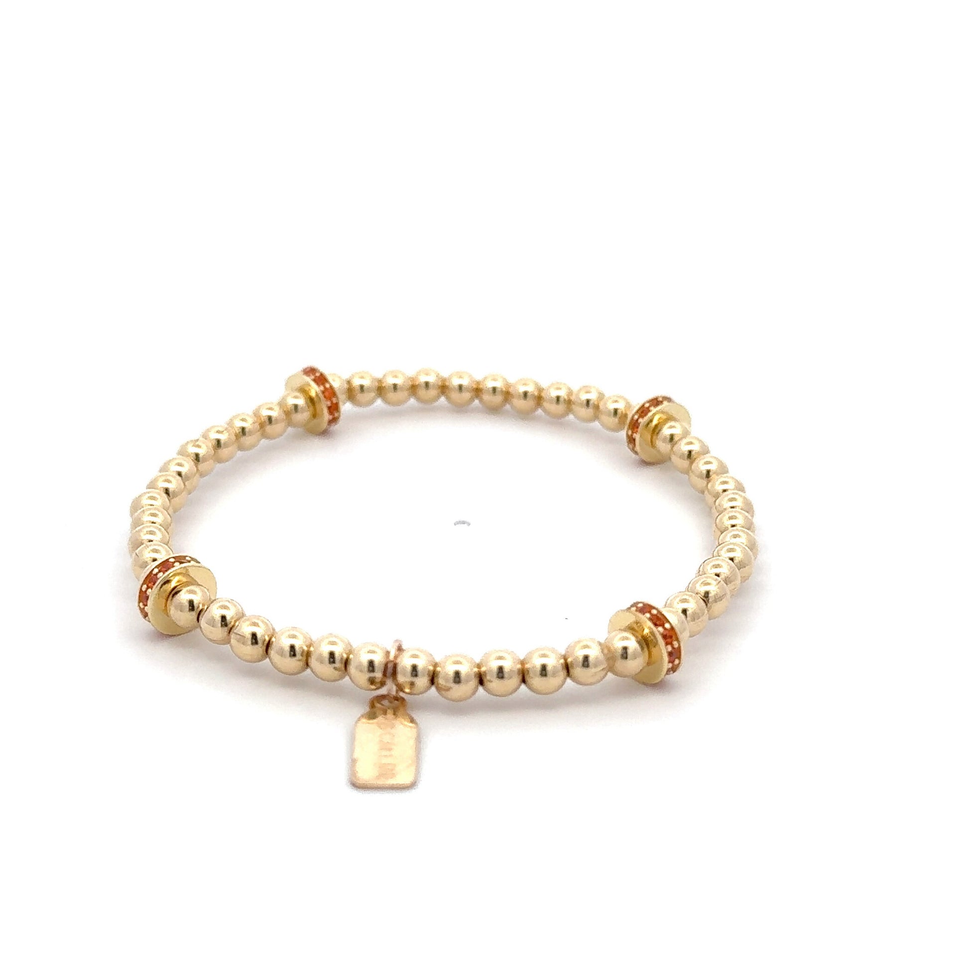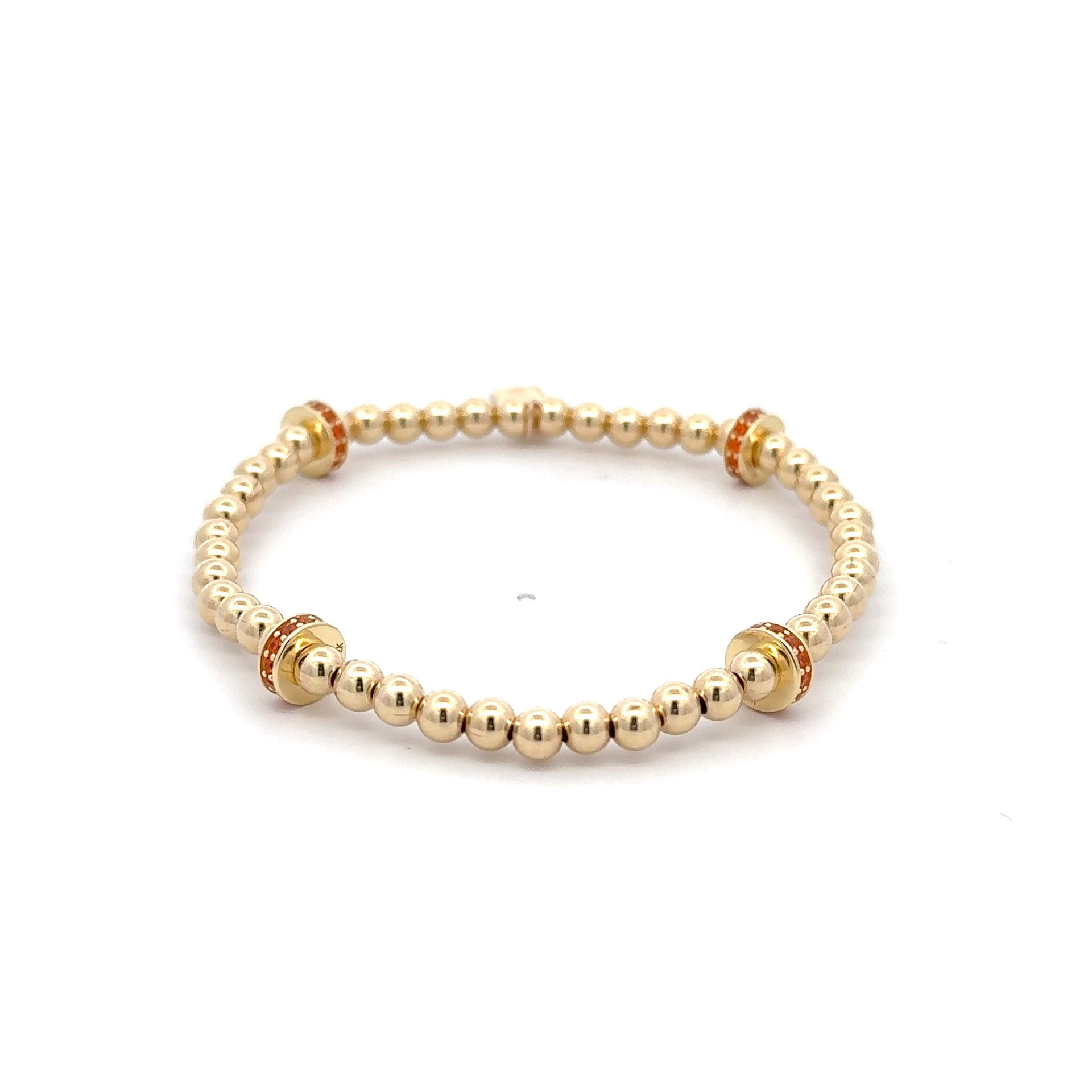 Elastisches Armband mit goldfarbenen Kugeln und 4 Radanhängern mit Steinen.
